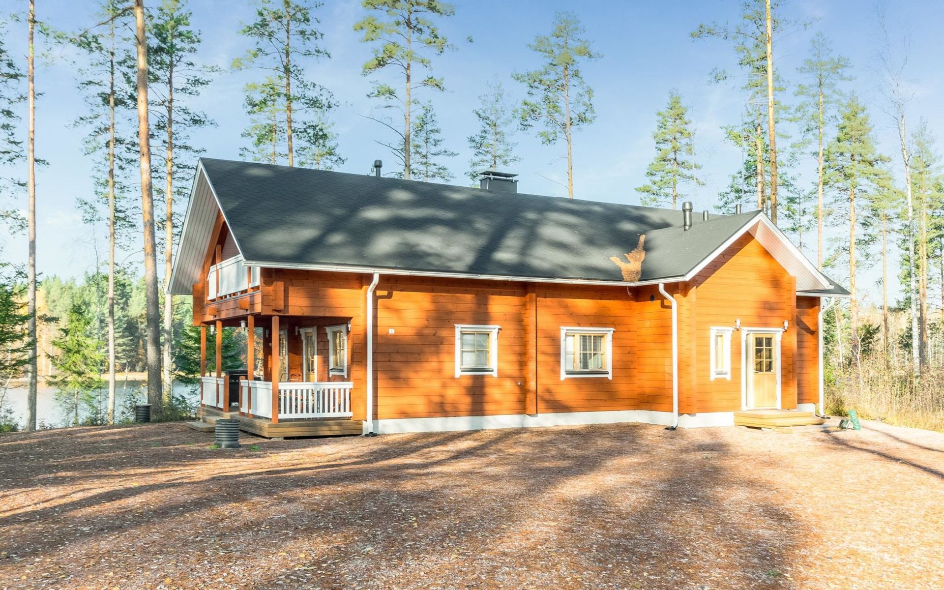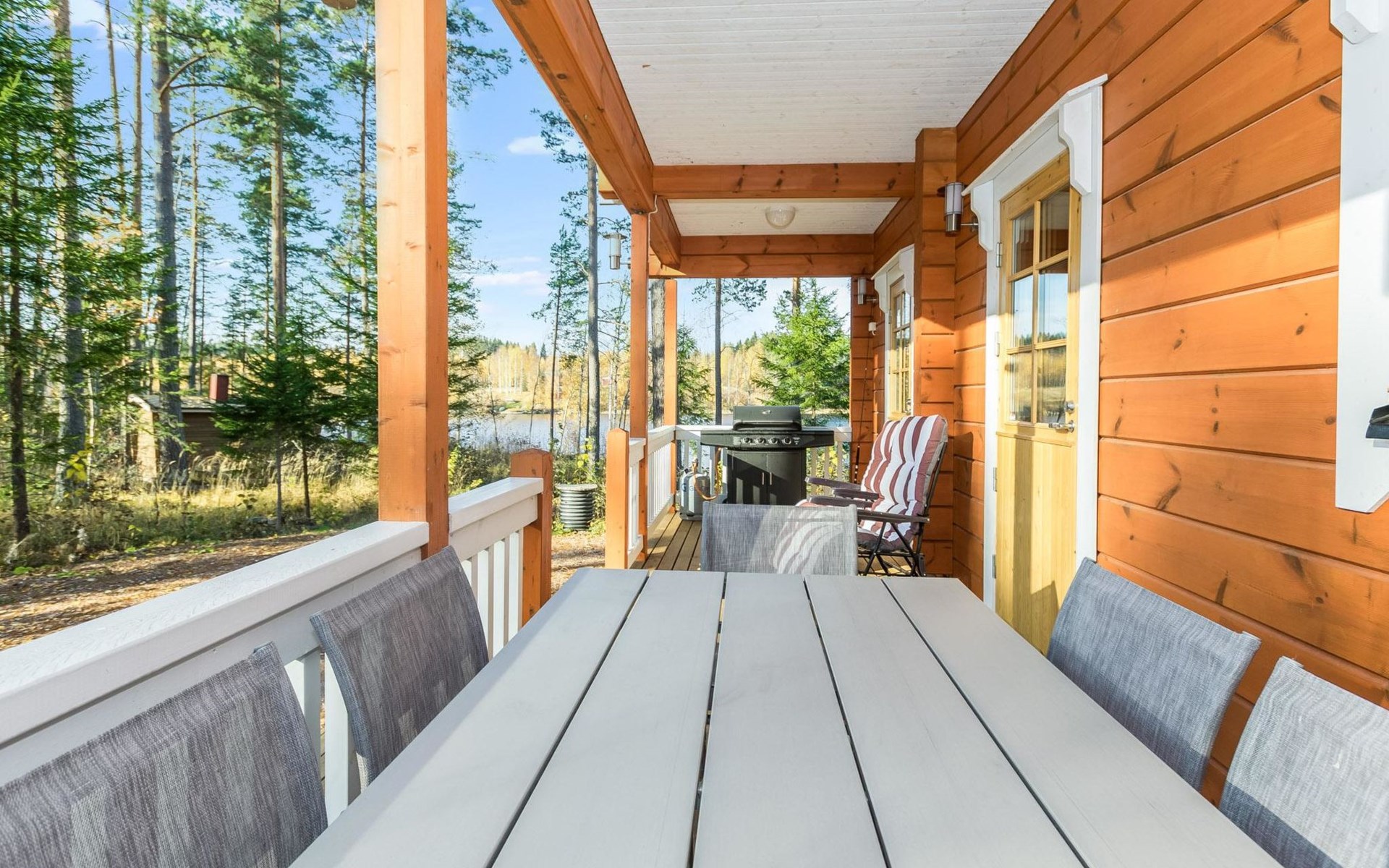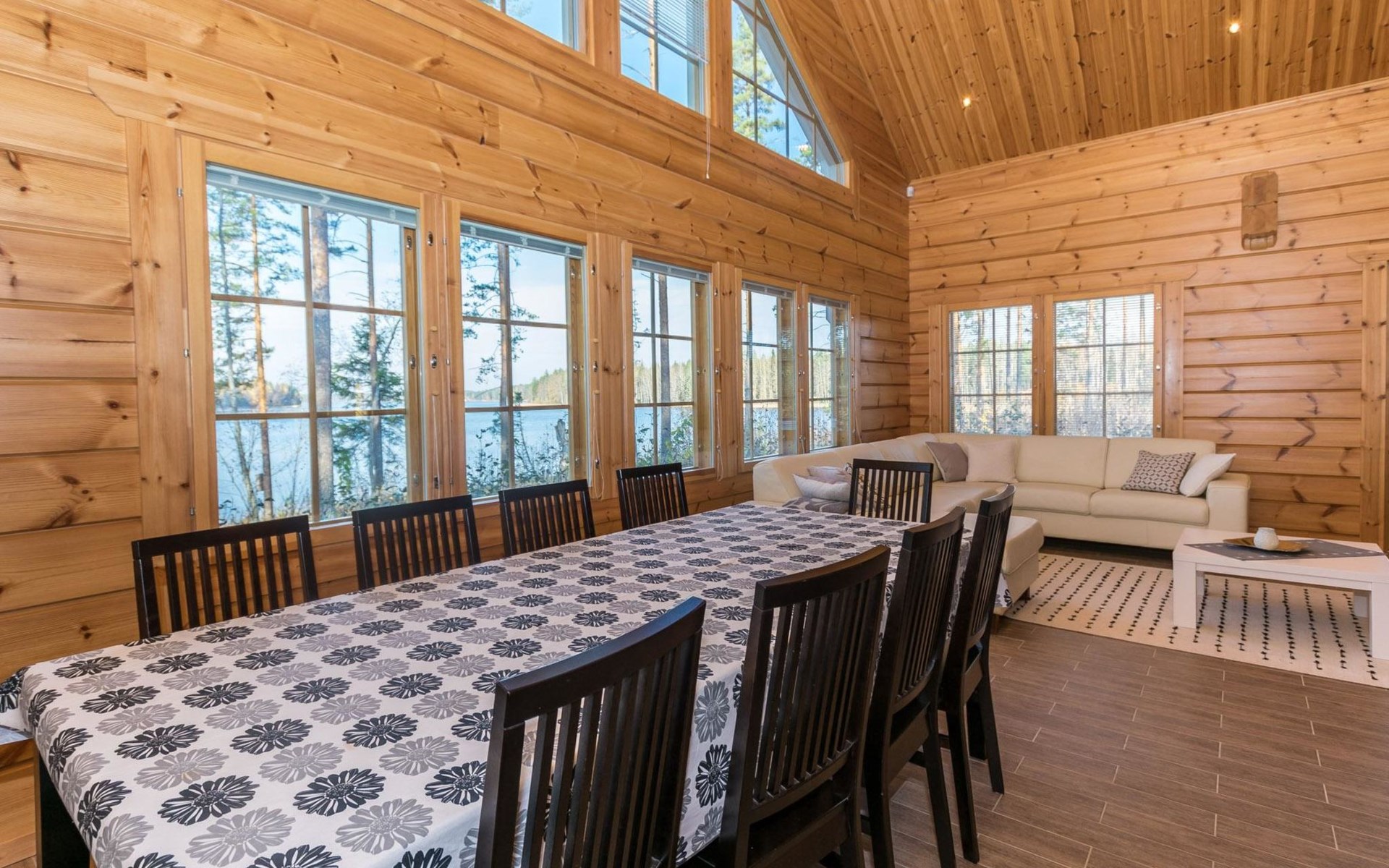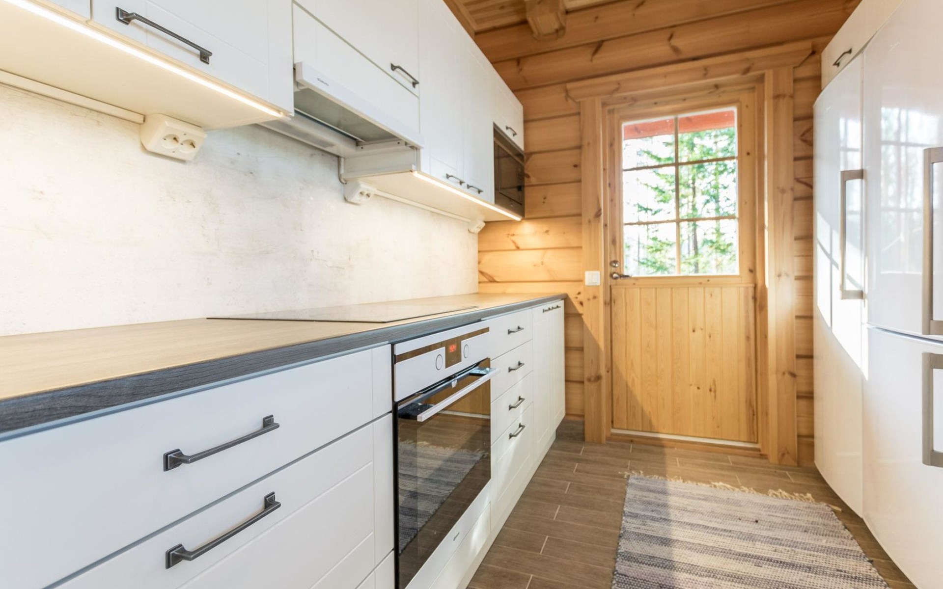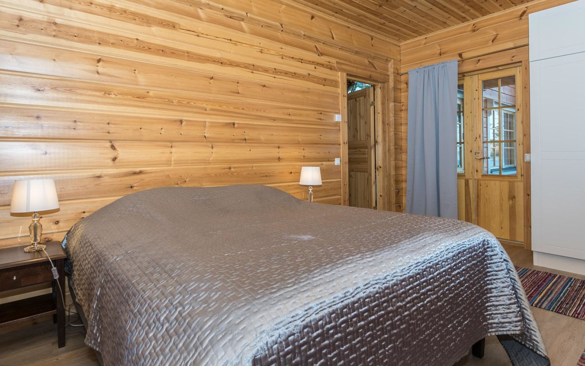 Spacious two-story log house 2017, downstairs vestibule, hallway, technical space, big living room with dining area, separate toilet, well equipped kitchen (access to the terrace), utility room, washroom with toilet, sauna (electricity), bedroom with double bed (access to the terrace), bedroom with 2 beds, 2 terraces.