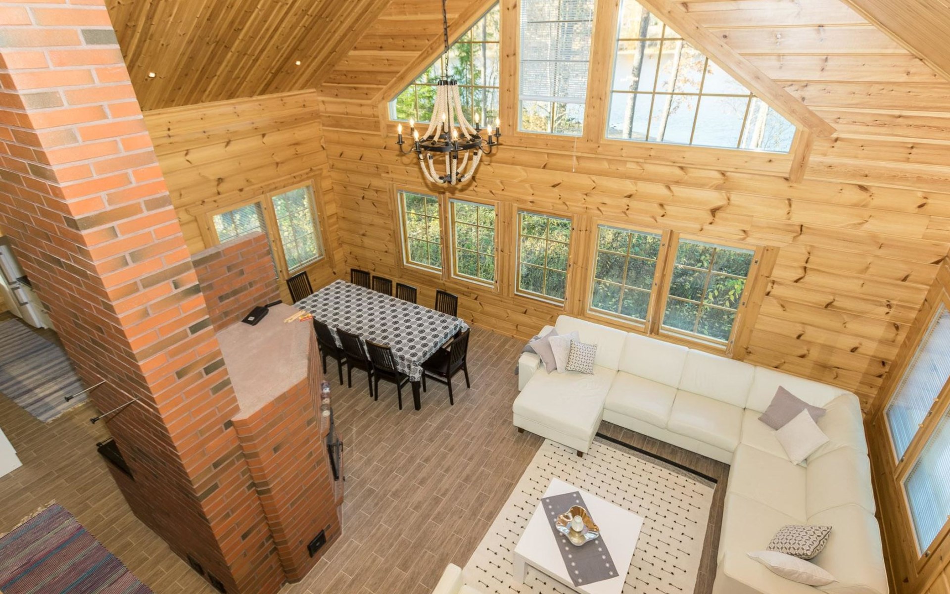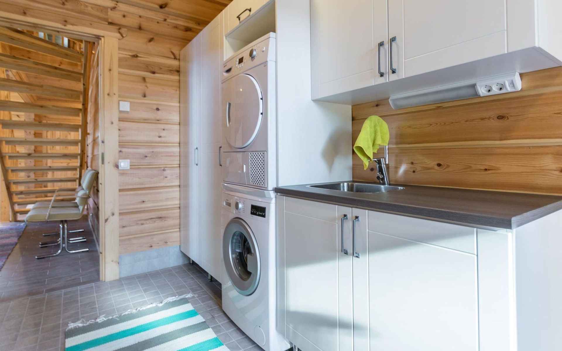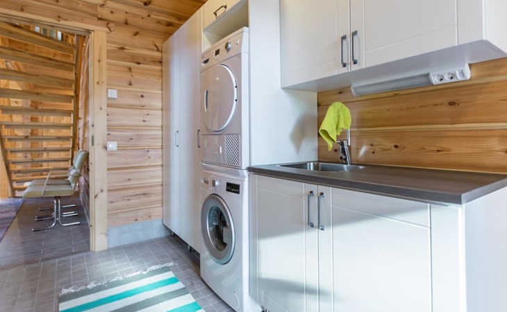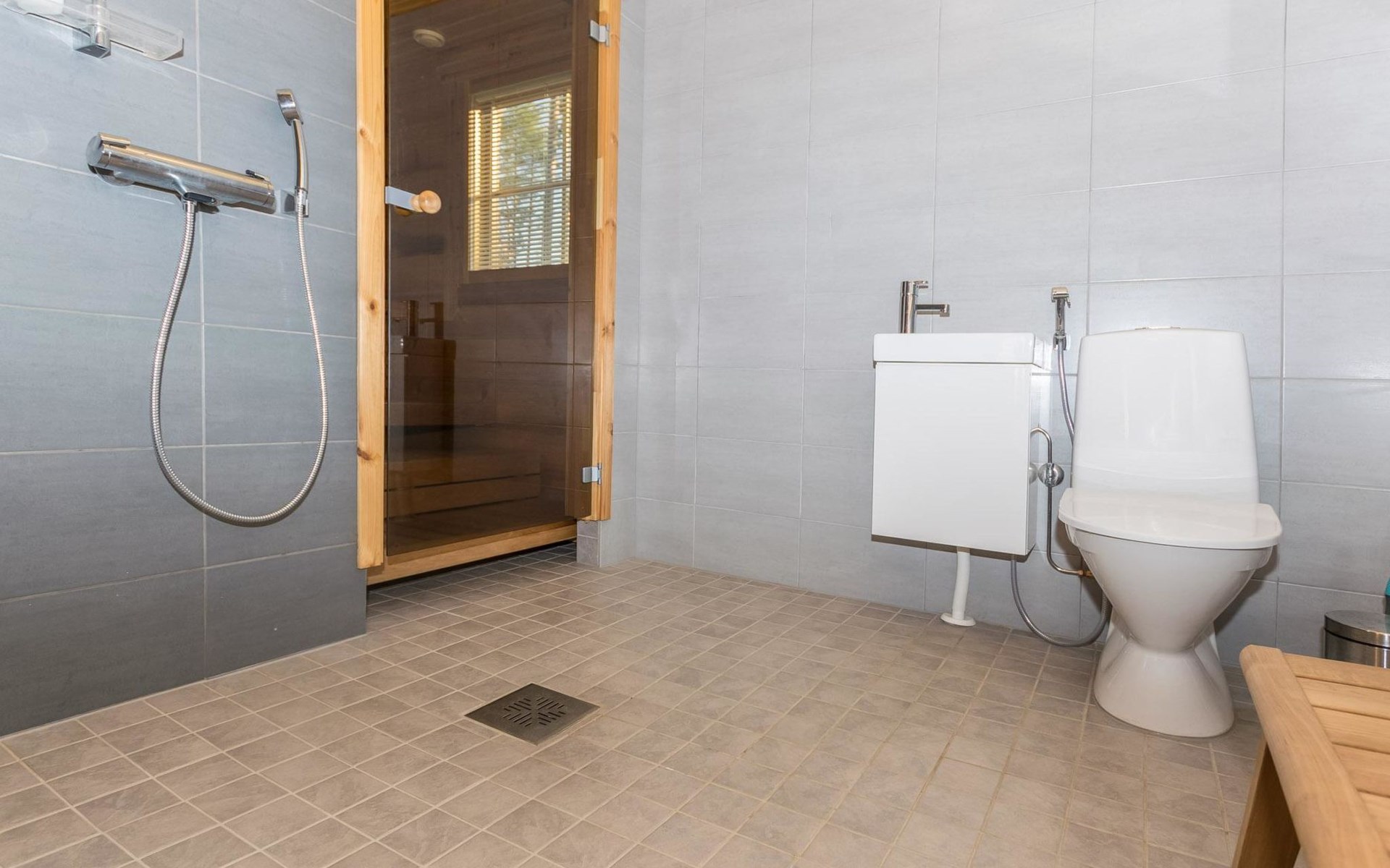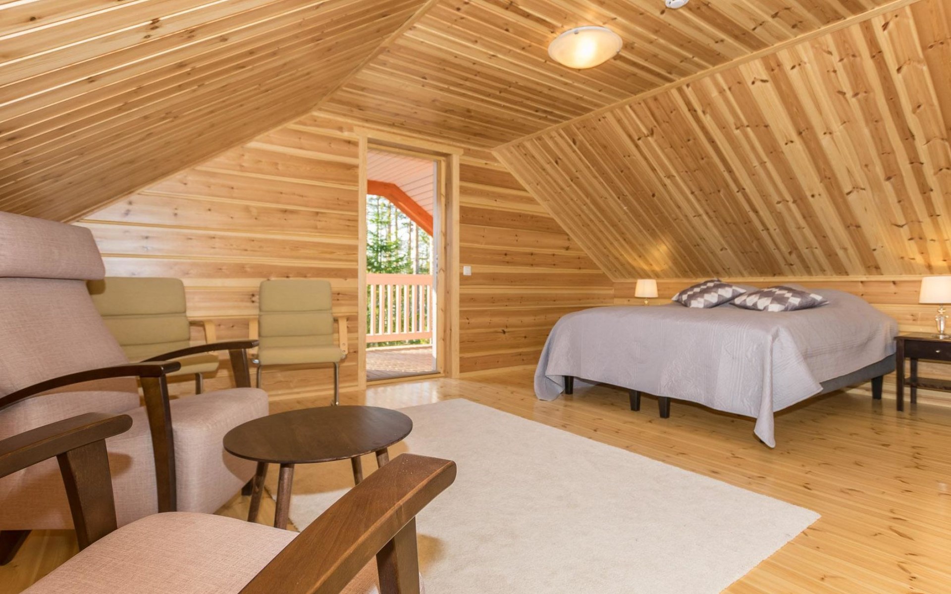 Spacious two-story log house 2017, downstairs vestibule, hallway, technical space, big living room with dining area, separate toilet, well equipped kitchen (access to the terrace), utility room, washroom with toilet, sauna (electricity), bedroom with double bed (access to the terrace), bedroom with 2 beds, 2 terraces.