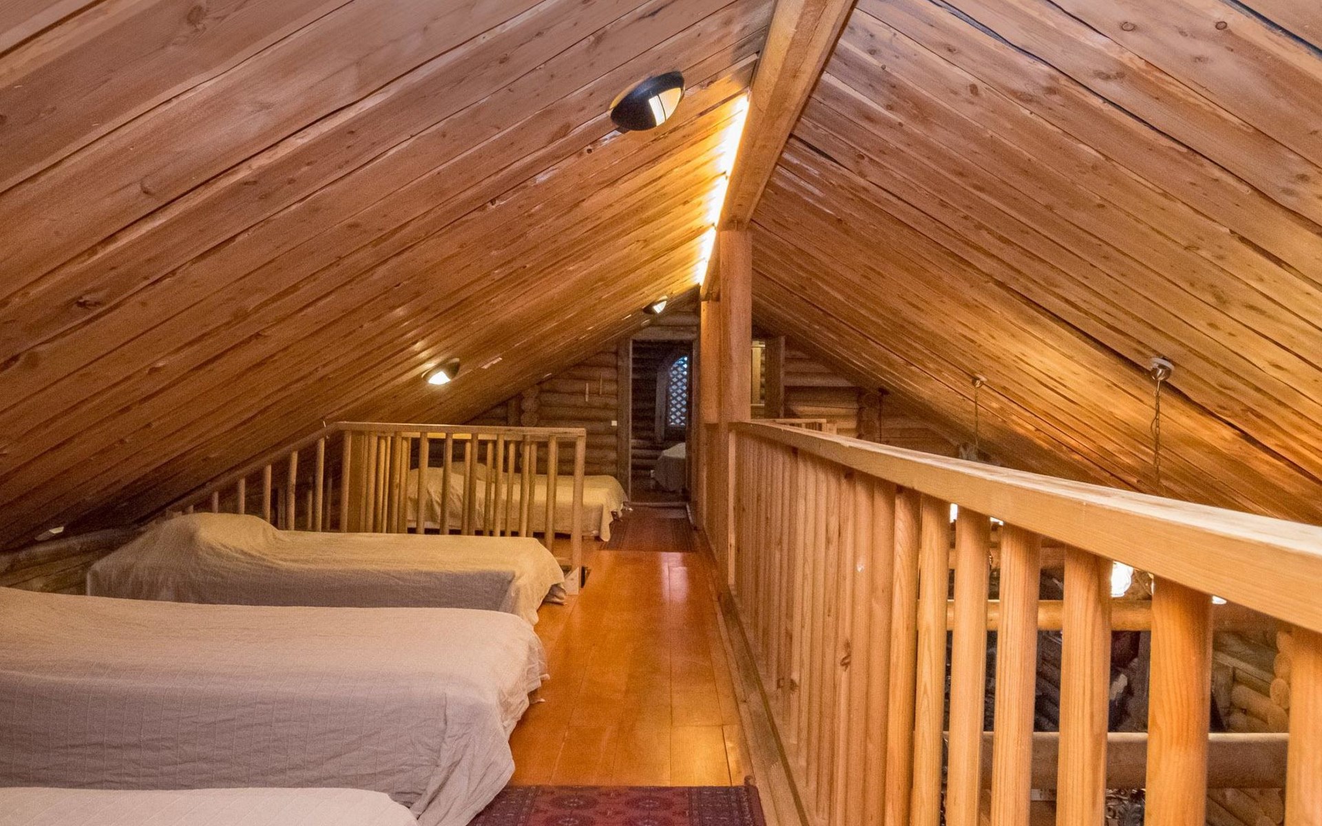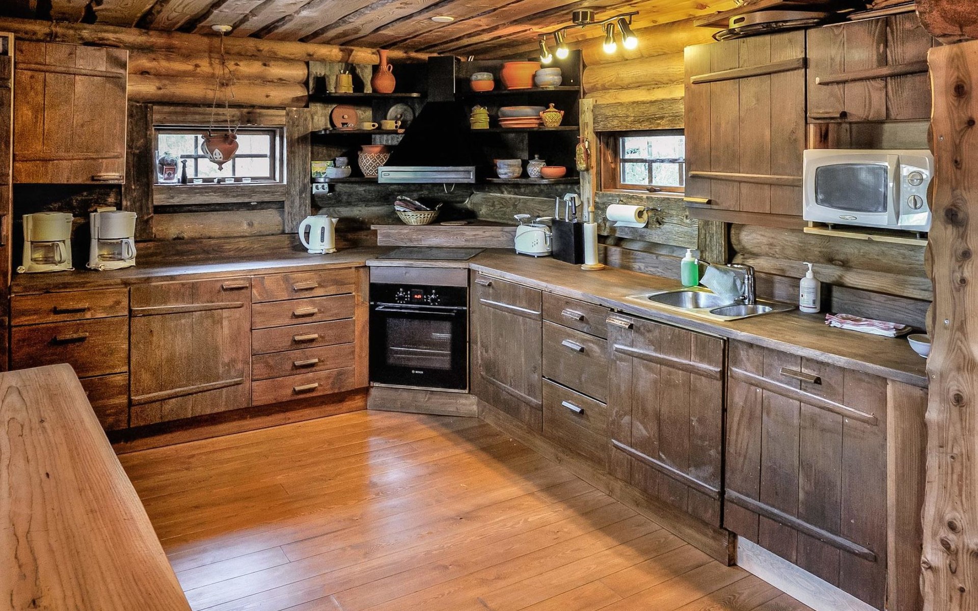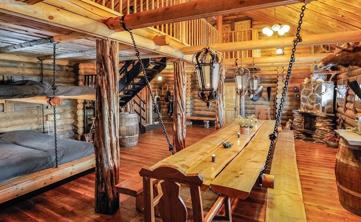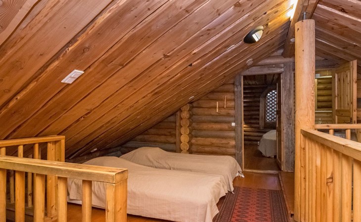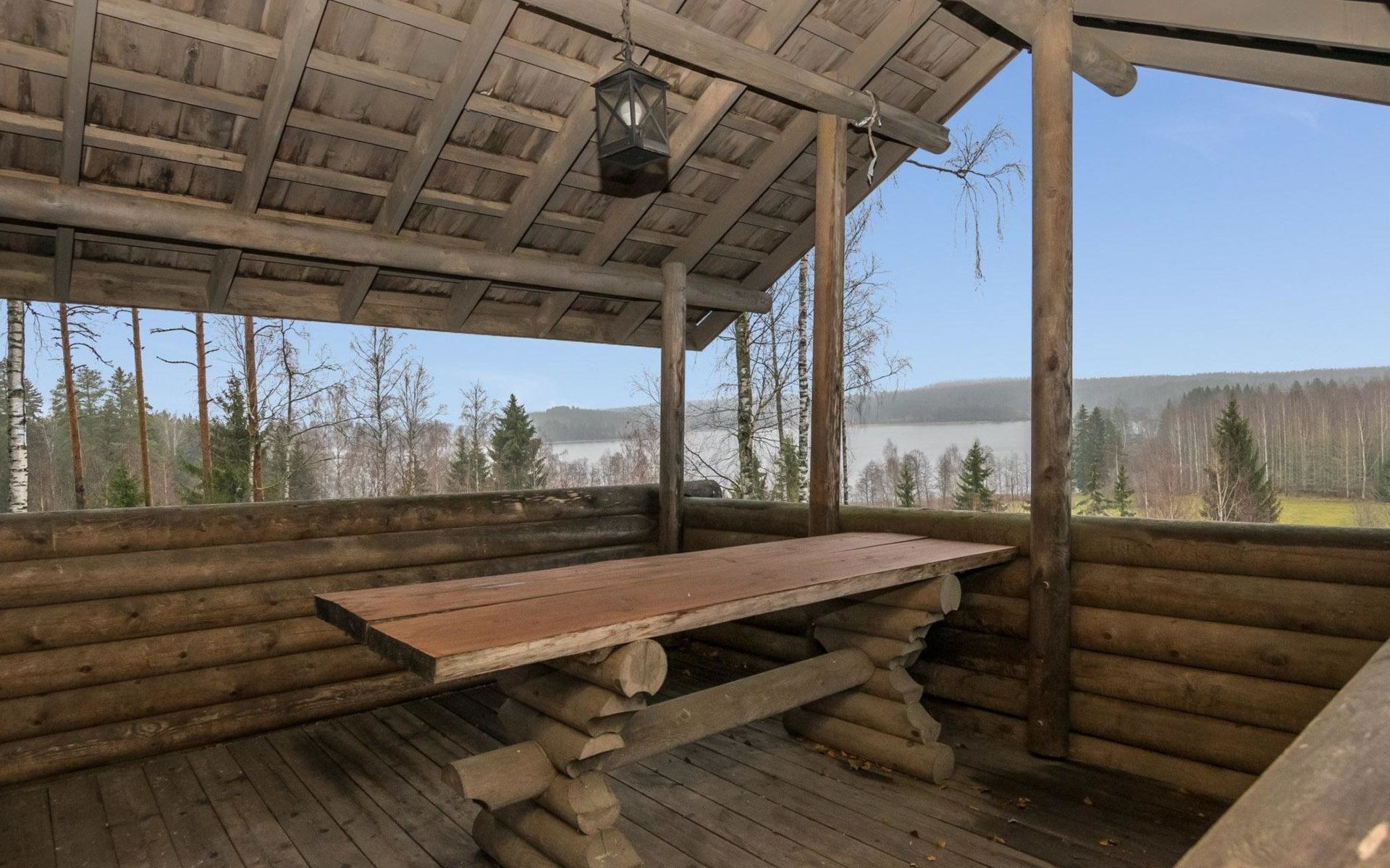 Log cabin 2006, living room/kitchen 8 extra beds (bunk for 8 persons), bedroom 2 beds, second bedroom 2 beds, sleeping loft 5 extra beds, sauna (electric sauna stove), washroom (2 x shower), open porch, 2 towers. Toilet on the upper floor and ground floor. A separate underground smoke sauna on the hill and hot tub can be rented separately.