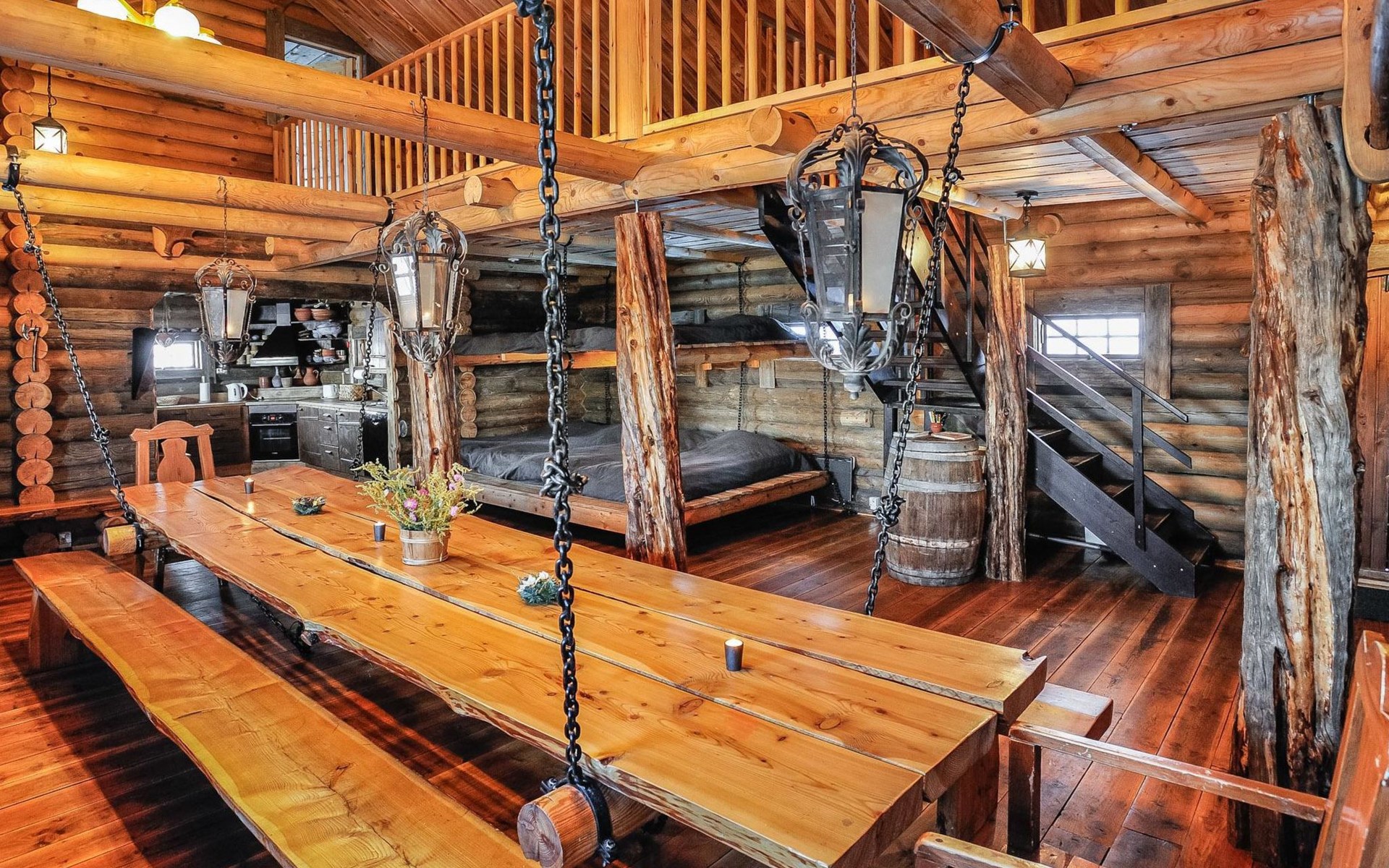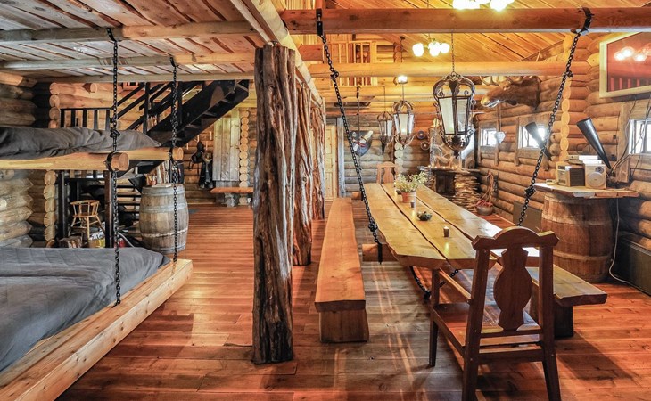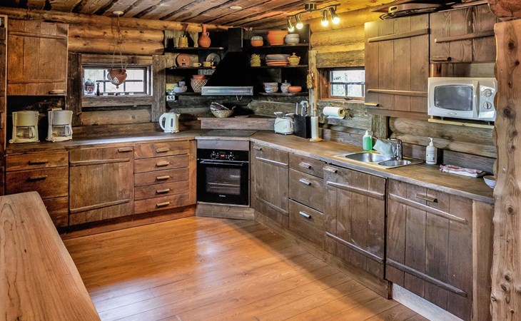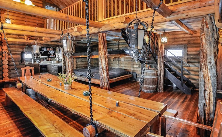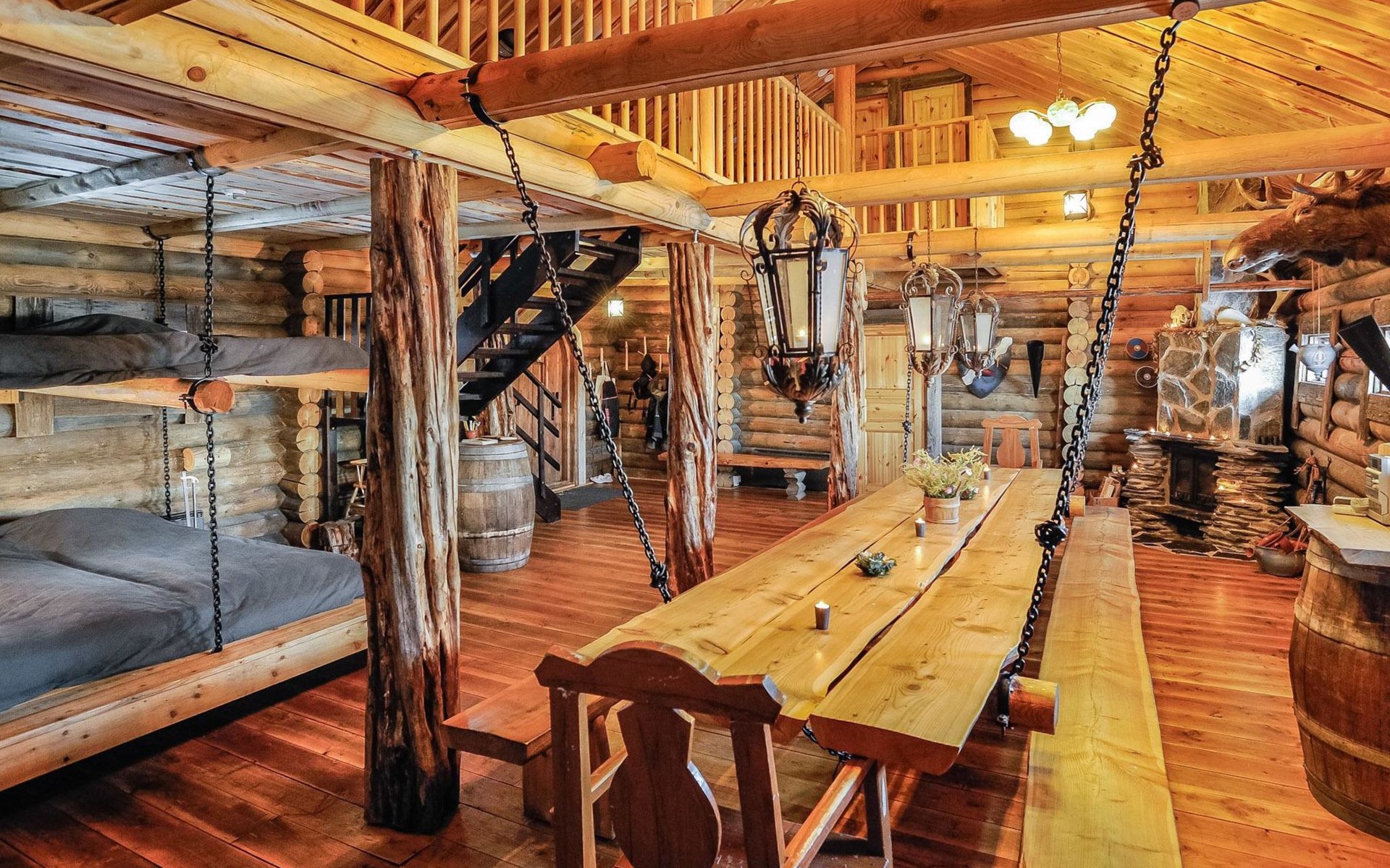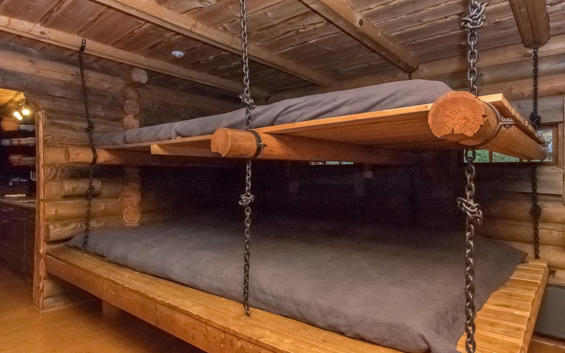 Log cabin 2006, living room/kitchen 8 extra beds (bunk for 8 persons), bedroom 2 beds, second bedroom 2 beds, sleeping loft 5 extra beds, sauna (electric sauna stove), washroom (2 x shower), open porch, 2 towers. Toilet on the upper floor and ground floor. A separate underground smoke sauna on the hill and hot tub can be rented separately.