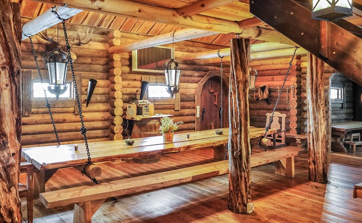 Reservations start at 16.00 and end at 12.00 (also in weekend bookings). Comfortable large Medieval style "castle" on a forested slope. The castle has a well-equipped kitchen (including tableware for 30 people and convection oven). The hall has dining / meeting space with fireplace. For meetings, there is a 42-inch flat-screen TV on the wall and, if ordered separately, a video projector with screen.