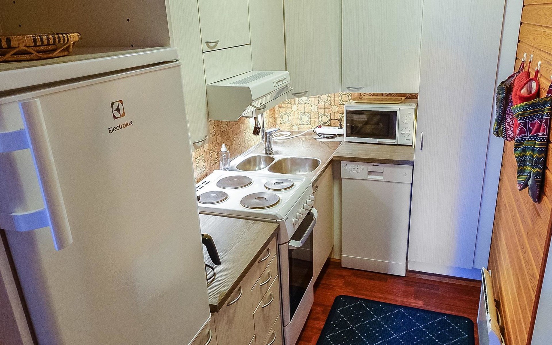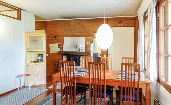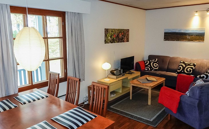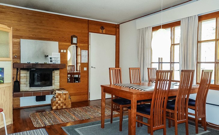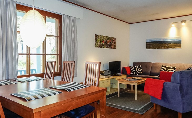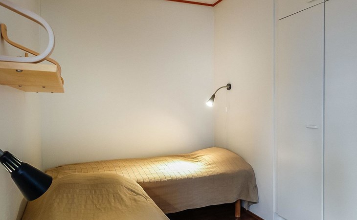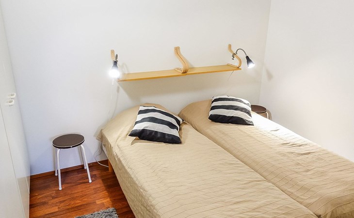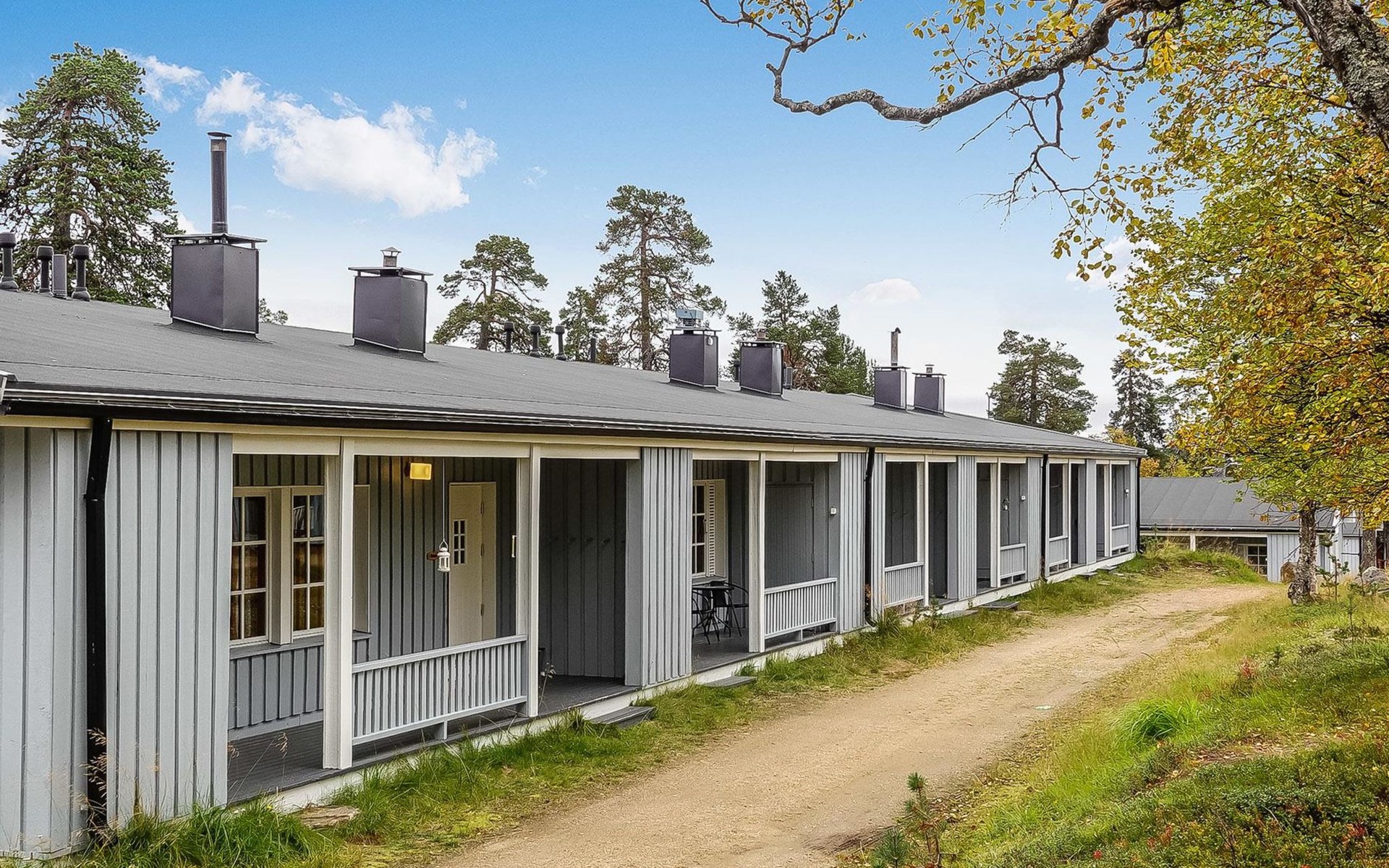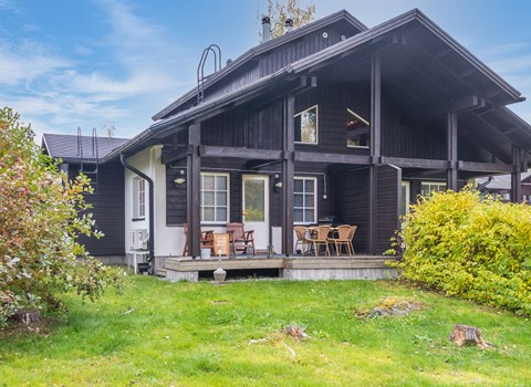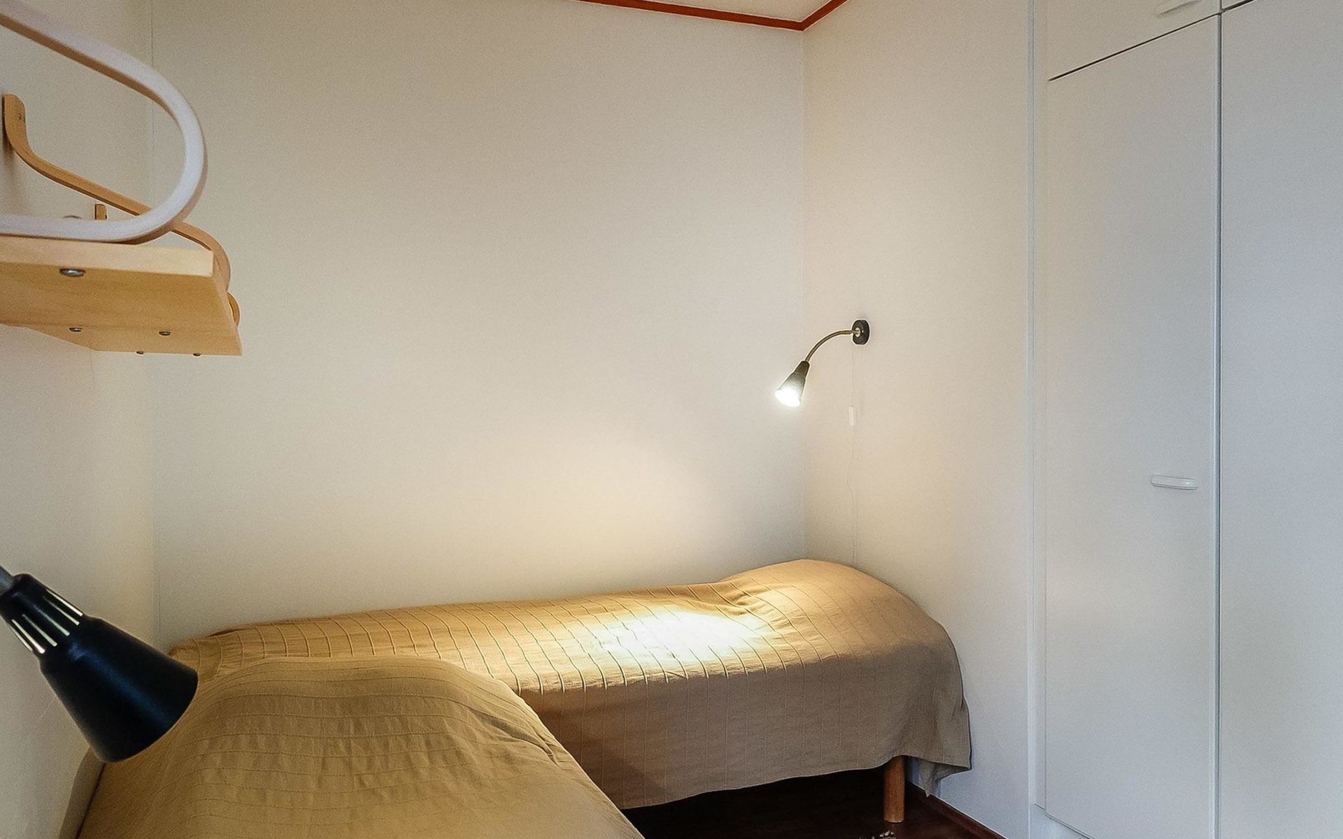 Wooden gable apartment in a row house built in 1979. Living room with sofa bed, kitchenette, 2 bedroom, both with 2 beds, another bedroom is windowless, sauna, washroom and covered terrace.