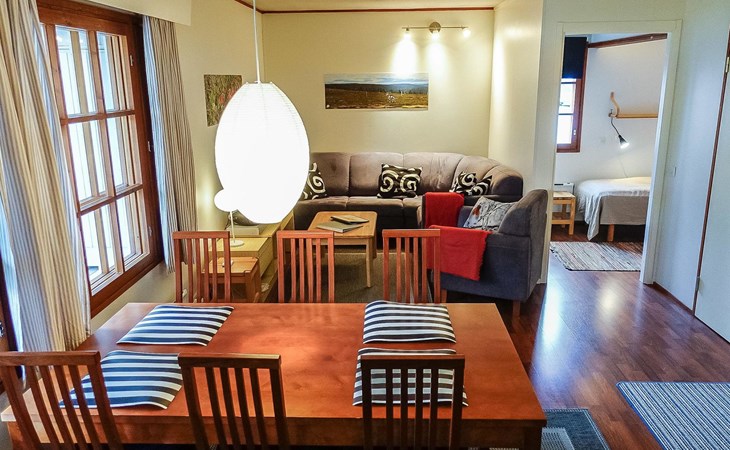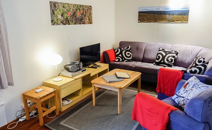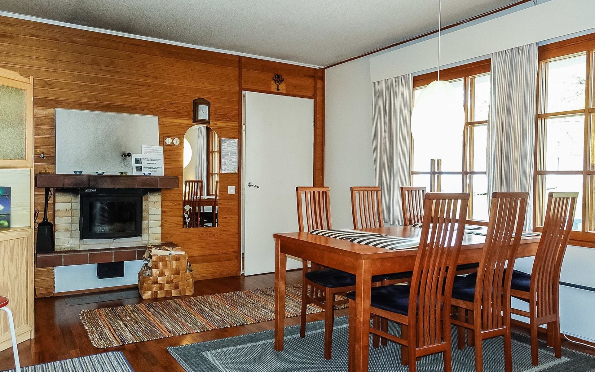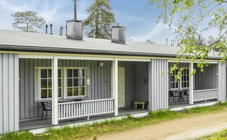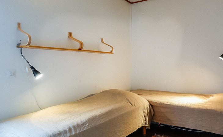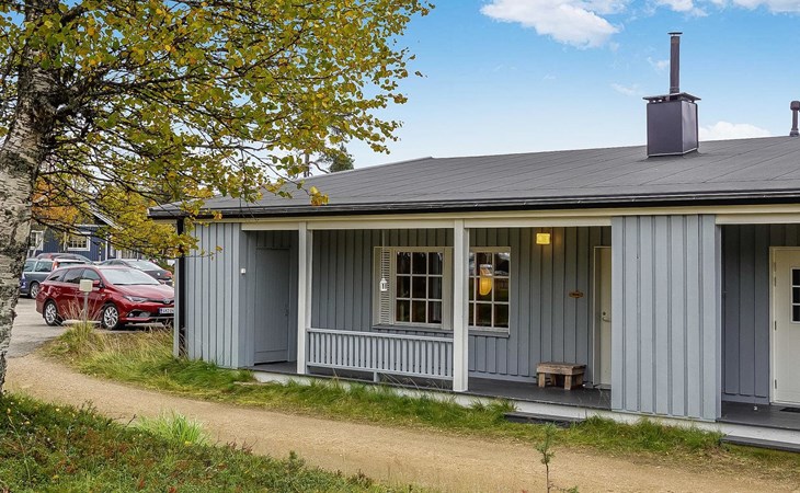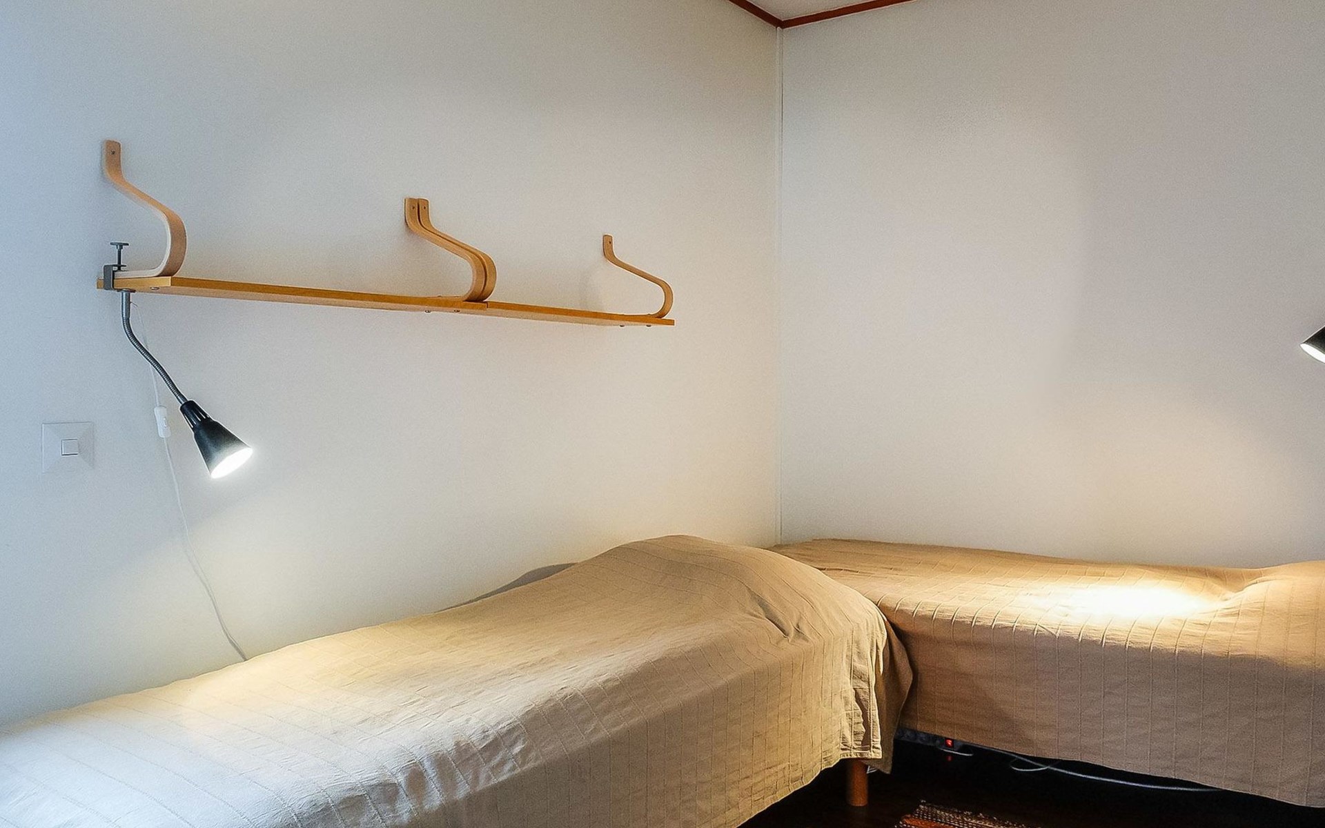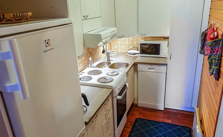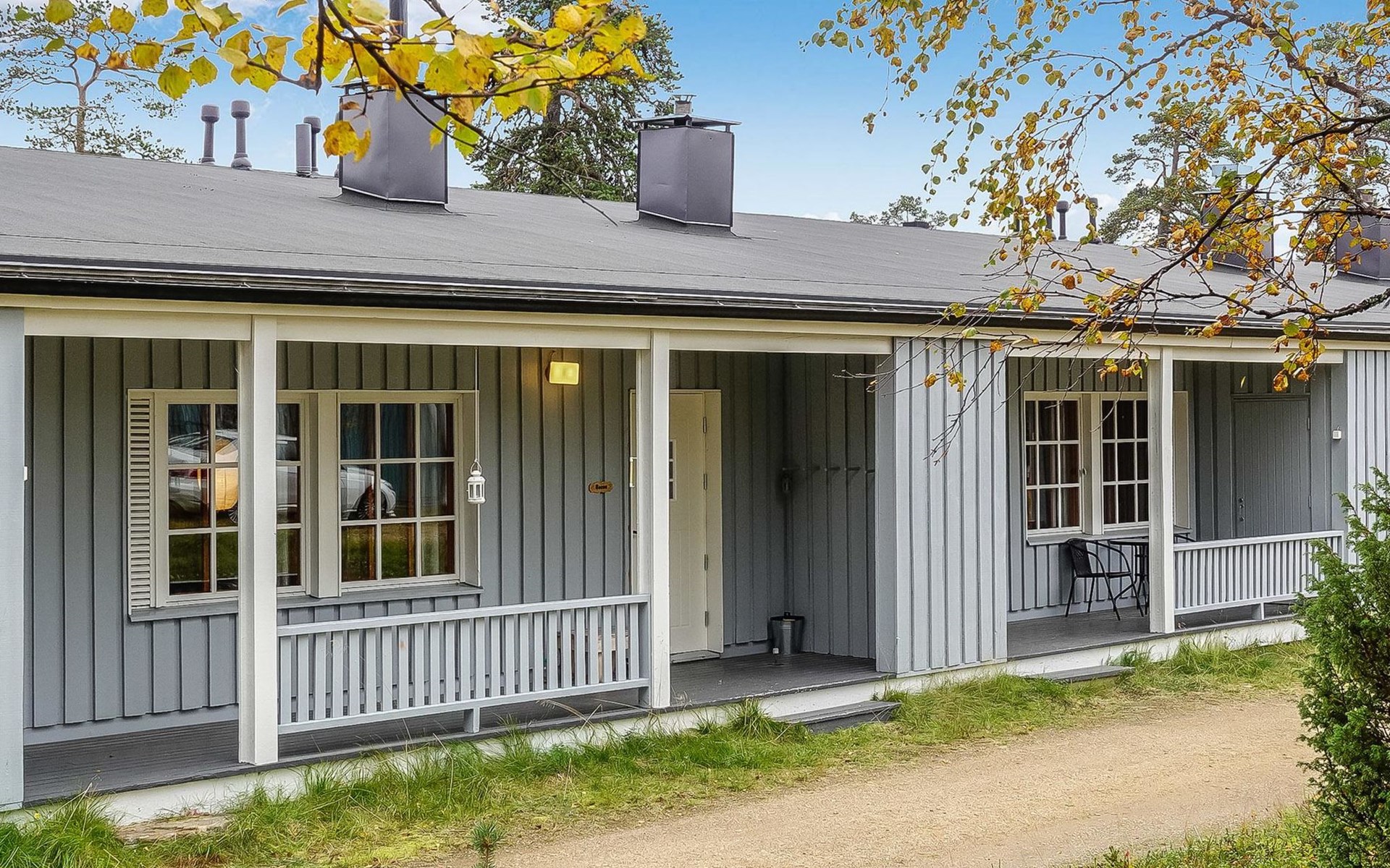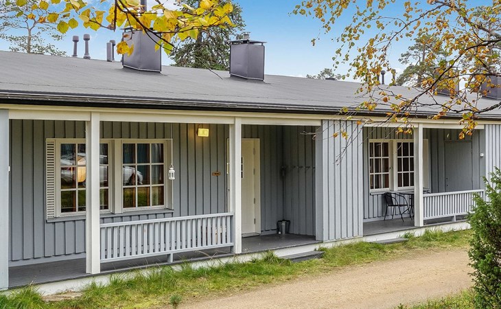Wooden gable apartment in a row house built in 1979. Living room with sofa bed, kitchenette, 2 bedroom, both with 2 beds, another bedroom is windowless, sauna, washroom and covered terrace.