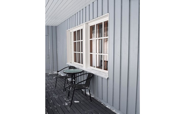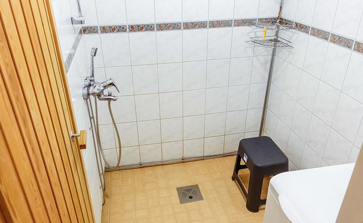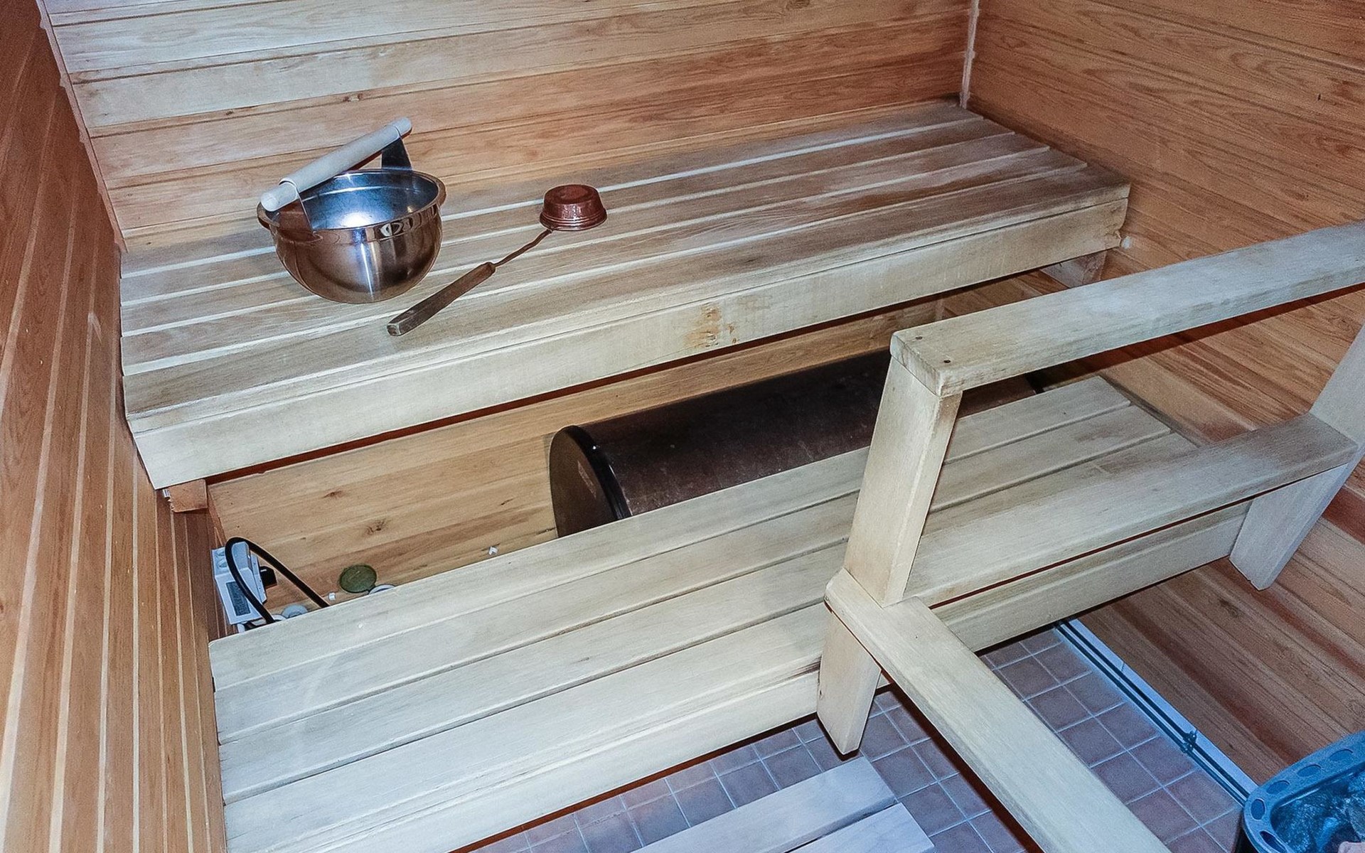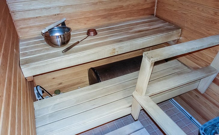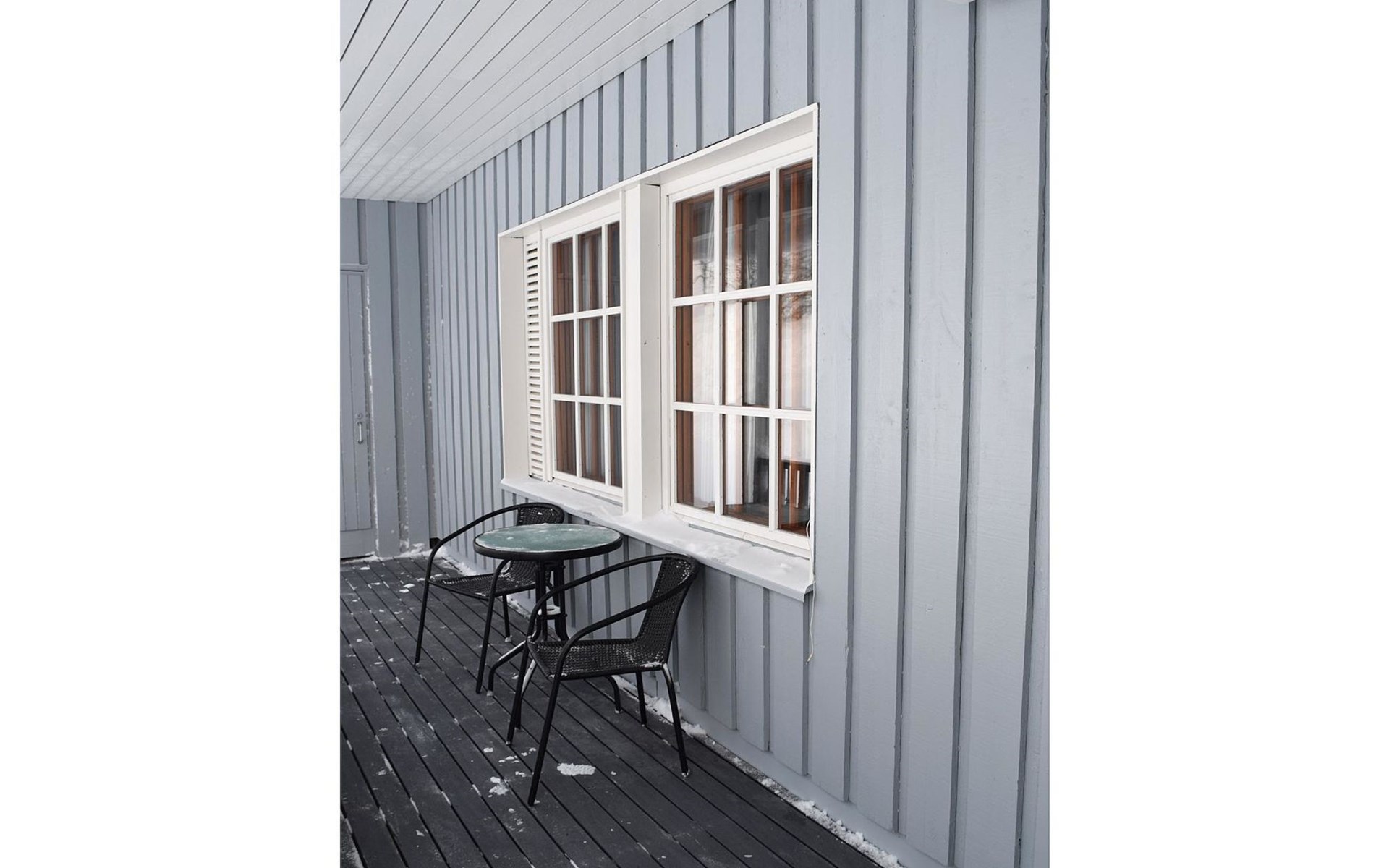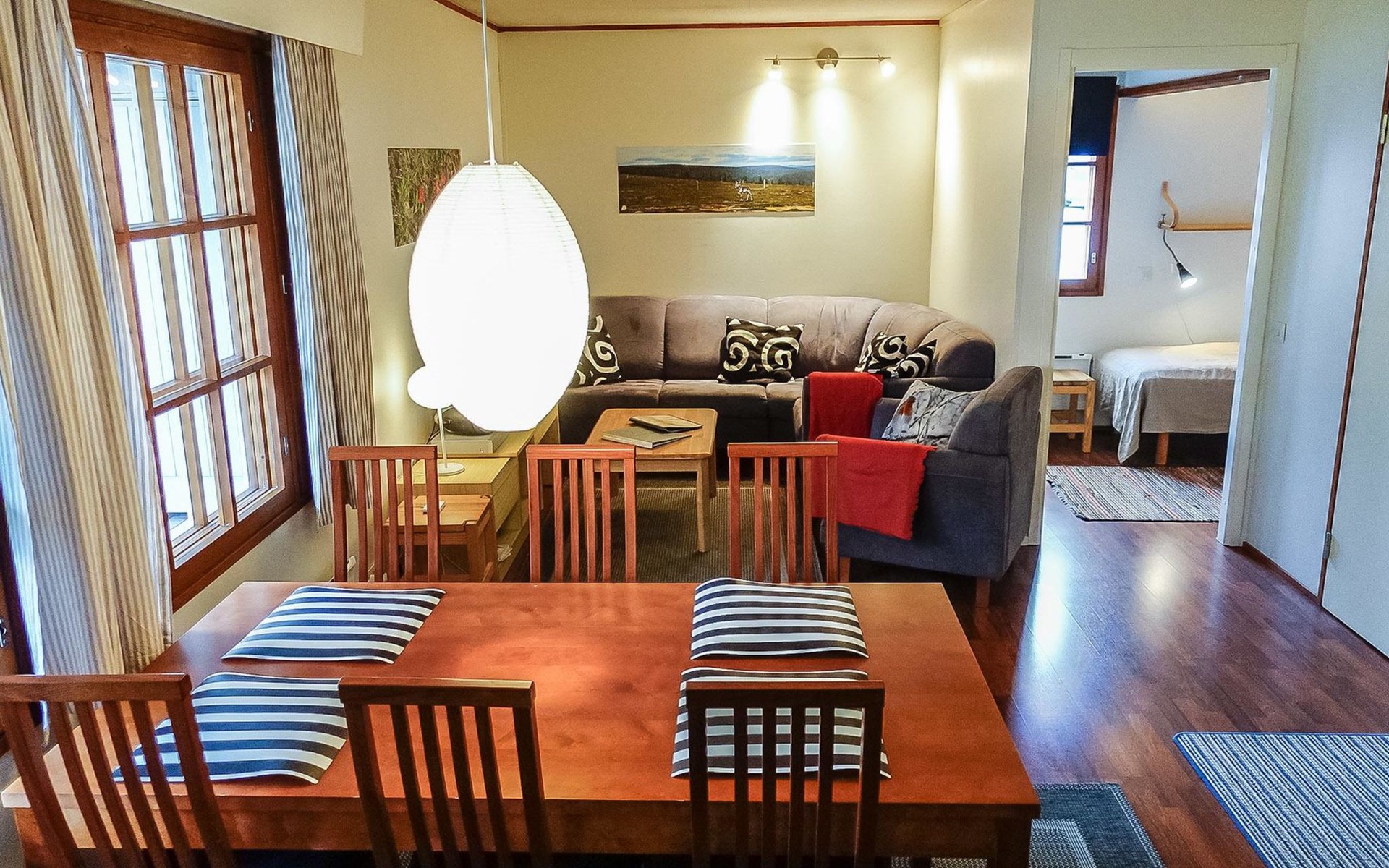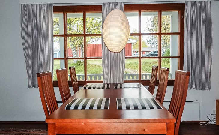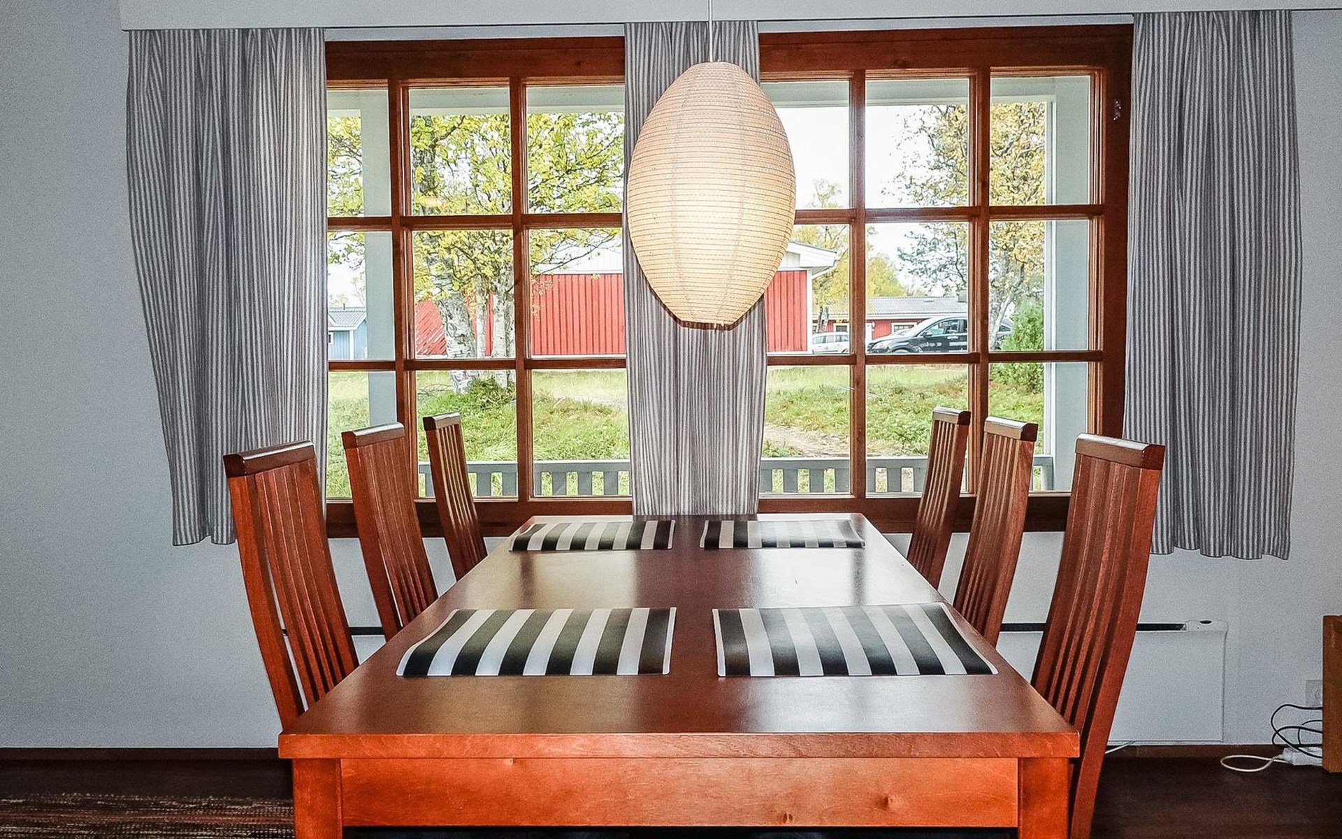Wooden gable apartment in a row house built in 1979. Living room with sofa bed, kitchenette, 2 bedroom, both with 2 beds, another bedroom is windowless, sauna, washroom and covered terrace.