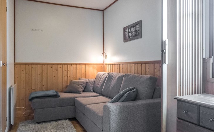 Living room, kitchenette, bedroom with 2 single beds, no window in this bedroom, another bedroom with 2 single beds, third bedroom with sofa bed. Two bedrooms have folding doors.