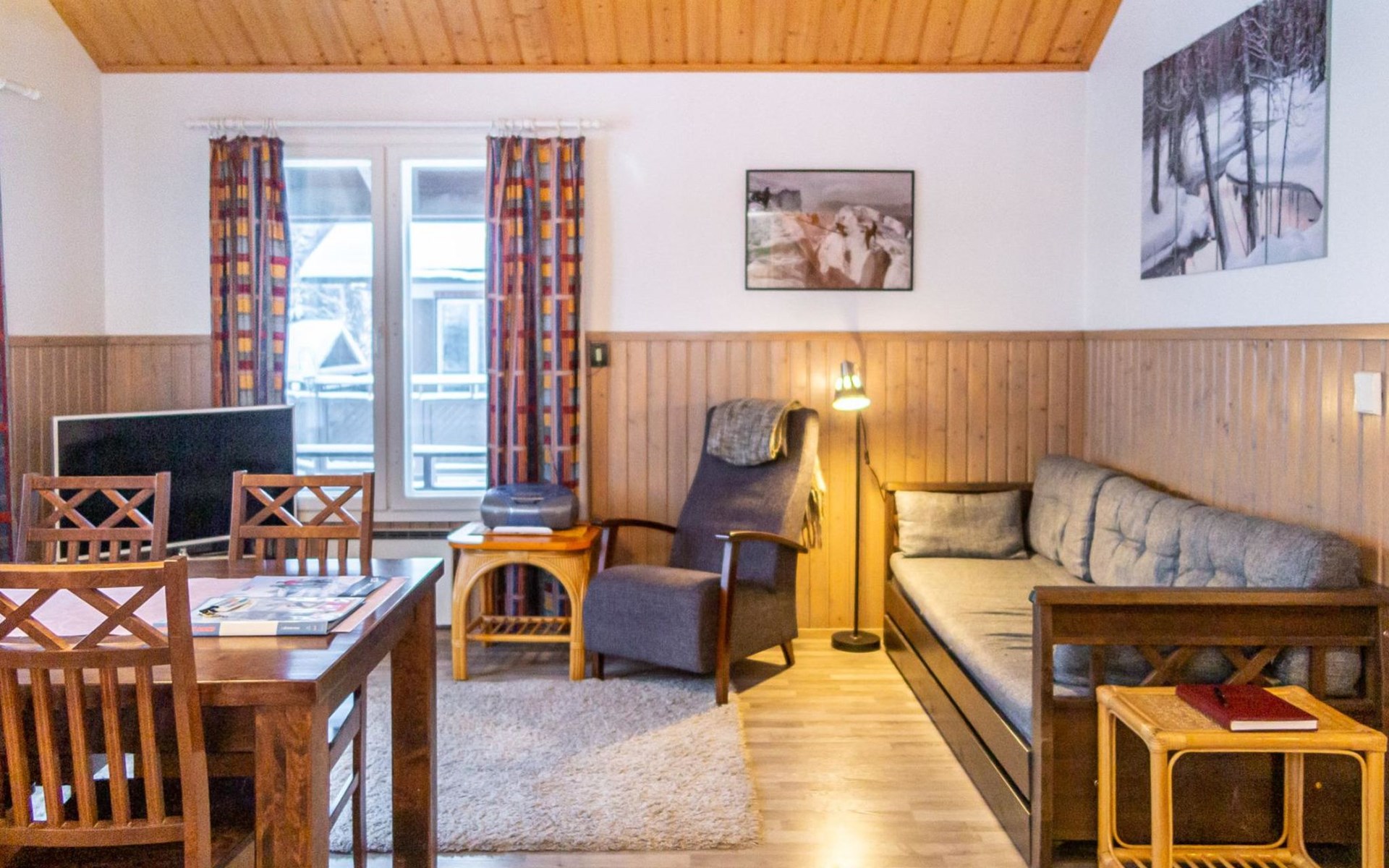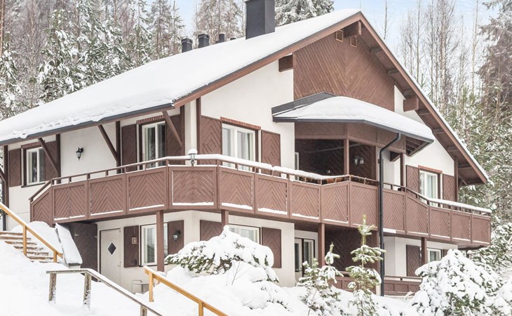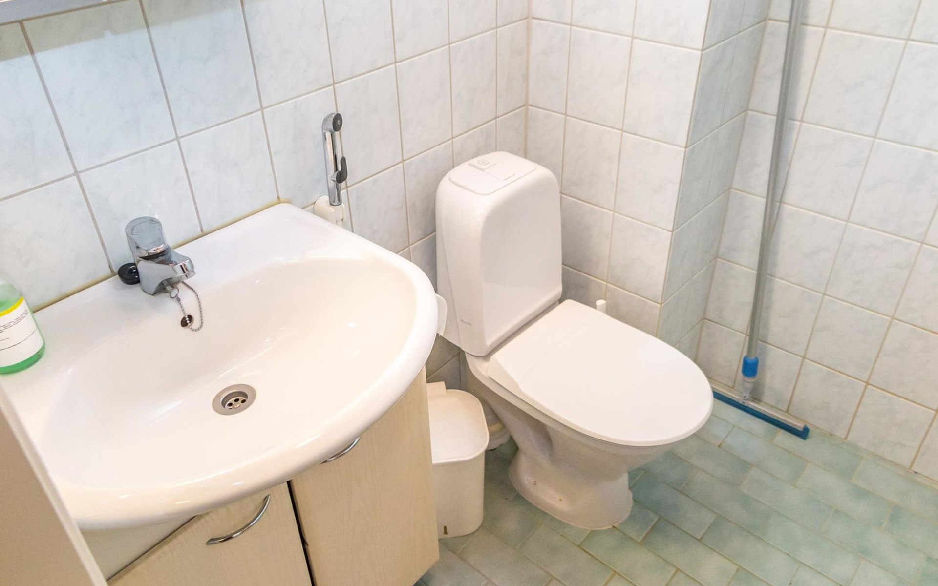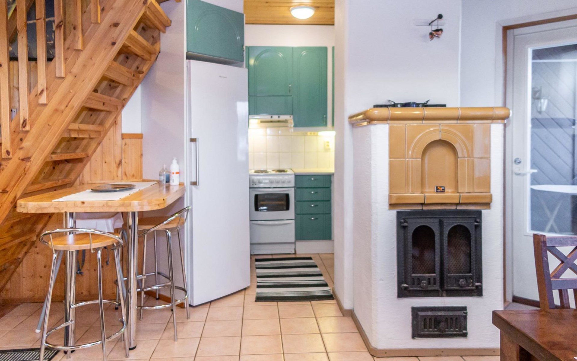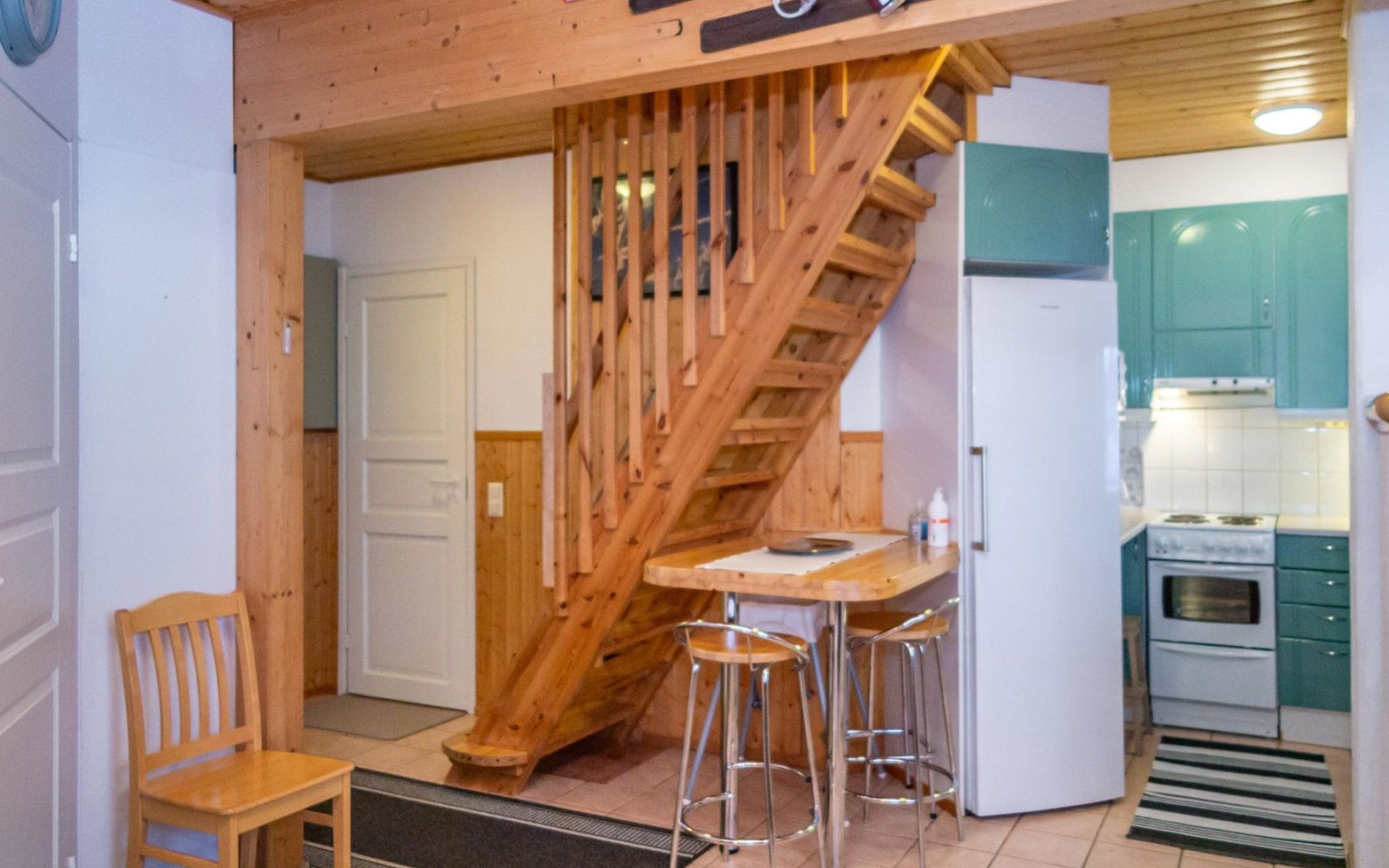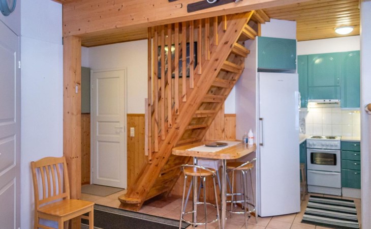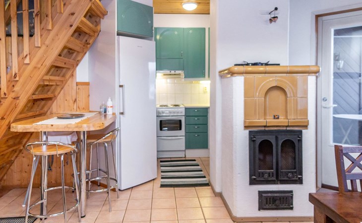 The lower floor of the apartment has been renovated in 2017, the downstairs living room has a high ceiling, a dining group, a fireplace and a sofa bed. Kitchenette, bar counter, washroom with toilet and sauna (electric heat.). Access to the terrace from the living room.