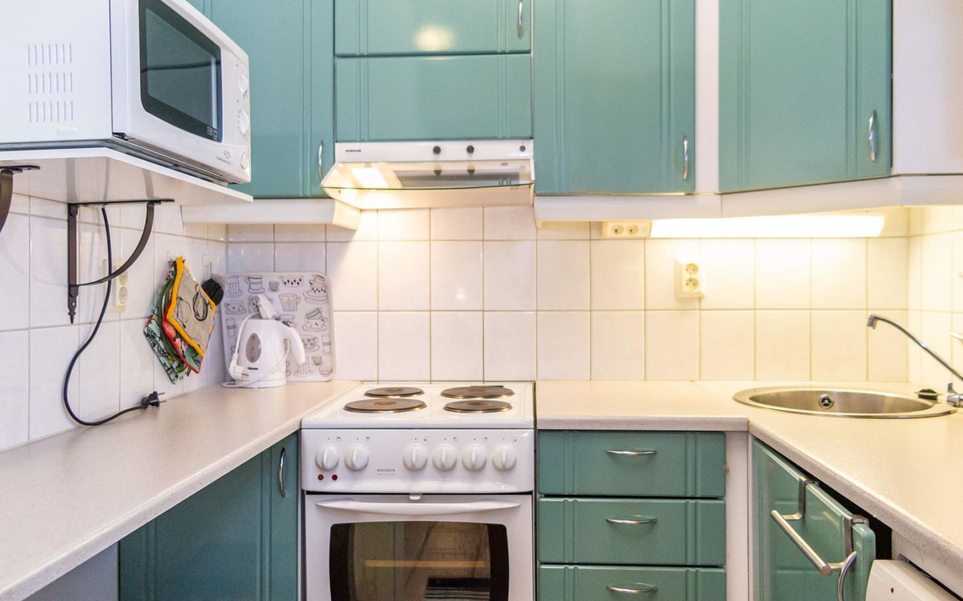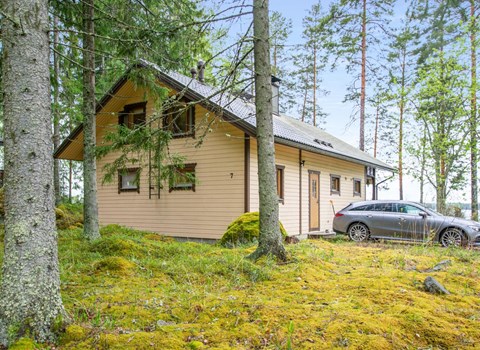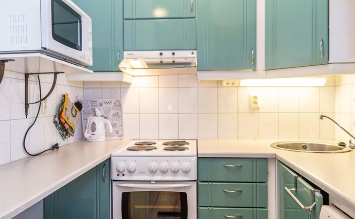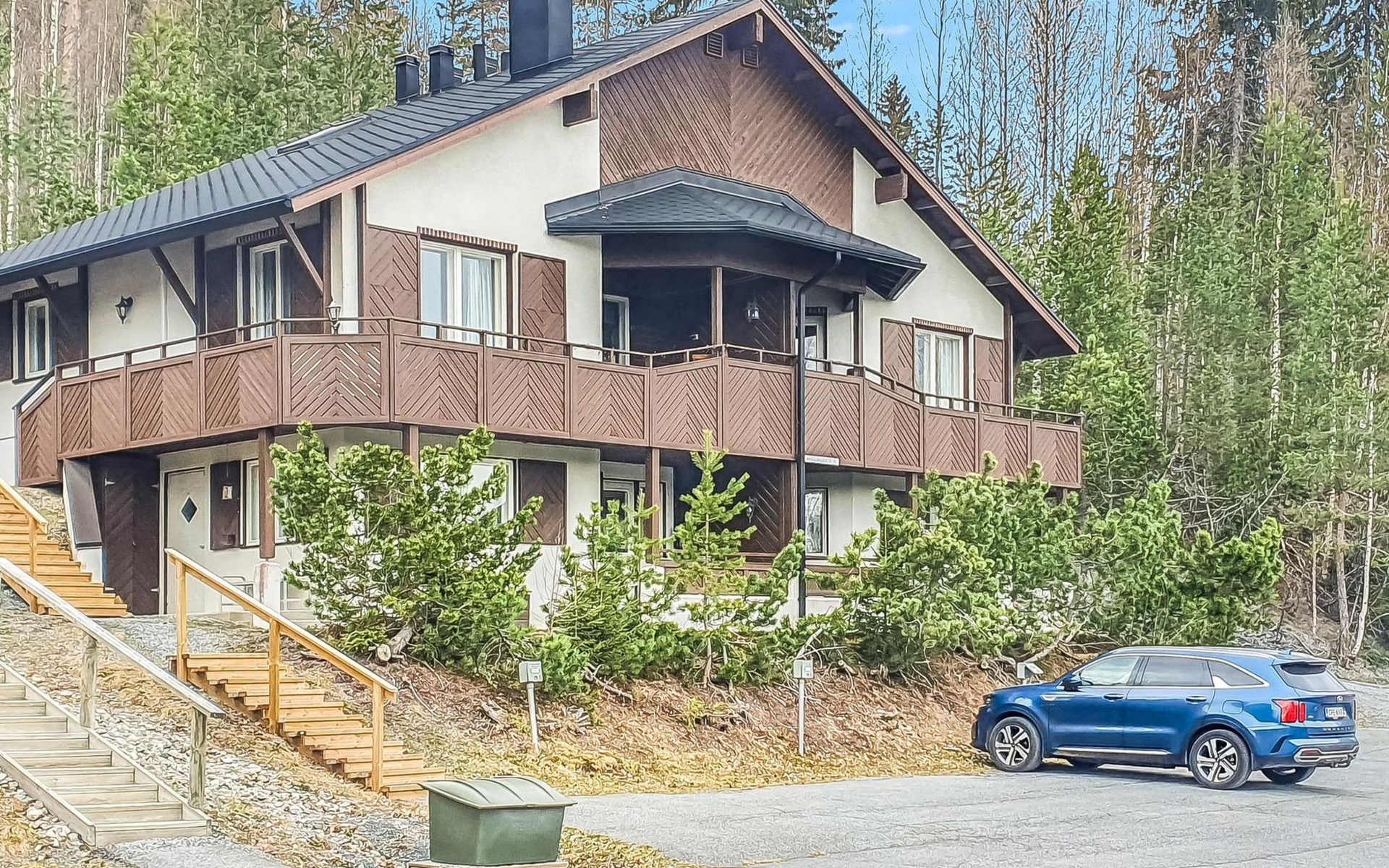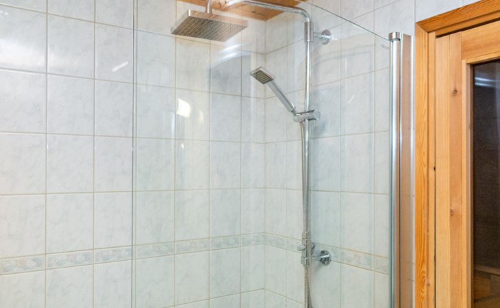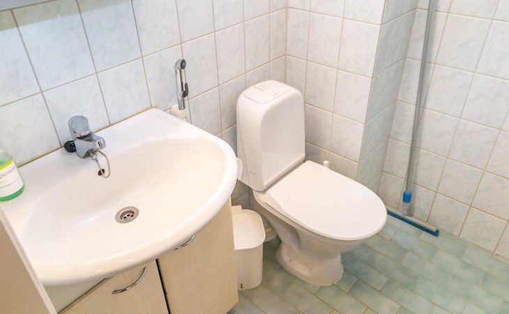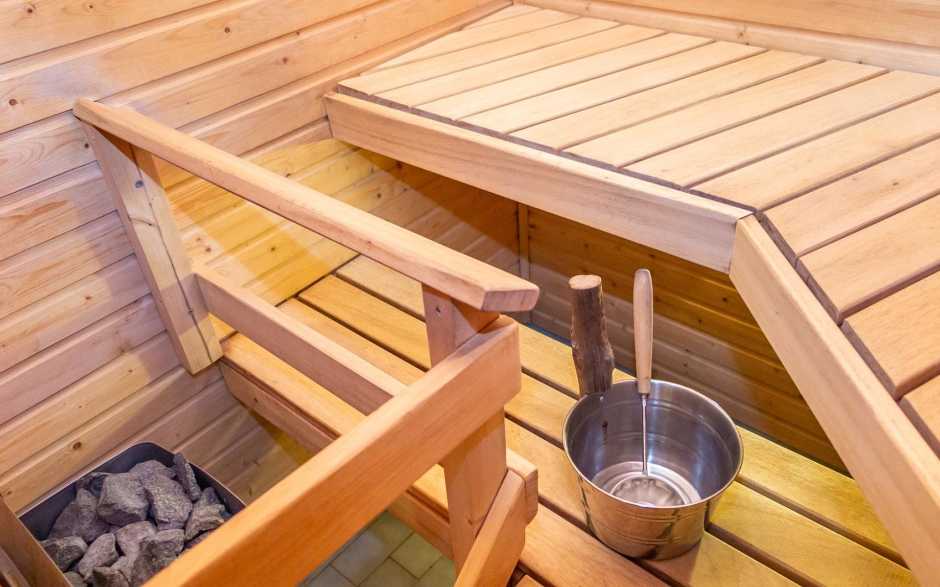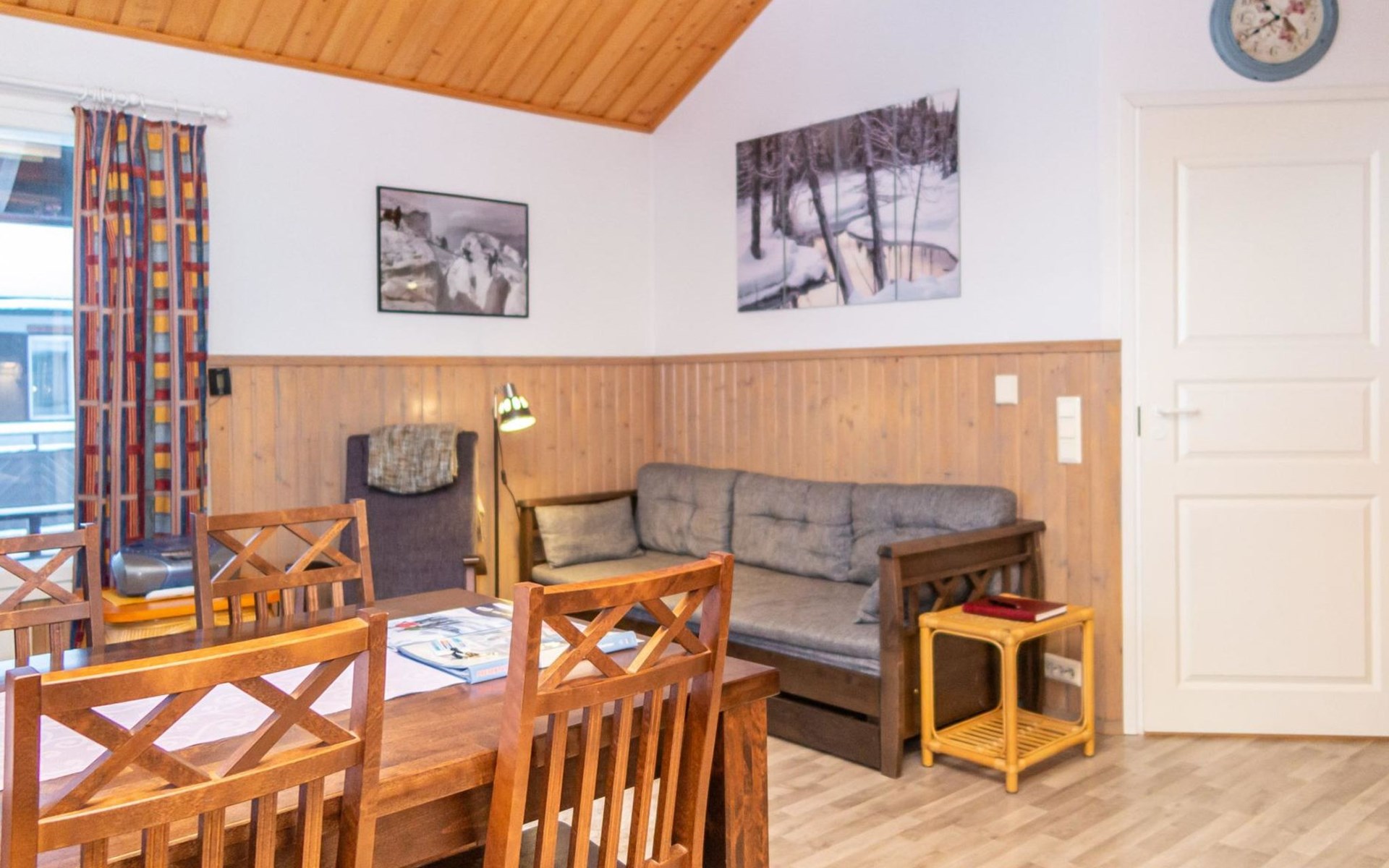 The lower floor of the apartment has been renovated in 2017, the downstairs living room has a high ceiling, a dining group, a fireplace and a sofa bed. Kitchenette, bar counter, washroom with toilet and sauna (electric heat.). Access to the terrace from the living room.