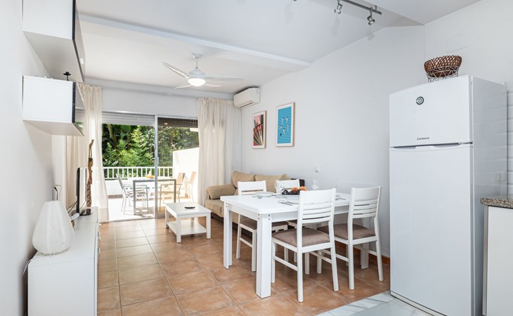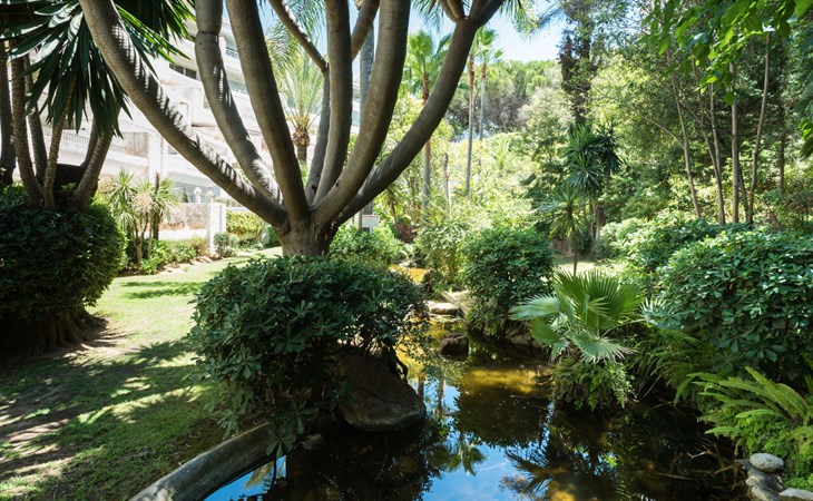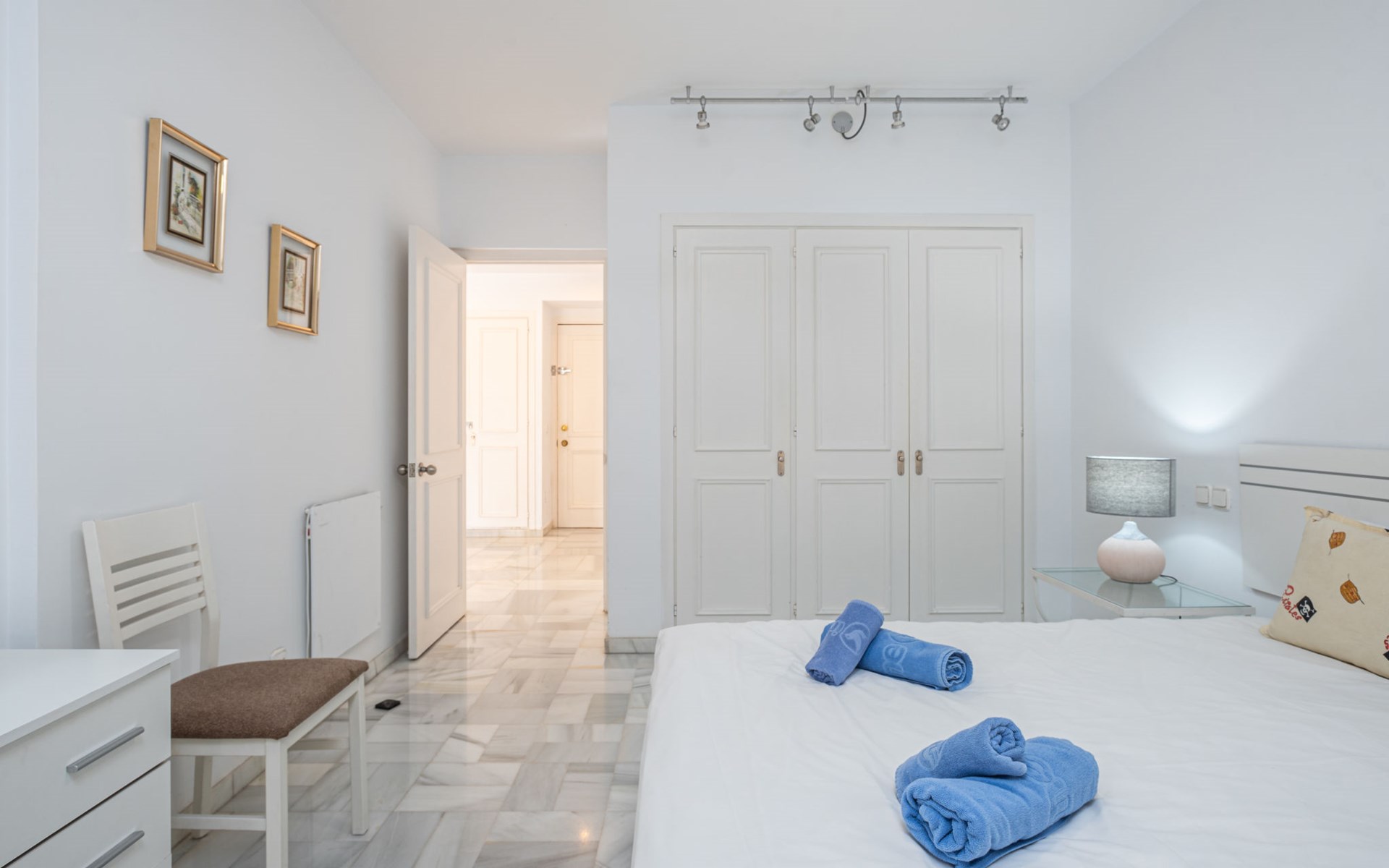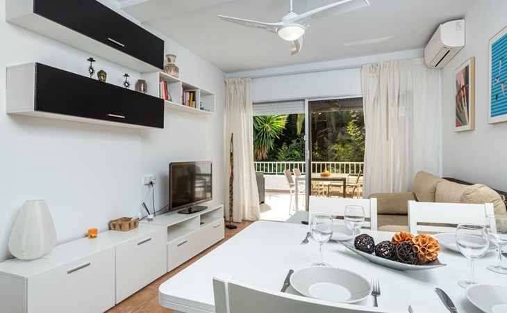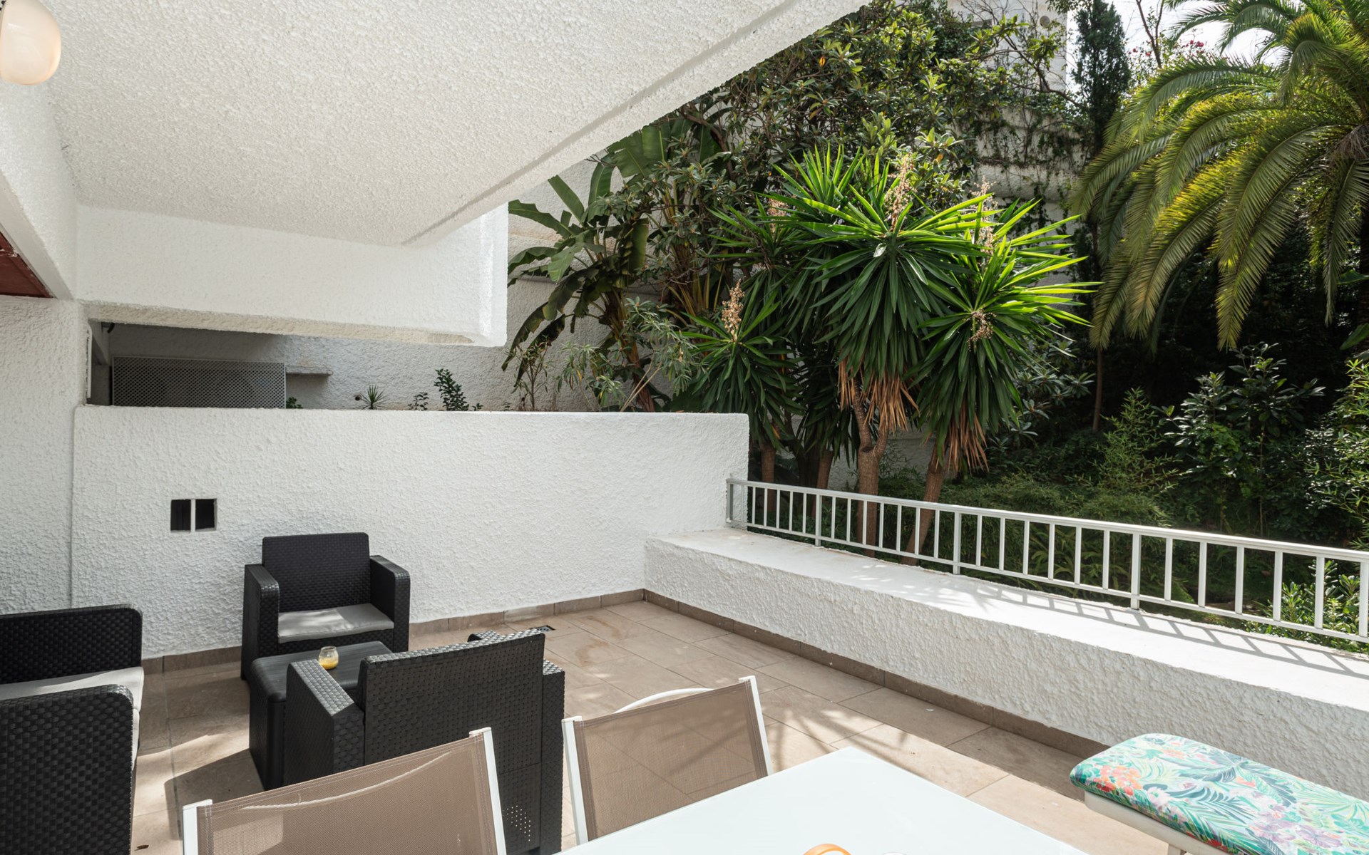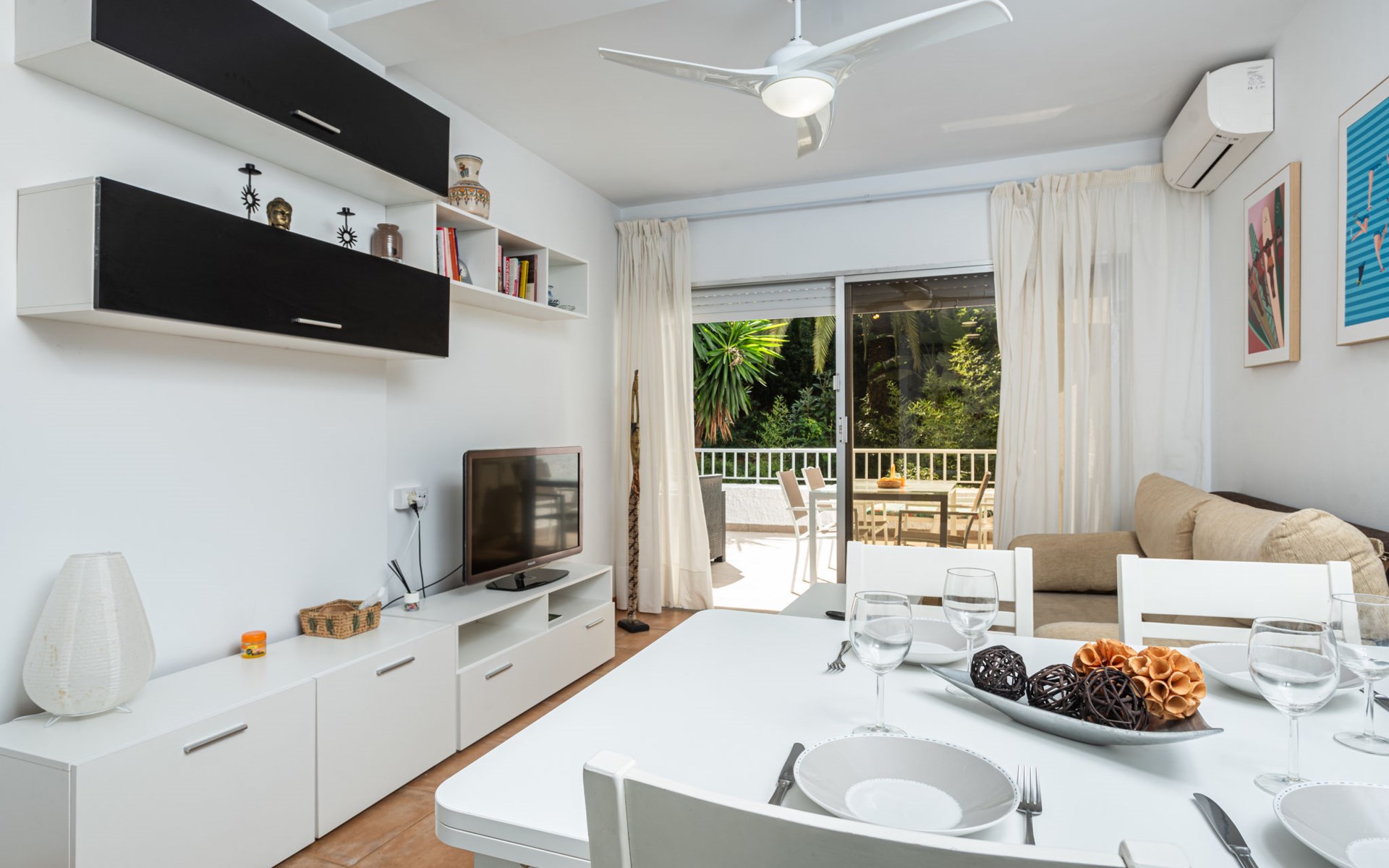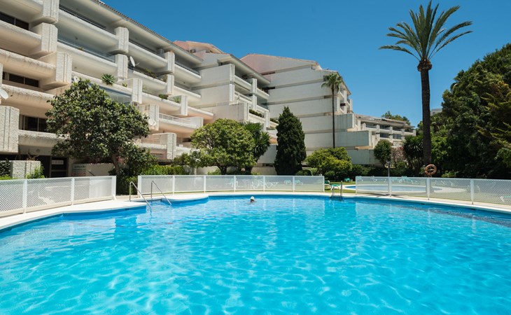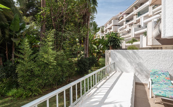 Residence "Jardines Del Mar". In the resort Marbella, excellent location: right in the centre but still quiet, 100 m from the sea. For shared use: garden with lawn and trees, swimming pool (seasonal availability: 15.Jun. - 15.Sep.). Children's pool, table tennis. In the complex: lift. Parking. Shop 200 m, restaurant 50 m, bus stop 100 m, sandy beach. Tennis 100 m. Please note: the complex has night security.