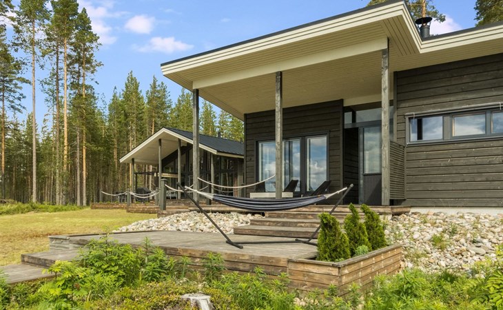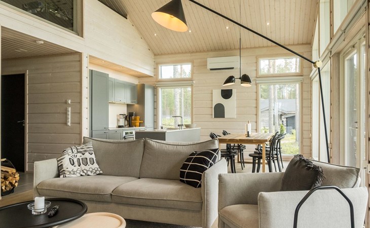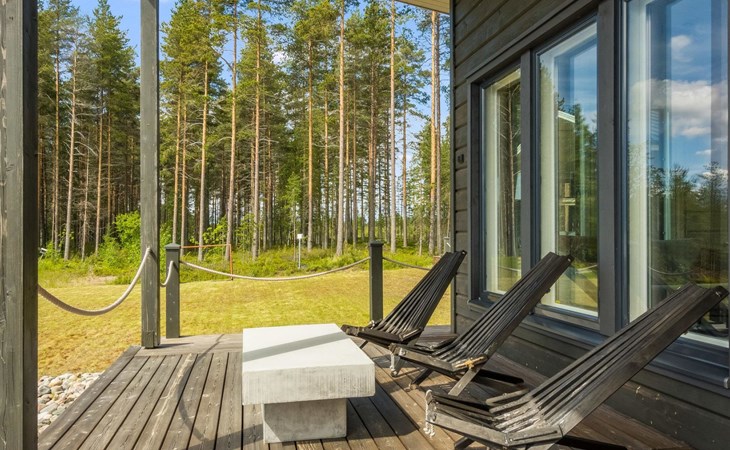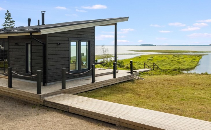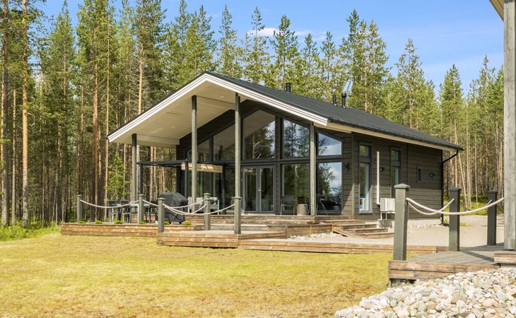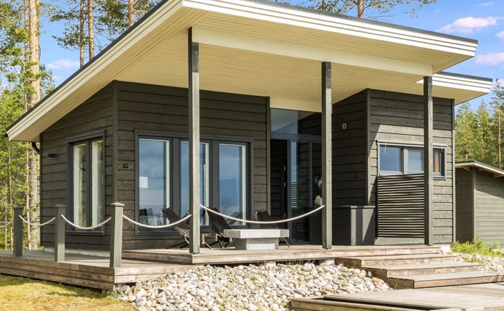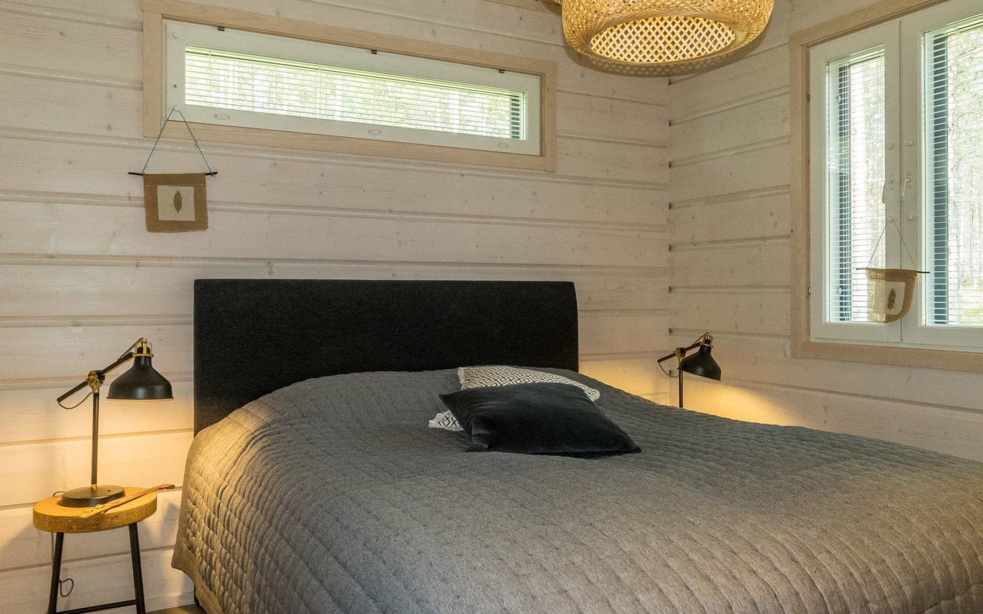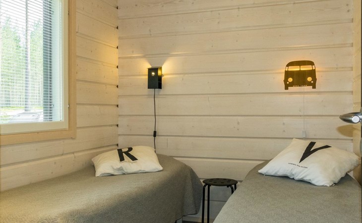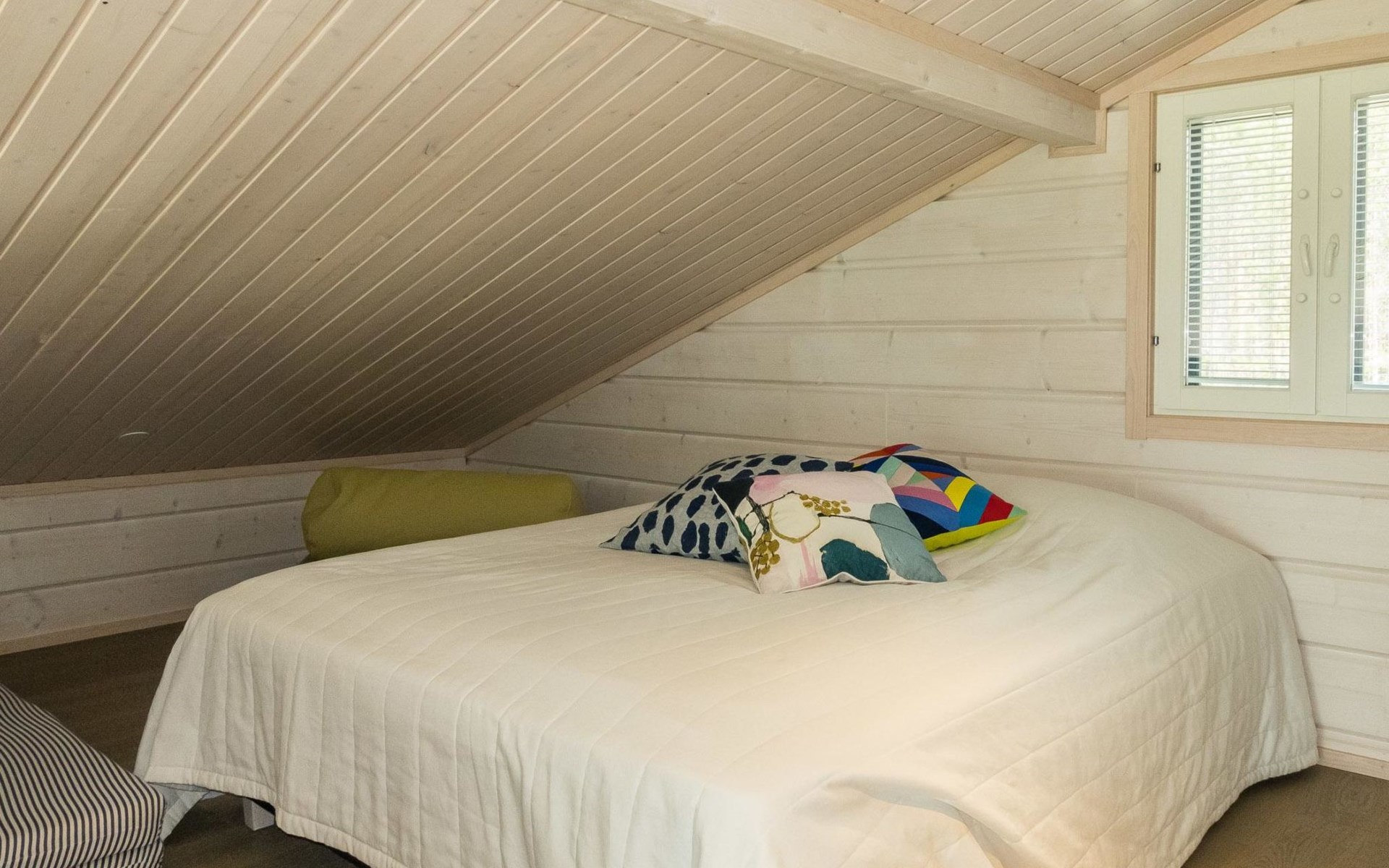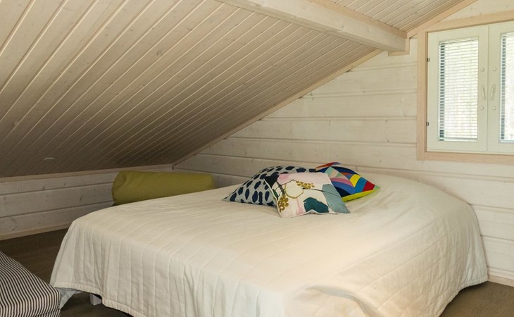 Log-paneled cabin, built in 2016. Living room/kitchen, double bed in the bedroom (width 180 cm), 2 separate beds in second bedroom, 2 beds in the loft, sofa bed and 2 separate mattresses. The loft beds have both a common mattress pad and separate mattress pads. The cabin also has washroom/WC and partially covered terrace.