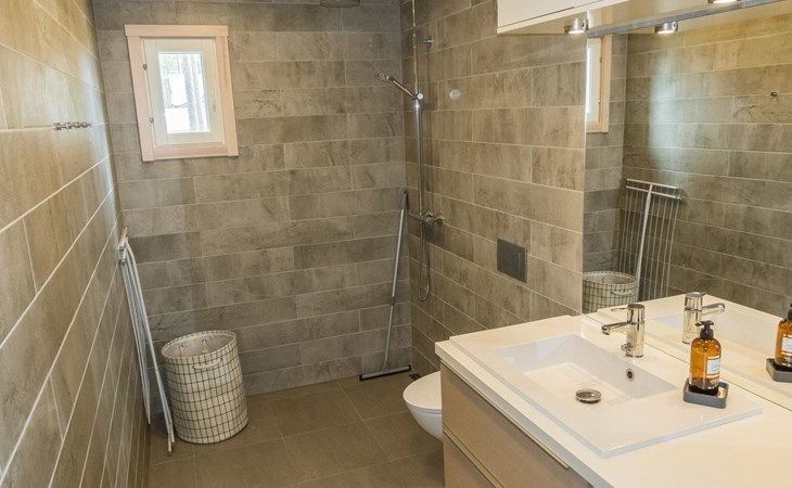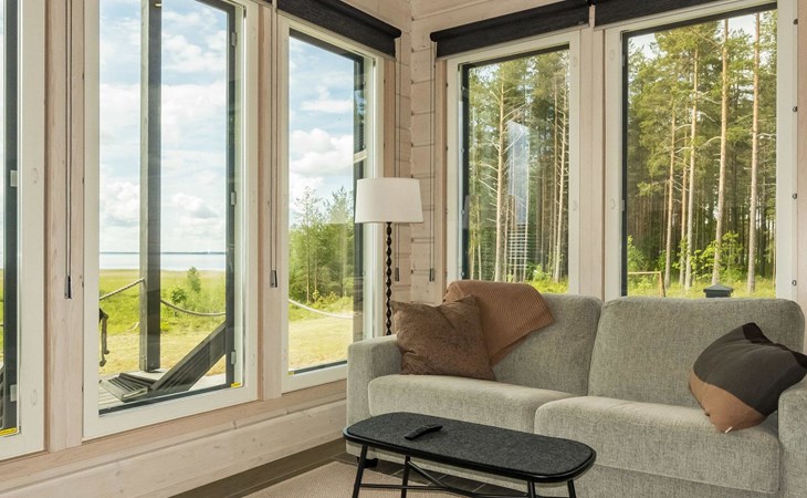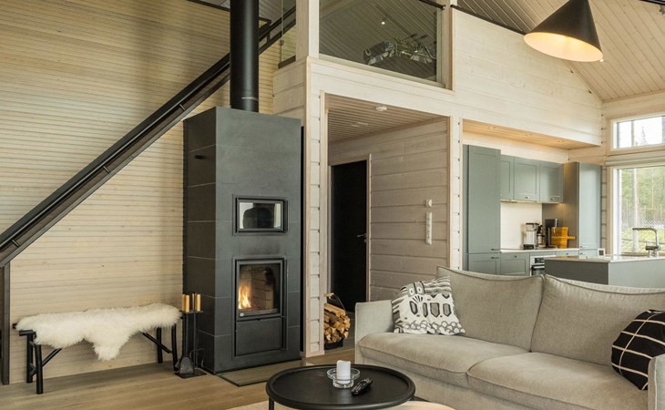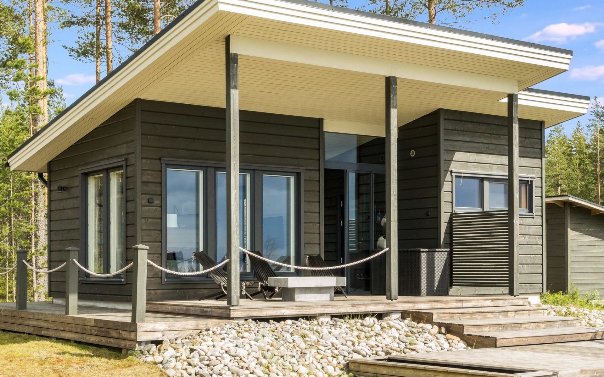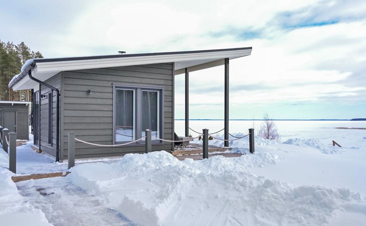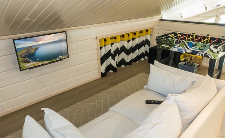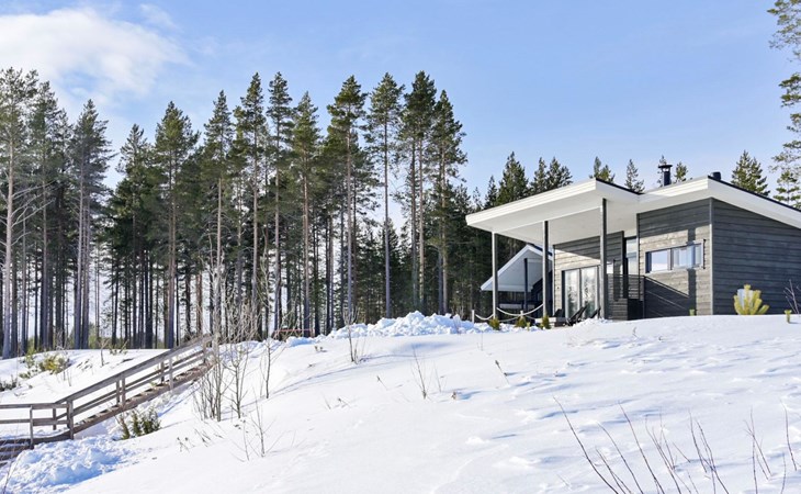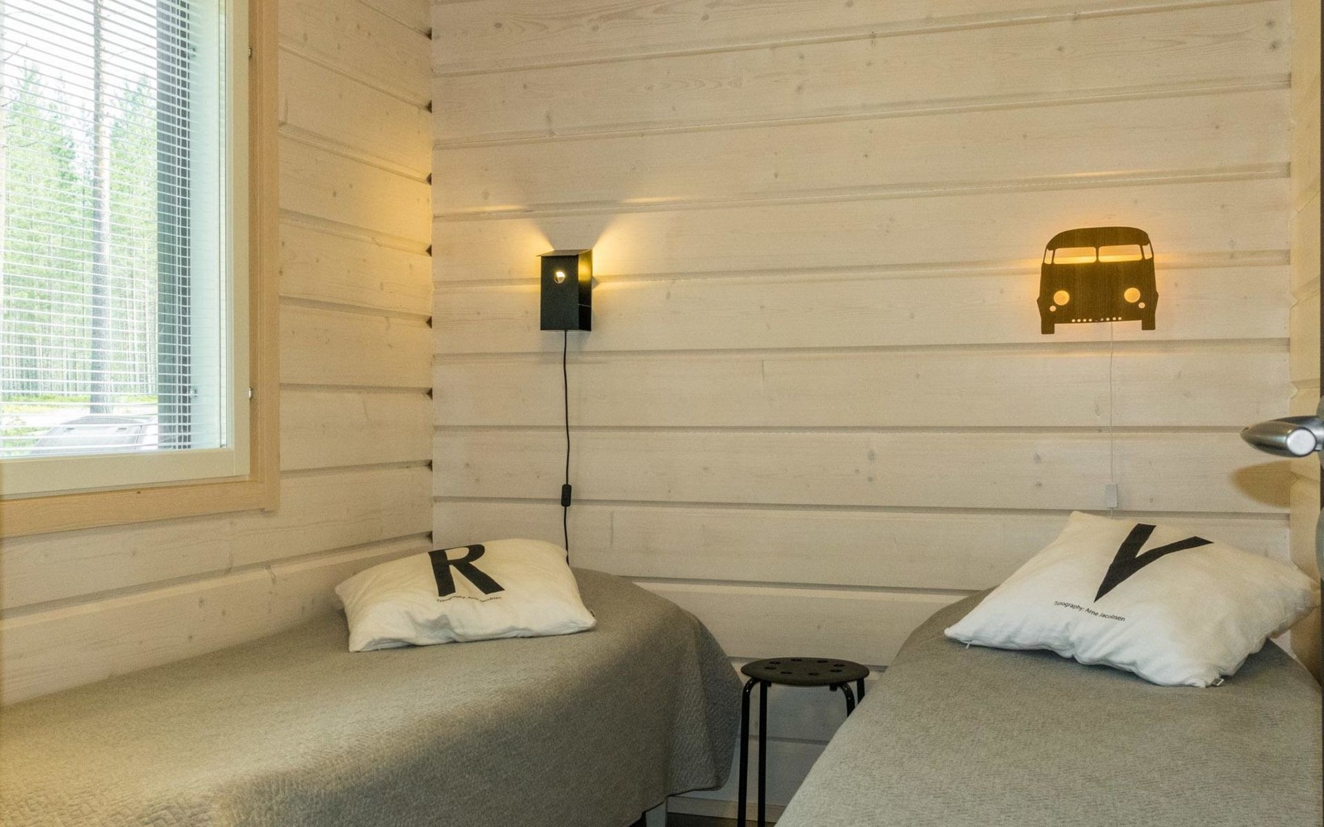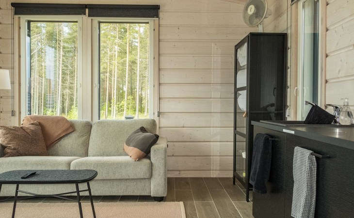 Log-paneled cabin, built in 2016. Living room/kitchen, double bed in the bedroom (width 180 cm), 2 separate beds in second bedroom, 2 beds in the loft, sofa bed and 2 separate mattresses. The loft beds have both a common mattress pad and separate mattress pads. The cabin also has washroom/WC and partially covered terrace.