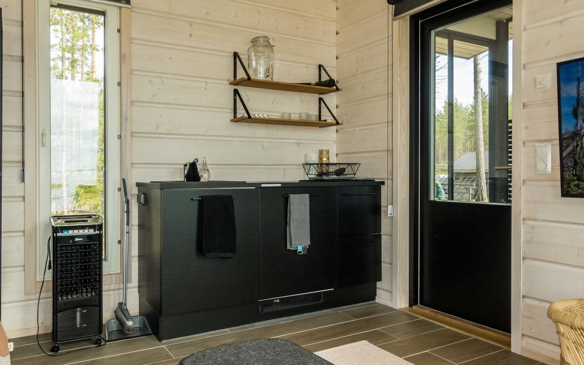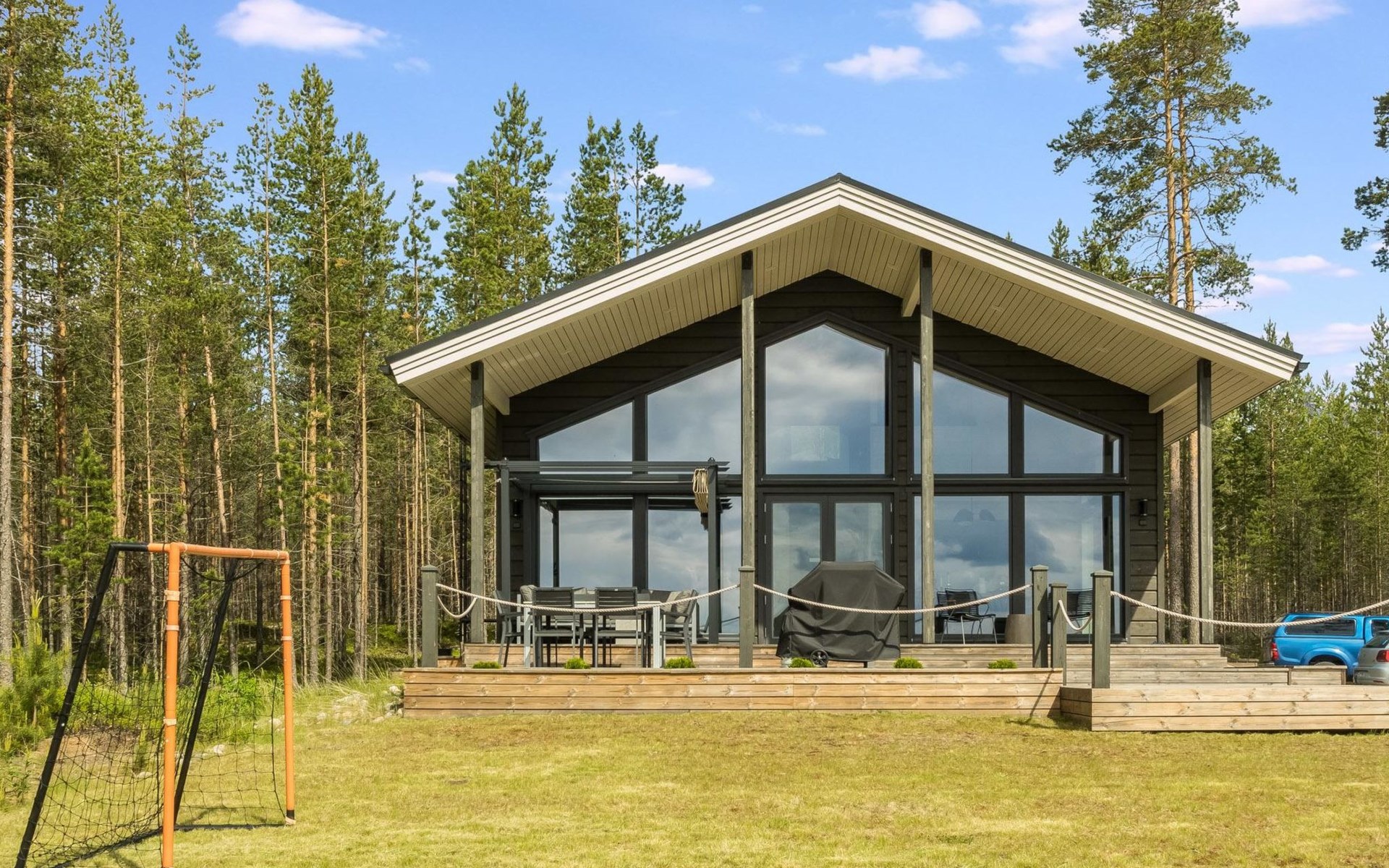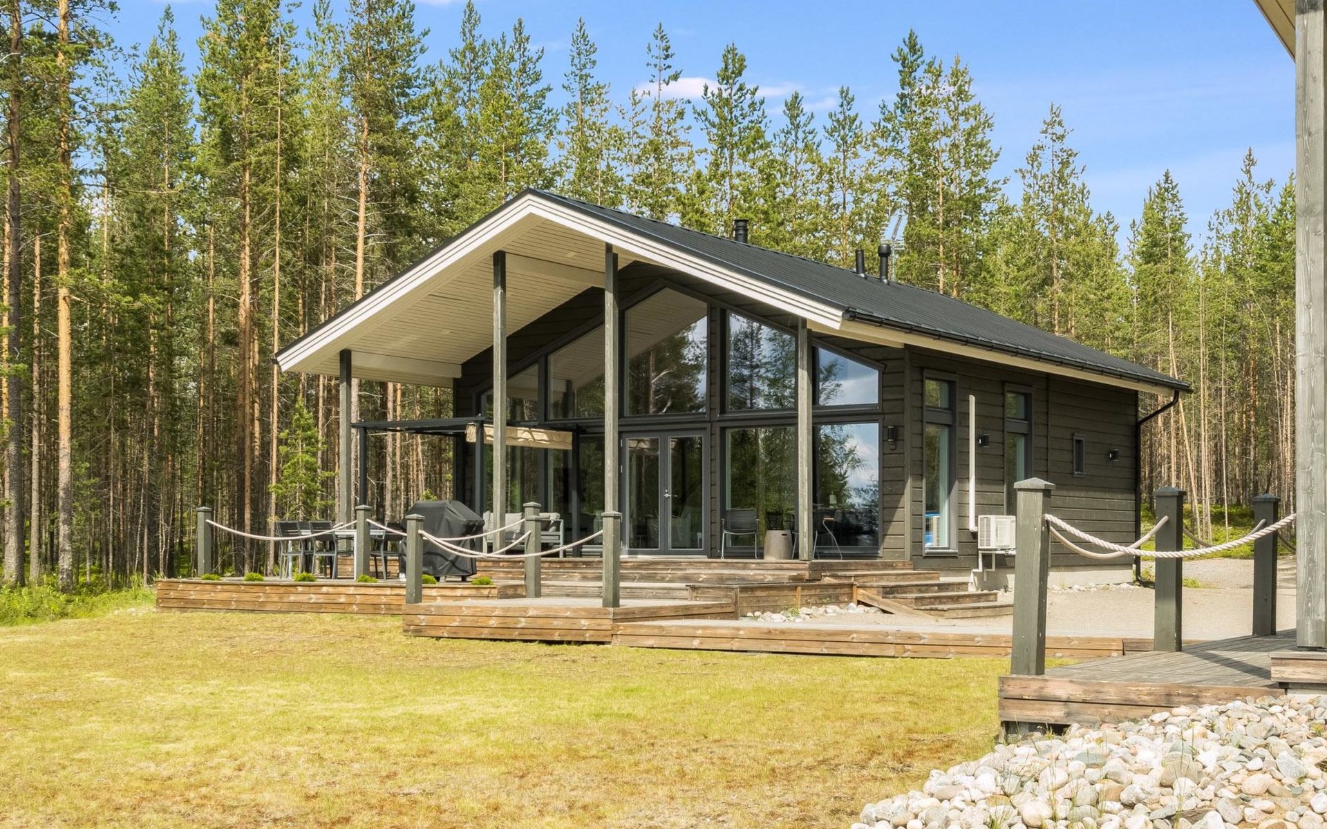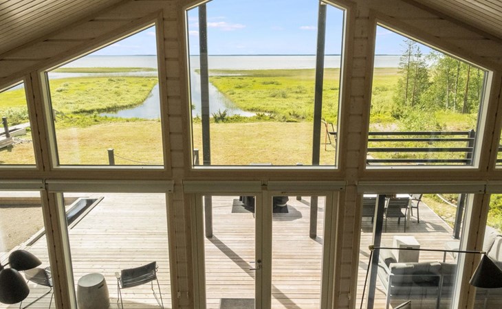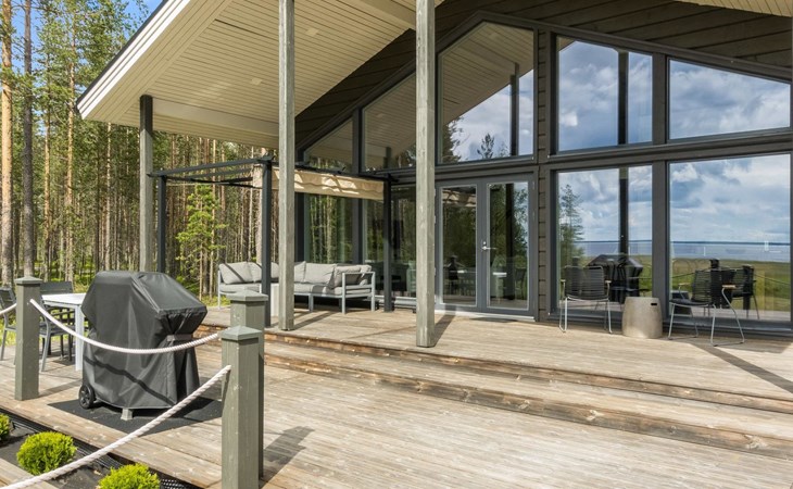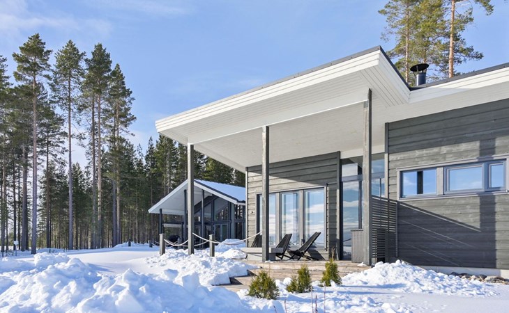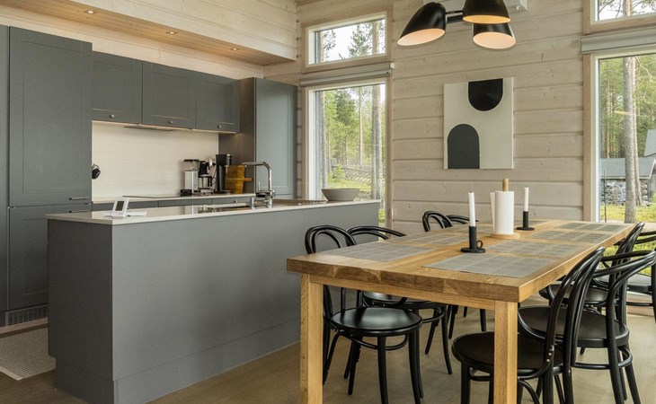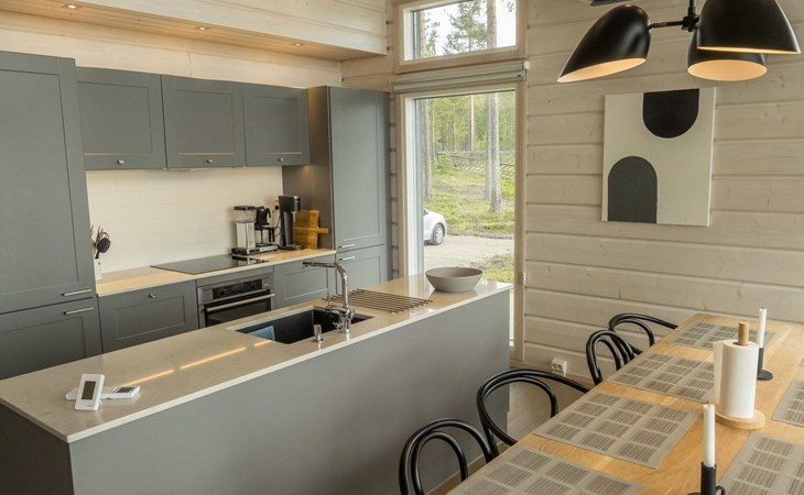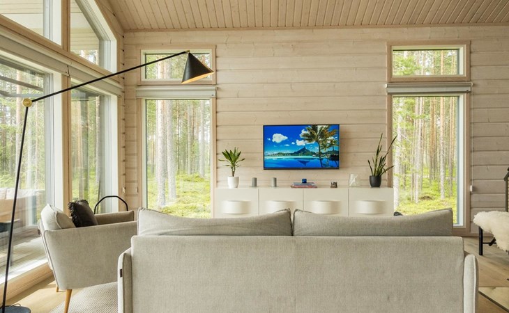 Log-paneled cabin, built in 2016. Living room/kitchen, double bed in the bedroom (width 180 cm), 2 separate beds in second bedroom, 2 beds in the loft, sofa bed and 2 separate mattresses. The loft beds have both a common mattress pad and separate mattress pads. The cabin also has washroom/WC and partially covered terrace.