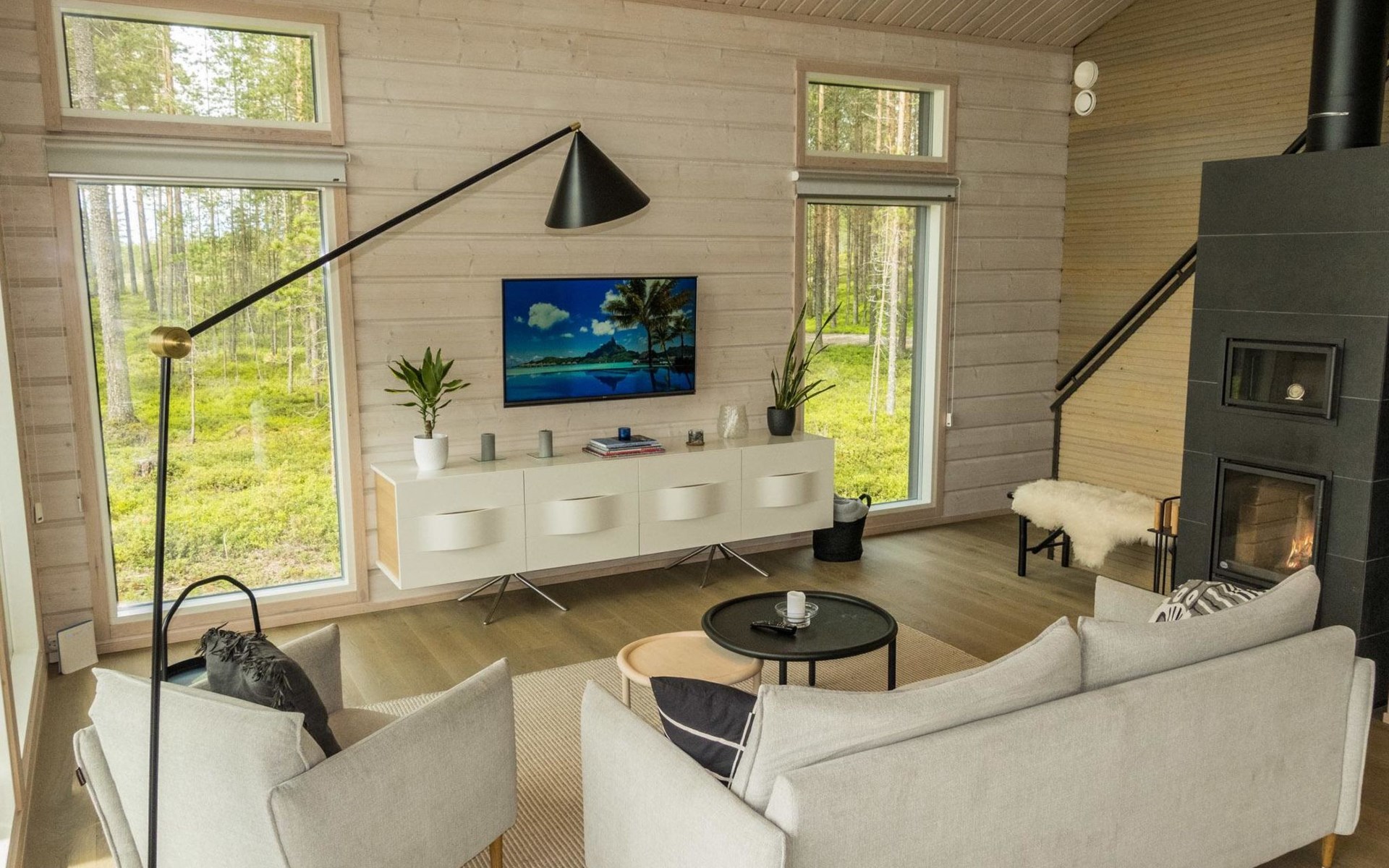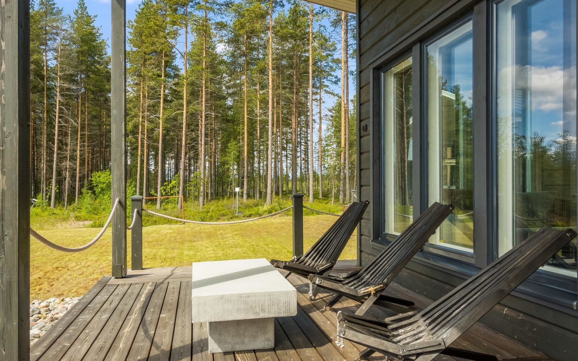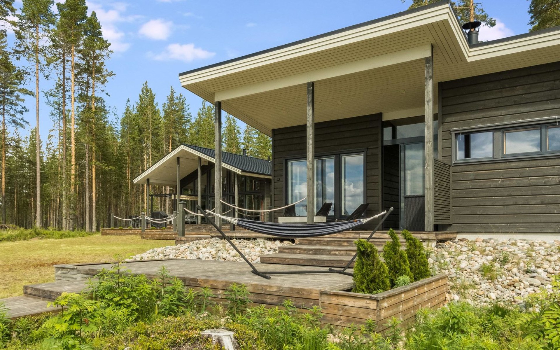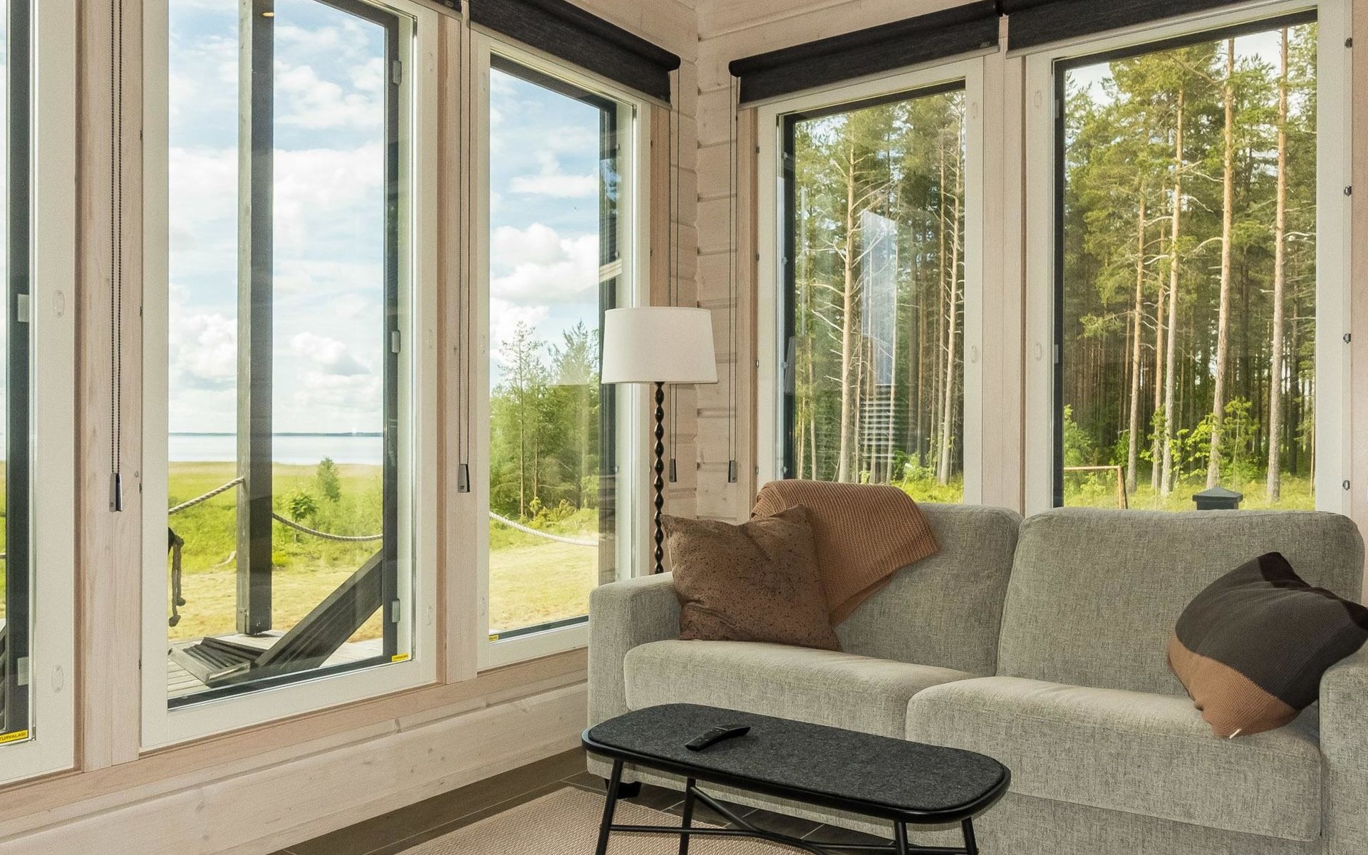 Log-paneled cabin, built in 2016. Living room/kitchen, double bed in the bedroom (width 180 cm), 2 separate beds in second bedroom, 2 beds in the loft, sofa bed and 2 separate mattresses. The loft beds have both a common mattress pad and separate mattress pads. The cabin also has washroom/WC and partially covered terrace.