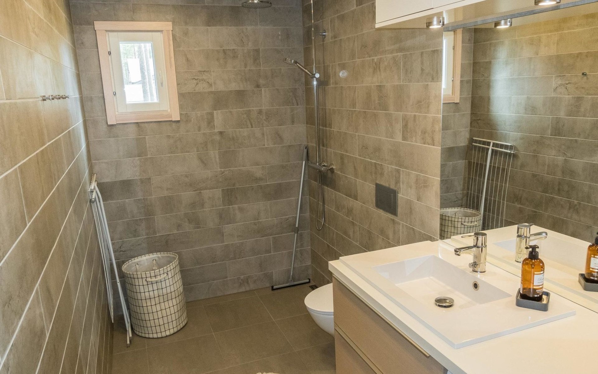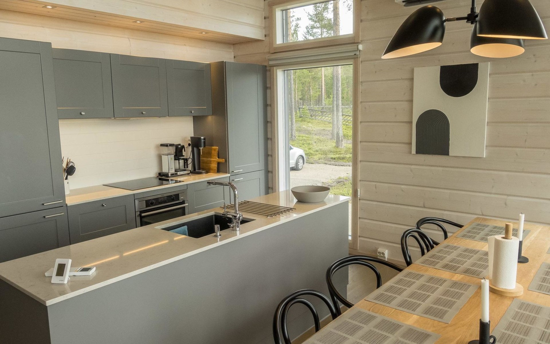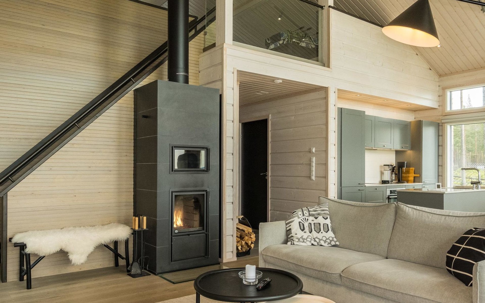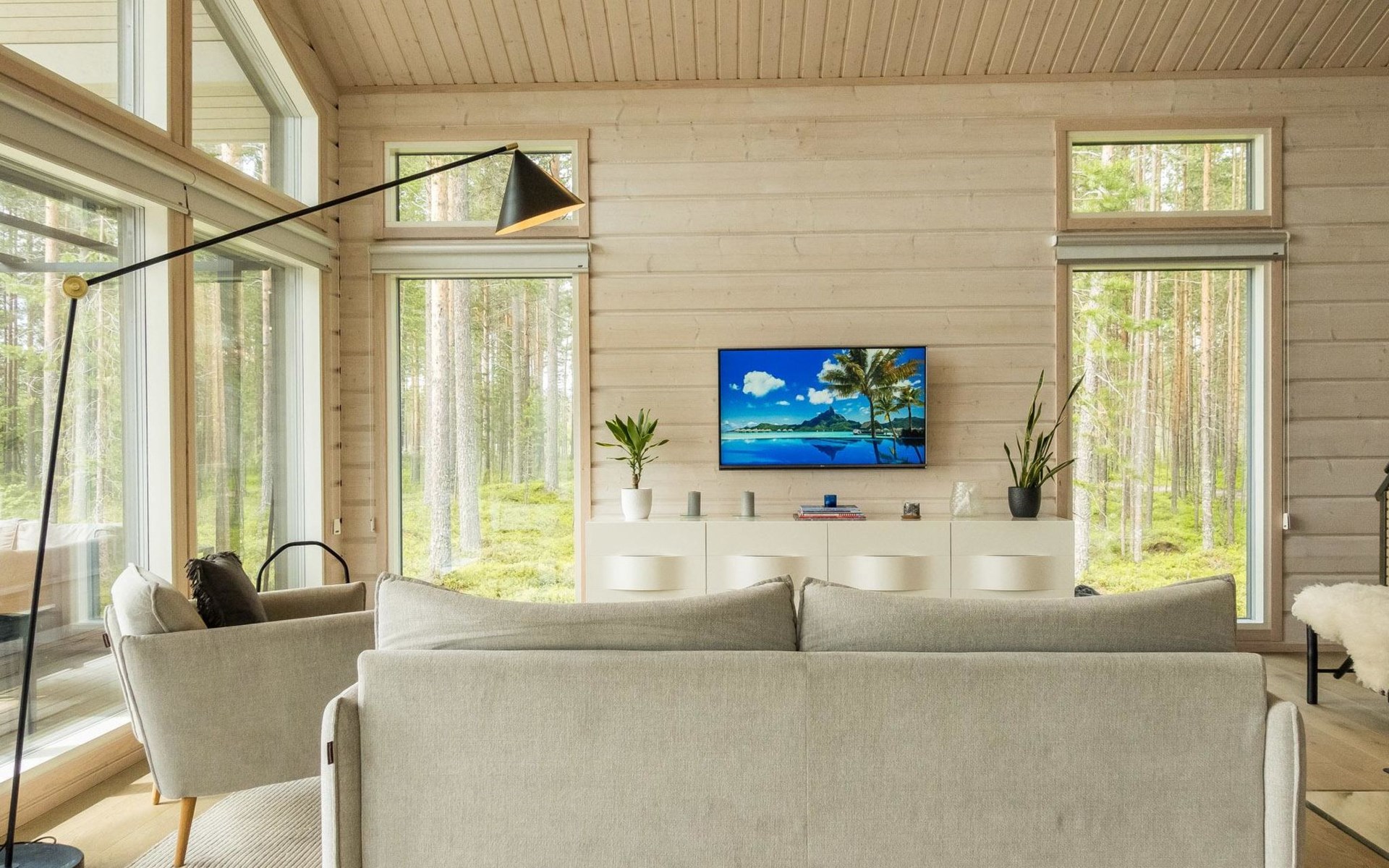Log-paneled cabin, built in 2016. Living room/kitchen, double bed in the bedroom (width 180 cm), 2 separate beds in second bedroom, 2 beds in the loft, sofa bed and 2 separate mattresses. The loft beds have both a common mattress pad and separate mattress pads. The cabin also has washroom/WC and partially covered terrace.