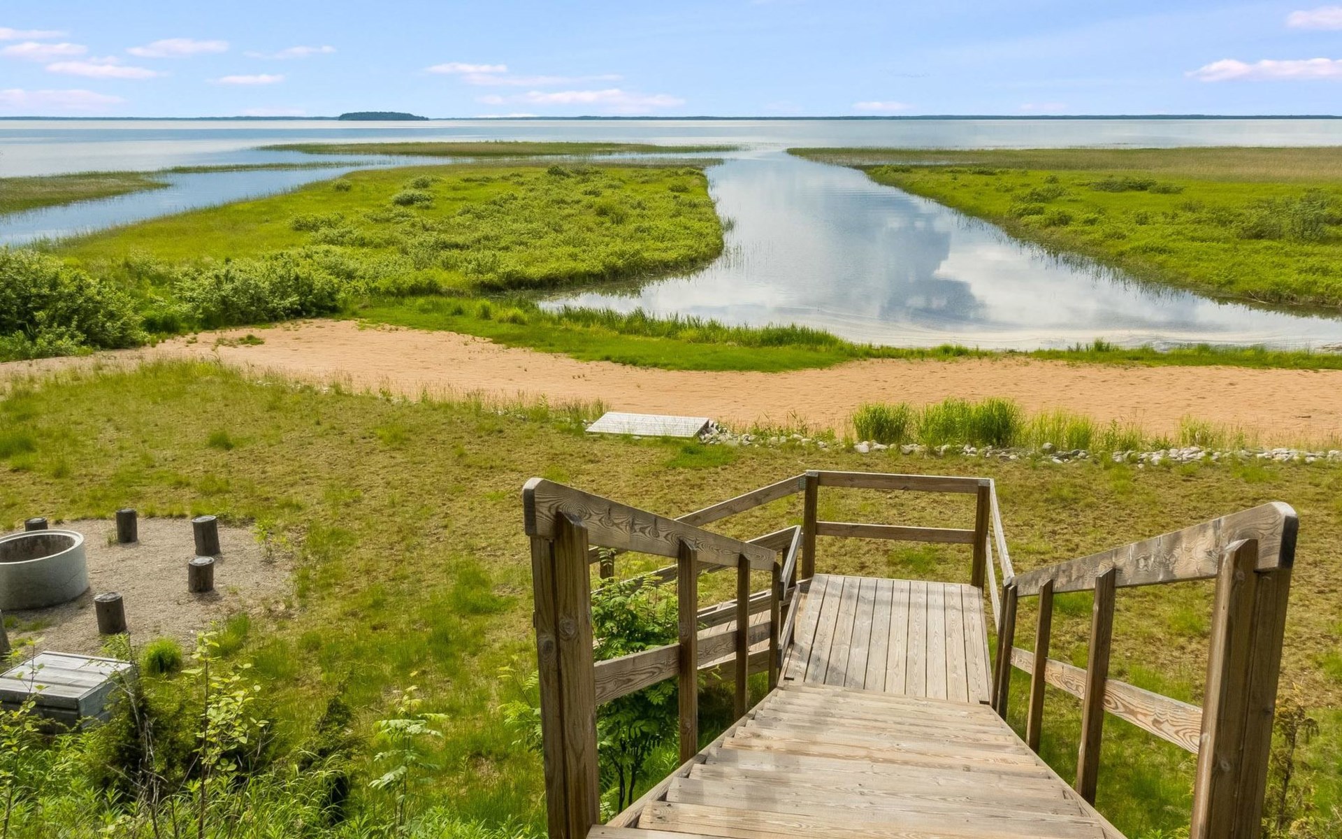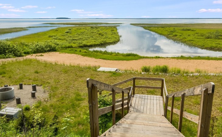90 km to the northwest from Kajaani, 60 m to lake Oulujärvi beach, dredged shallow beach, clay bottom, sand beach, slope and stairs to the beach.