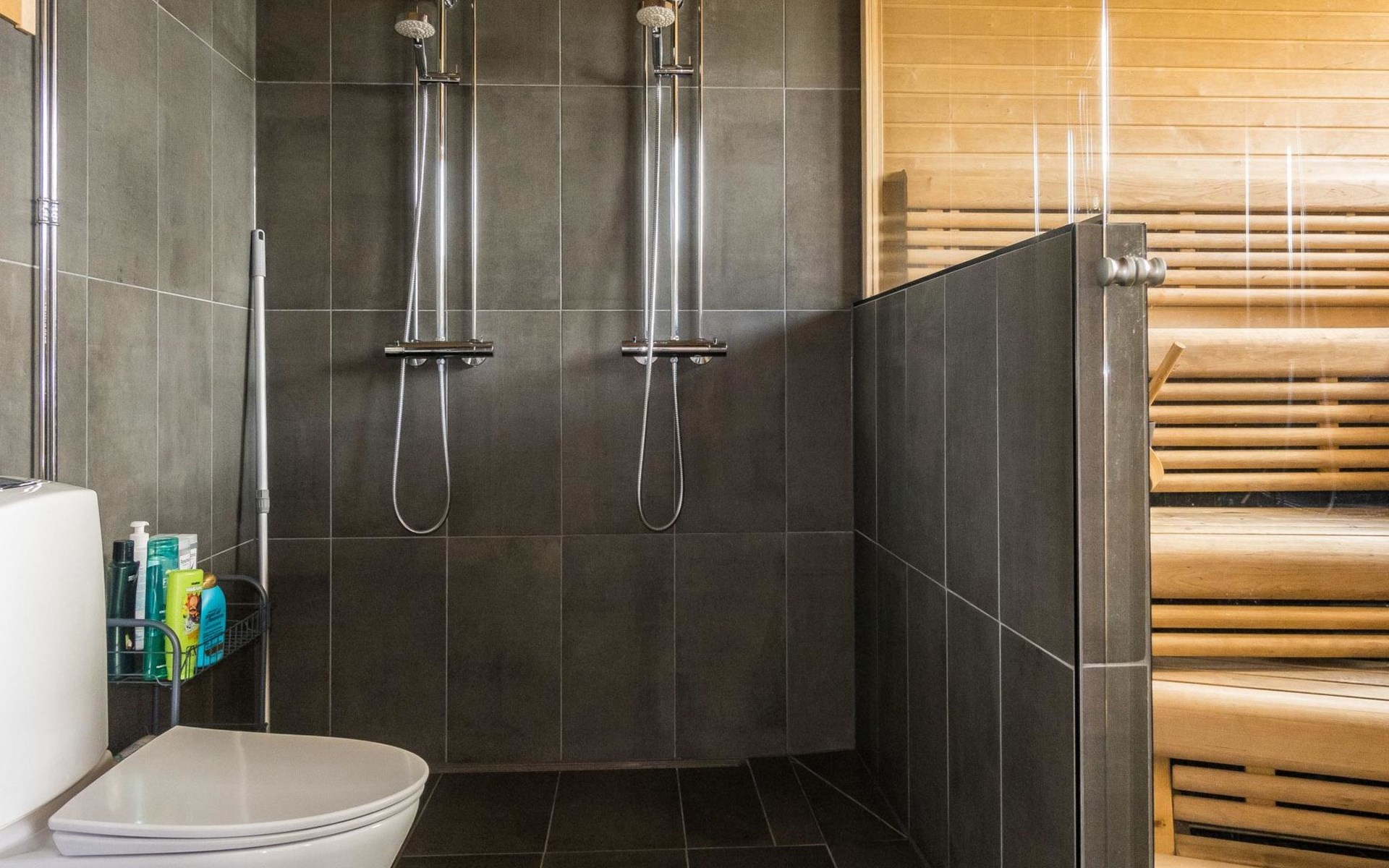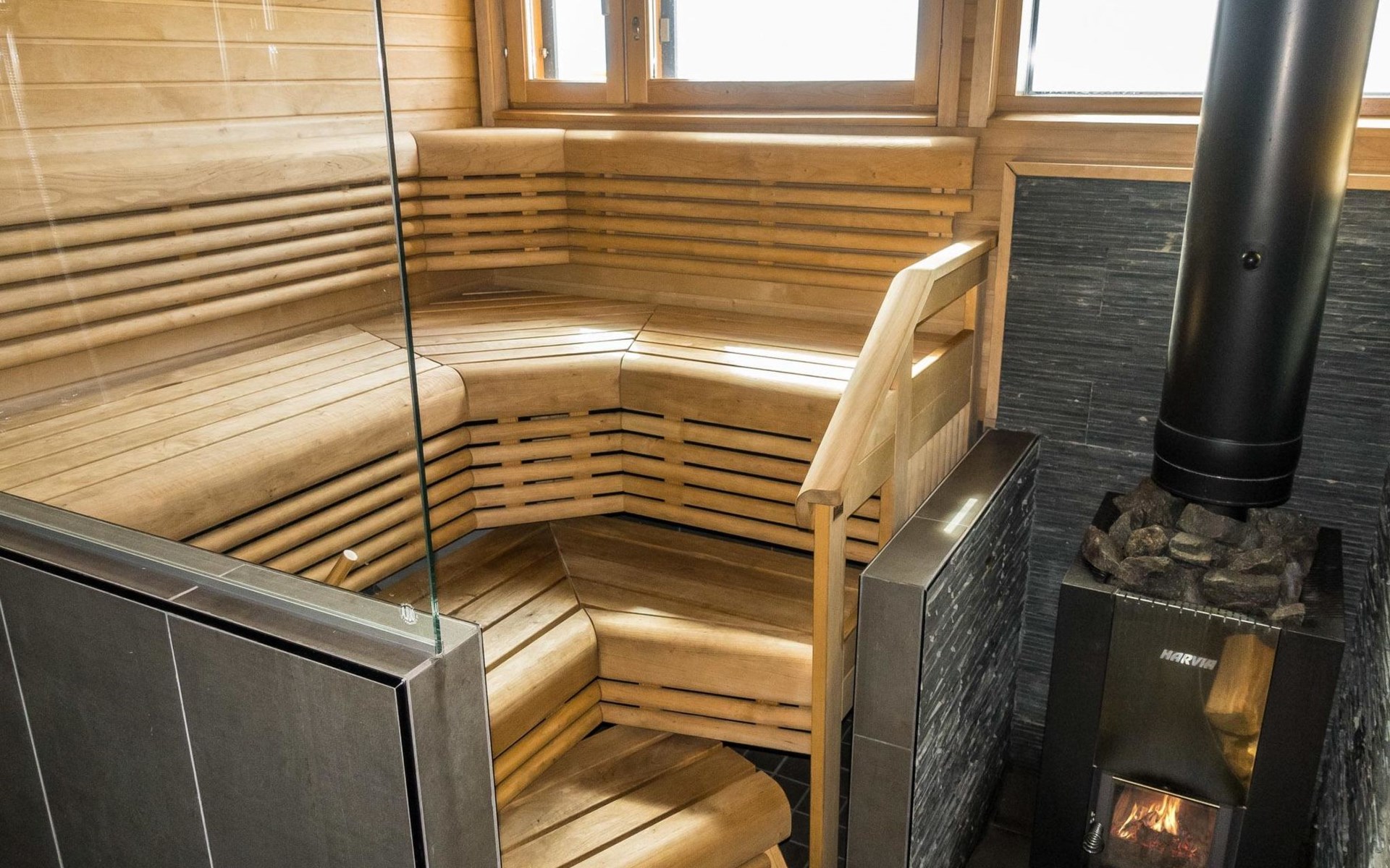 Lakeside sauna with sauna room, washroom/WC, living room and terrace. 2 showers in the washroom, sink, fridge and TV in the living room.