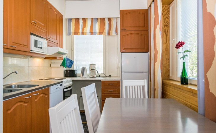 Final cleaning is included in the price. Sheets and towels can be provided at an extra cost. The apartment is equipped with a basic 8-person kitchen, coffee maker, kettle, toaster, electric iron, ironing board, hairdryer and a small outdoor storage room for firewood.