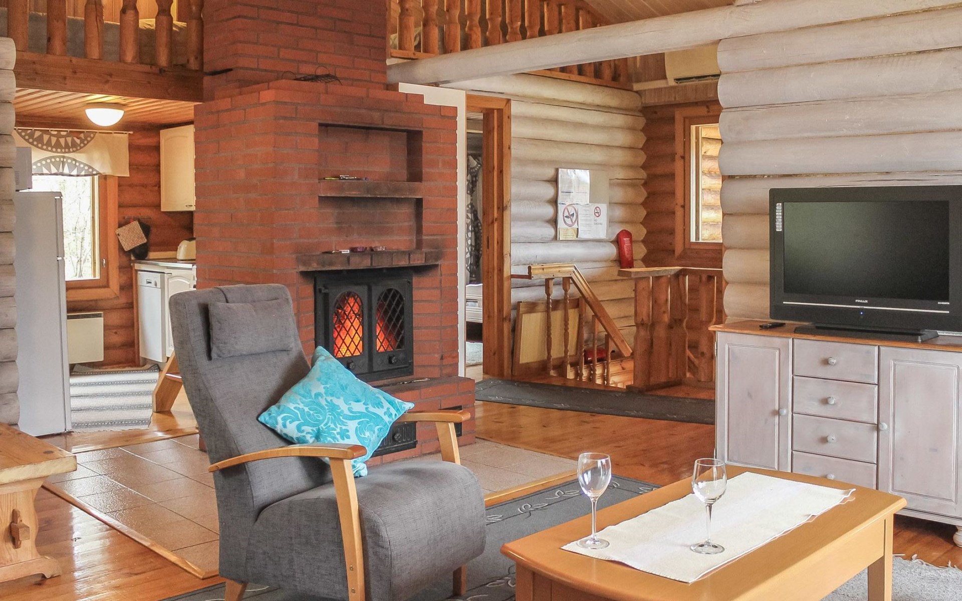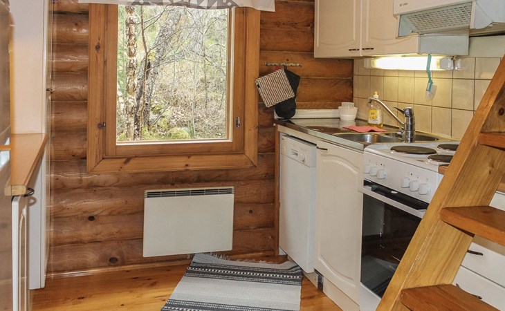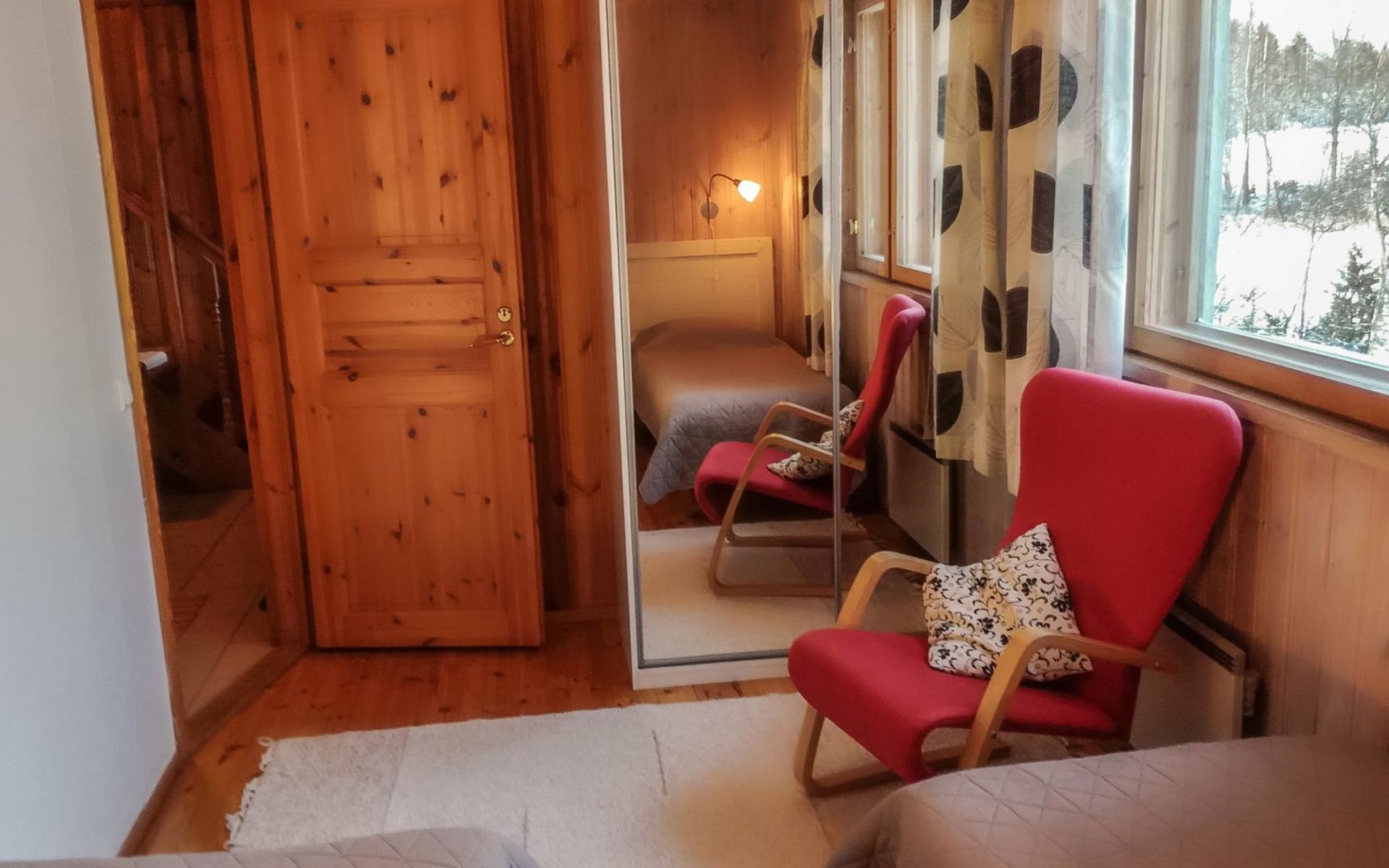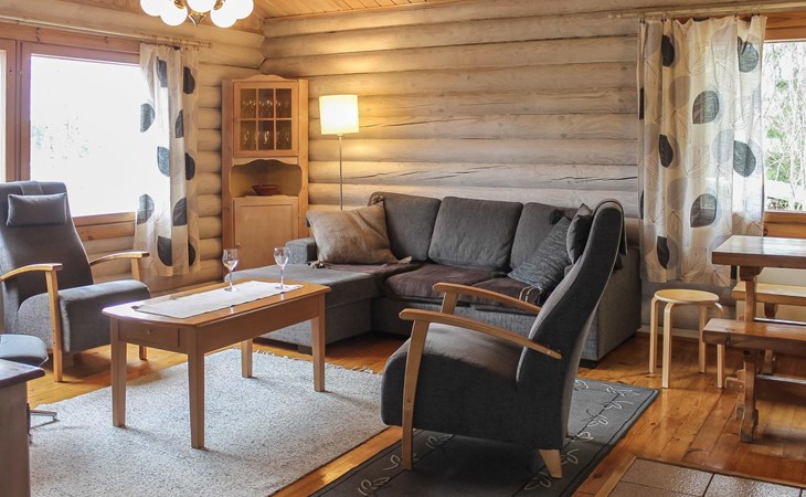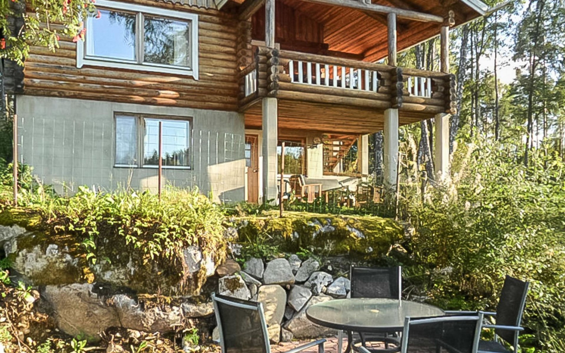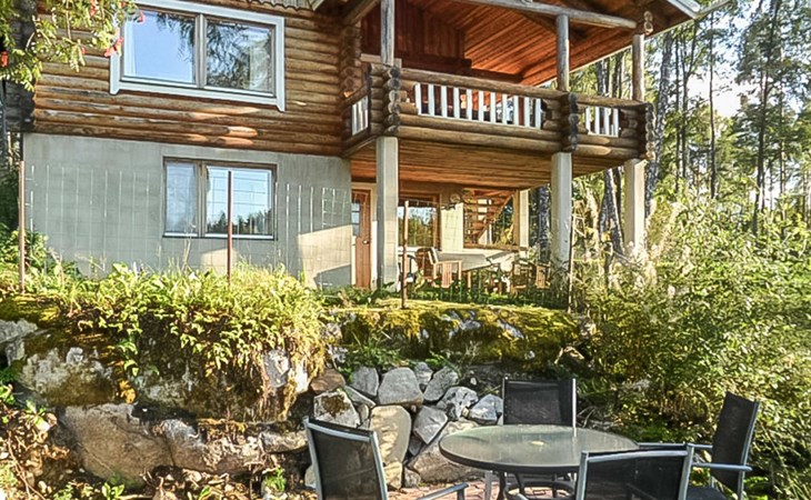 Log cabin 1994. Downstairs: hearth room, bedroom with 2 beds, washroom, sauna, veranda; upstairs: living room, bedroom with double bed, kitchen, sleeping loft (10 m², low room height) with 3 beds, veranda.