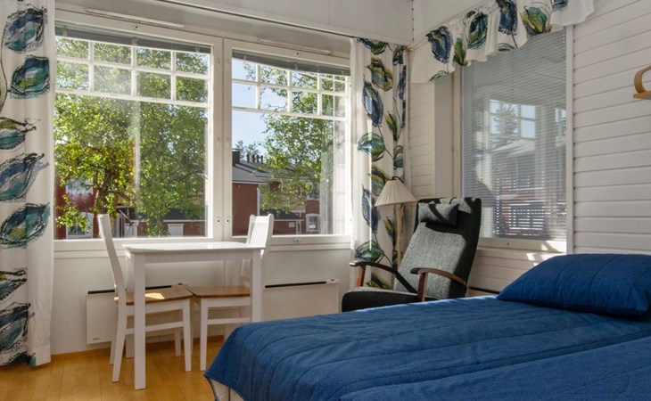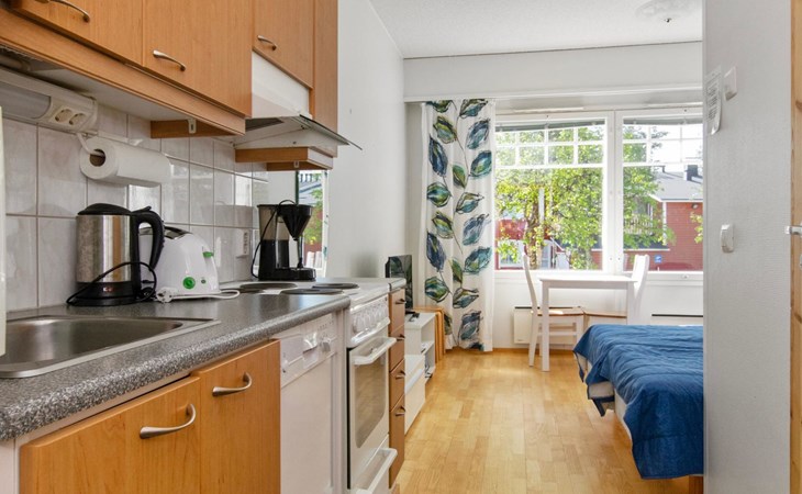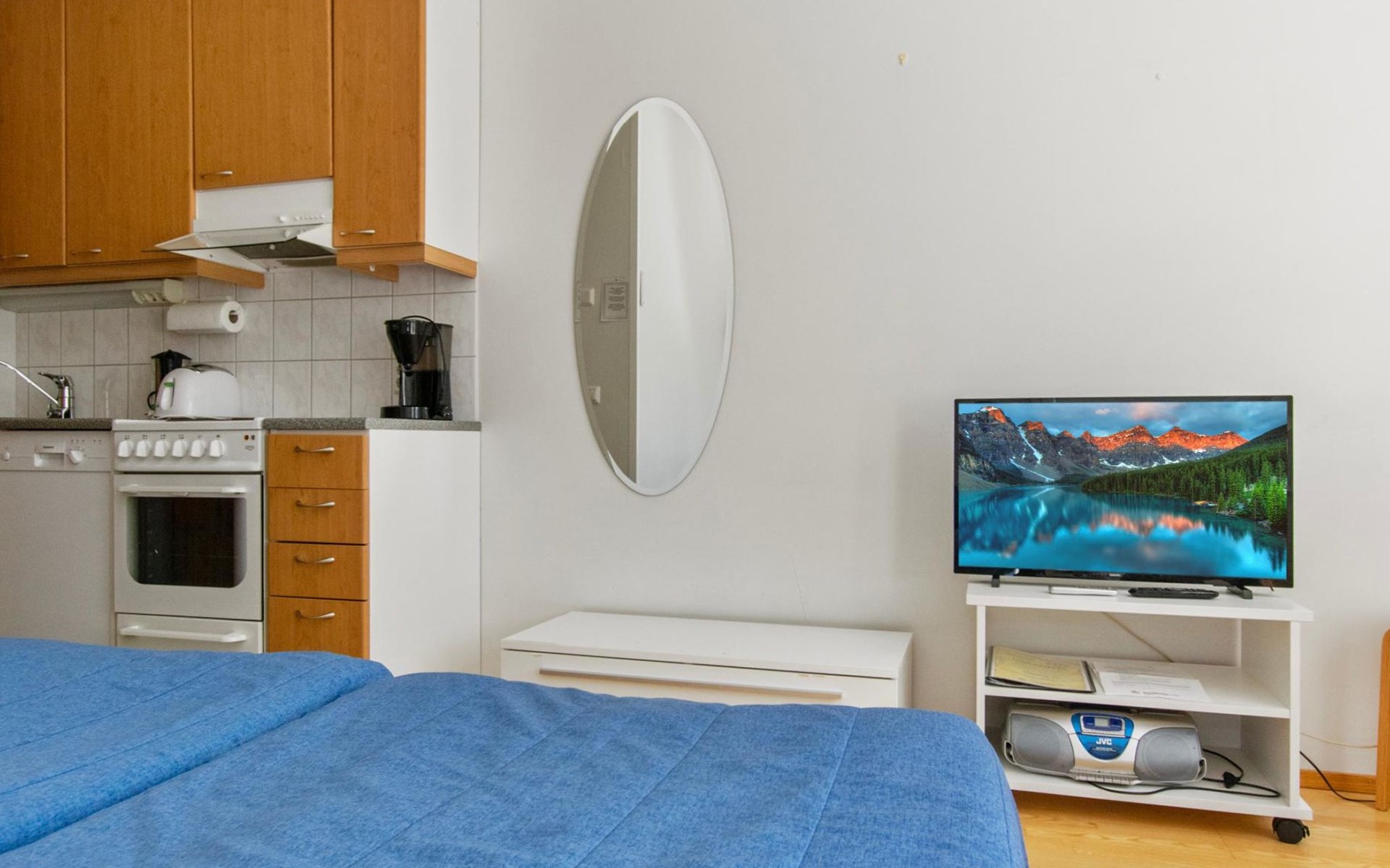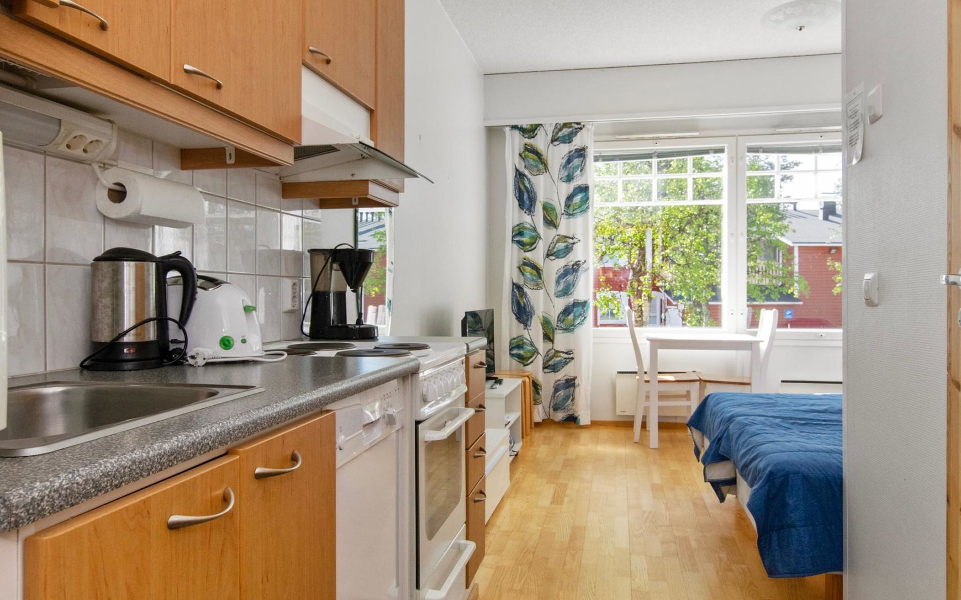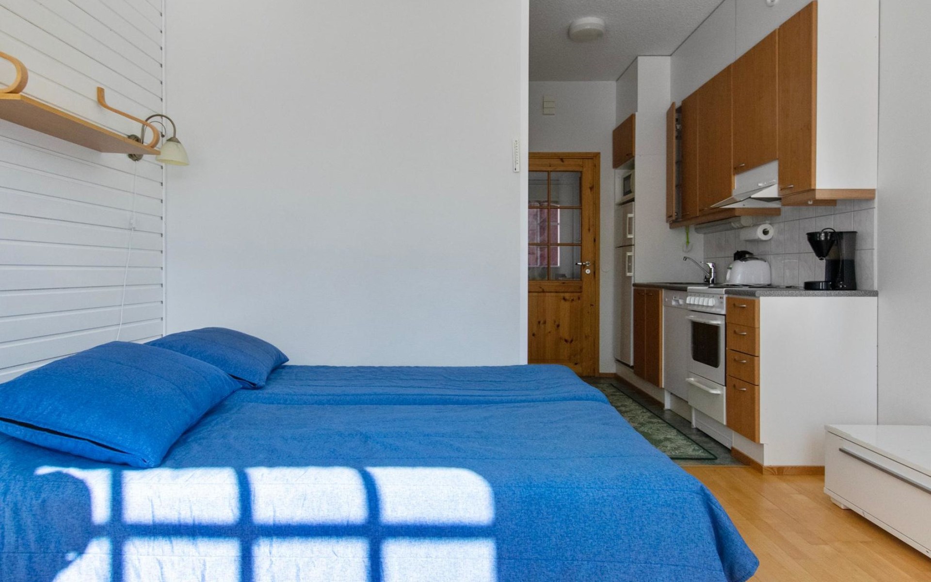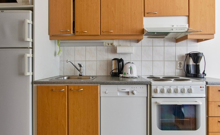 The apartment has its own corner for cooking. The living area combines a dining area and a sleeping area with two separate frame mattress beds for relaxing sleep.