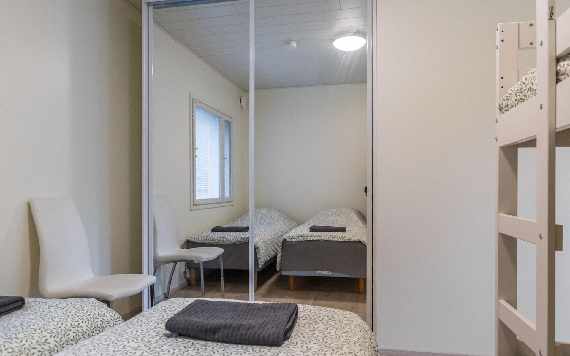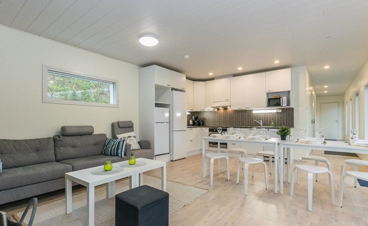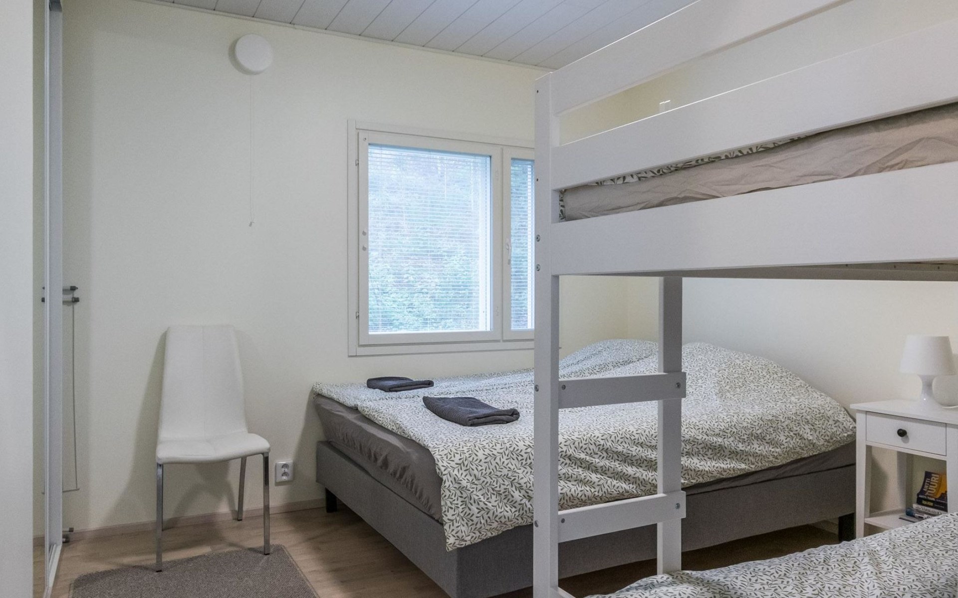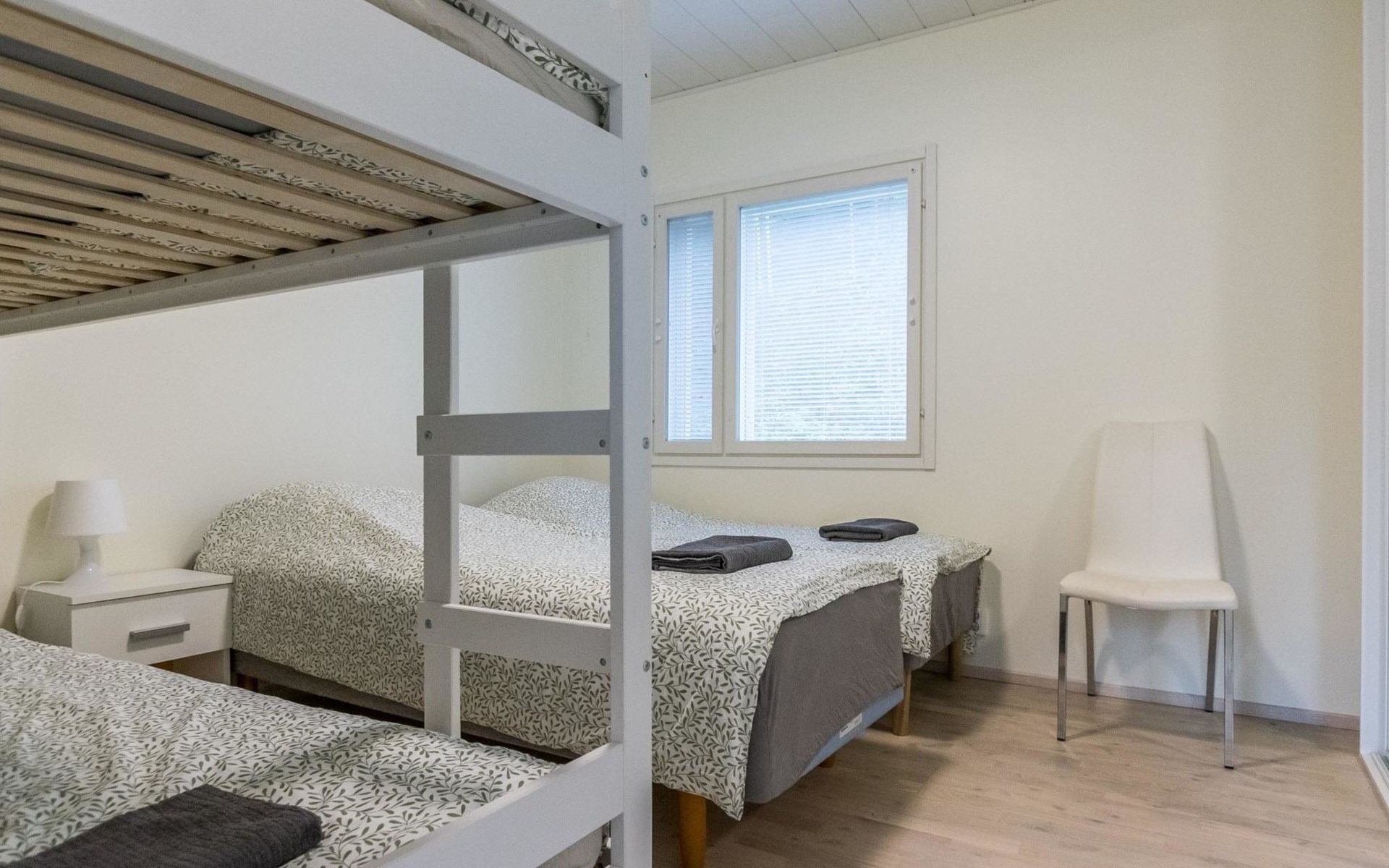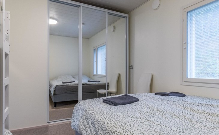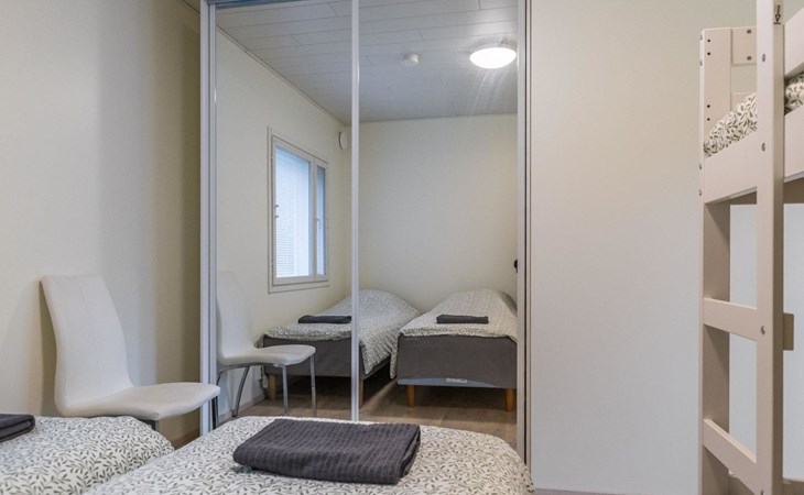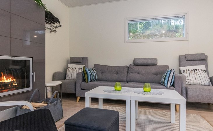 Wooden cabin (2019), living room/kitchen with a heat-storing fireplace. Two bedrooms: one with a double bed and a bunk bed (90x200 cm), the other with two beds and a bunk bed (90x200 cm), along with two thick 90x200 cm extra mattresses.