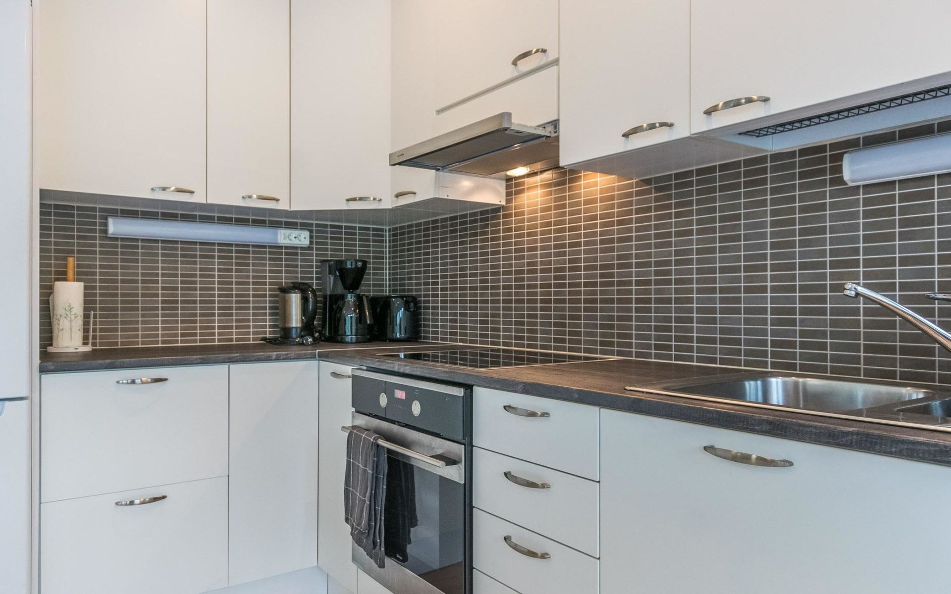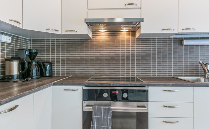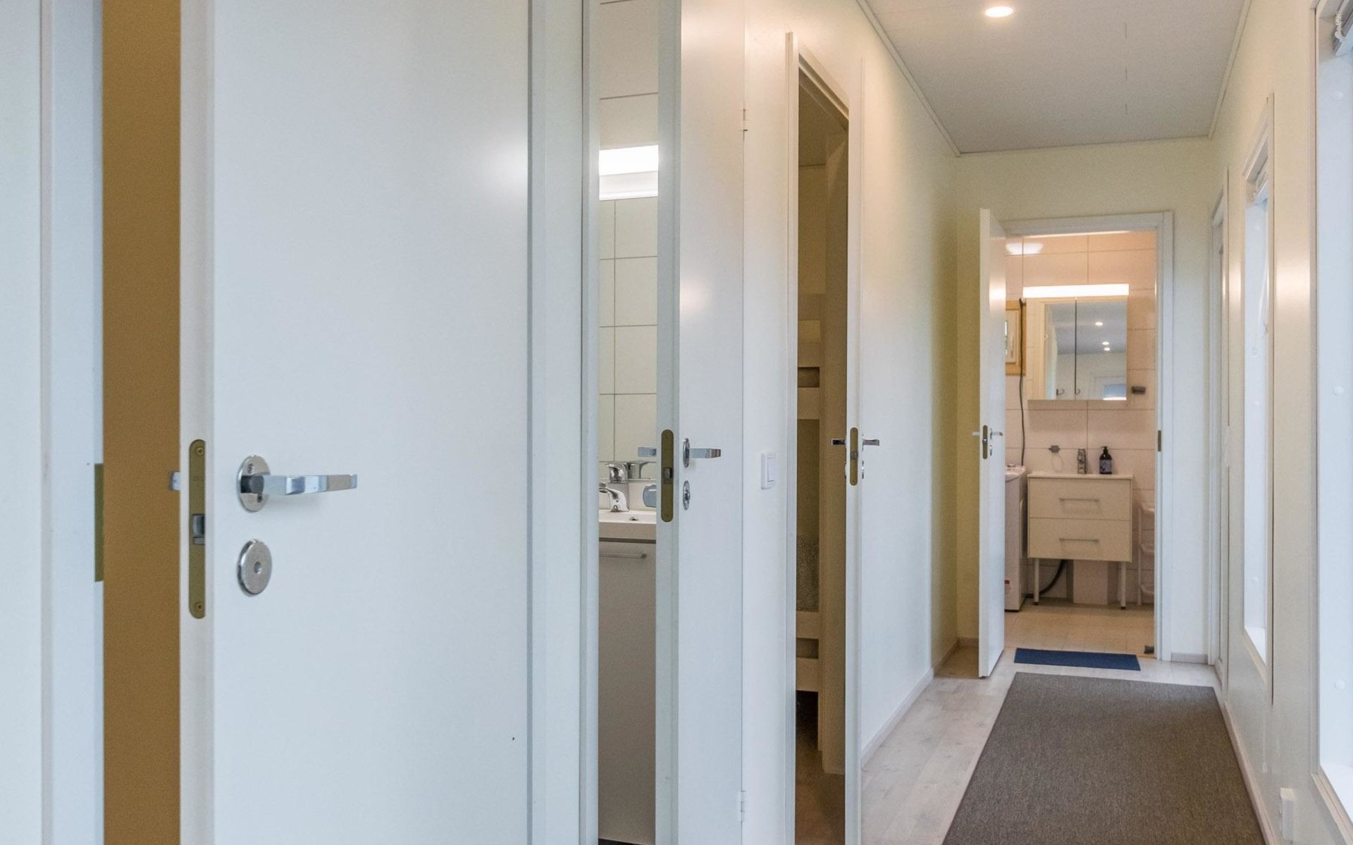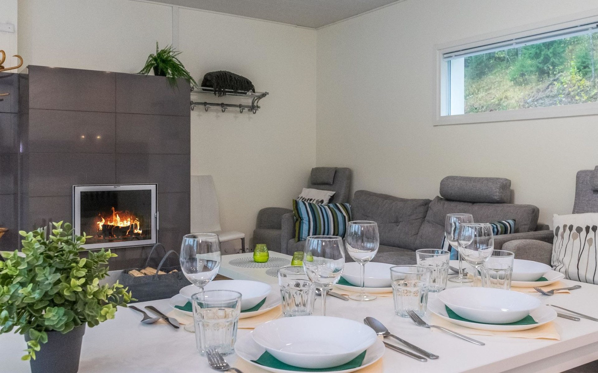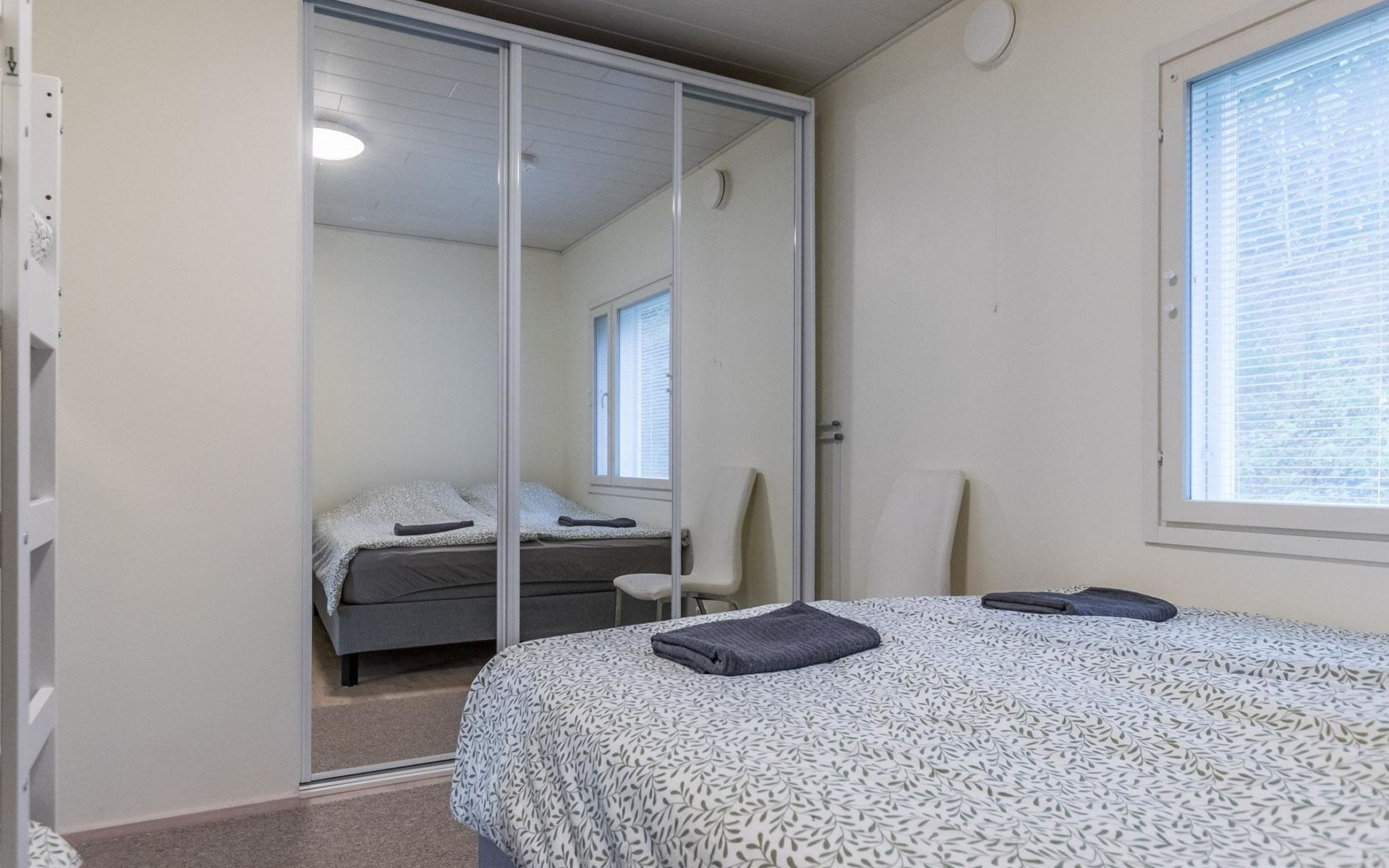 Wooden cabin (2019), living room/kitchen with a heat-storing fireplace. Two bedrooms: one with a double bed and a bunk bed (90x200 cm), the other with two beds and a bunk bed (90x200 cm), along with two thick 90x200 cm extra mattresses.