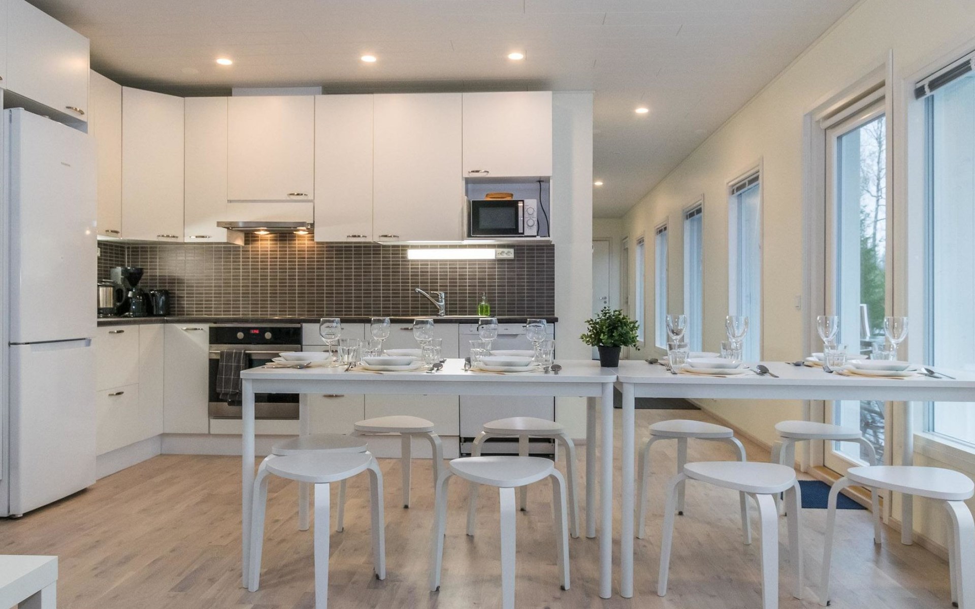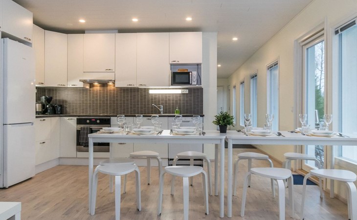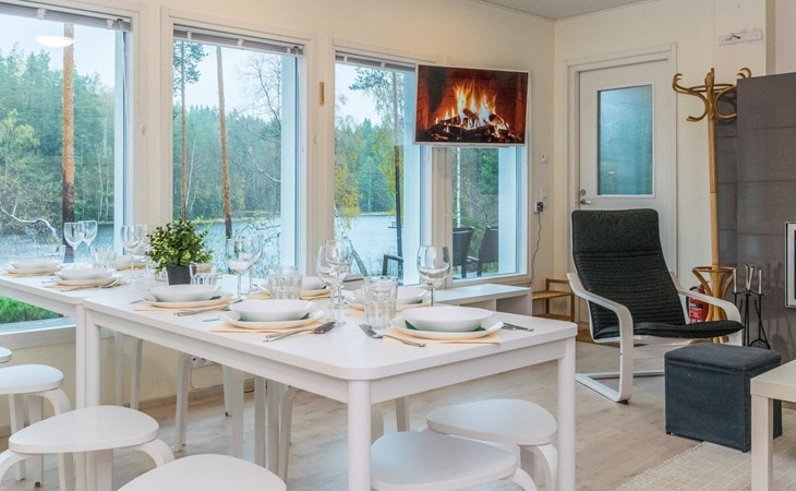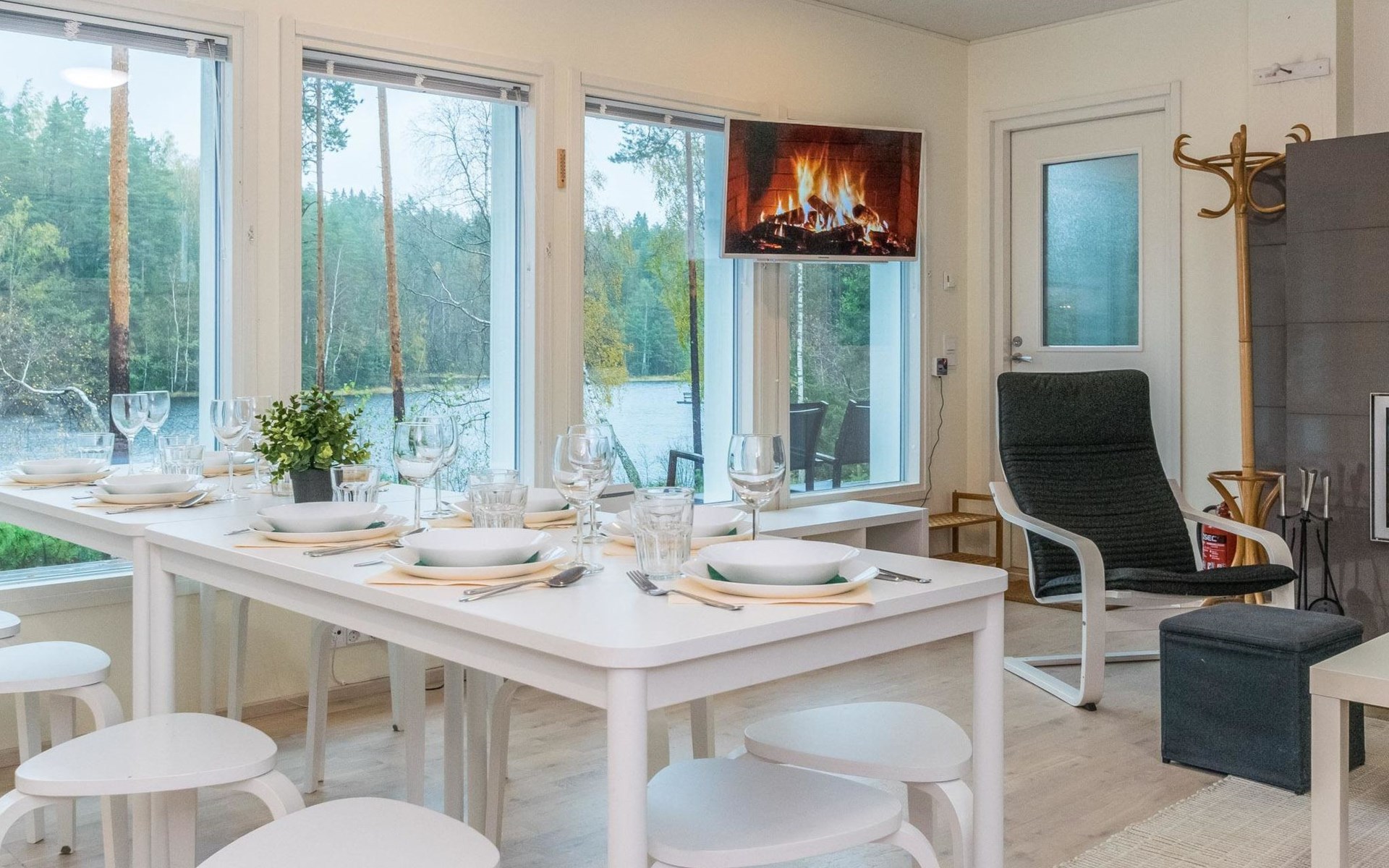 Inside the cabin, there's a generous dining area that comfortably seats the whole group for meals, providing an ideal setting for a holiday getaway.