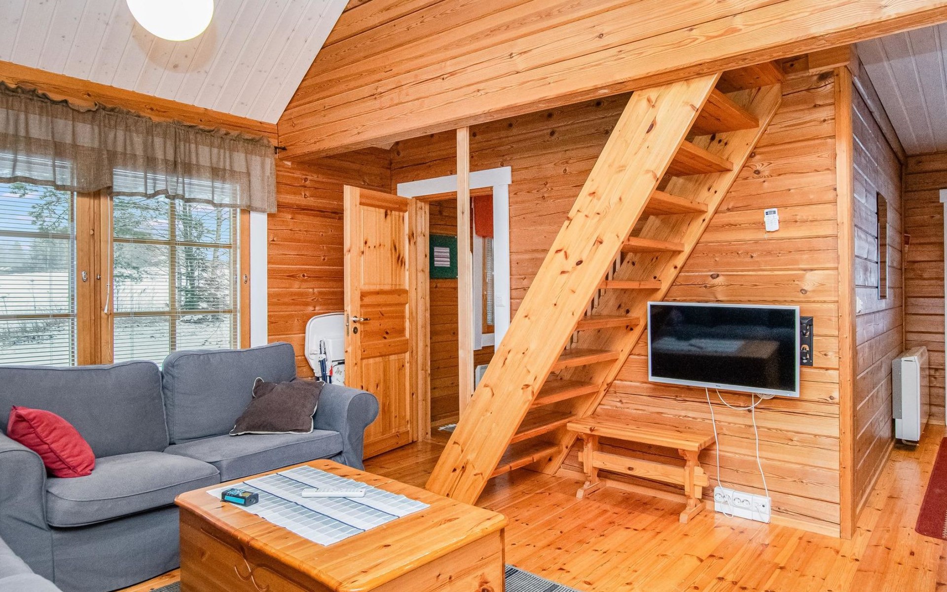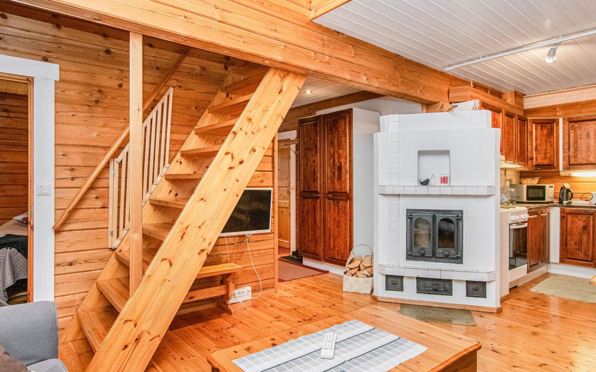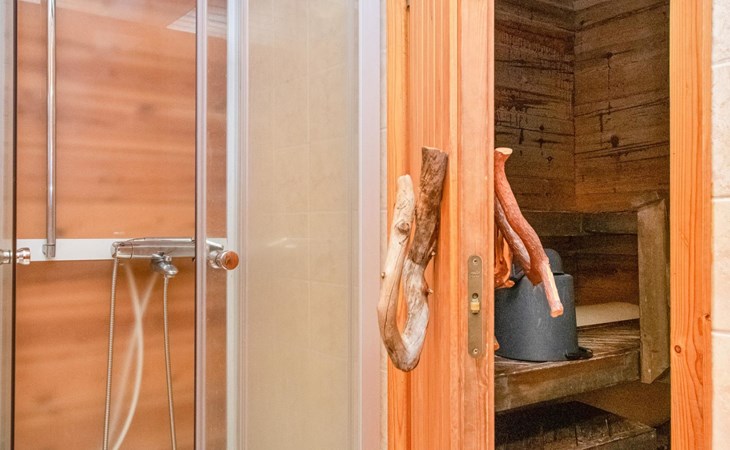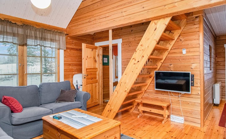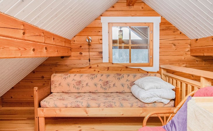 A log cabin, built in 2005, features a living room/kitchen. The bedroom has two beds joined together; the owner can separate them upon request. The loft has two box spring beds. The bathroom includes a WC and shower, and the sauna has an electric stove.