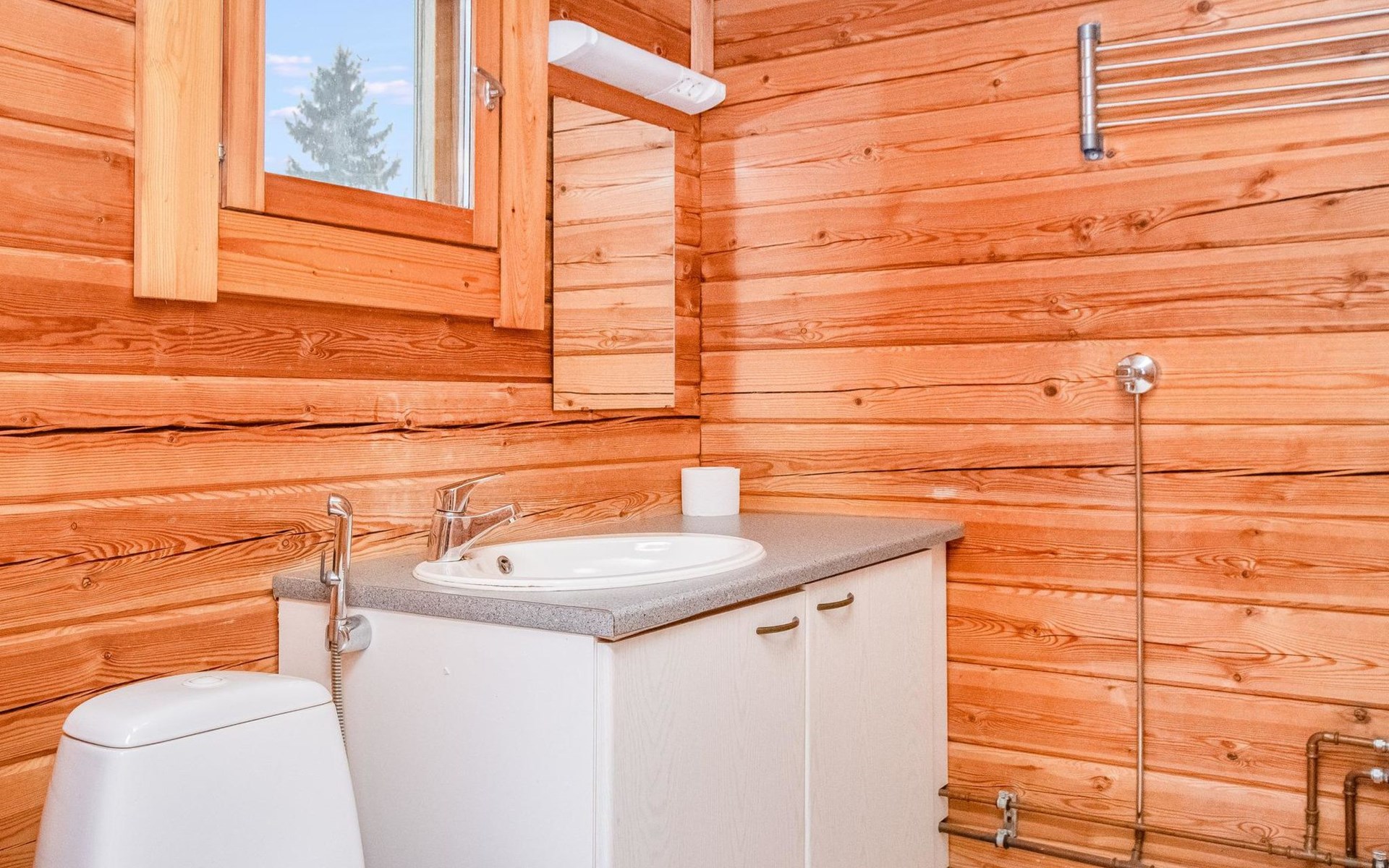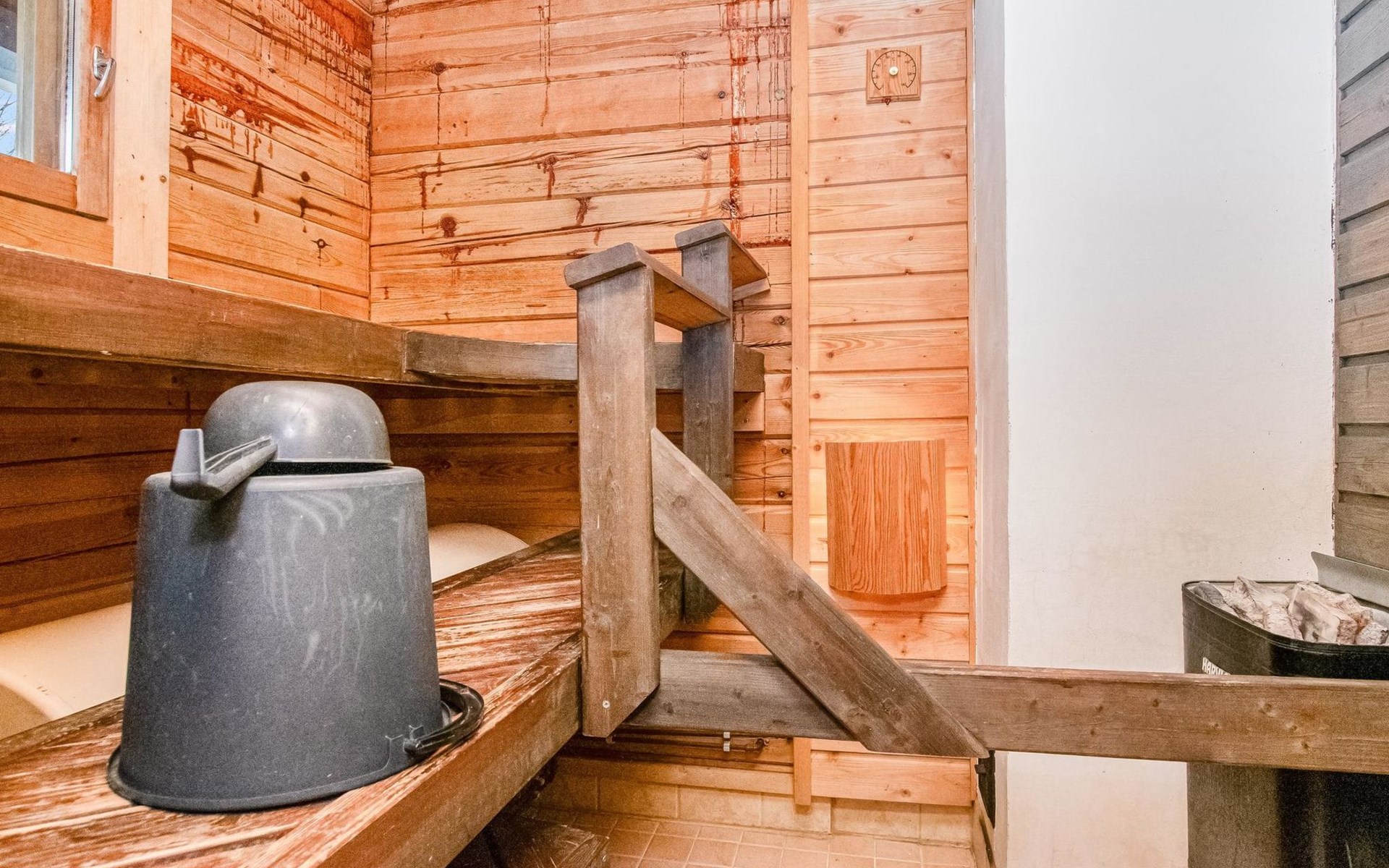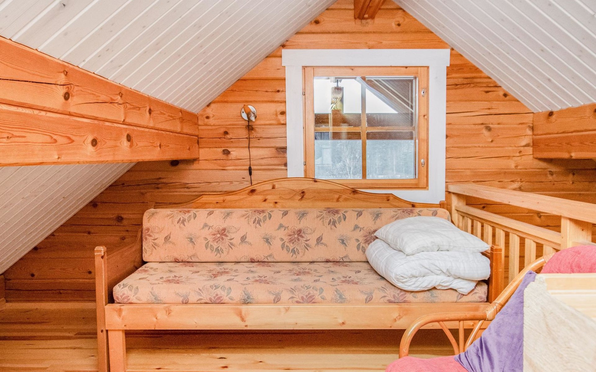 A log cabin, built in 2005, features a living room/kitchen. The bedroom has two beds joined together; the owner can separate them upon request. The loft has two box spring beds. The bathroom includes a WC and shower, and the sauna has an electric stove.