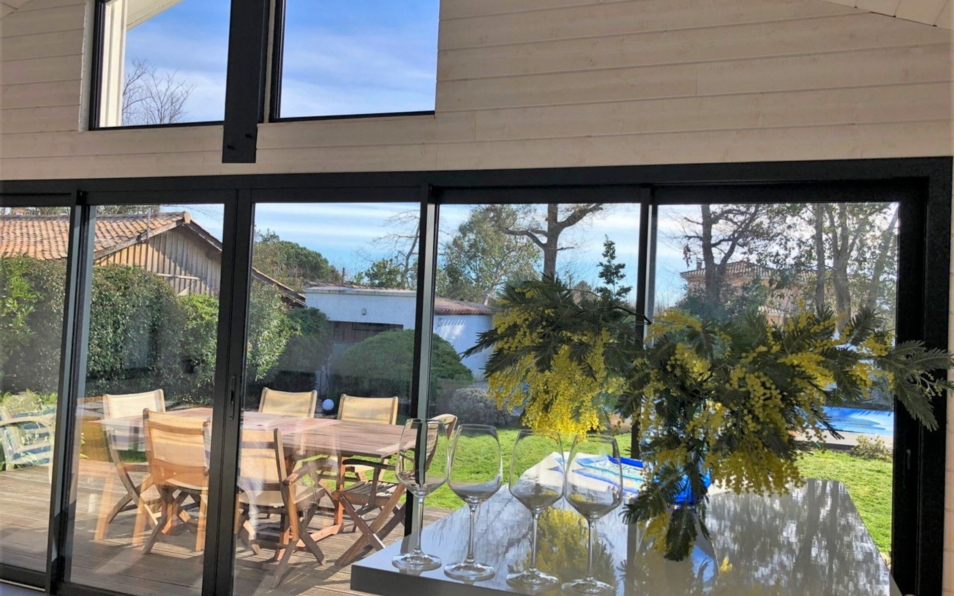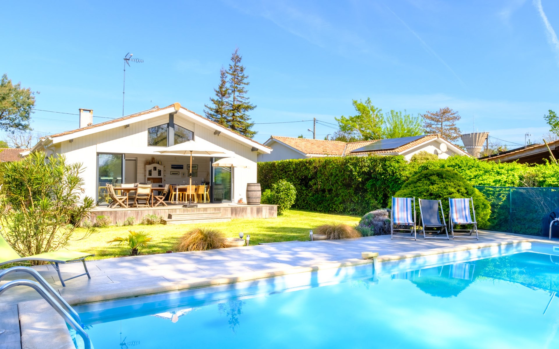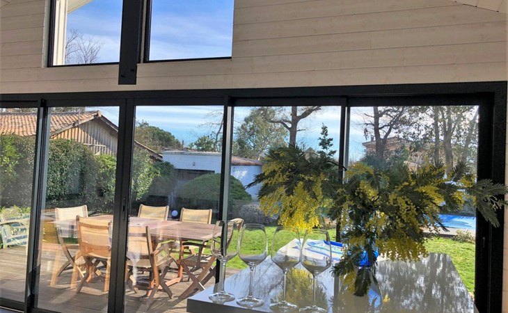 Beautiful villa "Cassy". Private: property 600 m2 (fenced), swimming pool angular, with privacy (9 x 4 m, depth 125 cm, seasonal availability: 01.May. - 30.Sep.) with alarm system. Terrace, parking (for 2 cars) at the house on the premises. Shop 600 m, supermarket 2 km, restaurant, bakery 600 m, bus stop "La Bergerie" 450 m, railway station "Biganos" 13 km, sandy beach "Plage Suzette (Bassin)" 1.3 km. Sports harbour 850 m, golf course (9 hole) 2.5 km. Nearby attractions: Plage Grand Crohot (Océan) 21 km, Cap Ferret / Arcachon 35 km, Lacanau 40 km, Aéroport Bordeaux Mérignac 40 km, Dune du Pilat 60 km. Well-known lakes can easily be reached: Lacanau Lac 35 km. Object suitable for 6 adults + 1 child.