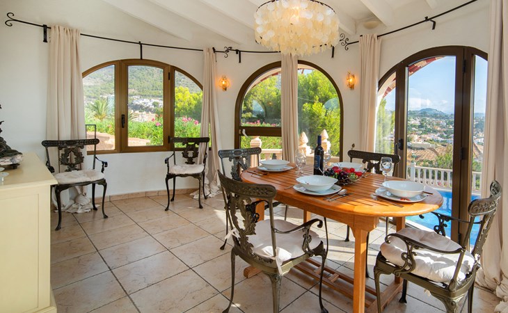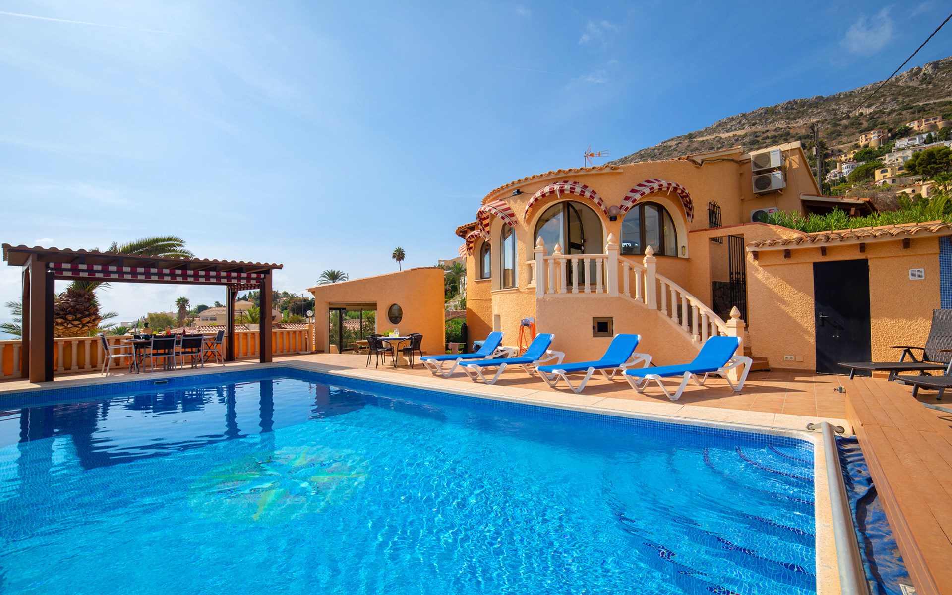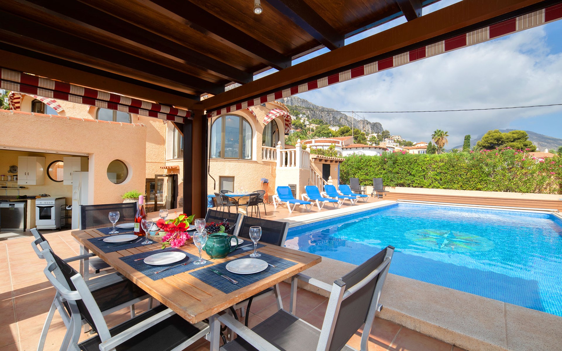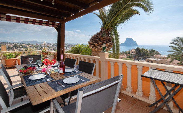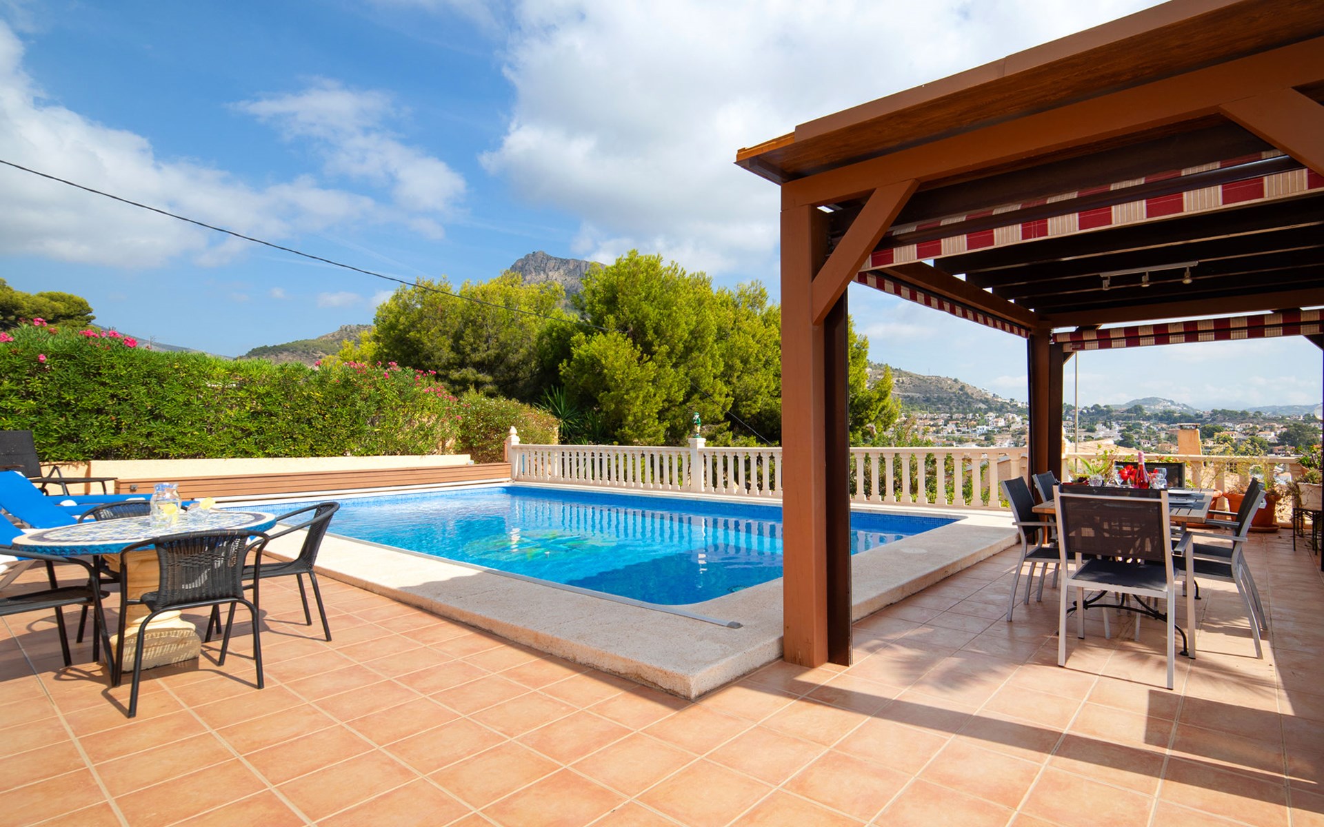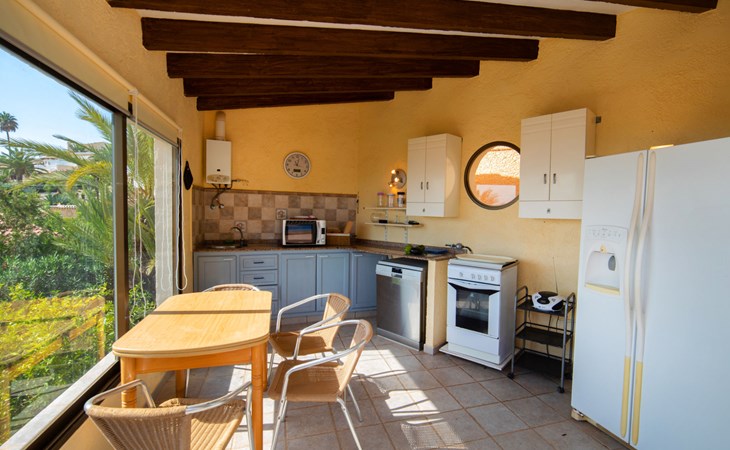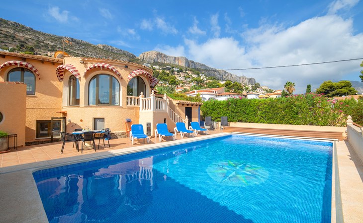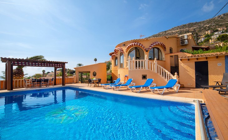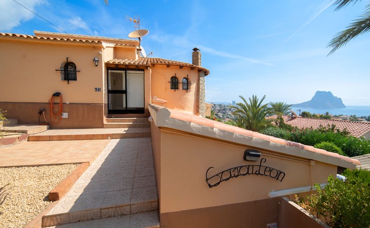 Maryvilla: Beautiful house "Leon", 2 storeys. 2 km from the centre of Calpe, in a sunny, elevated position residential area (villas), 400 m from the sea, 950 m from the beach. Private: property (fenced), swimming pool (10 x 5 m, seasonal availability: 01.Jan. - 31.Dec.). Outdoor shower, pool house with fridge and cooking stove, terrace, garden furniture, barbecue. Grocery 2 km, supermarket 2 km, restaurant, bar 50 m, bus stop "Parada Bus" 2.1 km, sandy beach "Playa Arenal" 3 km, rocky beach "Cala Les Urques" 400 m. Sports harbour 5 km, golf course (9 hole) 15 km. Nearby attractions: Aqualandia, Mundomar, Terra MÃtica, Terra Natura, Benidorm Palace (Benidorm), Les Fonts de l'Algar, Castillo de Guadalest. The owner does not accept any youth groups.