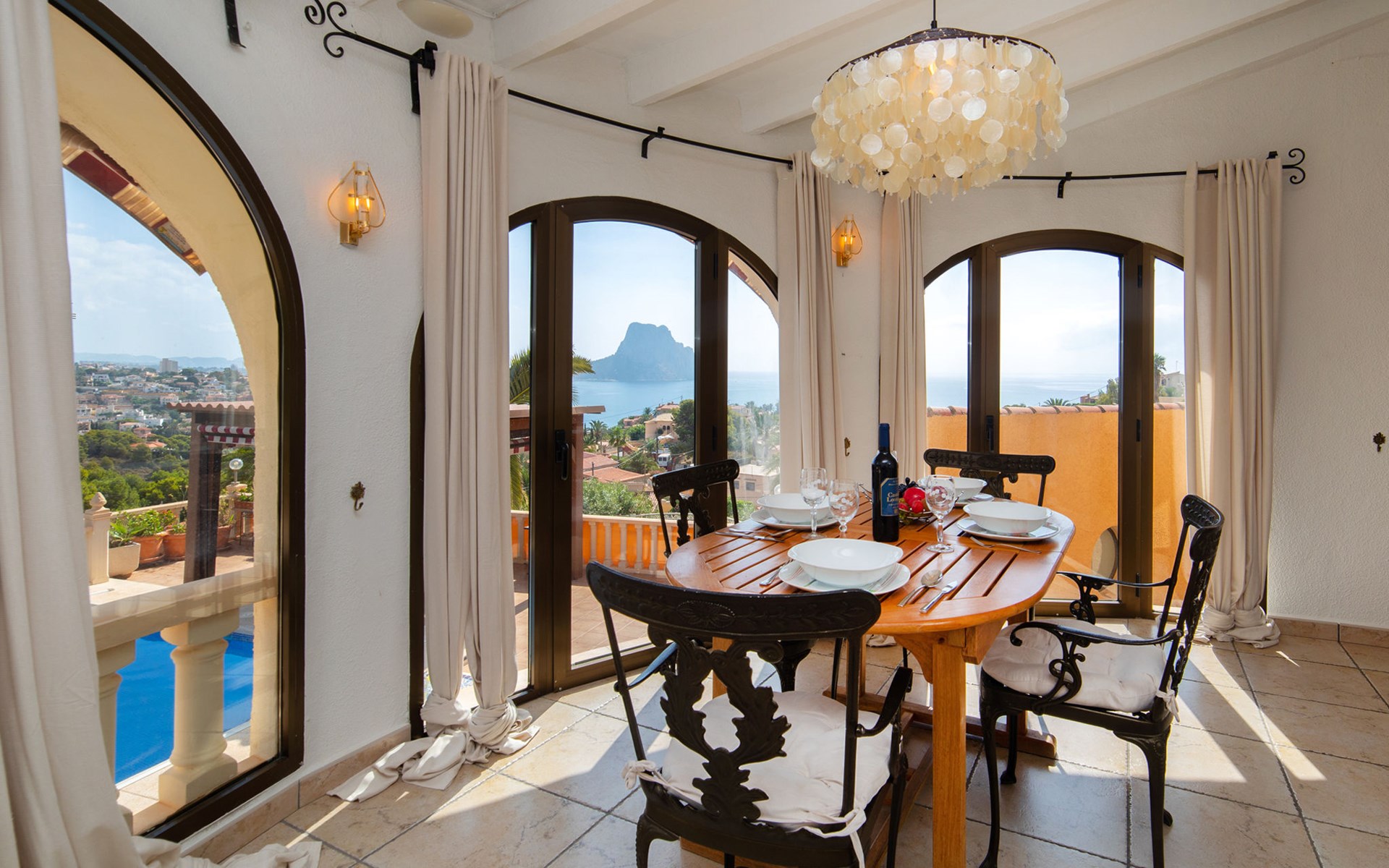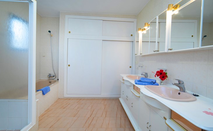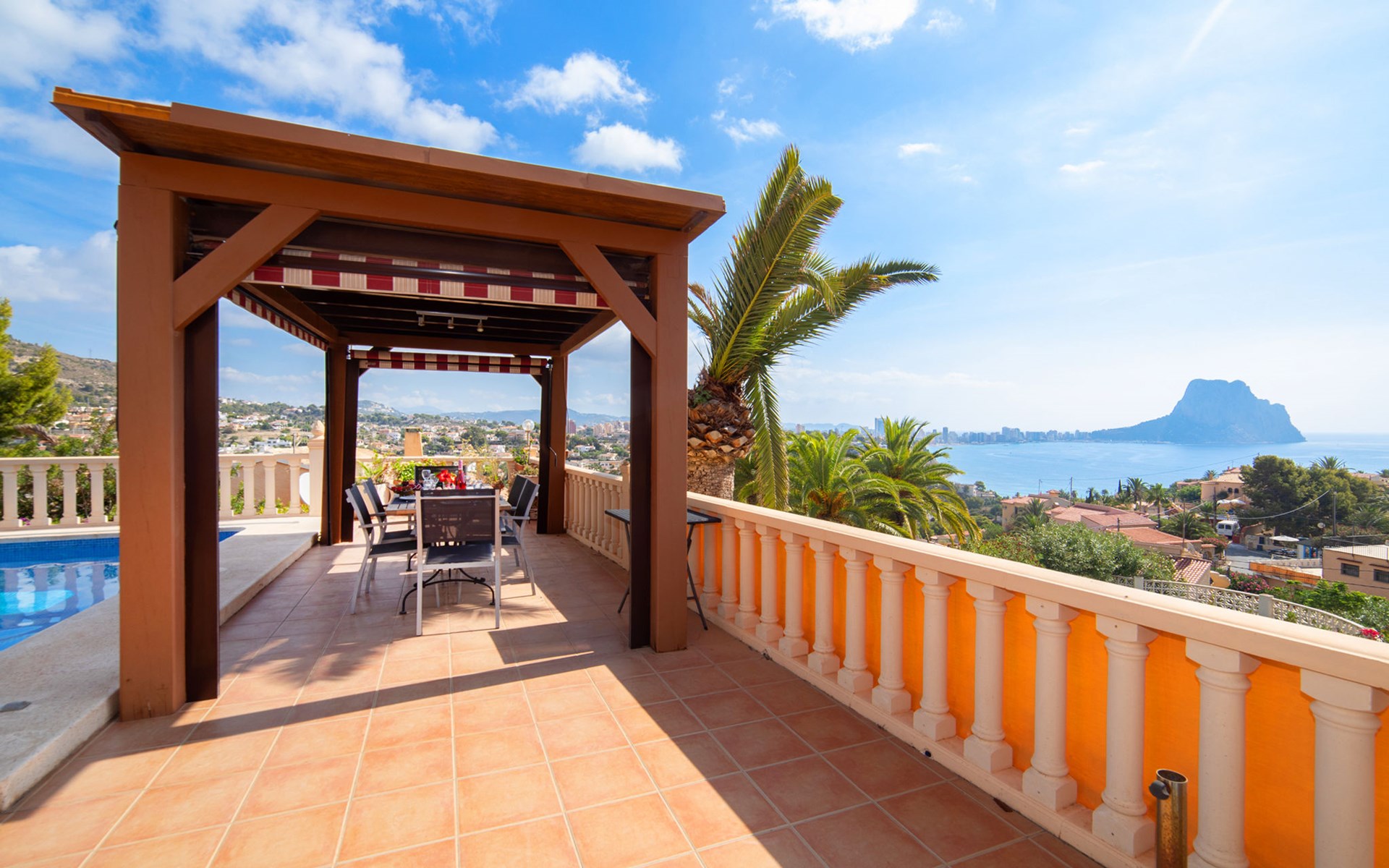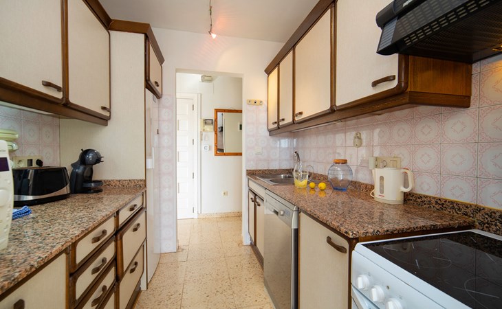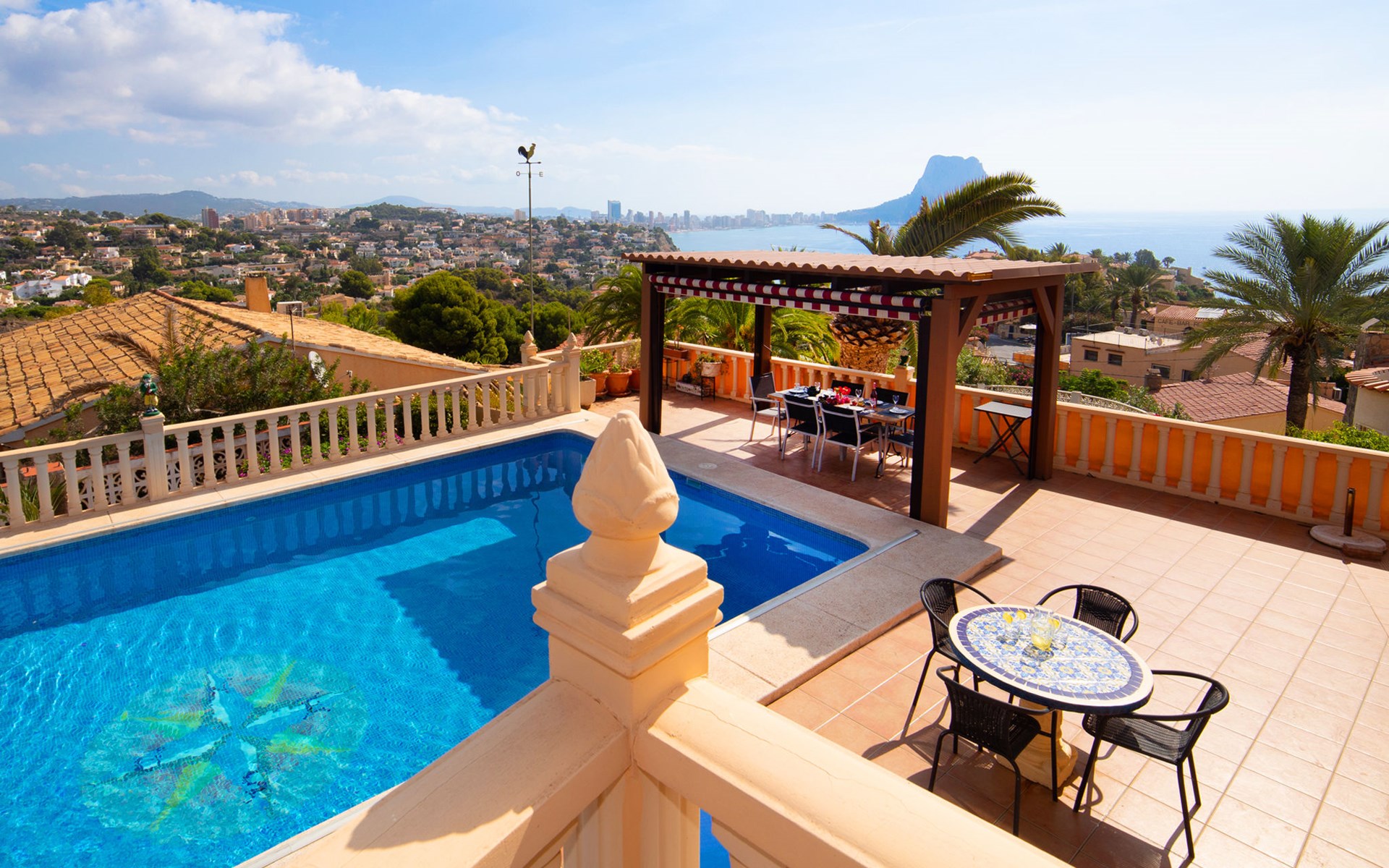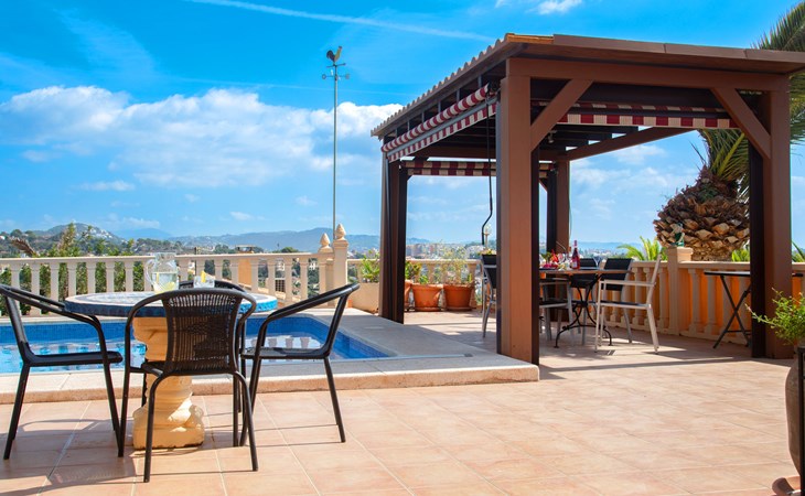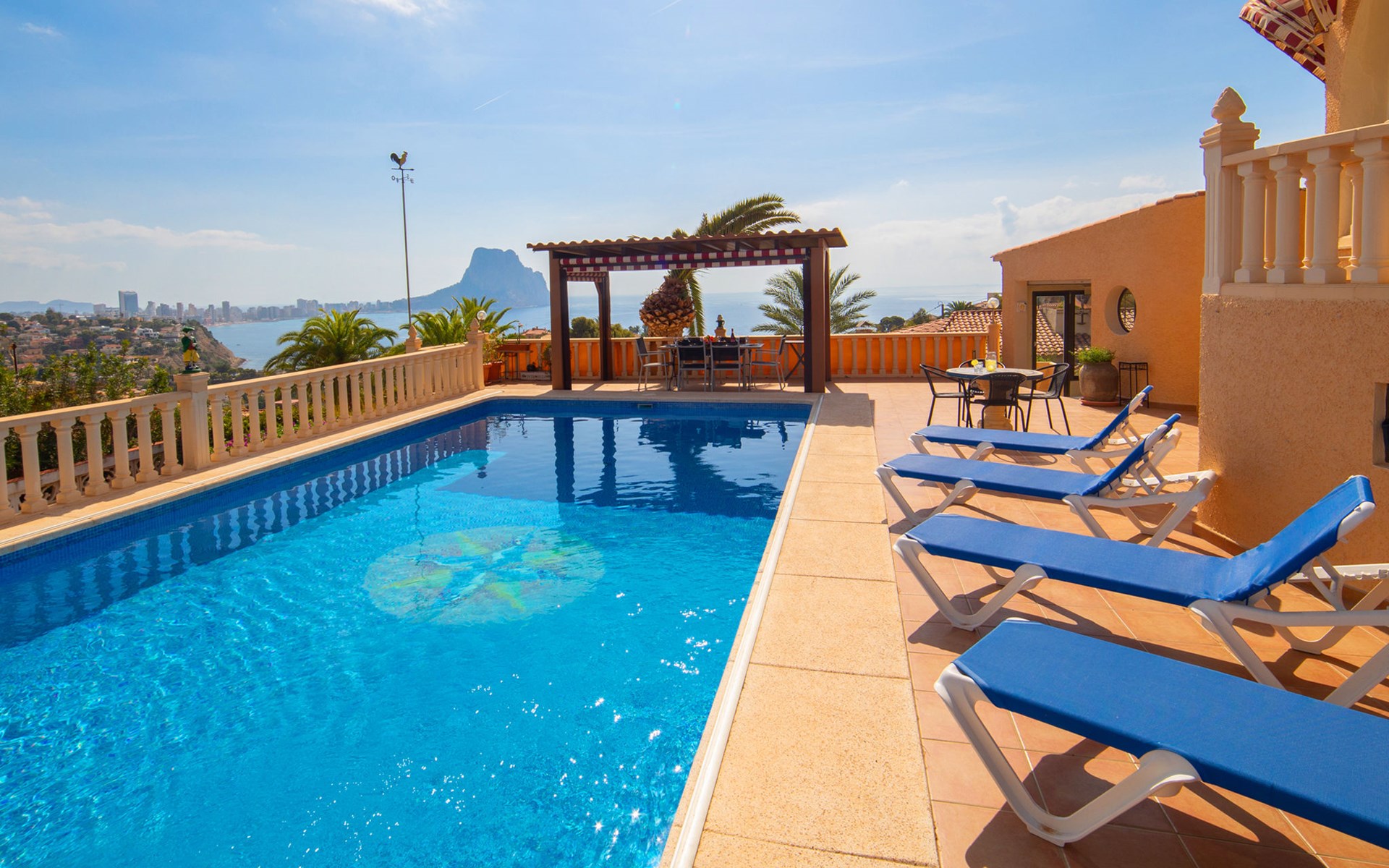 Maryvilla: Beautiful house "Leon", 2 storeys. 2 km from the centre of Calpe, in a sunny, elevated position residential area (villas), 400 m from the sea, 950 m from the beach. Private: property (fenced), swimming pool (10 x 5 m, seasonal availability: 01.Jan. - 31.Dec.). Outdoor shower, pool house with fridge and cooking stove, terrace, garden furniture, barbecue. Grocery 2 km, supermarket 2 km, restaurant, bar 50 m, bus stop "Parada Bus" 2.1 km, sandy beach "Playa Arenal" 3 km, rocky beach "Cala Les Urques" 400 m. Sports harbour 5 km, golf course (9 hole) 15 km. Nearby attractions: Aqualandia, Mundomar, Terra MÃtica, Terra Natura, Benidorm Palace (Benidorm), Les Fonts de l'Algar, Castillo de Guadalest. The owner does not accept any youth groups.