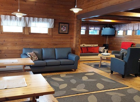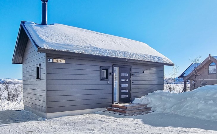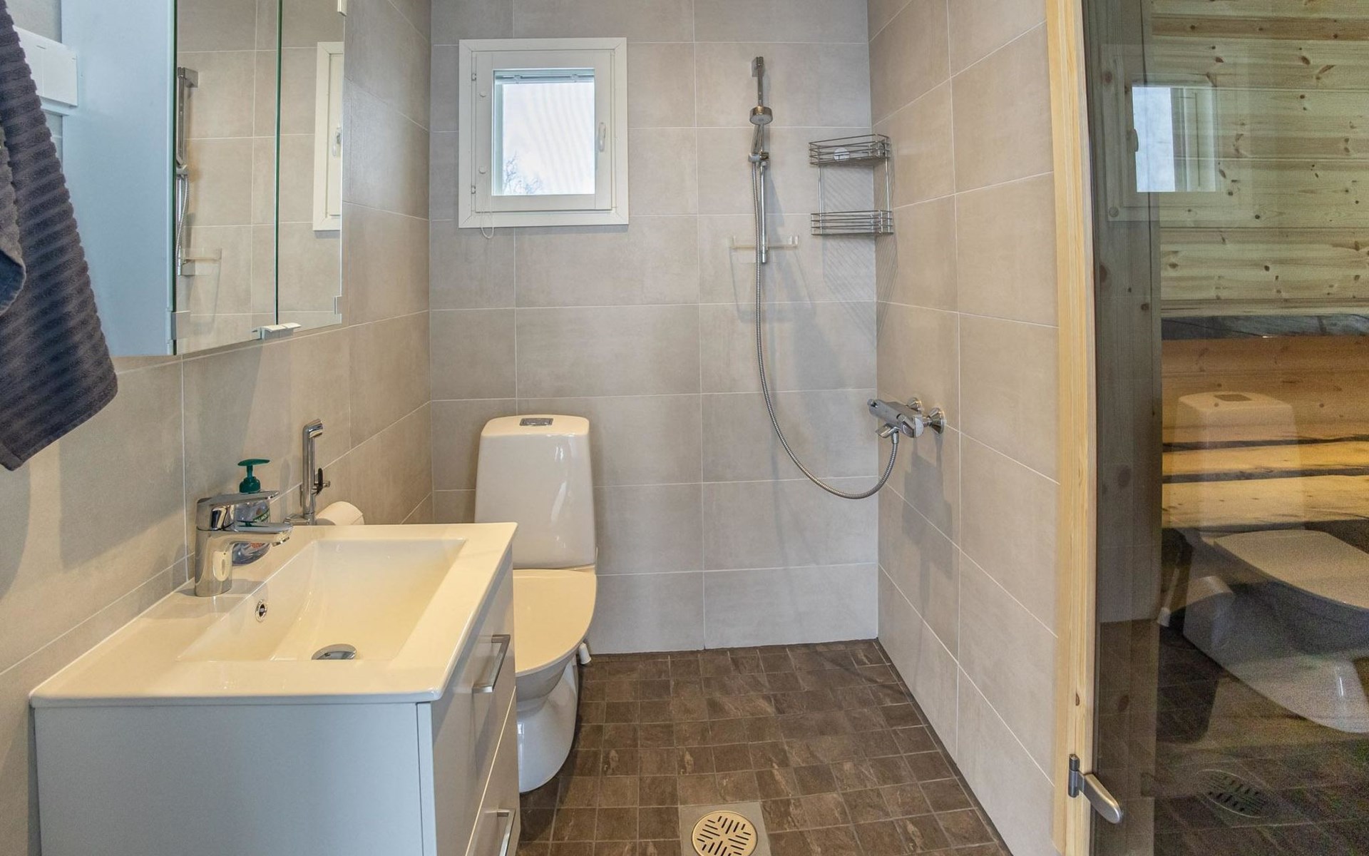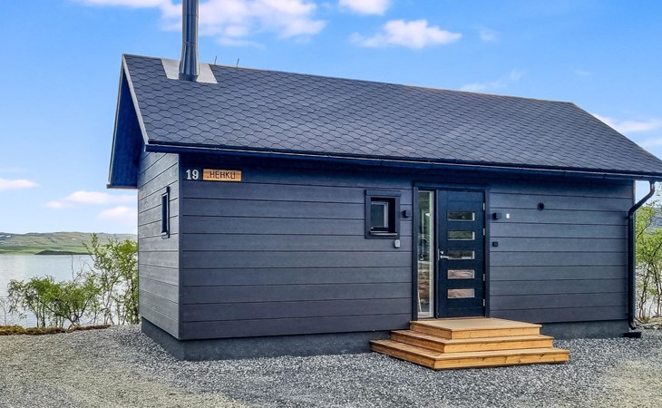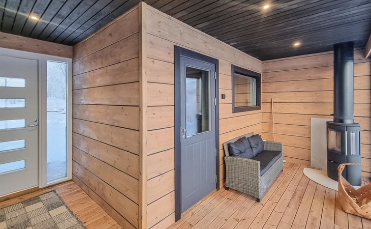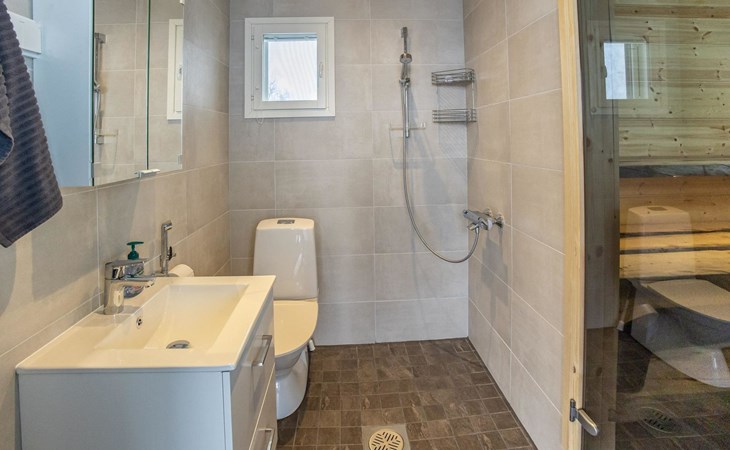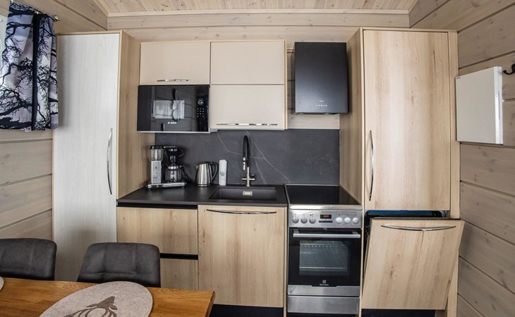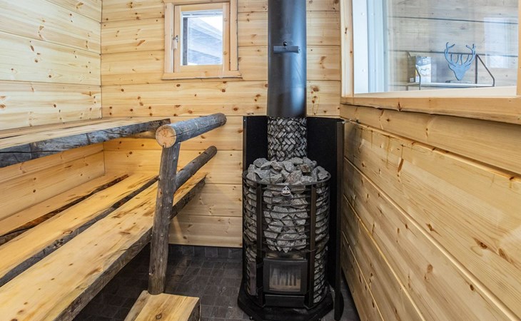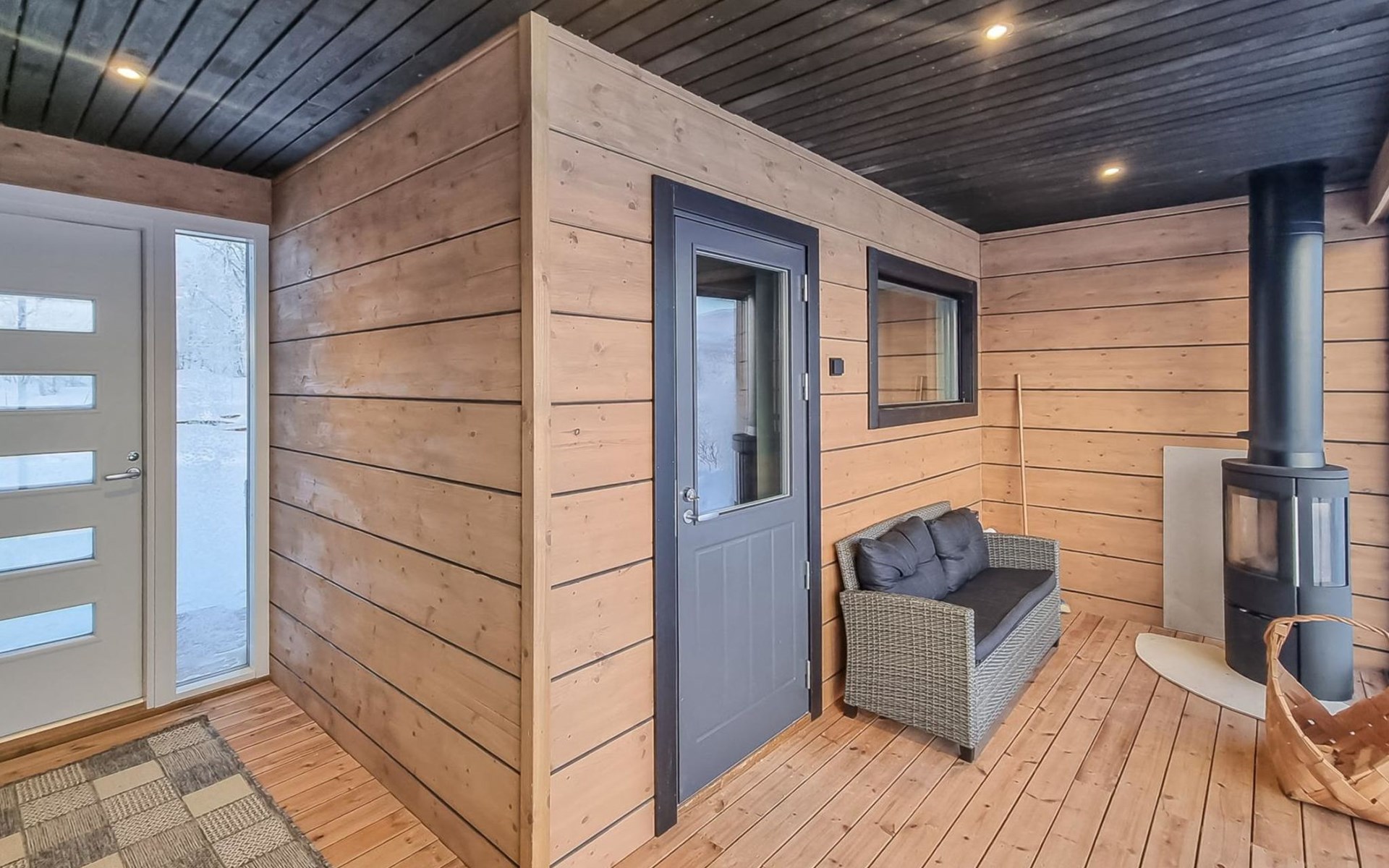 On one side, there is a comfortable living and sleeping area having convenient spreadable sofa bed that can be converted into two separate 80 cm wide beds. On the other side, you'll find the washroom with shower and a traditional wood-heated sauna. The sauna has a window offering stunning views of the lake and fells.