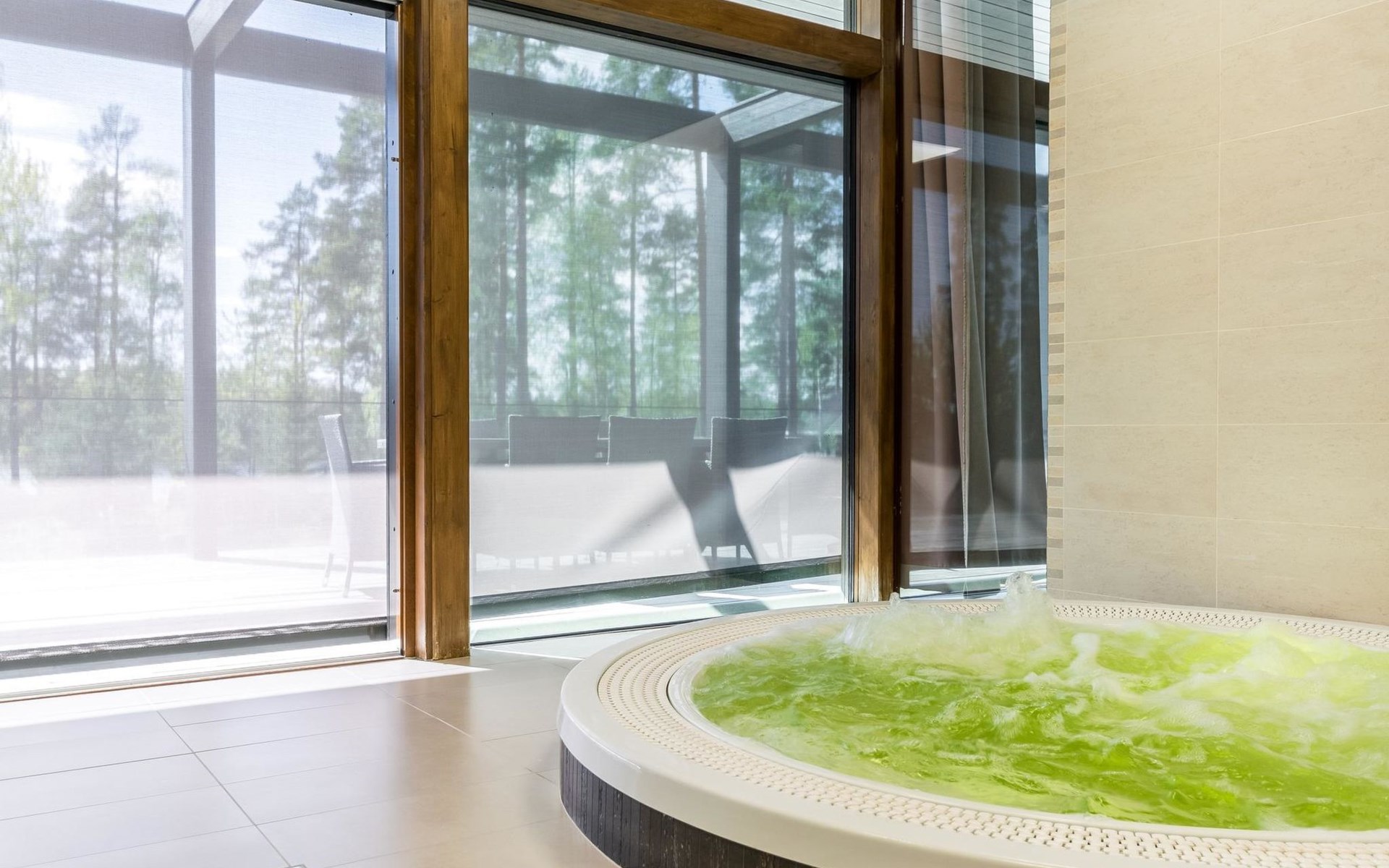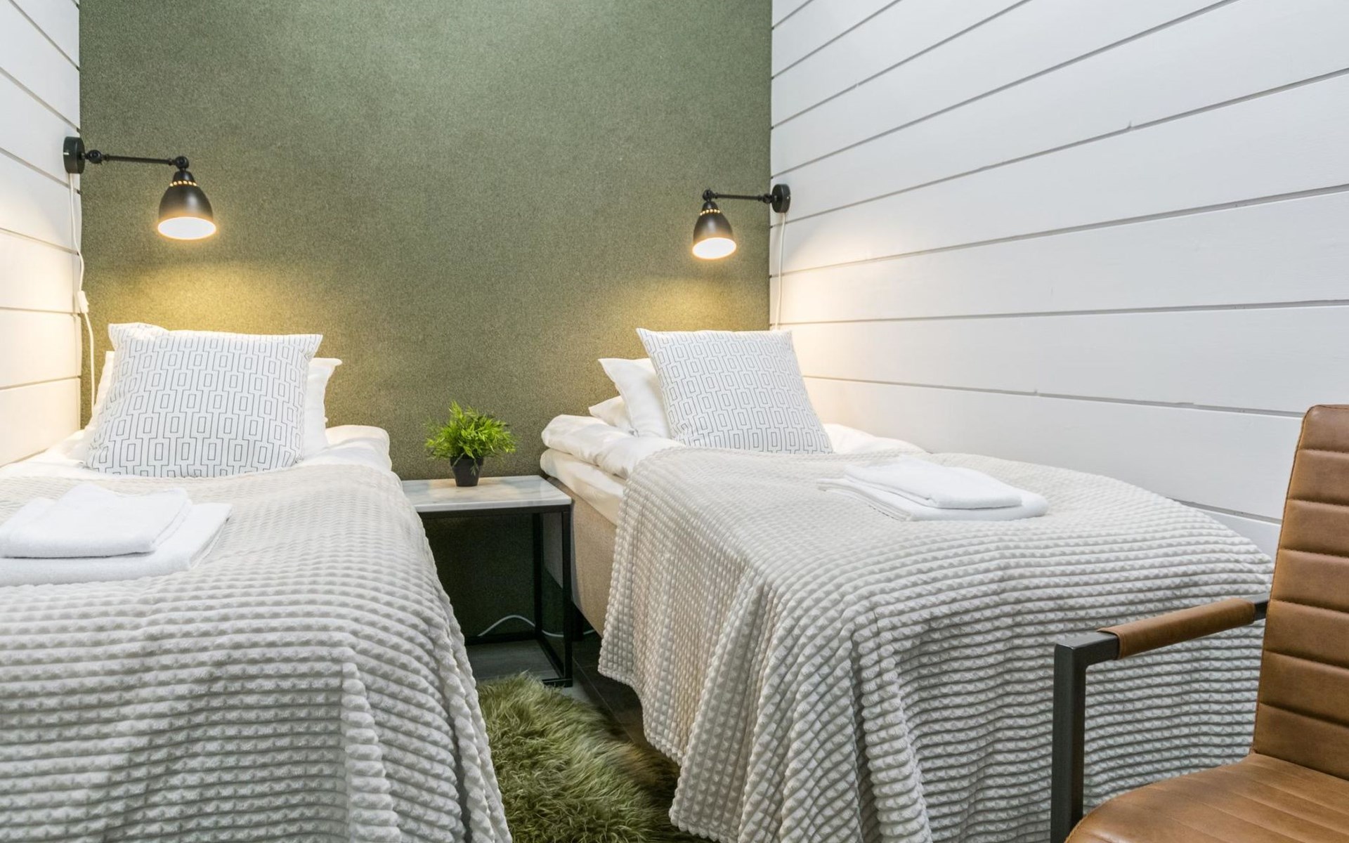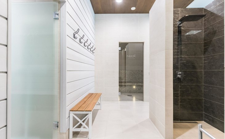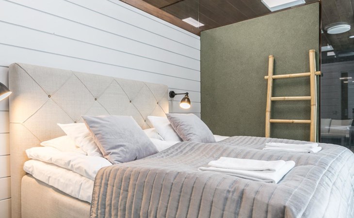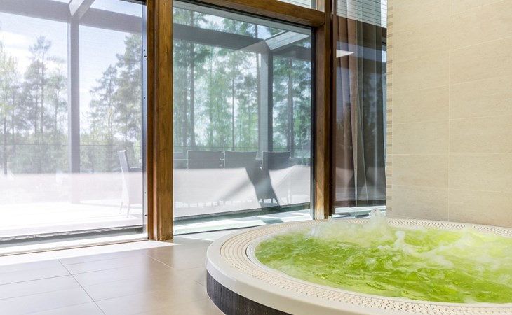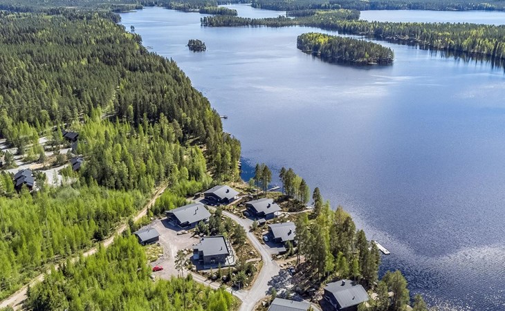 Stone-built spa villa (built in 2013), Lake Hankavesi 60 m, no own pier. Spacious living room and combined kitchen-dining area. Two bedrooms, one with a double bed and two spreadable sofas (each opened up to 80x200 cm extra beds). The other bedroom has two single beds. In the entrance hall, there's a sofa bed that opens up to a 160x190 cm bed for two. The villa has two WCs; one near the living areas and one connected to the spa compartment.