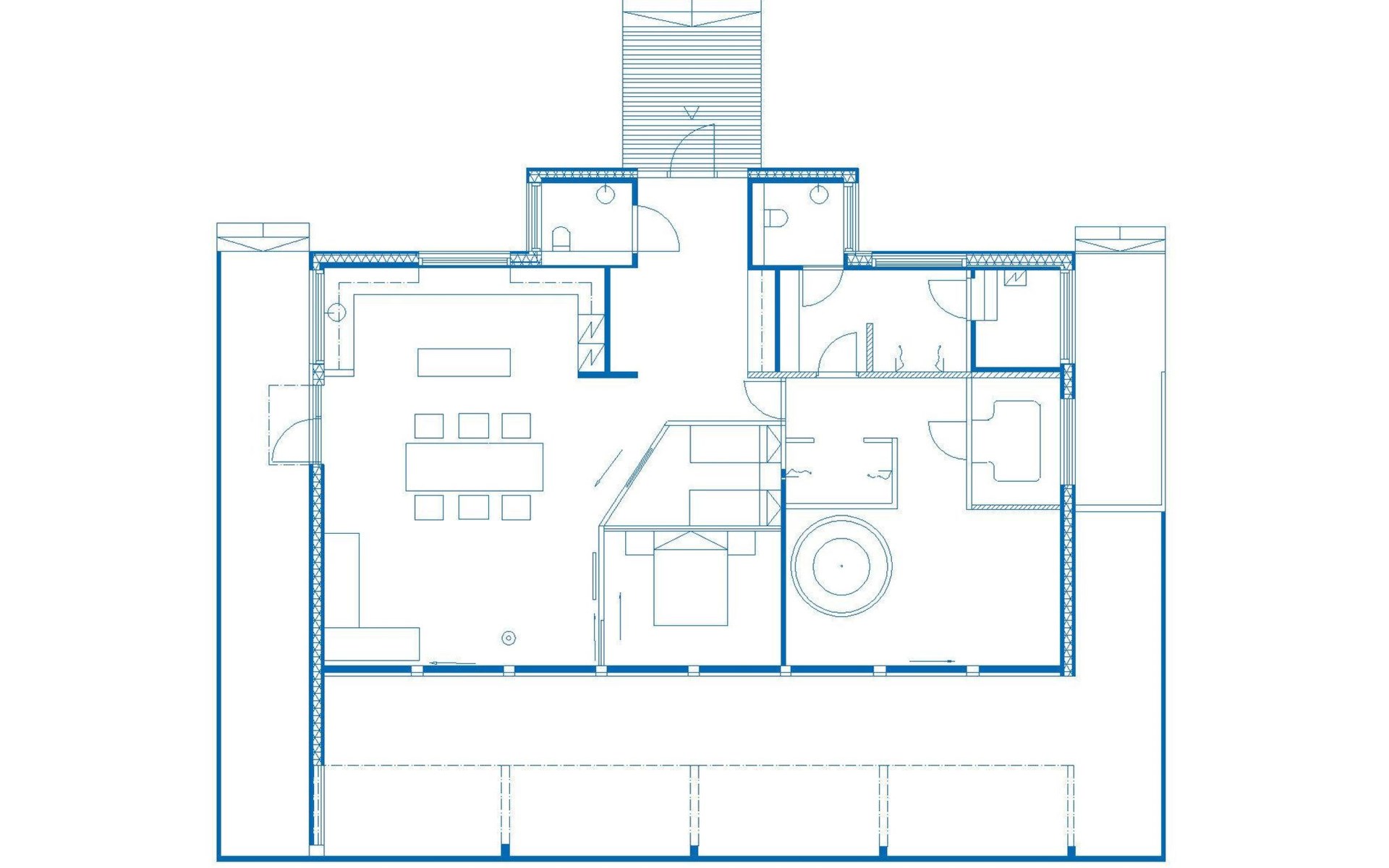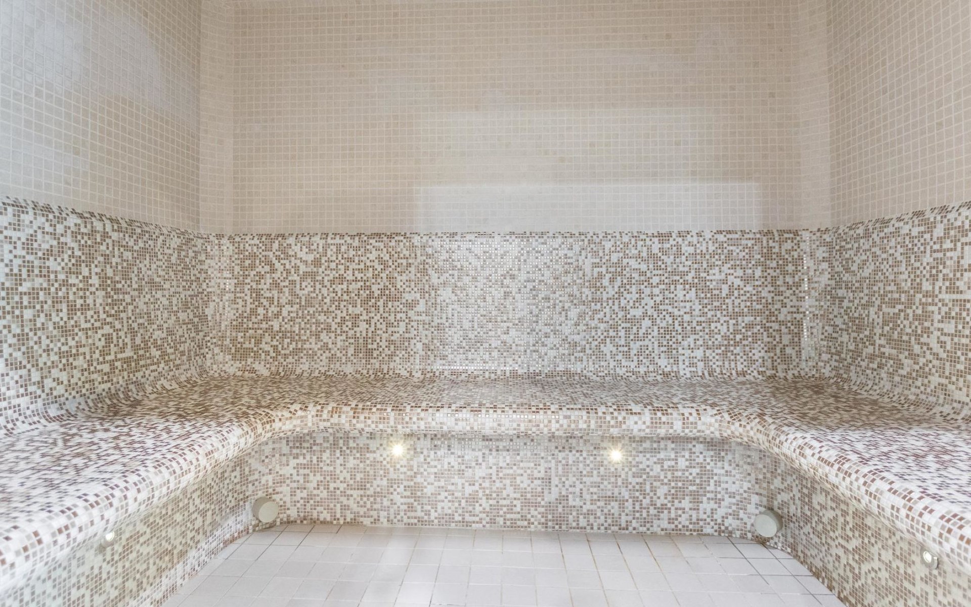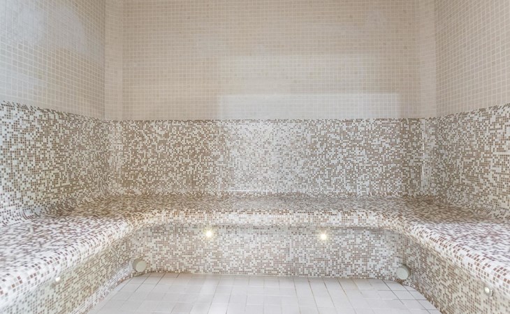 The spa compartment features four showers, a hydro-massage bathtub, a steam sauna, and an electric sauna. The hydro-massage bath opens up to a large covered terrace. The terrace has furniture and a gas grill.