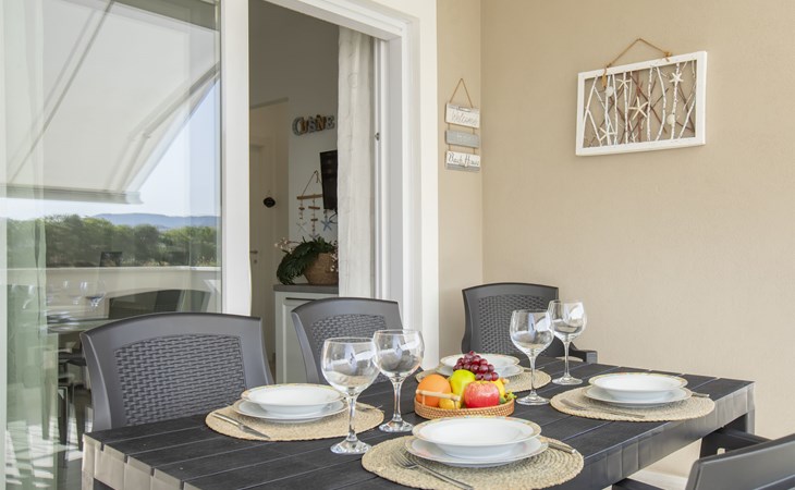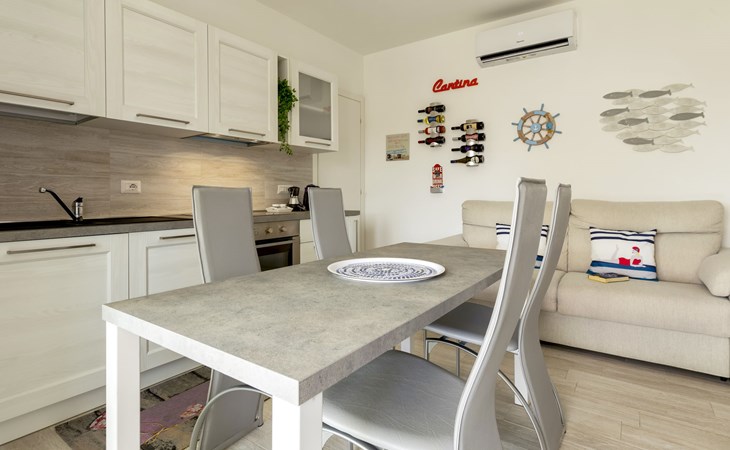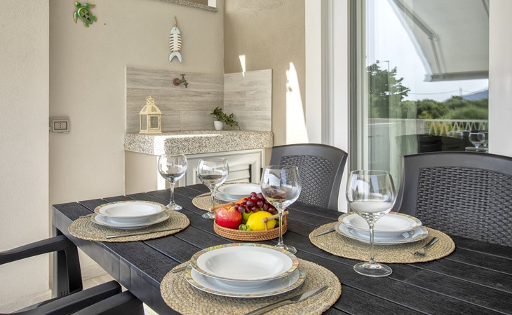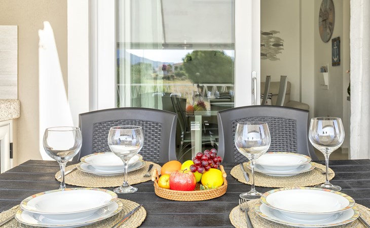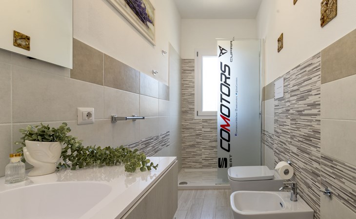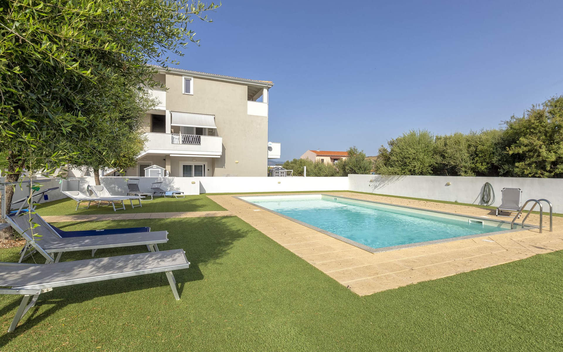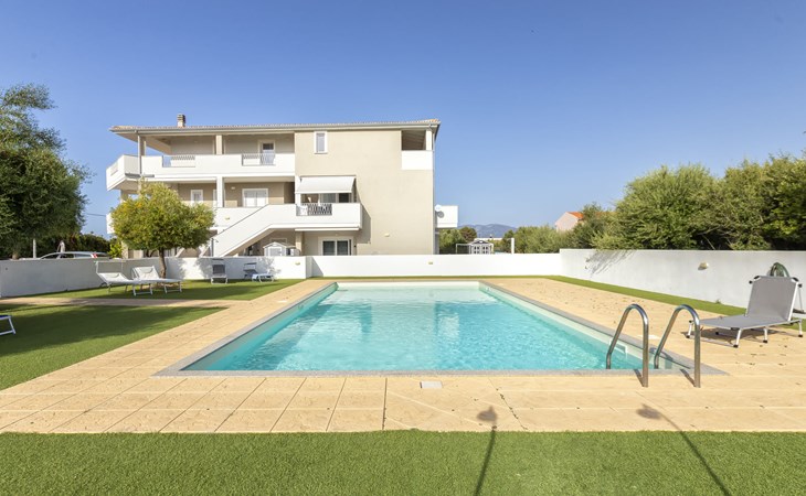 Modern, cosy apartment block "Residenza il Quarzo", 2 storeys, built in 2020. La Muddizza, 4 km from the centre of Valledoria, in a quiet, sunny position in the residential district, 2 km from the sea, 2 km from the beach. For shared use: swimming pool (6 x 12 m, depth 125 cm, seasonal availability: 01.Jun. - 30.Sep.). Outdoor shower. Stepped path (18 steps) to the house. Parking space n 6 at the house. Supermarket, shopping centre, restaurant 300 m, bus stop 4 km, sandy beach "Baia Verde" 2 km. Nearby attractions: Isola Rossa 20 km, Costa Paradiso 30 km, Stintino 78 km, Olbia 87 m, Porto Torres 48 km, Alghero. Please note: car recommended, no lift.