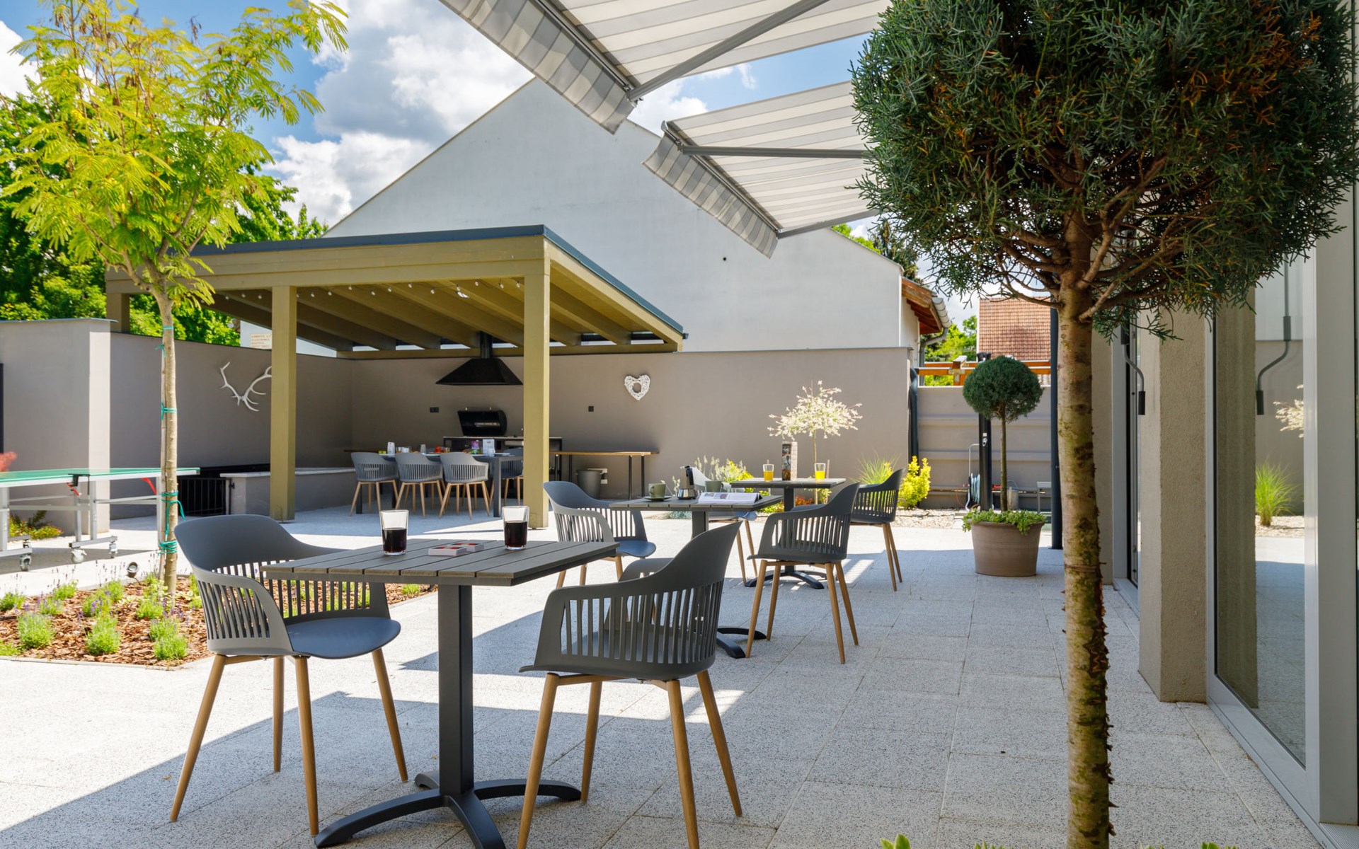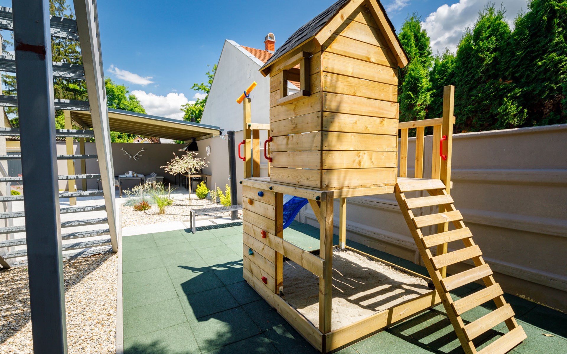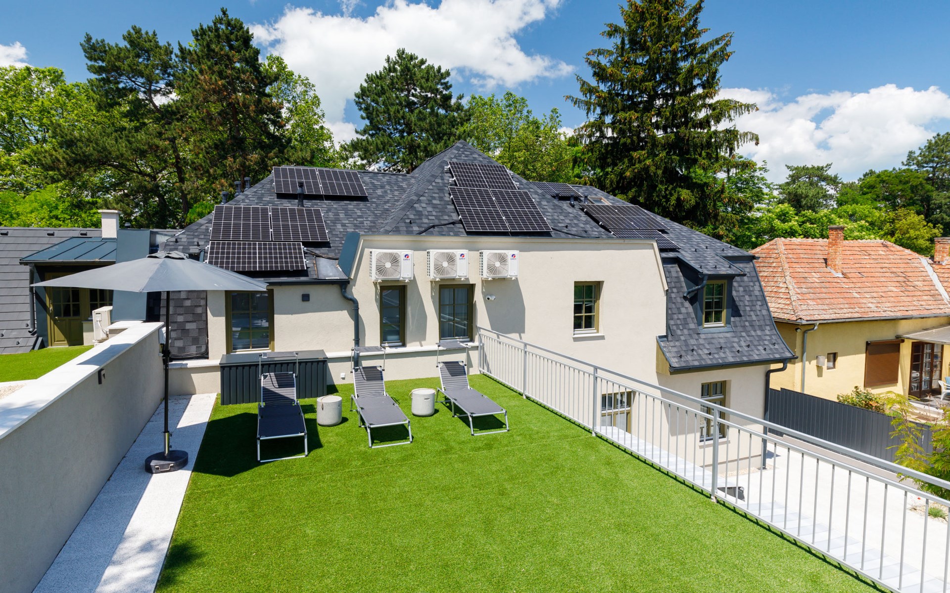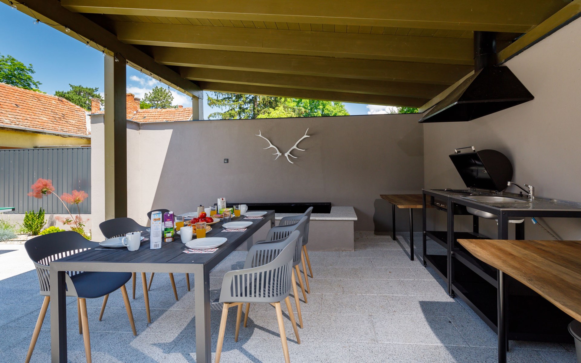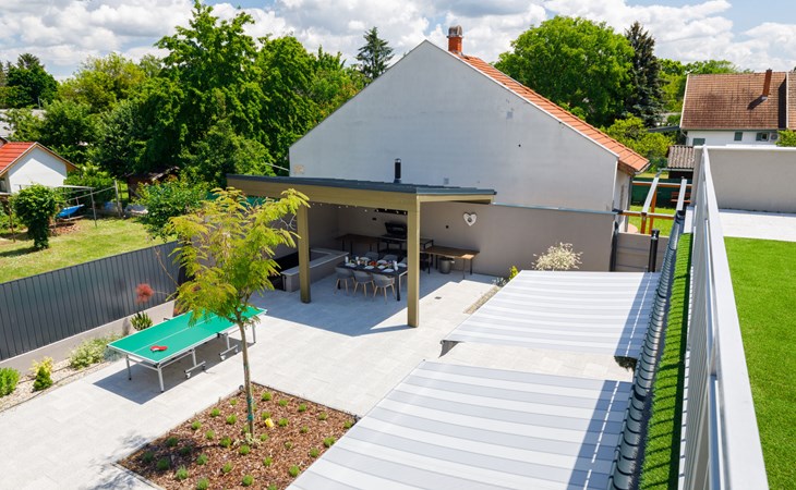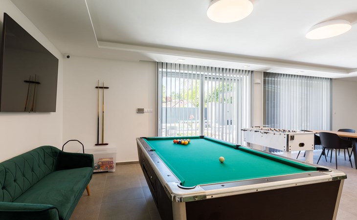 Balatonszárszó 5 km from Balatonföldvár: Large, modern, beautiful apartment house, built in 2023. 5 apartments in the residence. Excellent location: right in the centre but still quiet, 290 m from the lake, 350 m from the beach. Private: property (fenced). Outdoor shower, hot tub, table tennis, pergola, garden furniture, barbecue, children's playground (slide, sandbox). In the house: WiFi, table tennis, billiard table, table football, sun terrace, central heating system, air conditioning, washing machine, tumble dryer. Breakfast on request (extra). Parking at the house. Grocery 90 m, supermarket 7 km, restaurant, café 140 m, bicycle rental 150 m, bus stop 850 m, railway station 200 m, 200 m, thermal baths "Csiszta" 36 km. Surf school 4 km, sailing school 1 km, tennis 500 m, riding stable 9 km, children's playground 600 m. Nearby attractions: Siófok Bella Zoo 24 km, Tihany 12 km, Siófok Theme Pak 24 km, Festetics Castle 57 km, Hévíz 61 m.
