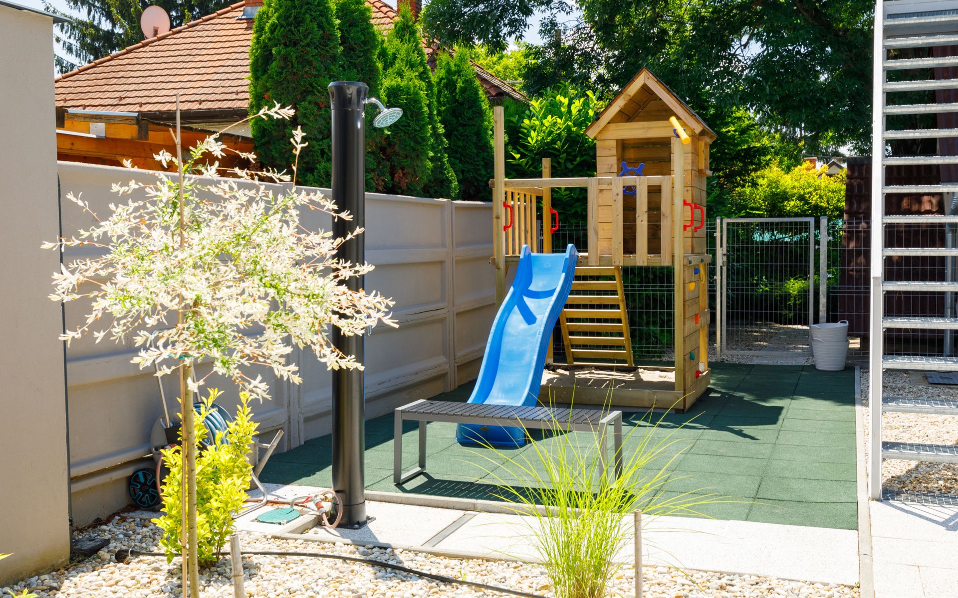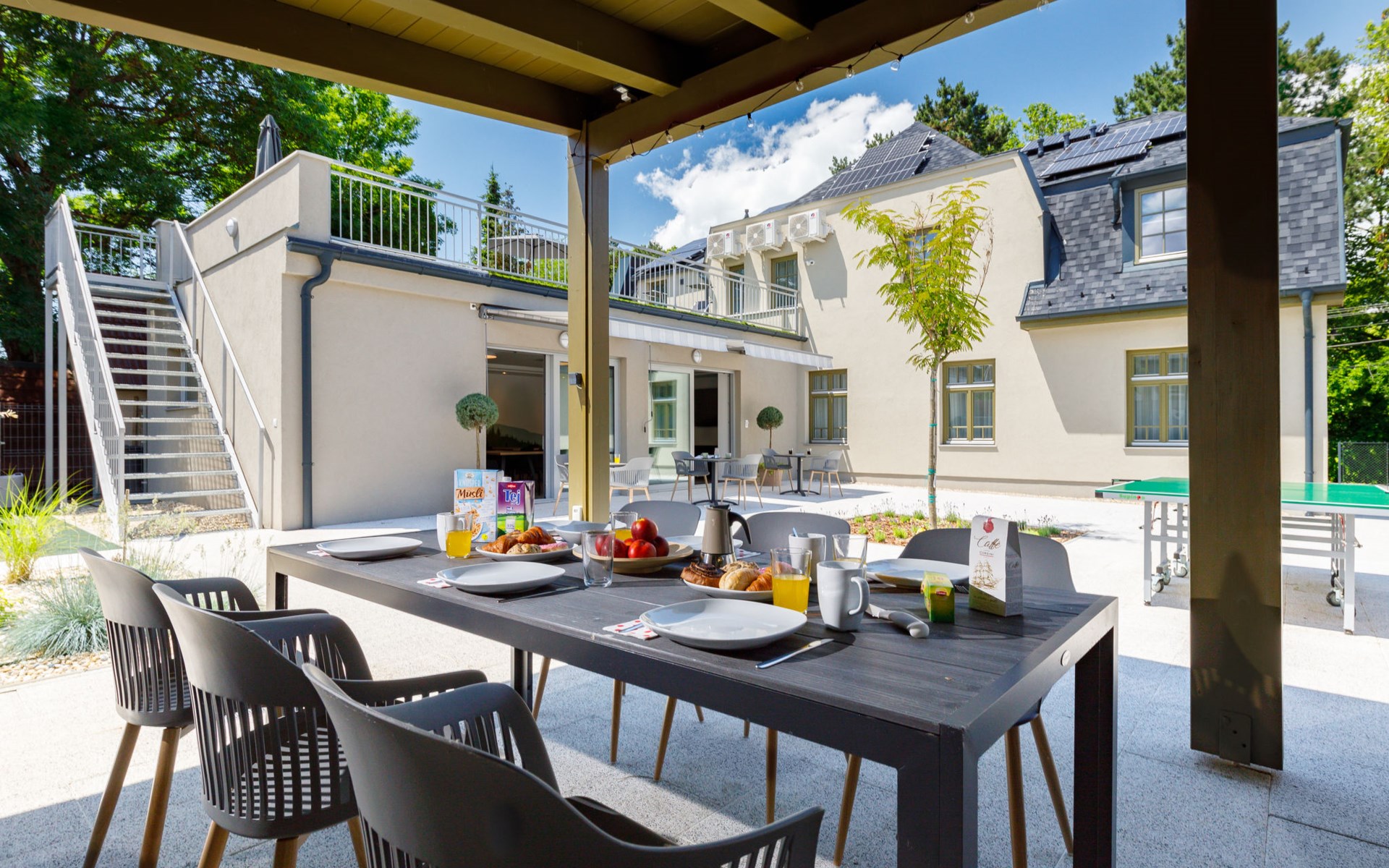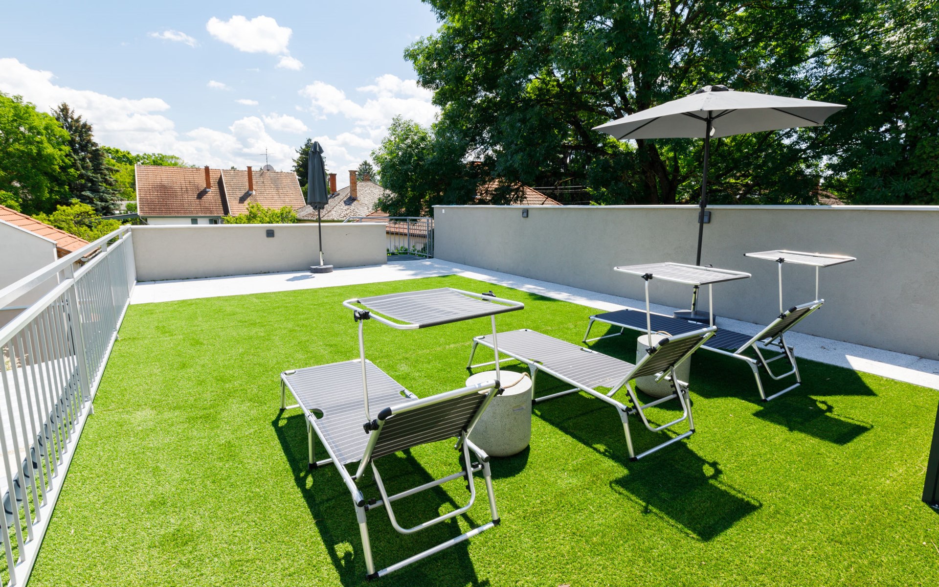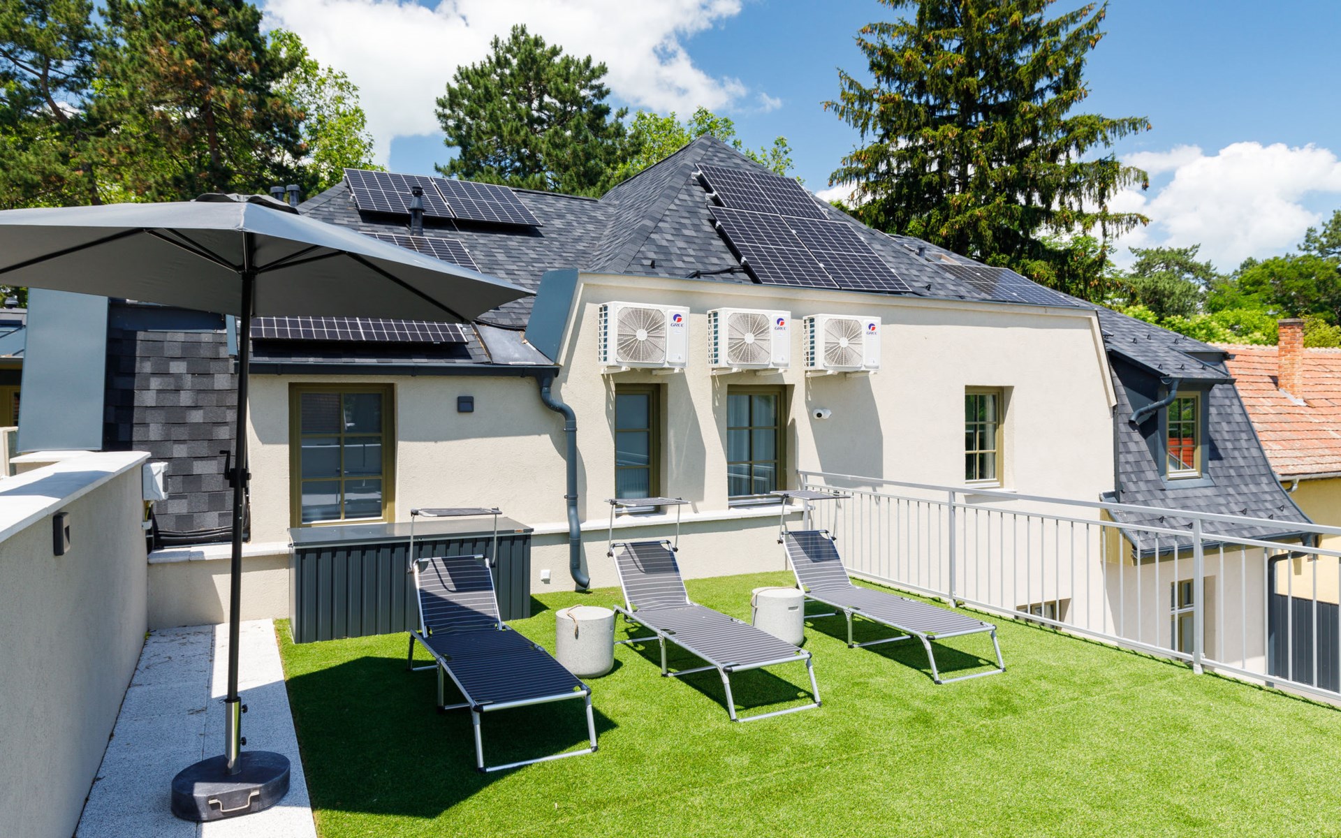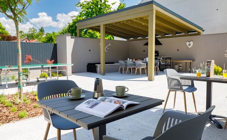 Balatonszárszó 5 km from Balatonföldvár: Large, modern, beautiful apartment house, built in 2023. 5 apartments in the residence. Excellent location: right in the centre but still quiet, 290 m from the lake, 350 m from the beach. Private: property (fenced). Outdoor shower, hot tub, table tennis, pergola, garden furniture, barbecue, children's playground (slide, sandbox). In the house: WiFi, table tennis, billiard table, table football, sun terrace, central heating system, air conditioning, washing machine, tumble dryer. Breakfast on request (extra). Parking at the house. Grocery 90 m, supermarket 7 km, restaurant, café 140 m, bicycle rental 150 m, bus stop 850 m, railway station 200 m, 200 m, thermal baths "Csiszta" 36 km. Surf school 4 km, sailing school 1 km, tennis 500 m, riding stable 9 km, children's playground 600 m. Nearby attractions: Siófok Bella Zoo 24 km, Tihany 12 km, Siófok Theme Pak 24 km, Festetics Castle 57 km, Hévíz 61 m.