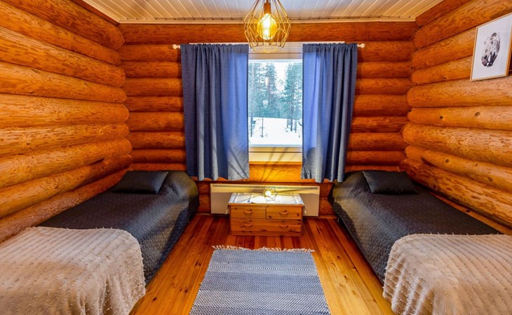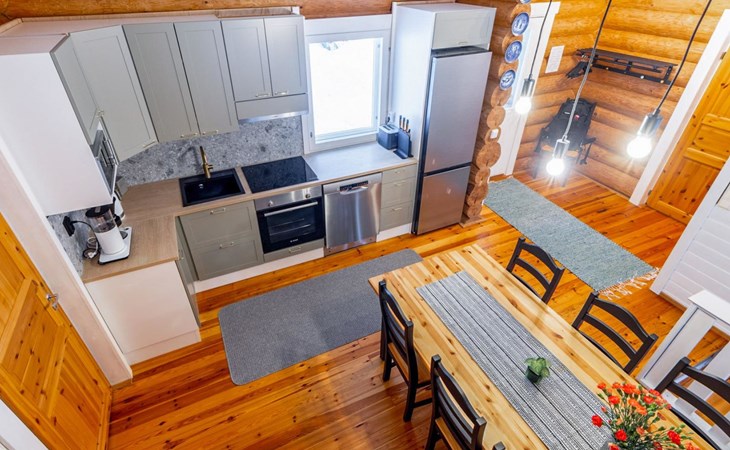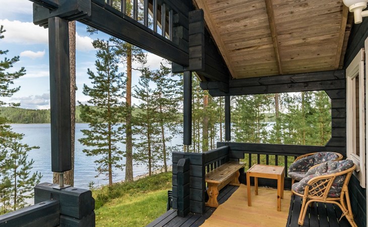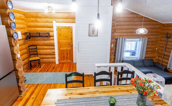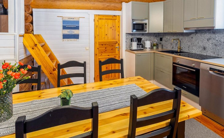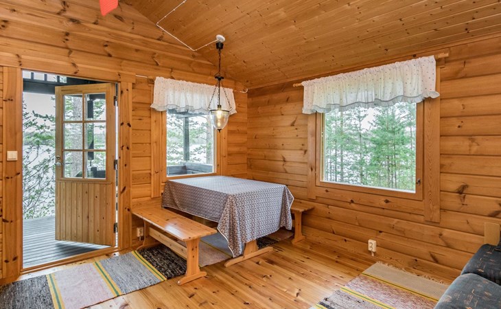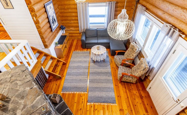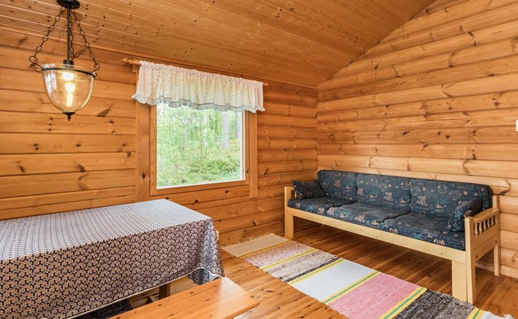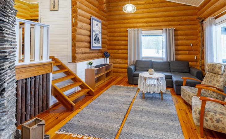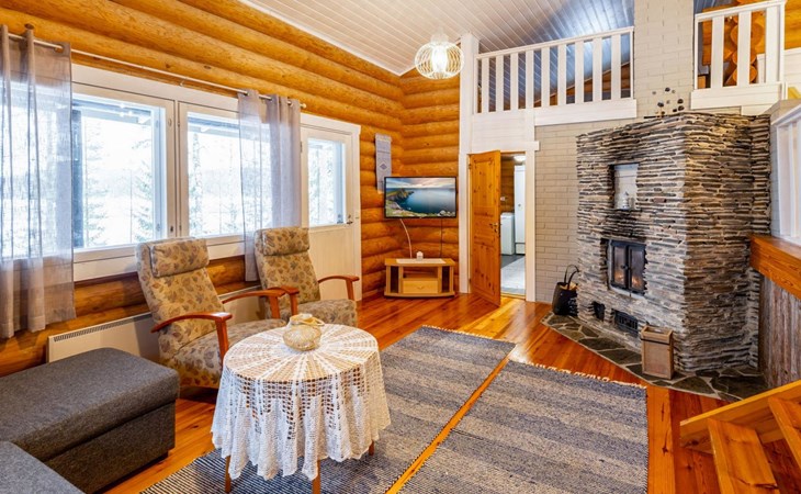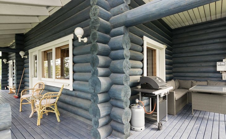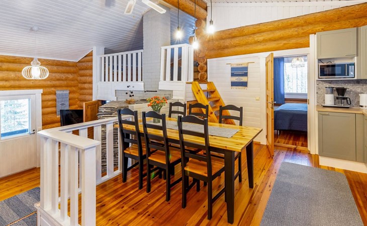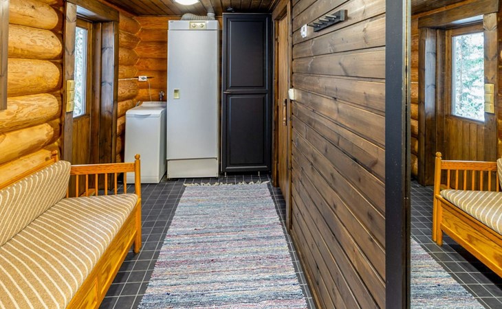 Log cottage 2005, kitchen, living room convertible sofa/bed, bedroom 2 beds, bedroom 2 beds, sleeping loft 2 beds, sauna (electric stove), washroom shower, dressing/utility room, toilet, roofed terrace. Gas grill in summer use (1.6. - 30.9.).