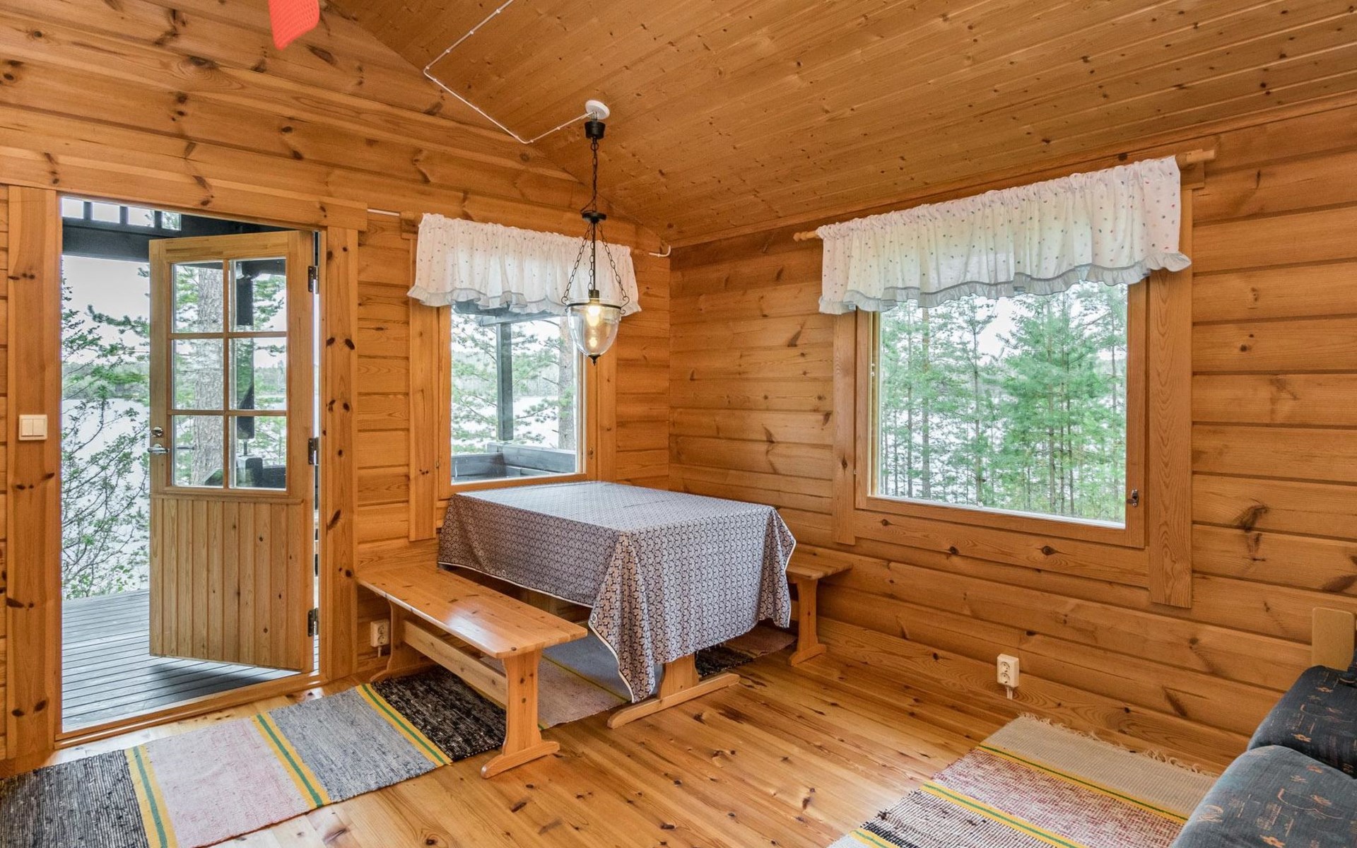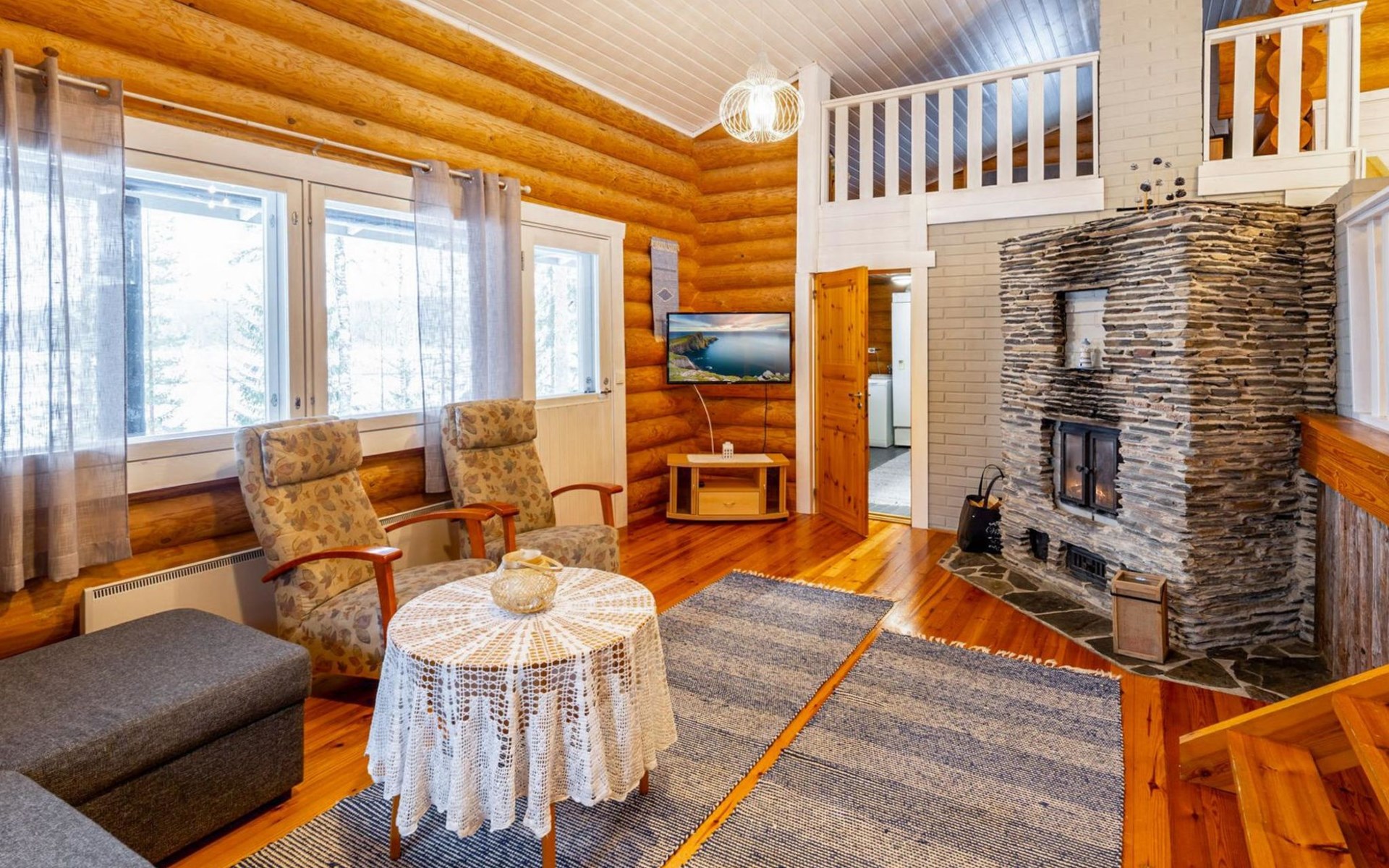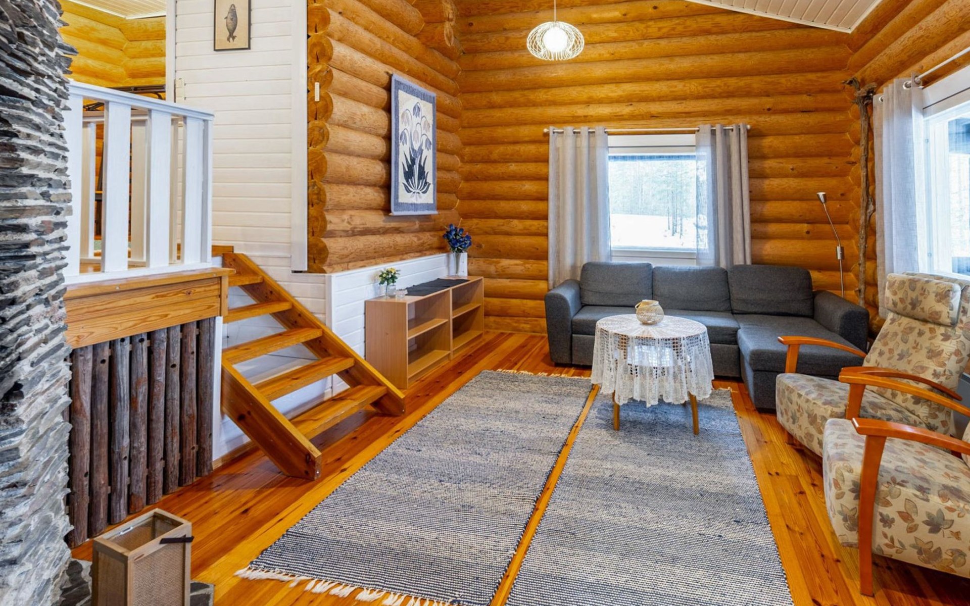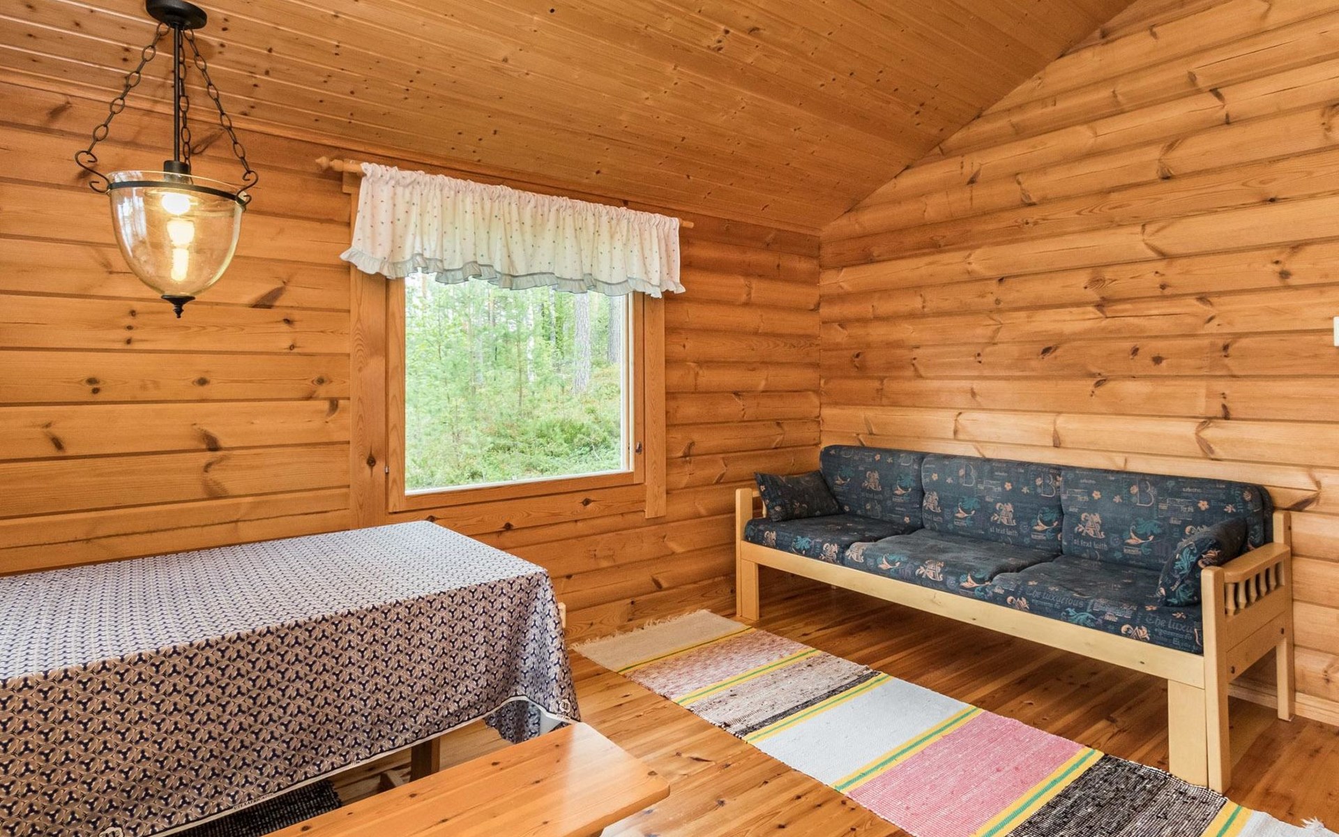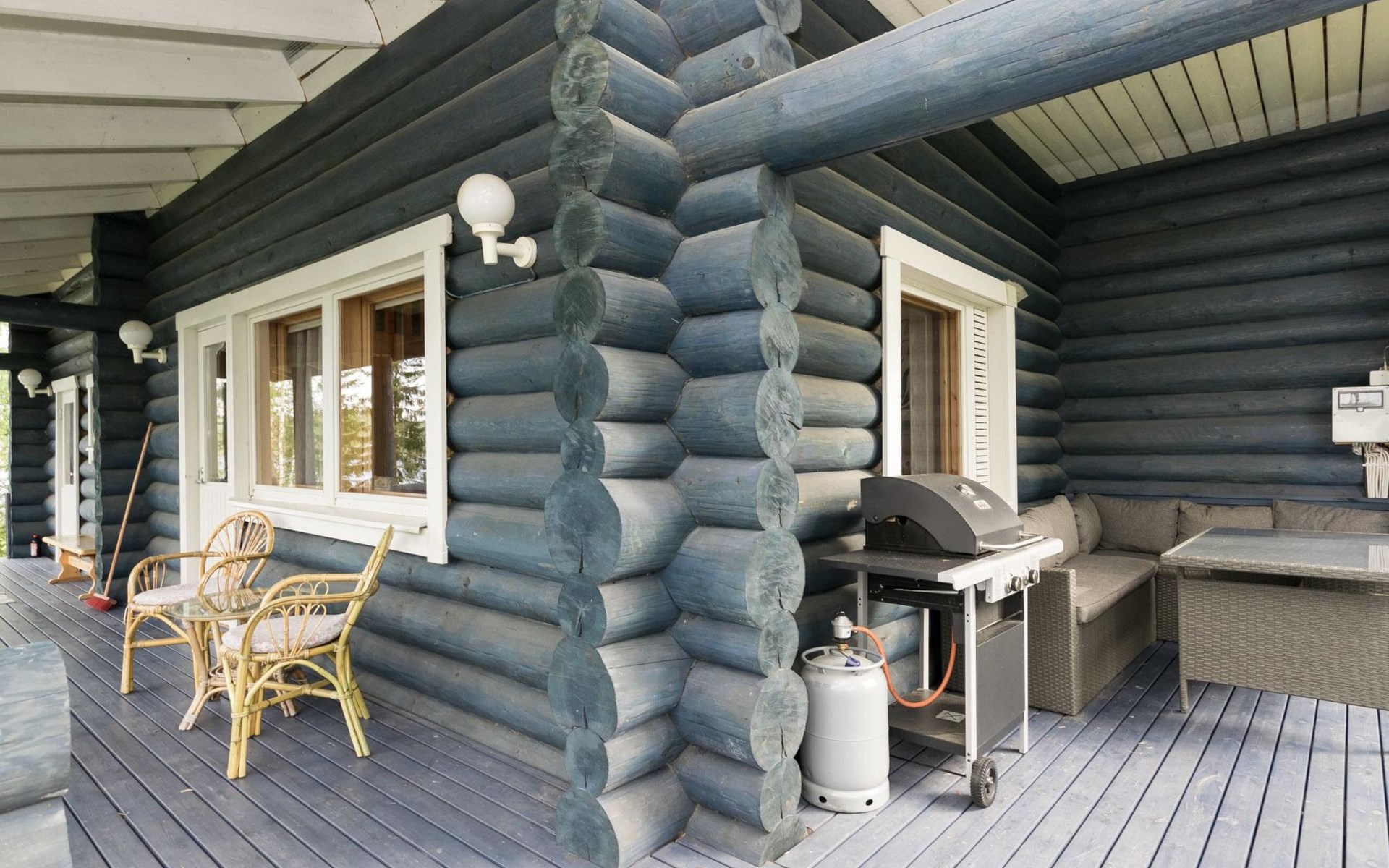 Log cottage 2005, kitchen, living room convertible sofa/bed, bedroom 2 beds, bedroom 2 beds, sleeping loft 2 beds, sauna (electric stove), washroom shower, dressing/utility room, toilet, roofed terrace. Gas grill in summer use (1.6. - 30.9.).