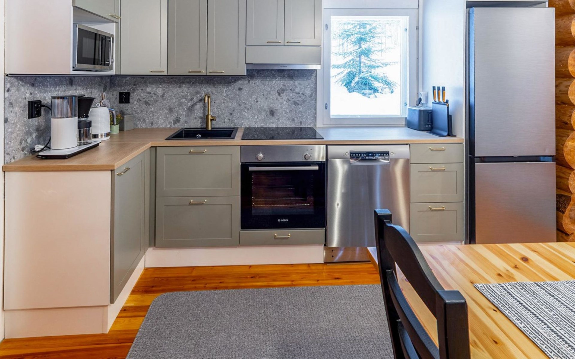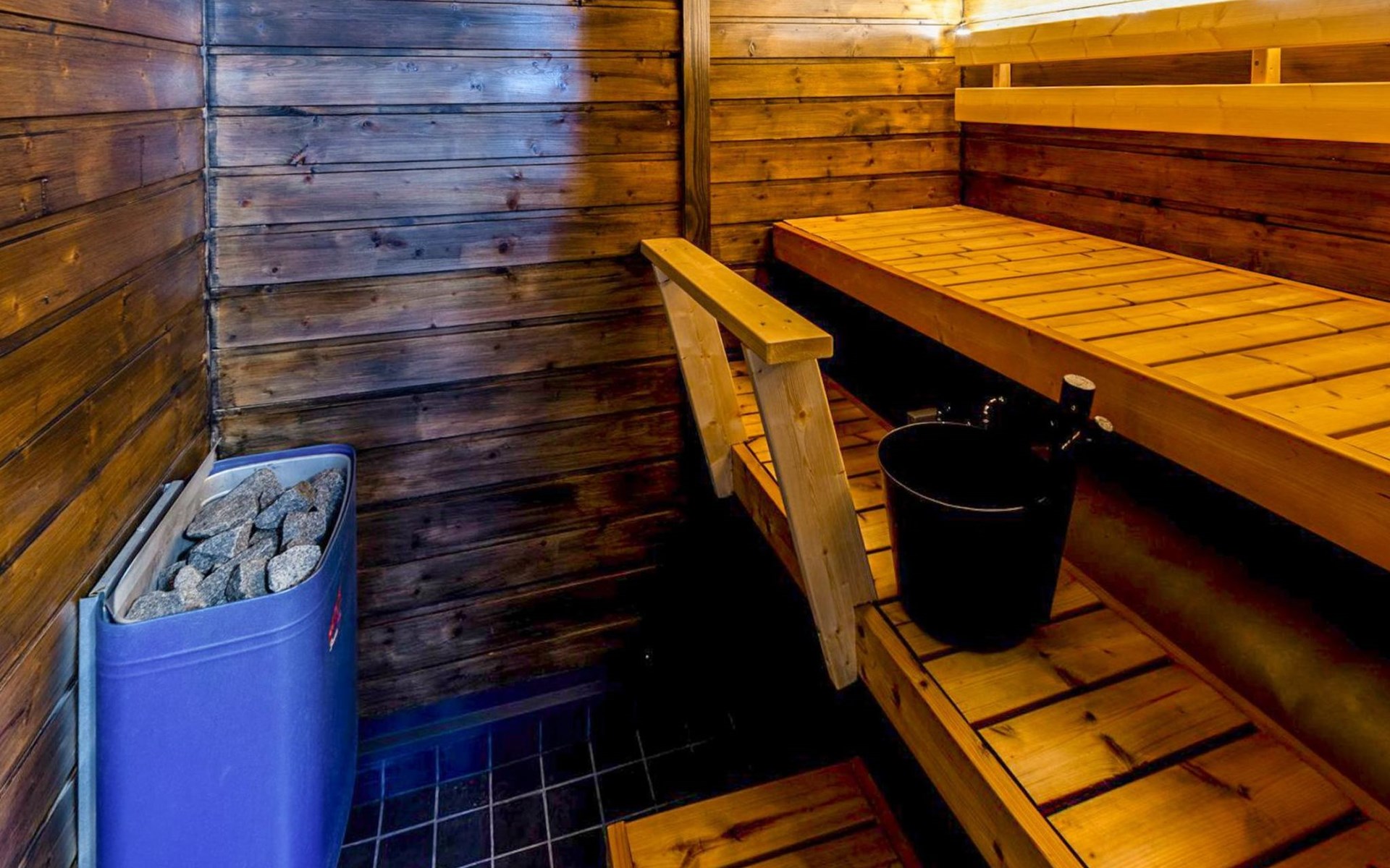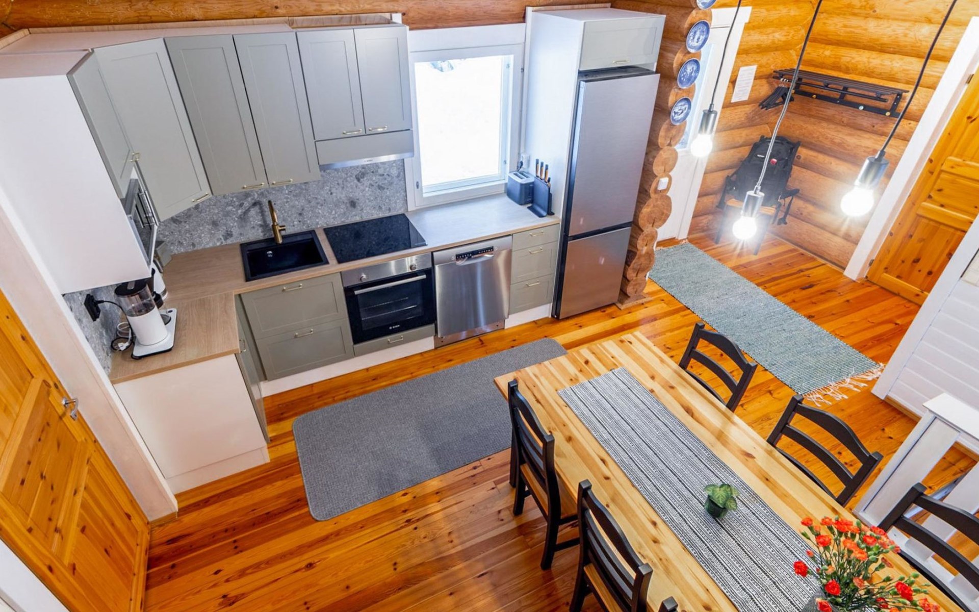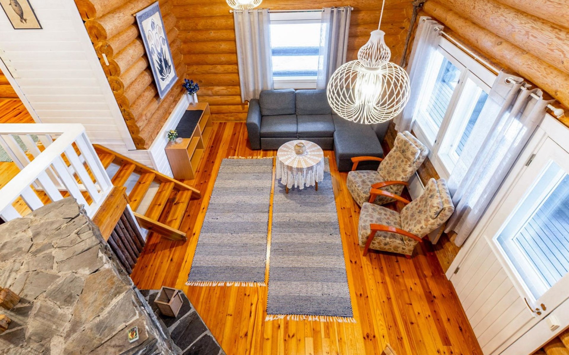 Log cottage 2005, kitchen, living room convertible sofa/bed, bedroom 2 beds, bedroom 2 beds, sleeping loft 2 beds, sauna (electric stove), washroom shower, dressing/utility room, toilet, roofed terrace. Gas grill in summer use (1.6. - 30.9.).