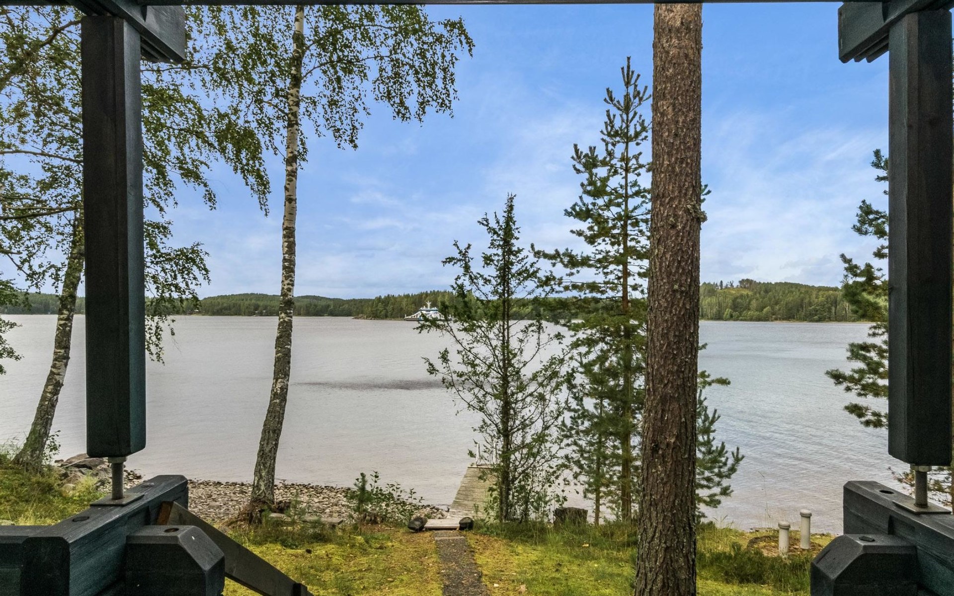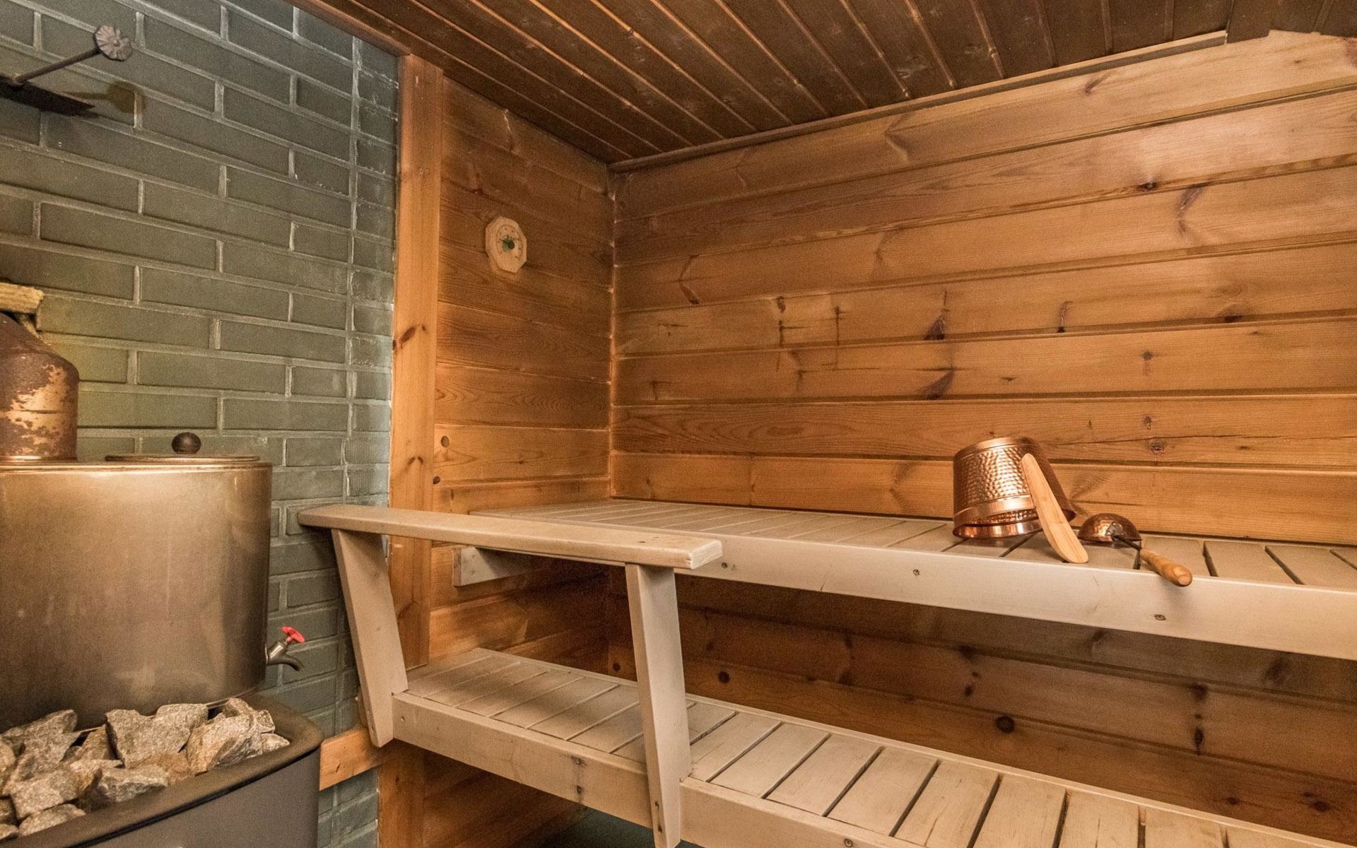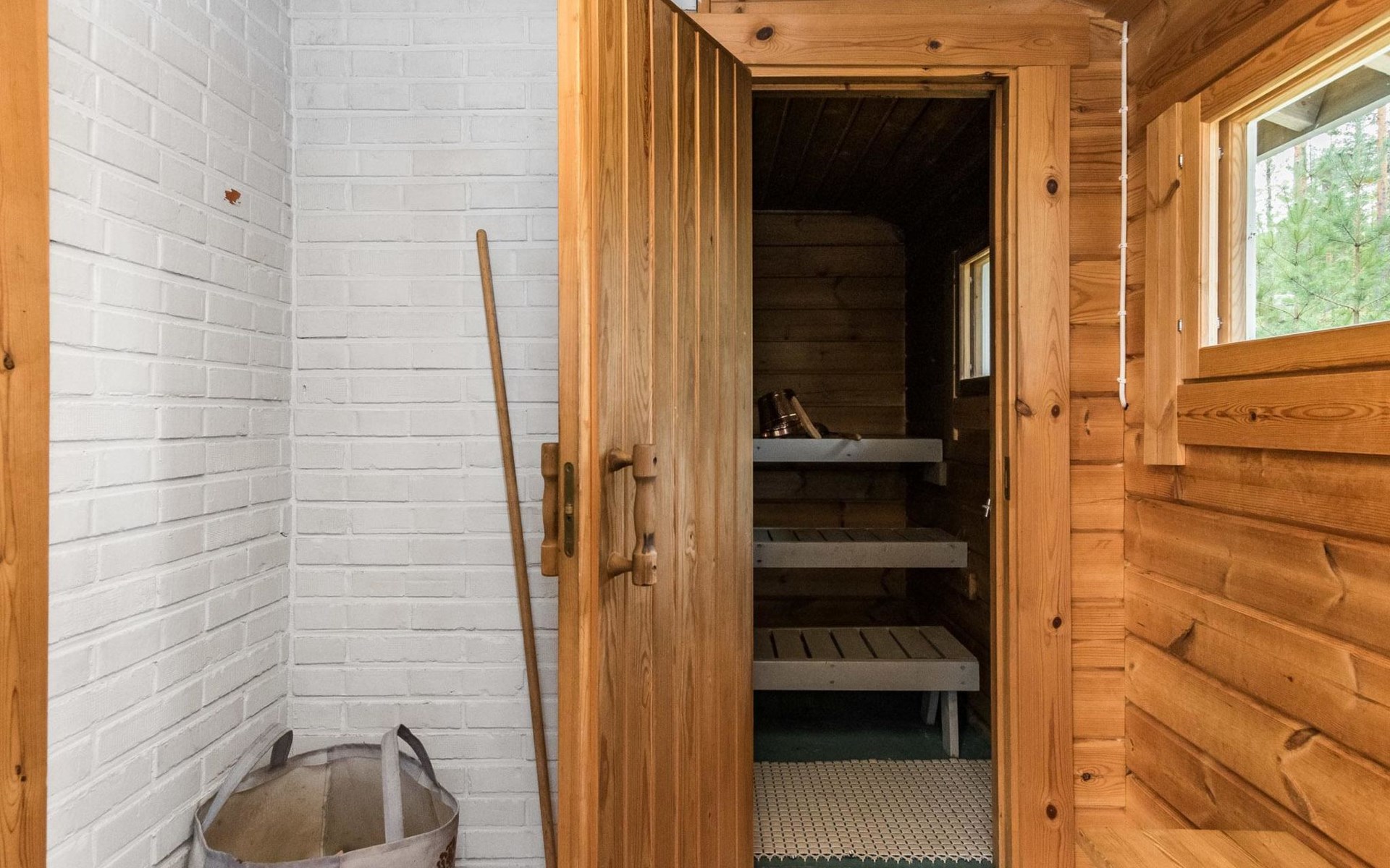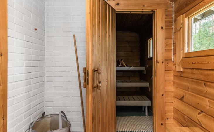 Separate lakeshore sauna in summer use (1.6. - 30.9.), wood-burning stove, hot water tank on stove, dressing room, sauna with relaxation room, porch, water comes from the pump, electric light.