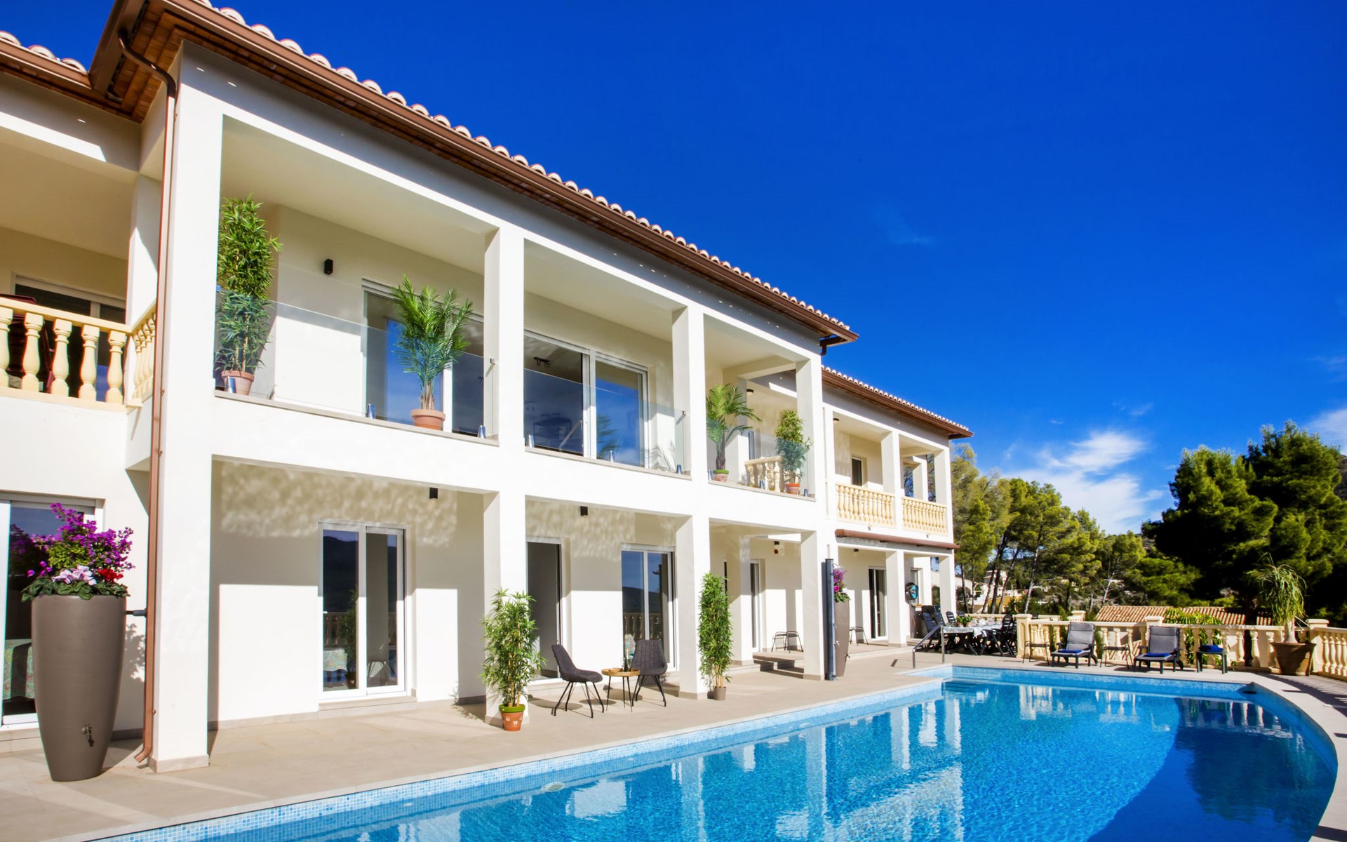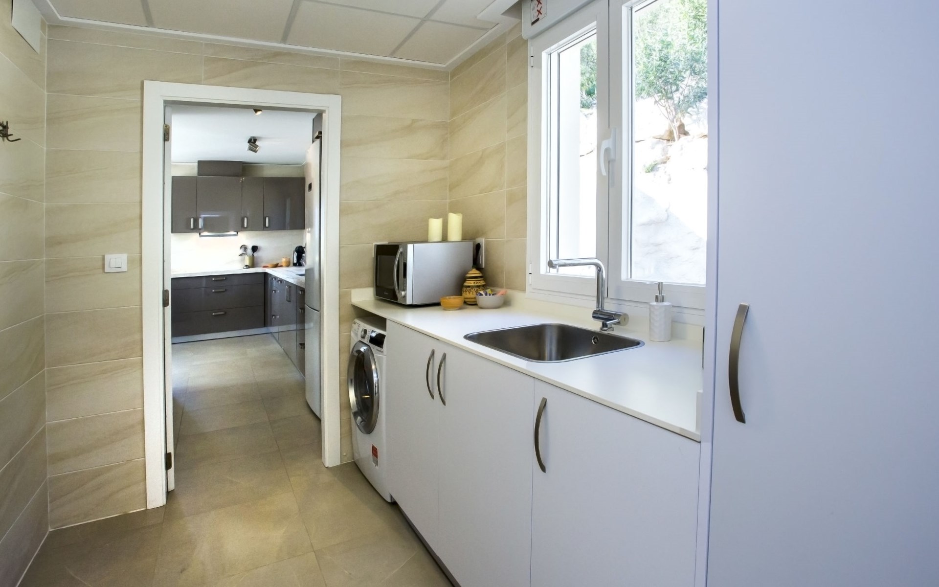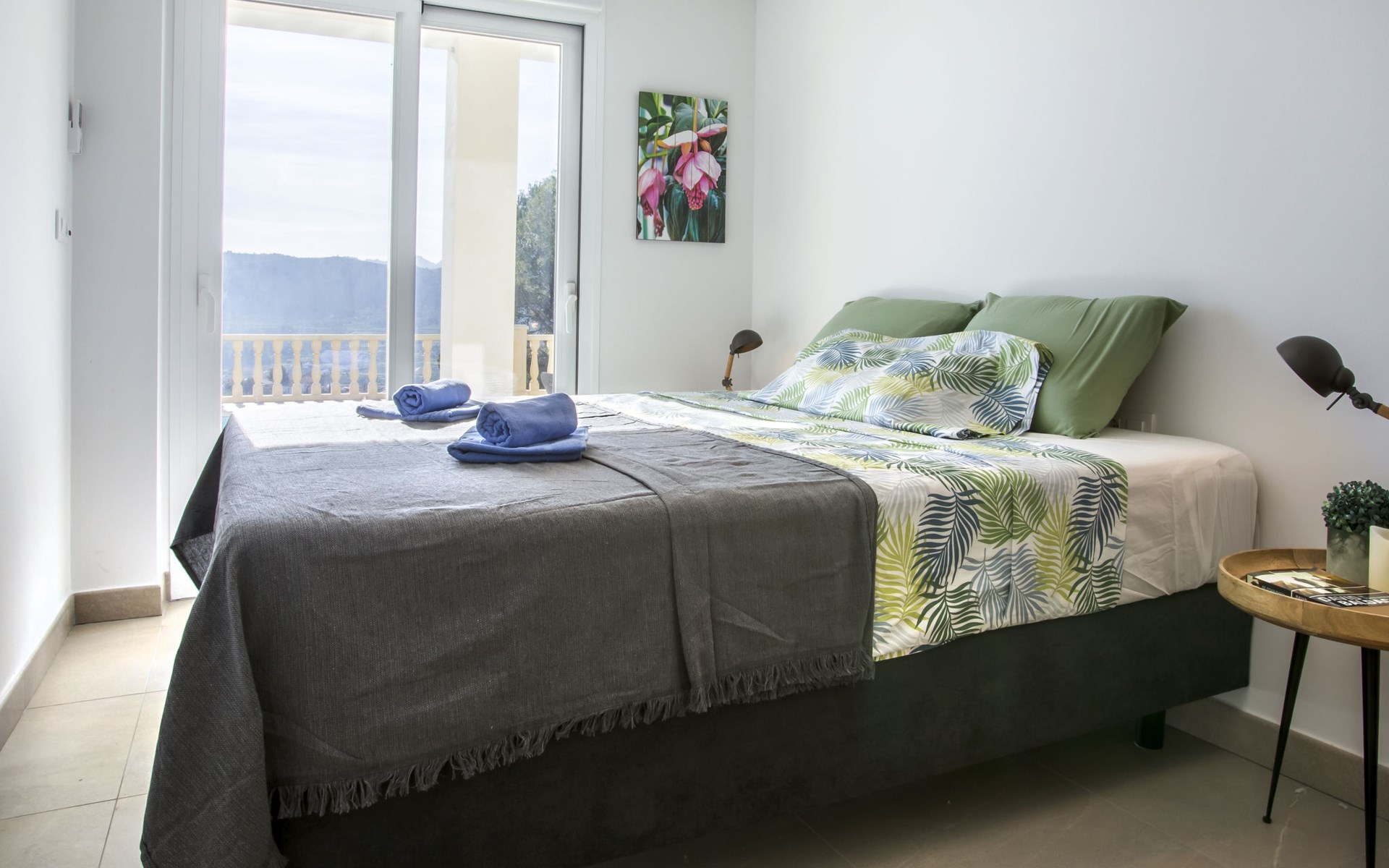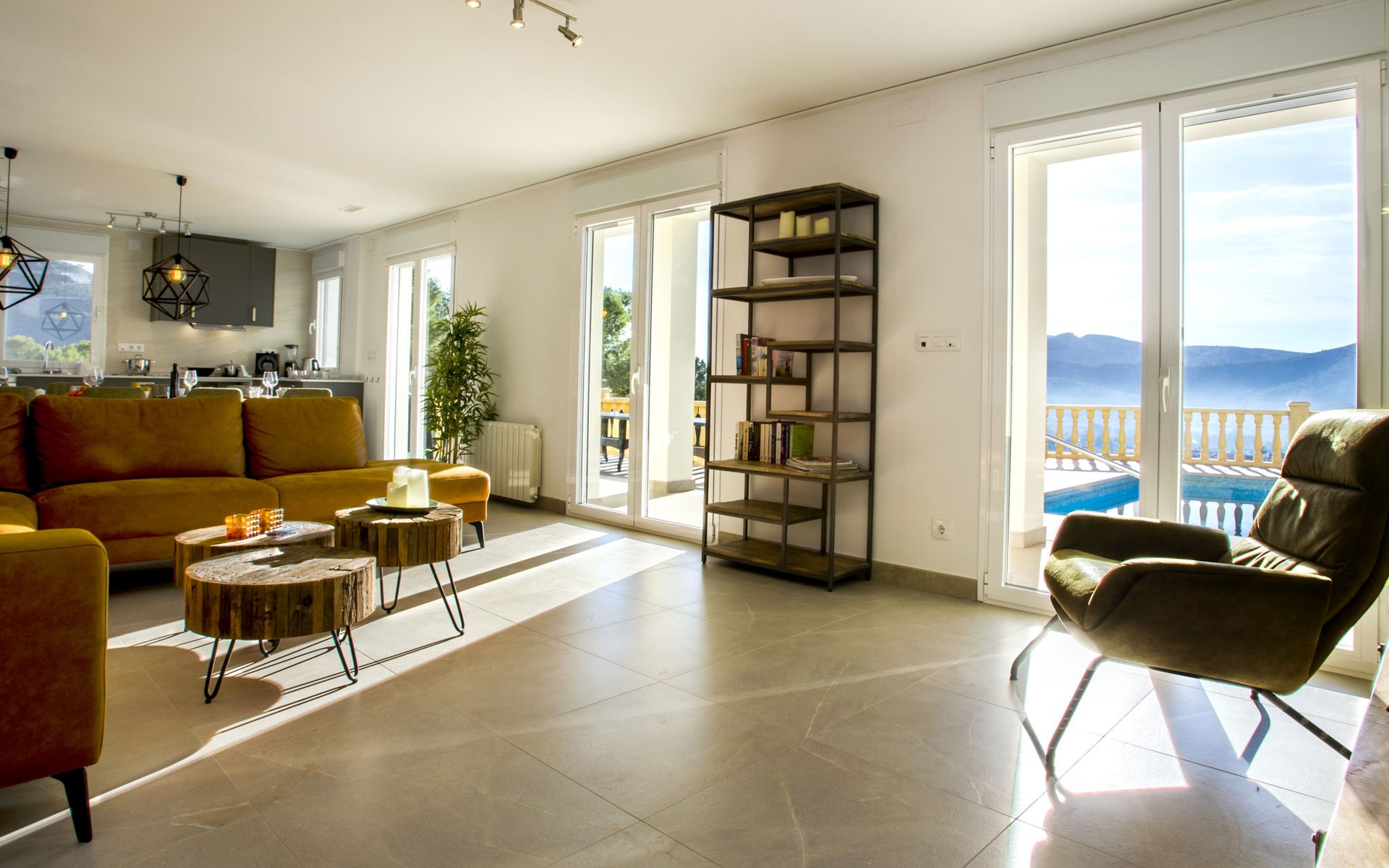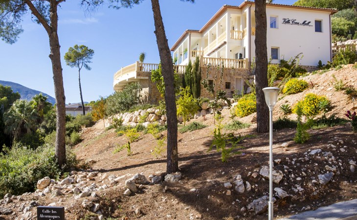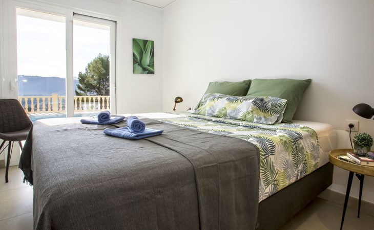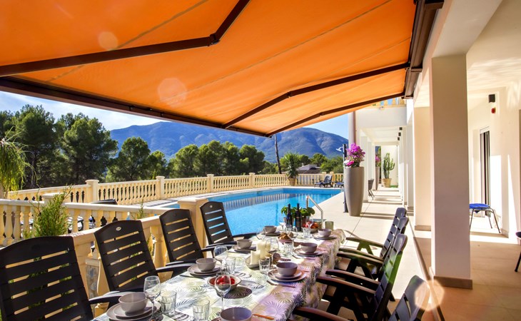 Very large, modern, very comfortable villa "Cara Mull Alcalalí", 2 storeys, built in 2020, surrounded by trees, meadows and vineyards. In the resort Alcalalí, 20 km from the centre of Calpe,Dénia,Javea,Moraira,Altea, in a quiet, sunny, elevated position, 17 km from the sea, 17 km from the beach, south facing position. Private: property 2'500 m2, large, beautiful, well-kept terraced garden wildlife garden and trees, swimming pool (15 x 6 m, depth 130 - 200 cm, seasonal availability: 01.Jan. - 31.Dec.) with internal staircase. Outdoor shower, pergola, terrace, garden furniture, barbecue, pool maintenance by the owner/gardener. In the house: lift, central heating system, air conditioning, laundry, washing machine, tumble dryer. Parking (for 5 cars) on the premises. Shop 600 m, supermarket 3 km, shopping centre 550 m, restaurant, bakery 600 m, café 500 m, bicycle rental 2 km, bus stop 22 km, railway station 21 km, ferry 22 km. Walking paths from the house 500 m. Nearby attractions: Rastro/Flea Market de Jalón 3 km, Parque Natural del Peñón de Ifach 17 km, Port de l'Olla de Altea 16 km, Fuentes del Algar 12 km. Hiking paths: cicloturismo 50 m. Please note: car recommended. The owner does not accept any youth groups.