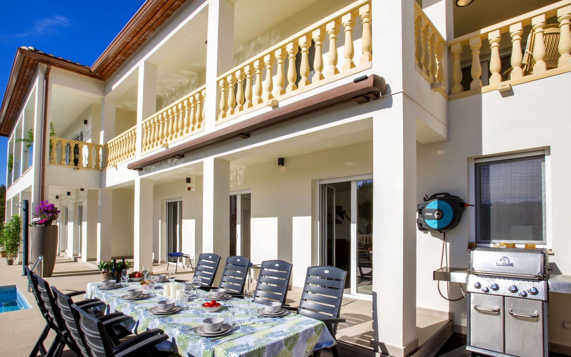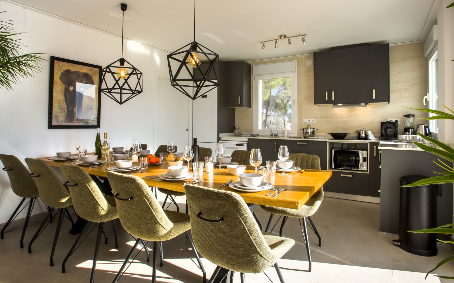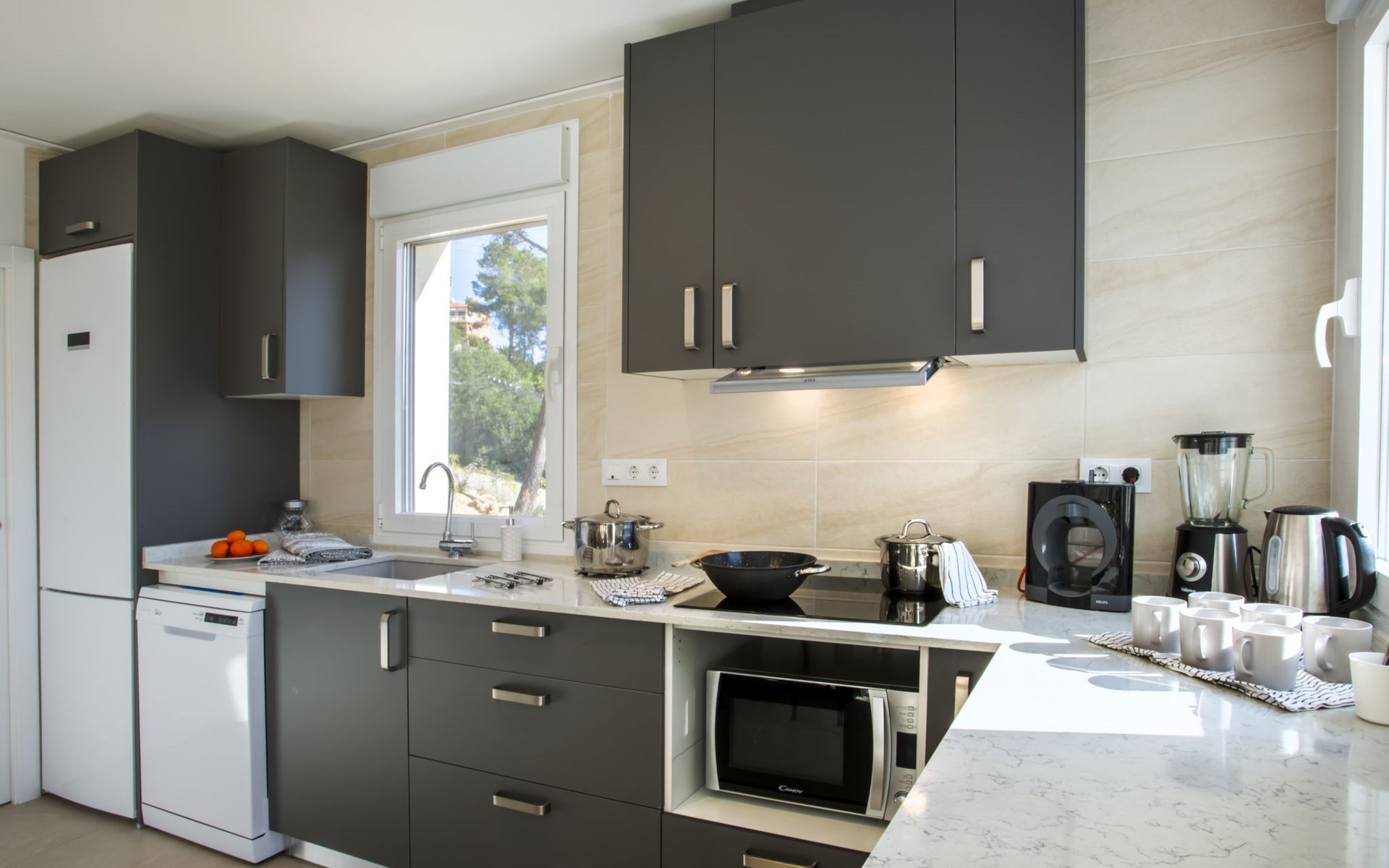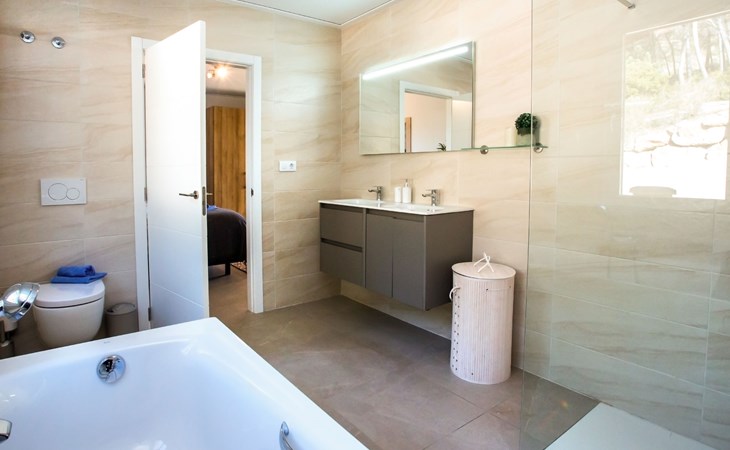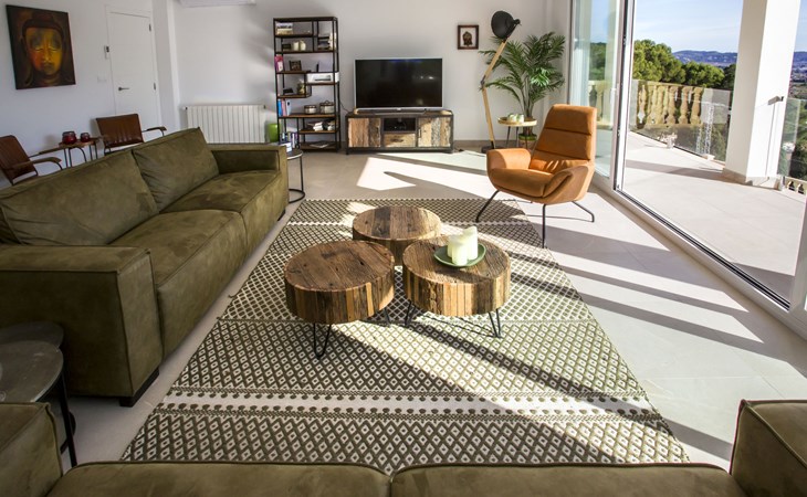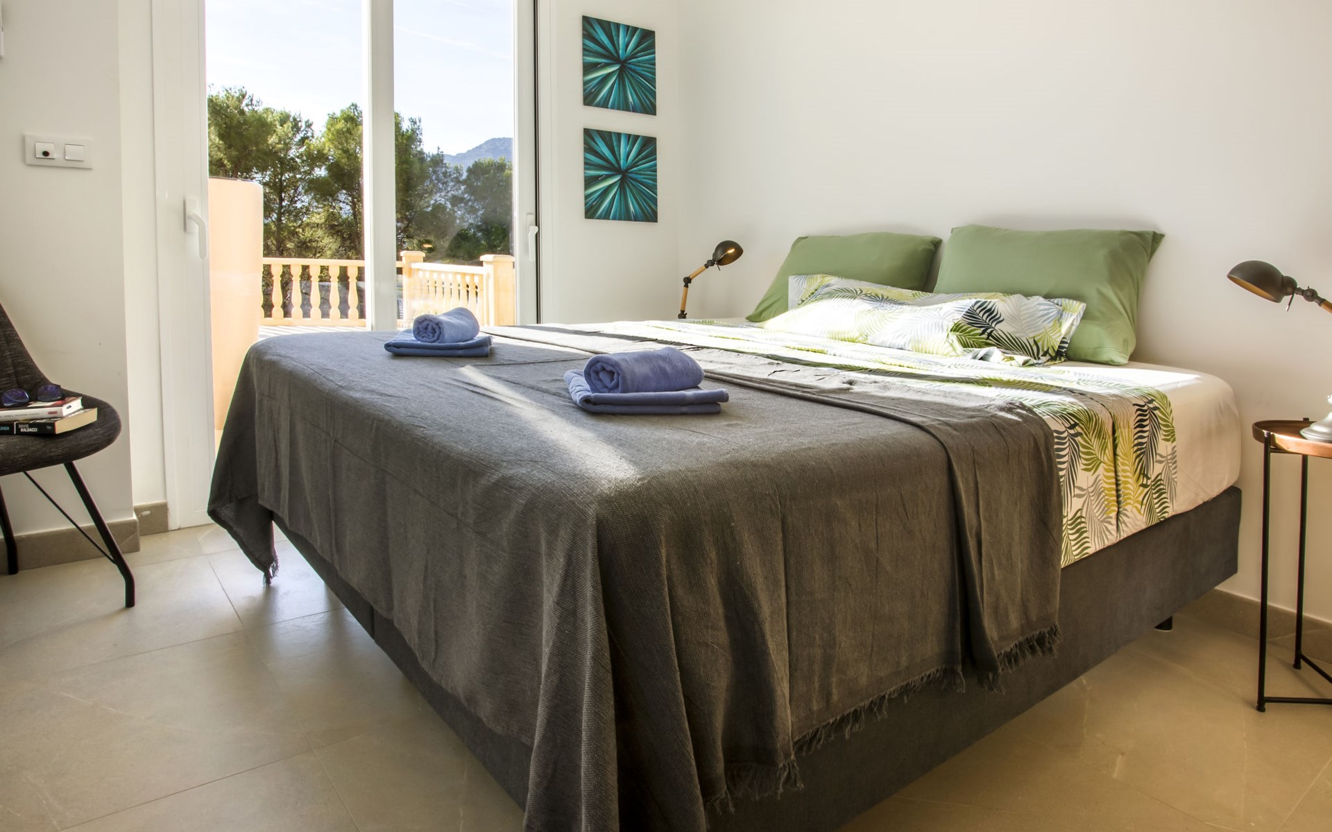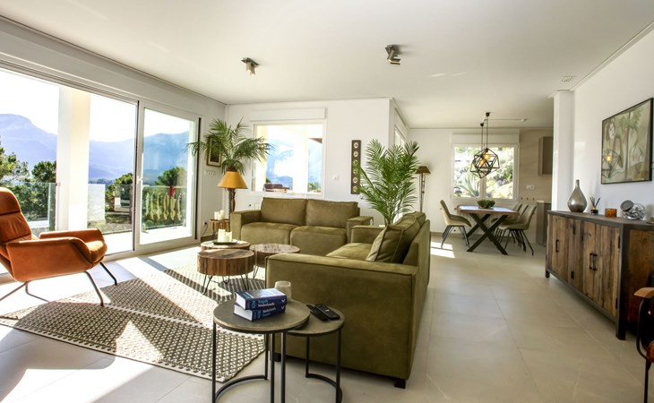 Very large, modern, very comfortable villa "Cara Mull Alcalalí", 2 storeys, built in 2020, surrounded by trees, meadows and vineyards. In the resort Alcalalí, 20 km from the centre of Calpe,Dénia,Javea,Moraira,Altea, in a quiet, sunny, elevated position, 17 km from the sea, 17 km from the beach, south facing position. Private: property 2'500 m2, large, beautiful, well-kept terraced garden wildlife garden and trees, swimming pool (15 x 6 m, depth 130 - 200 cm, seasonal availability: 01.Jan. - 31.Dec.) with internal staircase. Outdoor shower, pergola, terrace, garden furniture, barbecue, pool maintenance by the owner/gardener. In the house: lift, central heating system, air conditioning, laundry, washing machine, tumble dryer. Parking (for 5 cars) on the premises. Shop 600 m, supermarket 3 km, shopping centre 550 m, restaurant, bakery 600 m, café 500 m, bicycle rental 2 km, bus stop 22 km, railway station 21 km, ferry 22 km. Walking paths from the house 500 m. Nearby attractions: Rastro/Flea Market de Jalón 3 km, Parque Natural del Peñón de Ifach 17 km, Port de l'Olla de Altea 16 km, Fuentes del Algar 12 km. Hiking paths: cicloturismo 50 m. Please note: car recommended. The owner does not accept any youth groups.