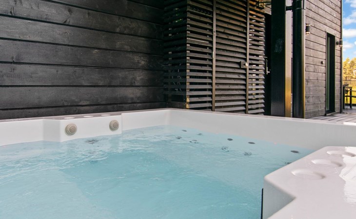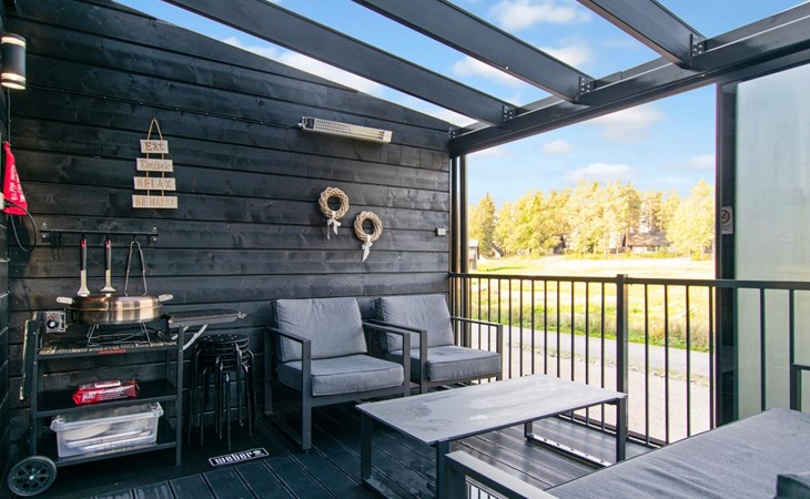 The spacious terrace includes a glazed area of 11 m². The open part of the terrace features a large seating area. Next to the glazed area is lounge furniture. There is also a hydro massage bath available for rent on the terrace. At the hydro massage bath there are loudspeakers on the wall and they can be adjusted with a mobile phone by a bluetooth-connection.
