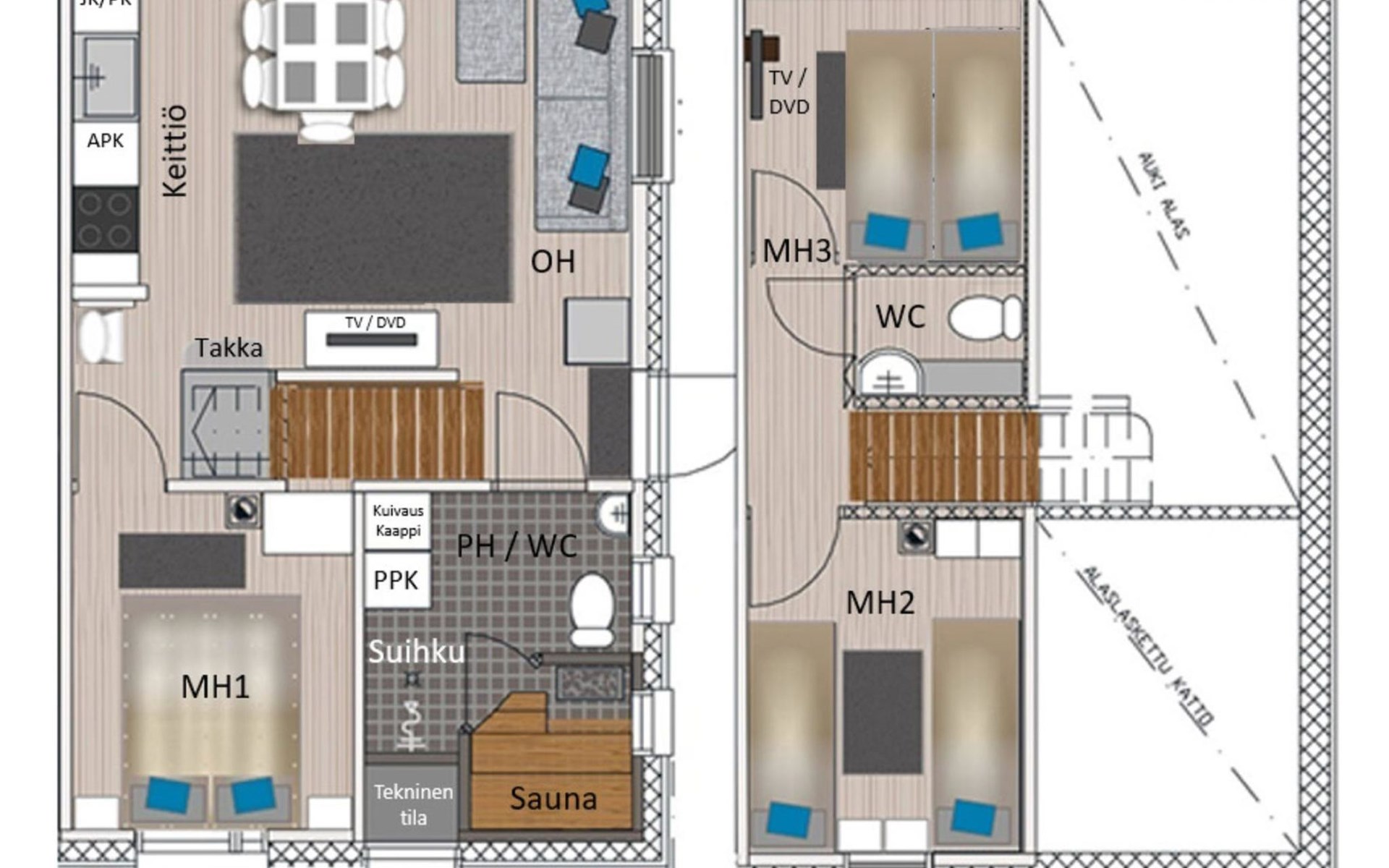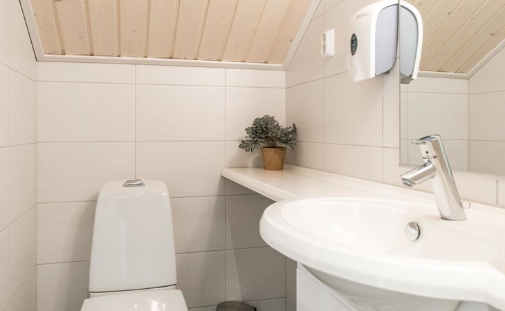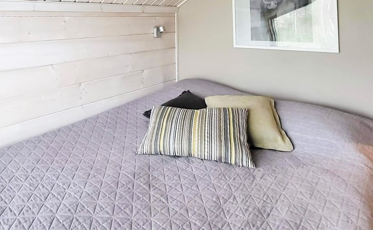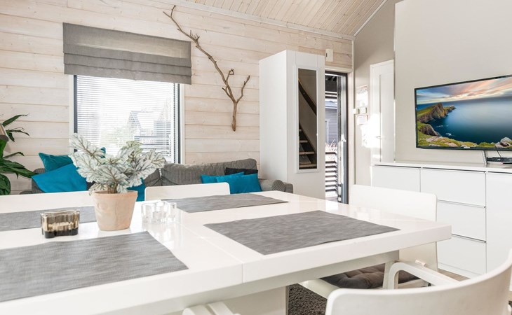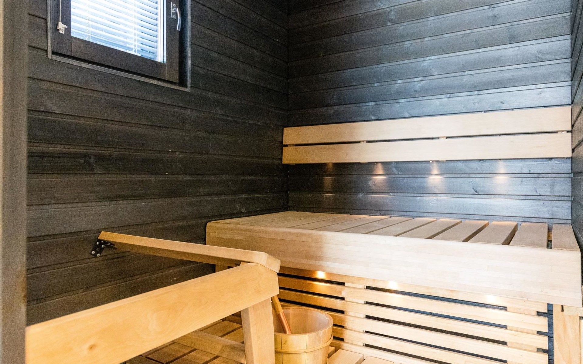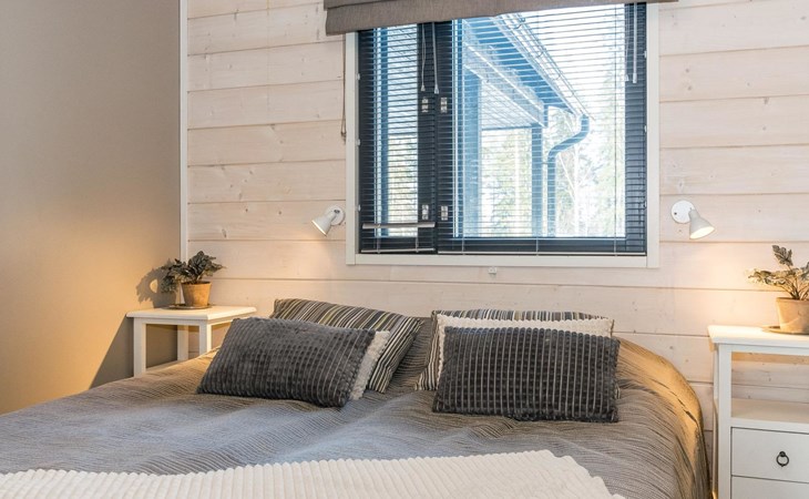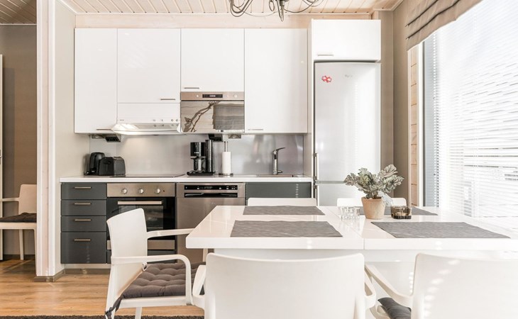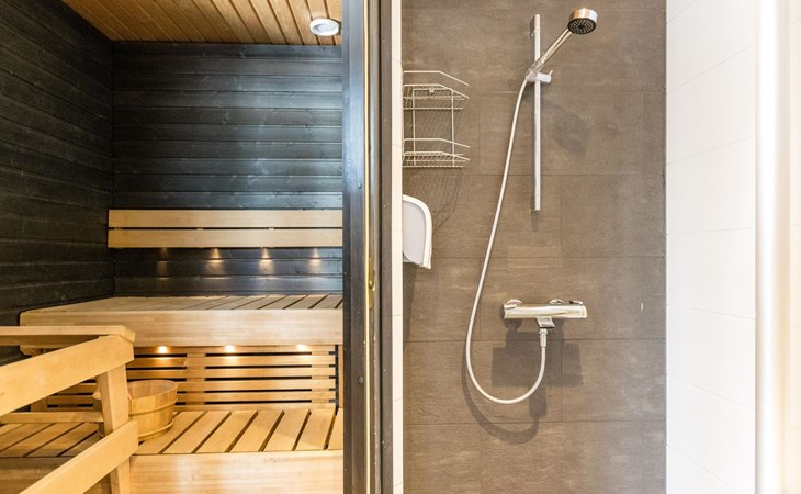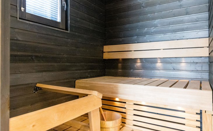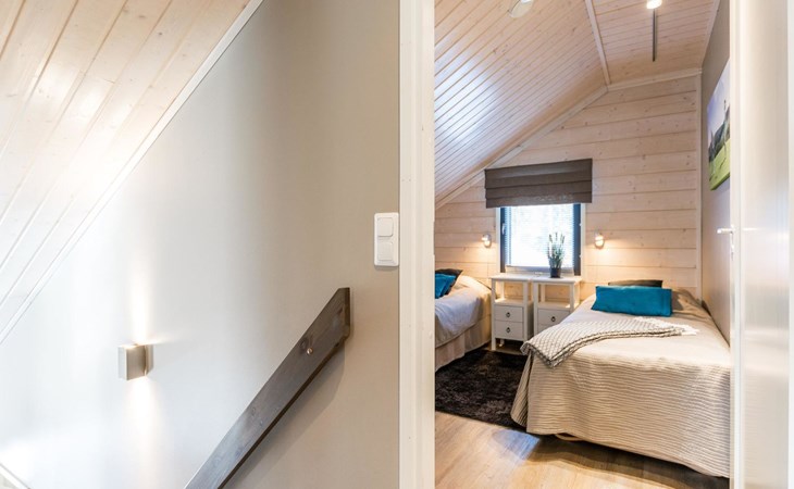 Wooden apartment (2014) with an open kitchen in the living room. The living room has a fireplace, dining area, sofa and large flat screen TV and Chromecast player. The downstairs bedroom has two beds. There is also a washroom with toilet and sauna (electrically heated stove) on the ground floor. The sauna offers a great place to relax, speakers have been installed under the benches for listening to music (can be connected via Bluetooth to the amplifier in the bathroom with all playback devices). Upstairs there are 2 bedrooms, each with two beds. There is also a separate toilet upstairs. All bedrooms have blinds, in addition, the downstairs bedroom and the second bedroom upstairs also have blackout curtains, upstairs there is a TV and a Chromecast player. The apartment is heated by geothermal / water-circulated underfloor heating, which can be controlled with room-specific thermostats. The apartment has mechanical ventilation, which also has a cooling function. A travel cot and high chair for a small child and a toilet seat (reducer) are available.