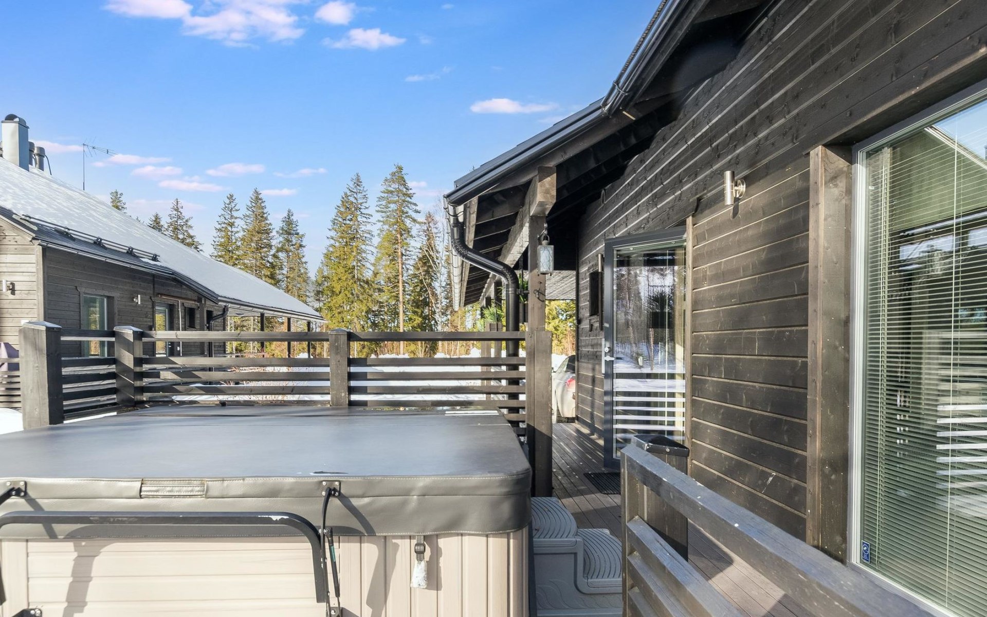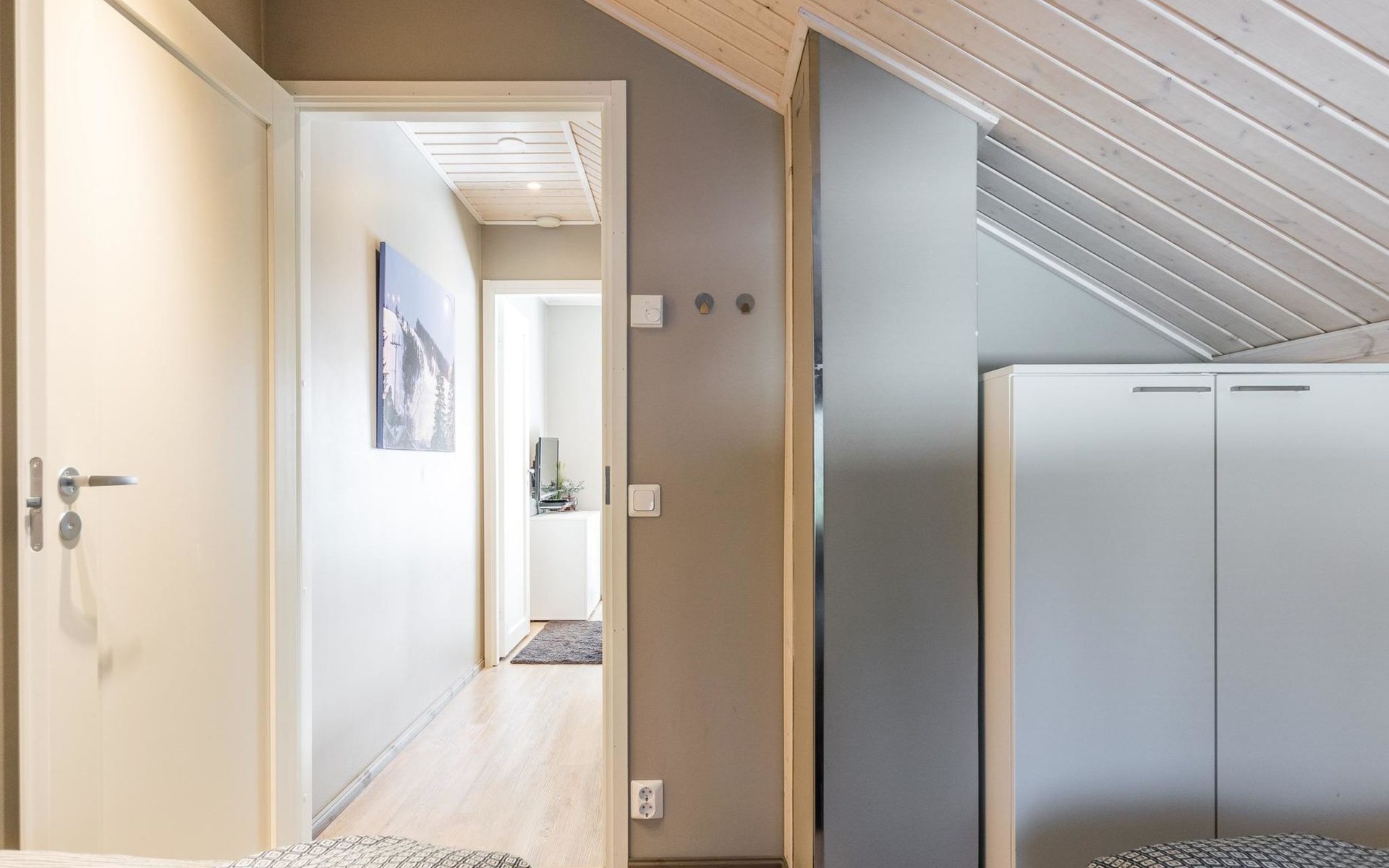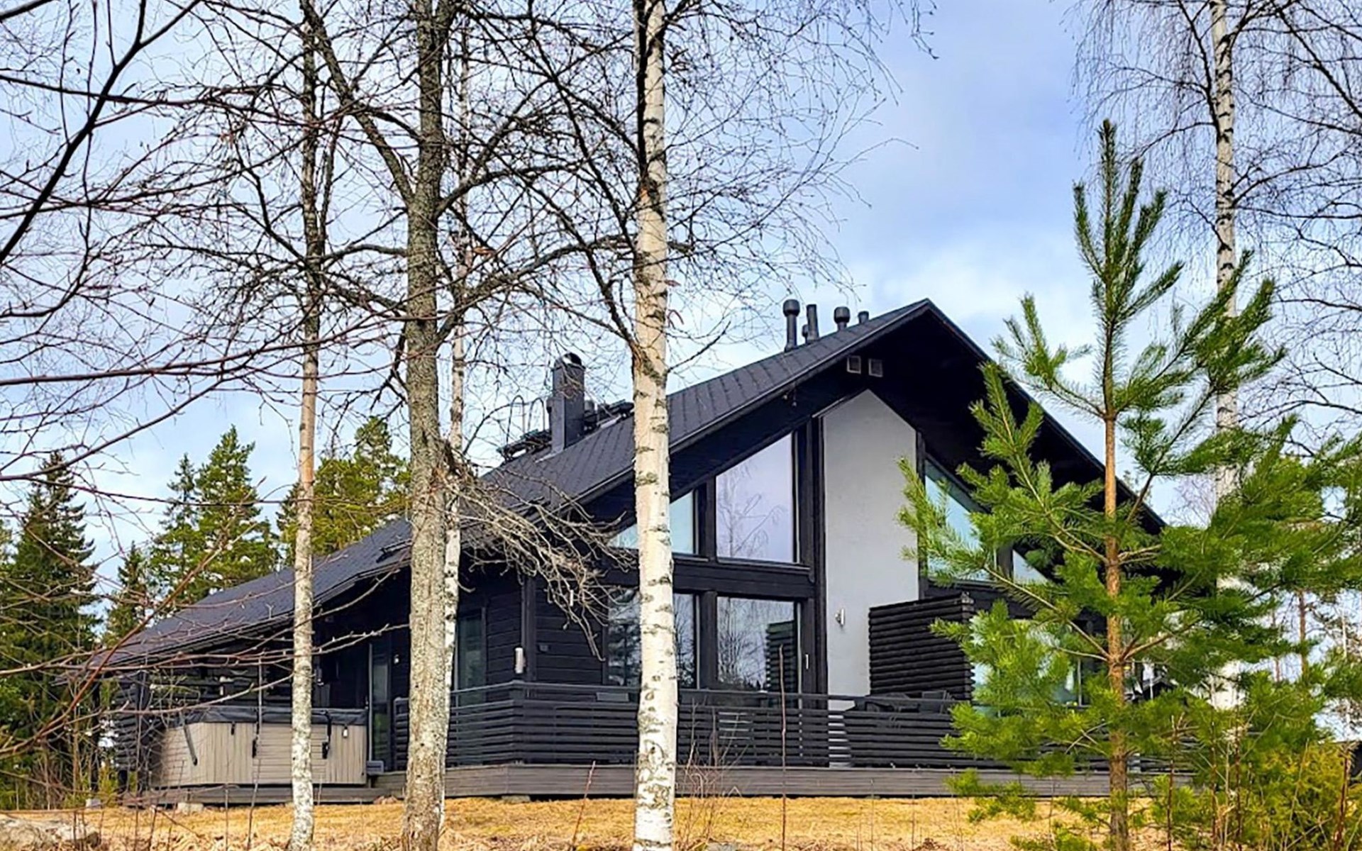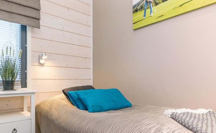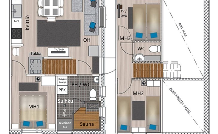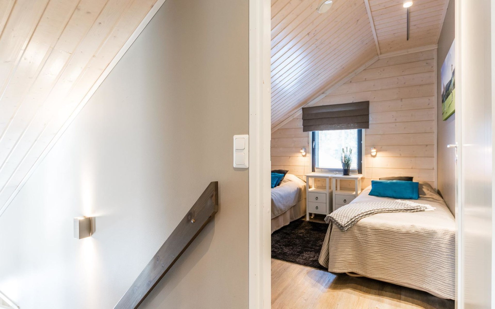 Wooden apartment (2014) with an open kitchen in the living room. The living room has a fireplace, dining area, sofa and large flat screen TV and Chromecast player. The downstairs bedroom has two beds. There is also a washroom with toilet and sauna (electrically heated stove) on the ground floor. The sauna offers a great place to relax, speakers have been installed under the benches for listening to music (can be connected via Bluetooth to the amplifier in the bathroom with all playback devices). Upstairs there are 2 bedrooms, each with two beds. There is also a separate toilet upstairs. All bedrooms have blinds, in addition, the downstairs bedroom and the second bedroom upstairs also have blackout curtains, upstairs there is a TV and a Chromecast player. The apartment is heated by geothermal / water-circulated underfloor heating, which can be controlled with room-specific thermostats. The apartment has mechanical ventilation, which also has a cooling function. A travel cot and high chair for a small child and a toilet seat (reducer) are available.