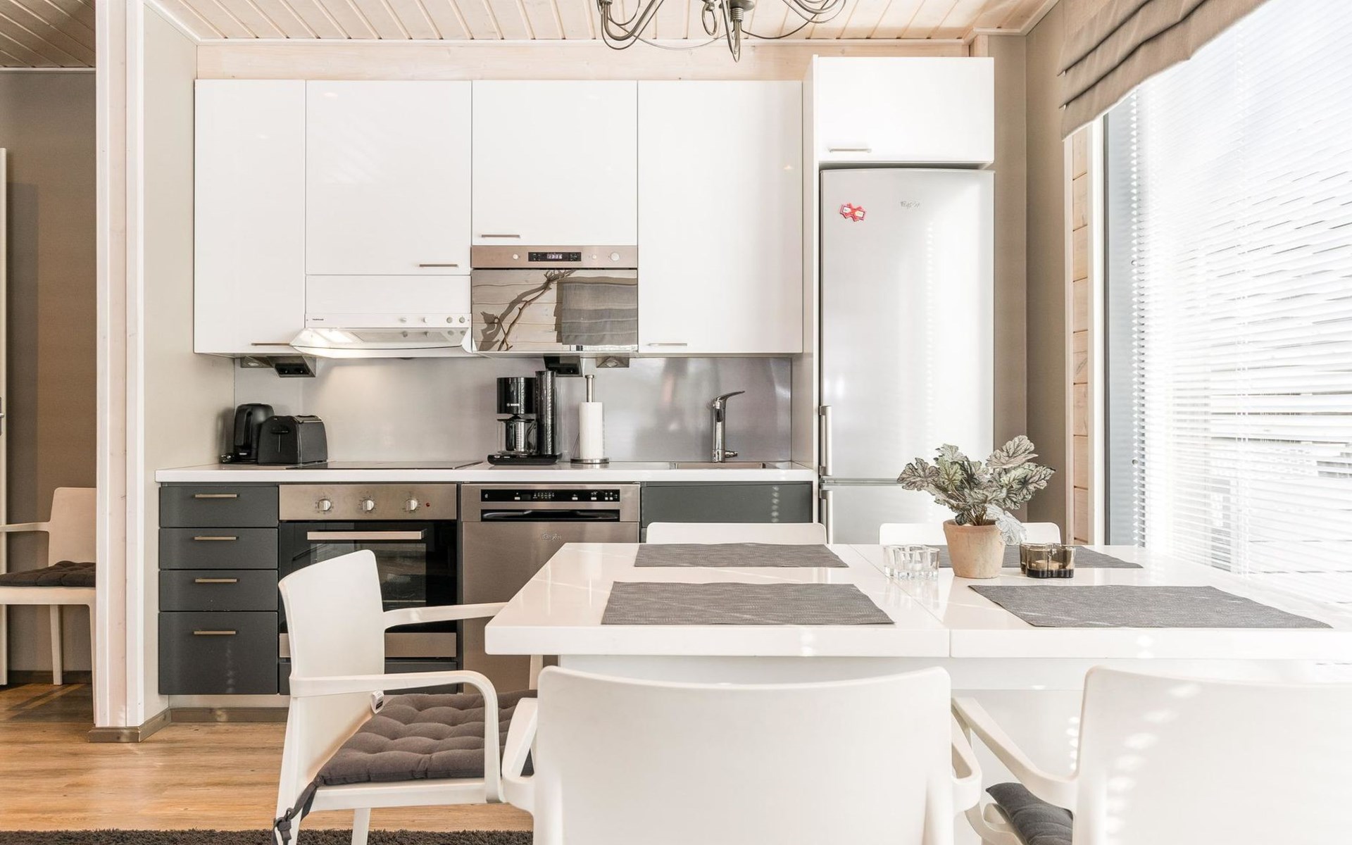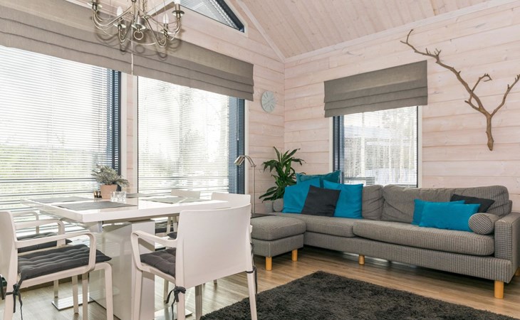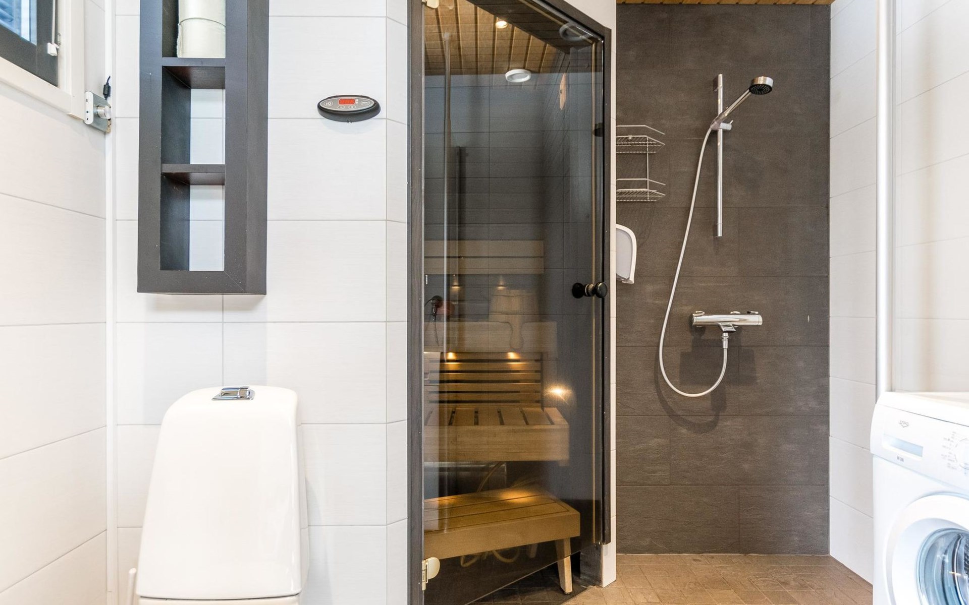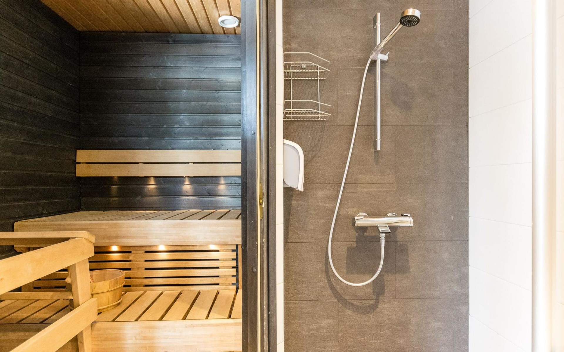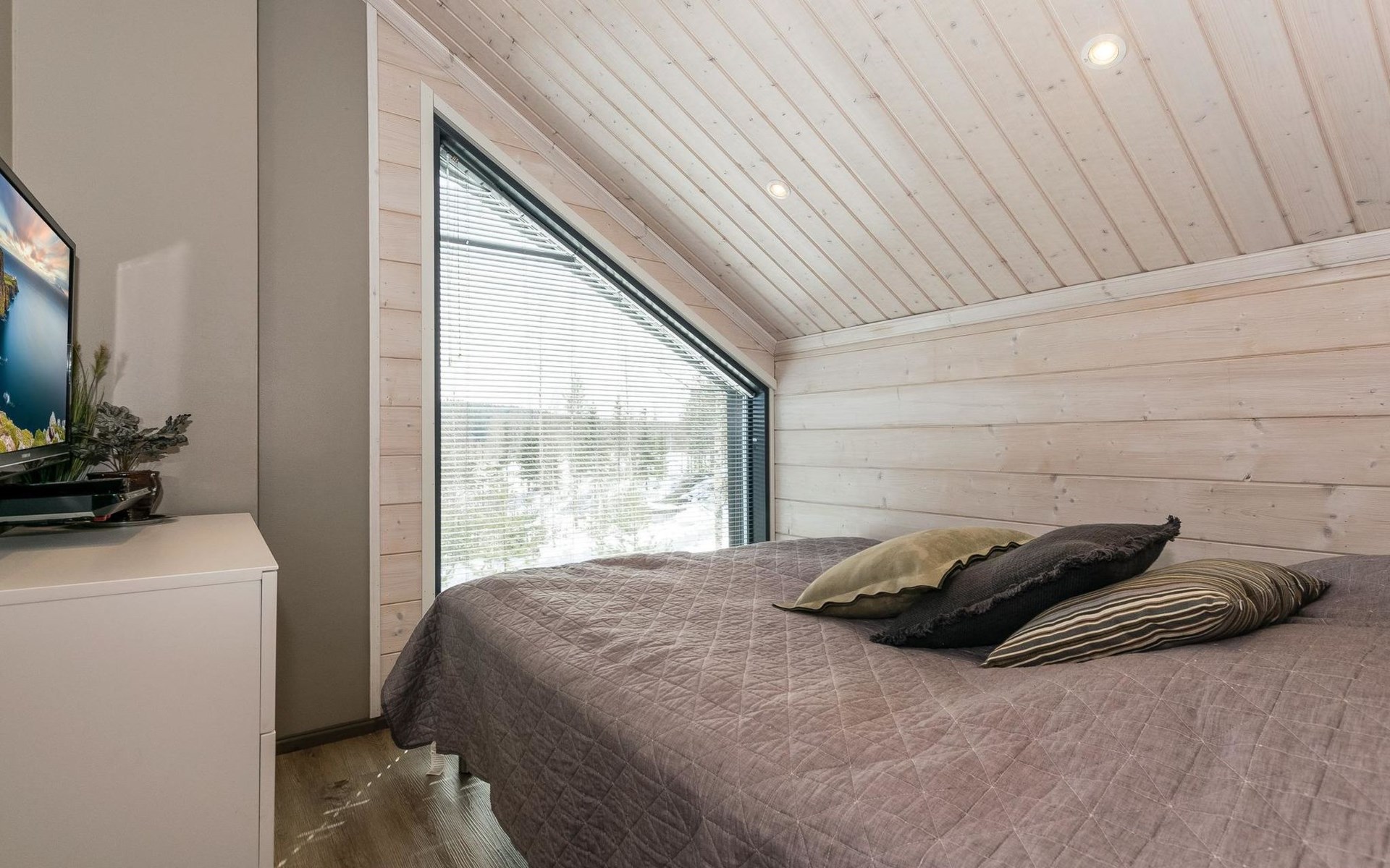 Wooden apartment (2014) with an open kitchen in the living room. The living room has a fireplace, dining area, sofa and large flat screen TV and Chromecast player. The downstairs bedroom has two beds. There is also a washroom with toilet and sauna (electrically heated stove) on the ground floor. The sauna offers a great place to relax, speakers have been installed under the benches for listening to music (can be connected via Bluetooth to the amplifier in the bathroom with all playback devices). Upstairs there are 2 bedrooms, each with two beds. There is also a separate toilet upstairs. All bedrooms have blinds, in addition, the downstairs bedroom and the second bedroom upstairs also have blackout curtains, upstairs there is a TV and a Chromecast player. The apartment is heated by geothermal / water-circulated underfloor heating, which can be controlled with room-specific thermostats. The apartment has mechanical ventilation, which also has a cooling function. A travel cot and high chair for a small child and a toilet seat (reducer) are available.