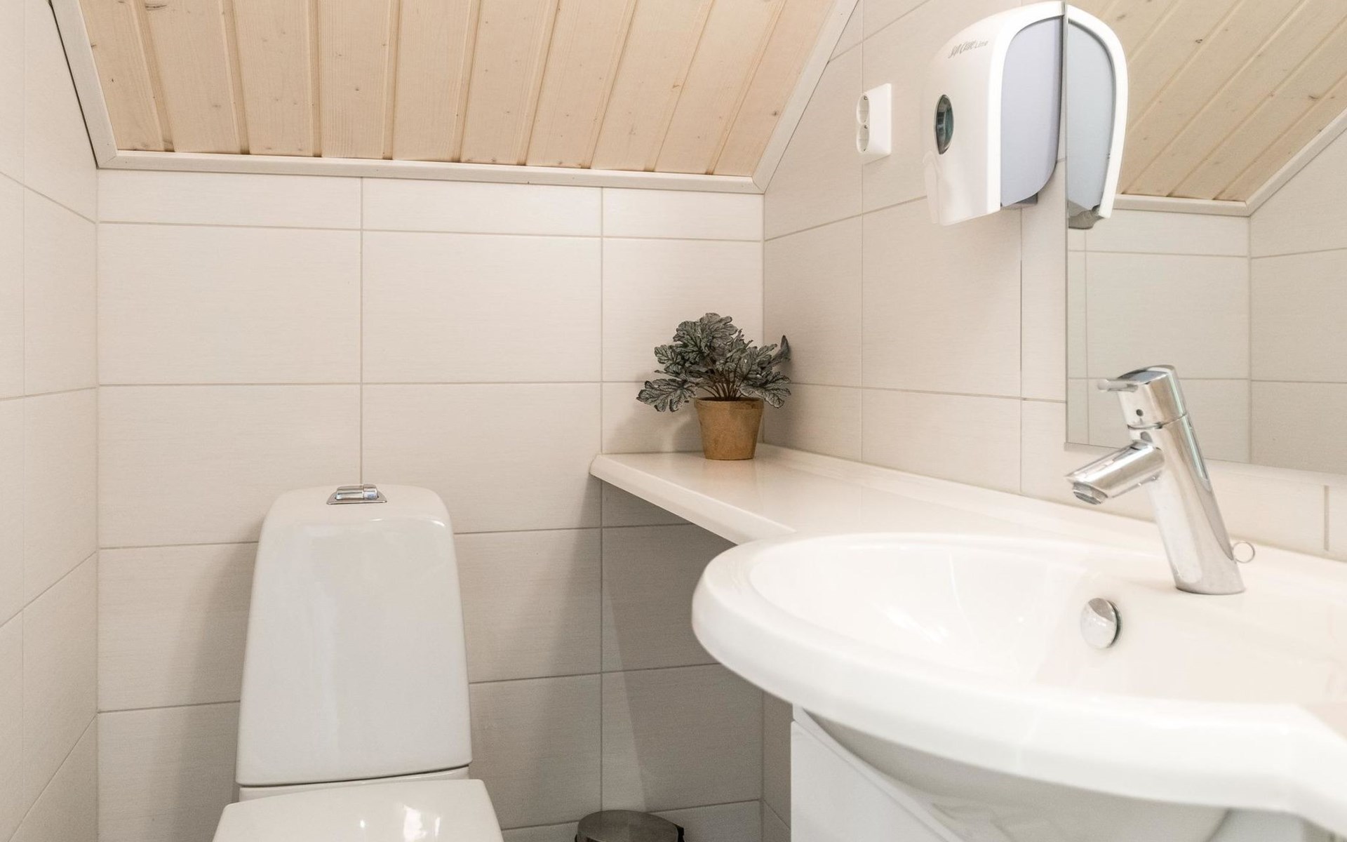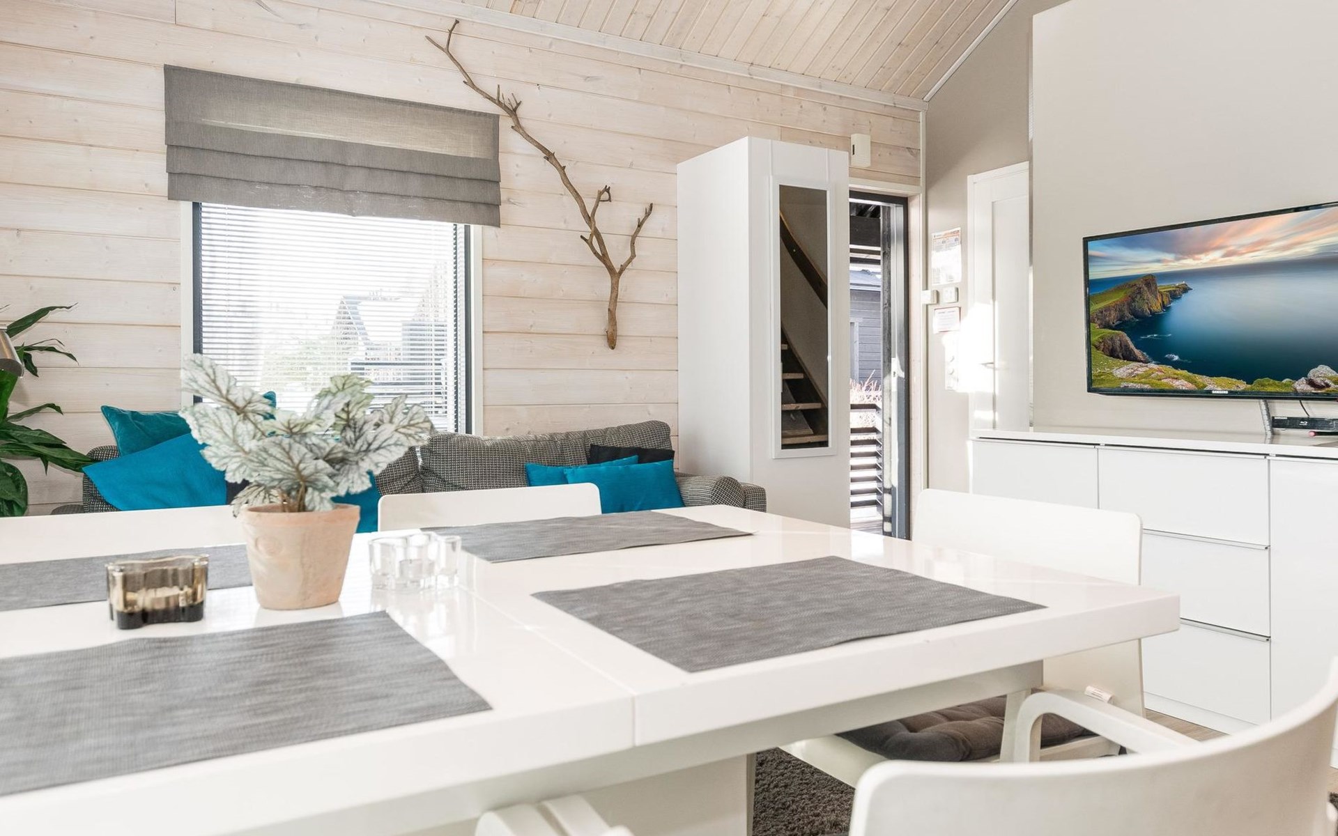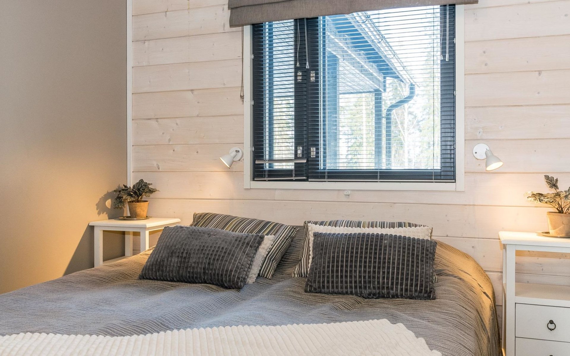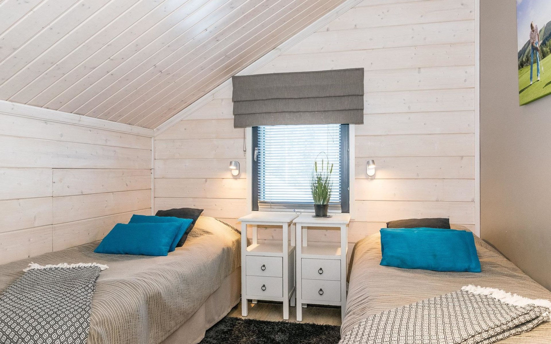Wooden apartment (2014) with an open kitchen in the living room. The living room has a fireplace, dining area, sofa and large flat screen TV and Chromecast player. The downstairs bedroom has two beds. There is also a washroom with toilet and sauna (electrically heated stove) on the ground floor. The sauna offers a great place to relax, speakers have been installed under the benches for listening to music (can be connected via Bluetooth to the amplifier in the bathroom with all playback devices). Upstairs there are 2 bedrooms, each with two beds. There is also a separate toilet upstairs. All bedrooms have blinds, in addition, the downstairs bedroom and the second bedroom upstairs also have blackout curtains, upstairs there is a TV and a Chromecast player. The apartment is heated by geothermal / water-circulated underfloor heating, which can be controlled with room-specific thermostats. The apartment has mechanical ventilation, which also has a cooling function. A travel cot and high chair for a small child and a toilet seat (reducer) are available.