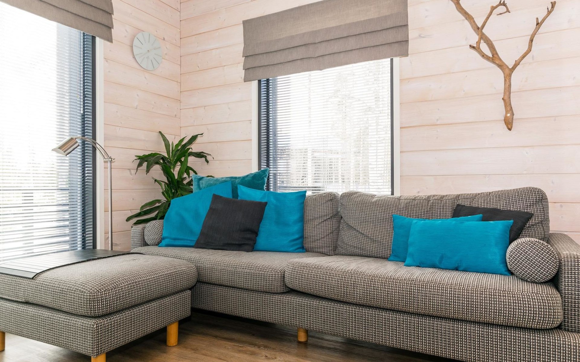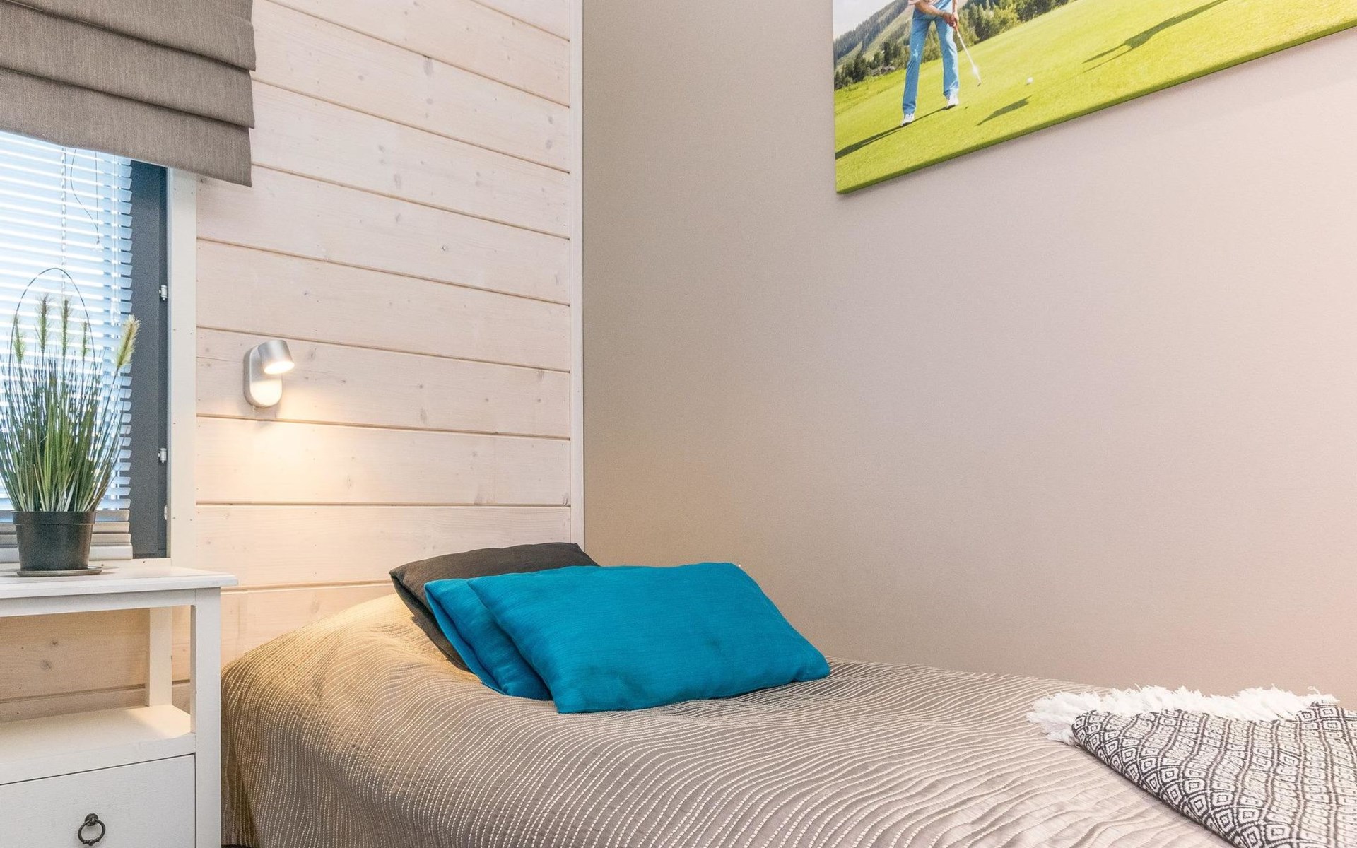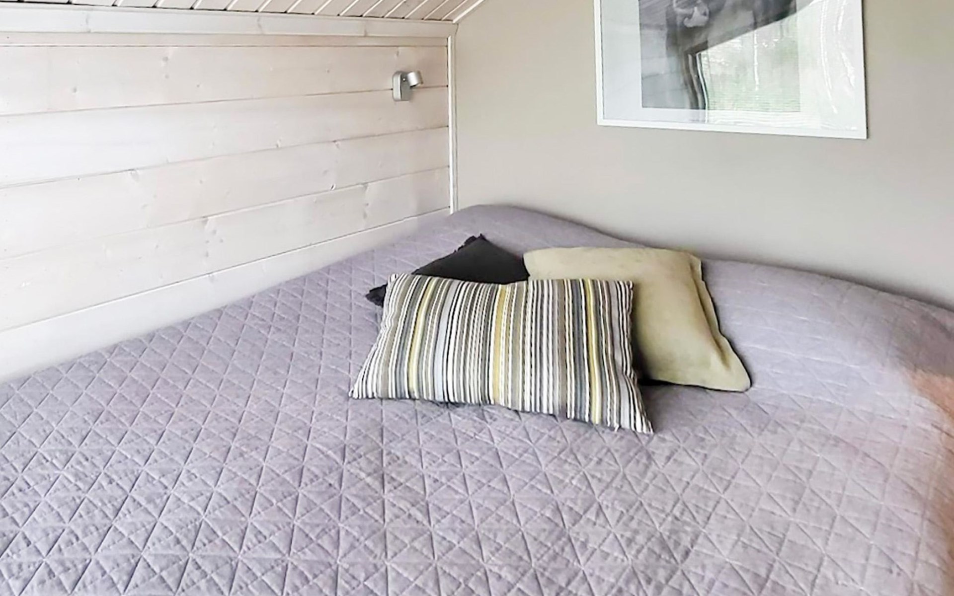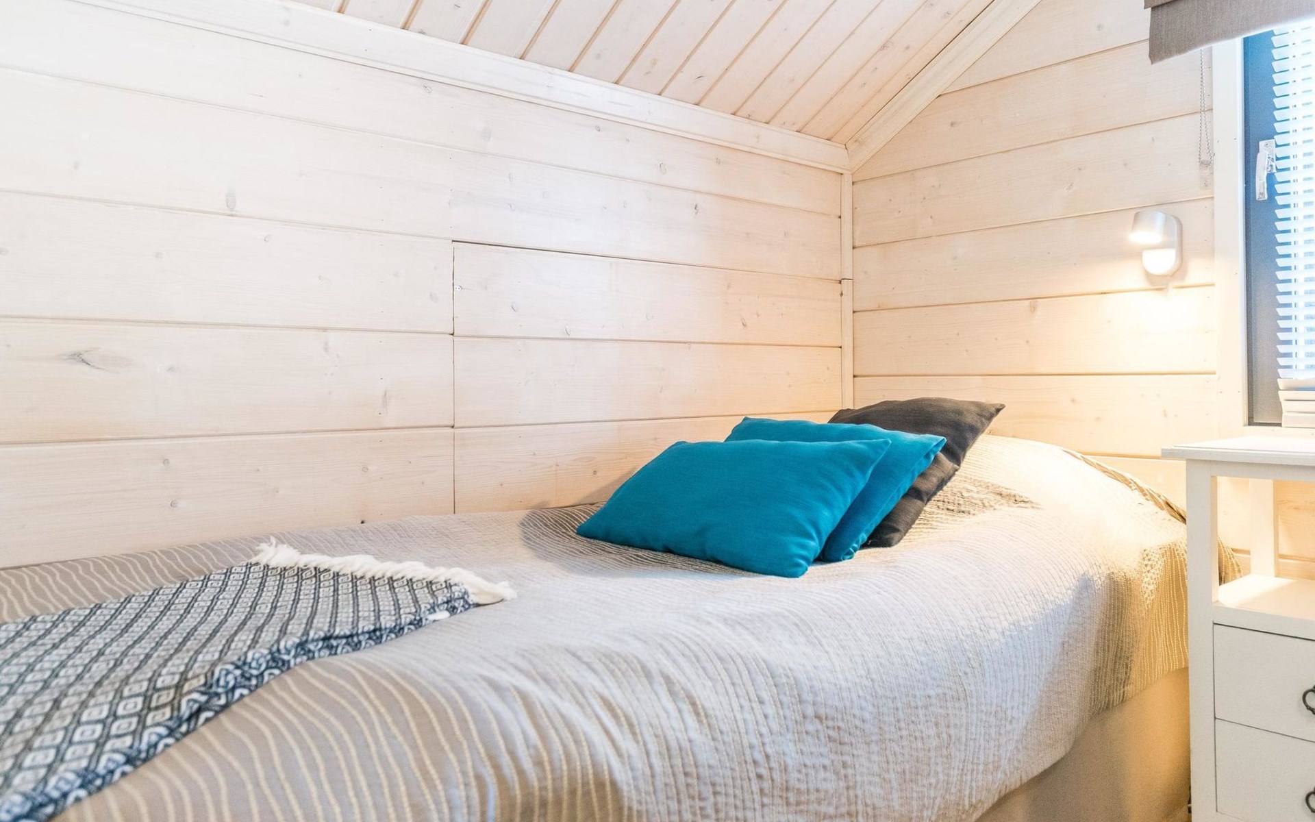Wooden apartment (2014) with an open kitchen in the living room. The living room has a fireplace, dining area, sofa and large flat screen TV and Chromecast player. The downstairs bedroom has two beds. There is also a washroom with toilet and sauna (electrically heated stove) on the ground floor. The sauna offers a great place to relax, speakers have been installed under the benches for listening to music (can be connected via Bluetooth to the amplifier in the bathroom with all playback devices). Upstairs there are 2 bedrooms, each with two beds. There is also a separate toilet upstairs. All bedrooms have blinds, in addition, the downstairs bedroom and the second bedroom upstairs also have blackout curtains, upstairs there is a TV and a Chromecast player. The apartment is heated by geothermal / water-circulated underfloor heating, which can be controlled with room-specific thermostats. The apartment has mechanical ventilation, which also has a cooling function. A travel cot and high chair for a small child and a toilet seat (reducer) are available.