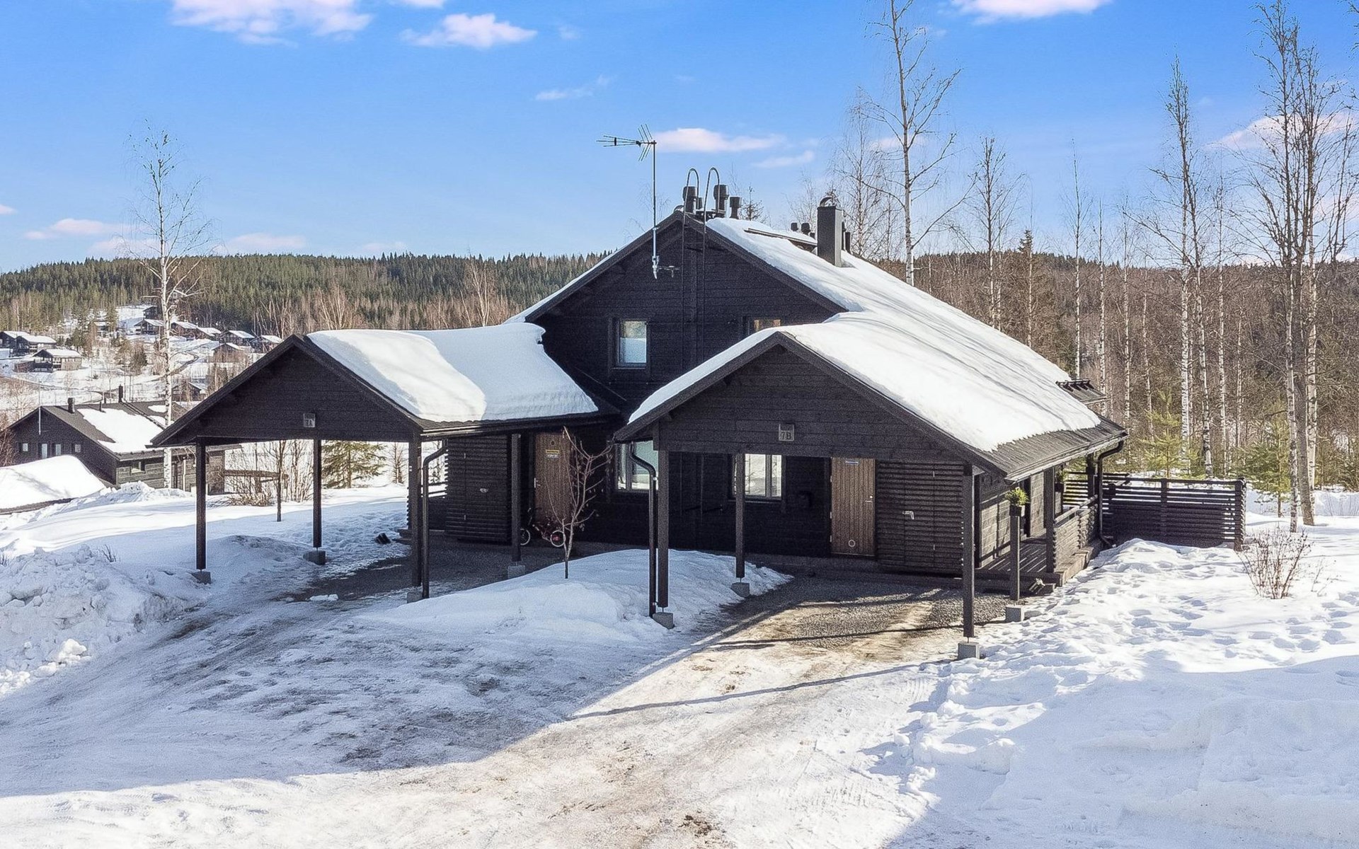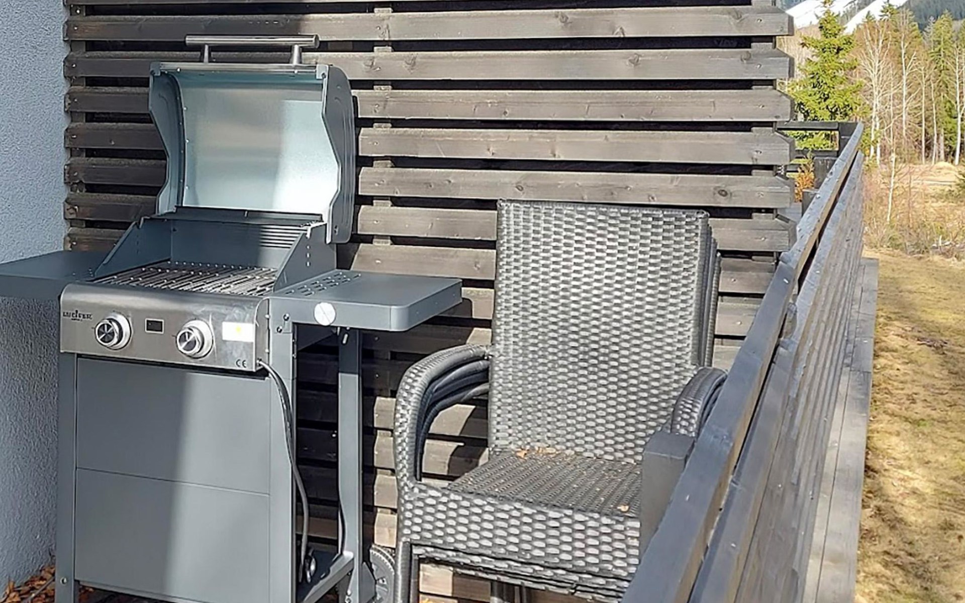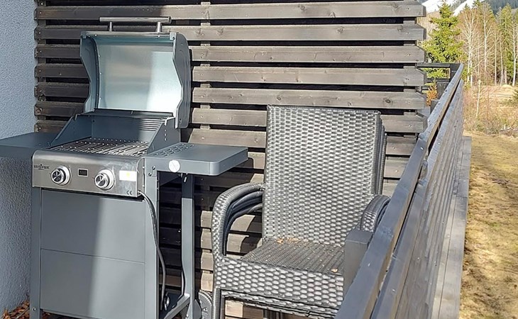Carport with a car heating socket and, for an additional fee, a charging point for electric and hybrid cars (1-phase, charging power: 2.3 kW, type 2 plug). The apartment also includes an outdoor storage room with firewood. The storage room is also suitable for storing skis and suitcases.