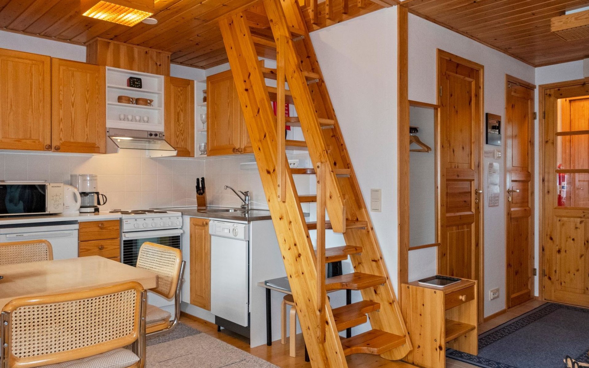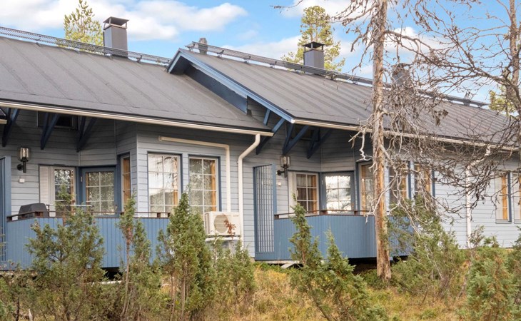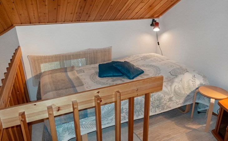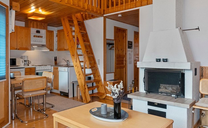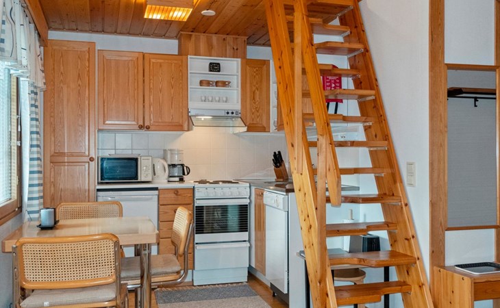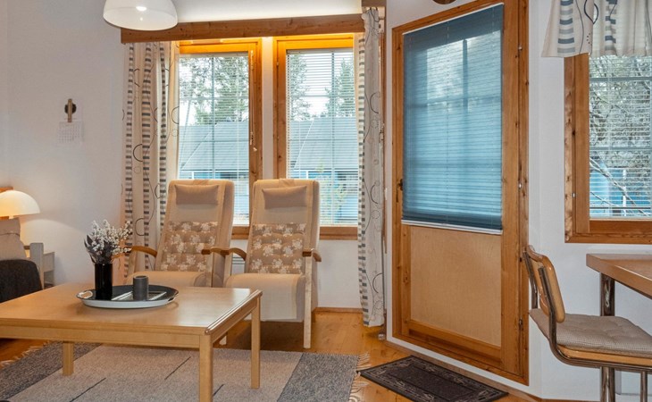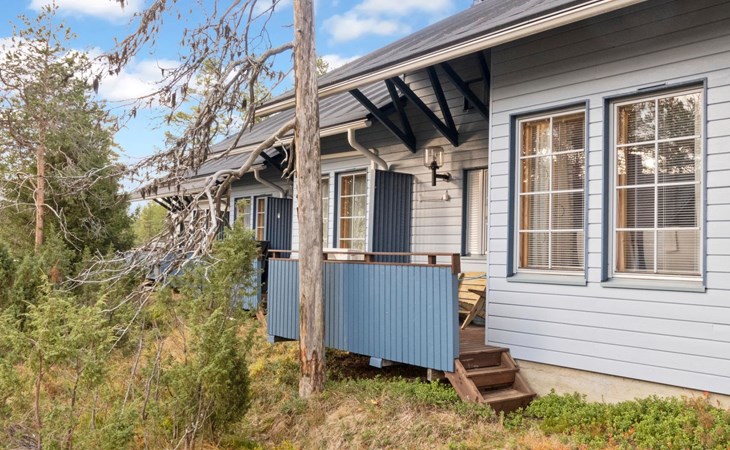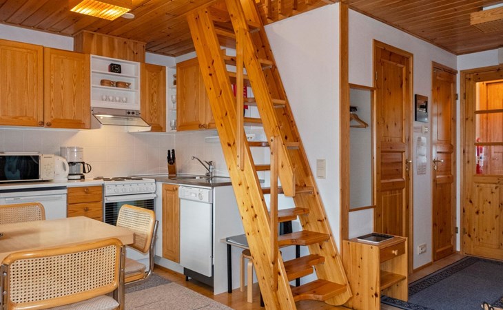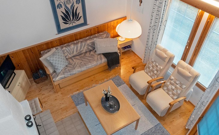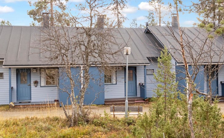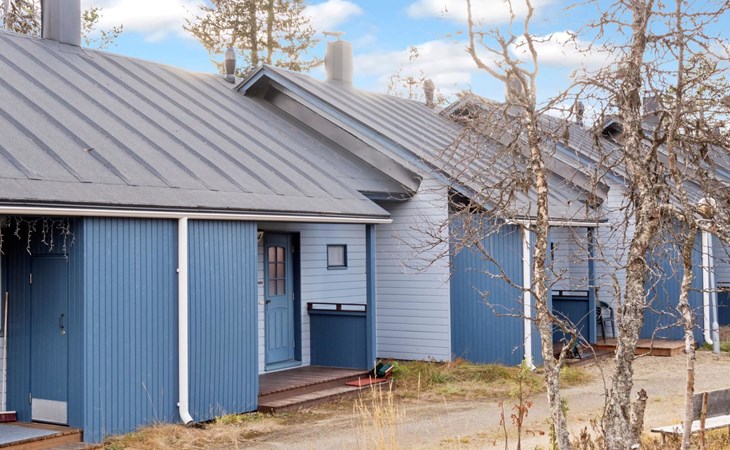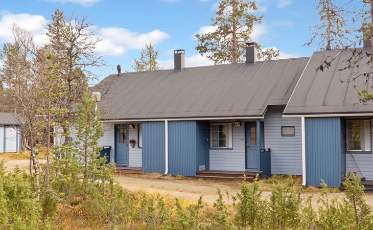260 km to the north from Rovaniemi, in the tourist center of Saariselkä in Etelärinne area. Apartment in a row house, built in 1991, living room/kitchen, bedroom with 2 beds next to each other, 120 cm wide bed and 2 mattresses in the loft, sauna, washroom, separate WC and small terrace. Ground floor 38 m², loft 23 m².